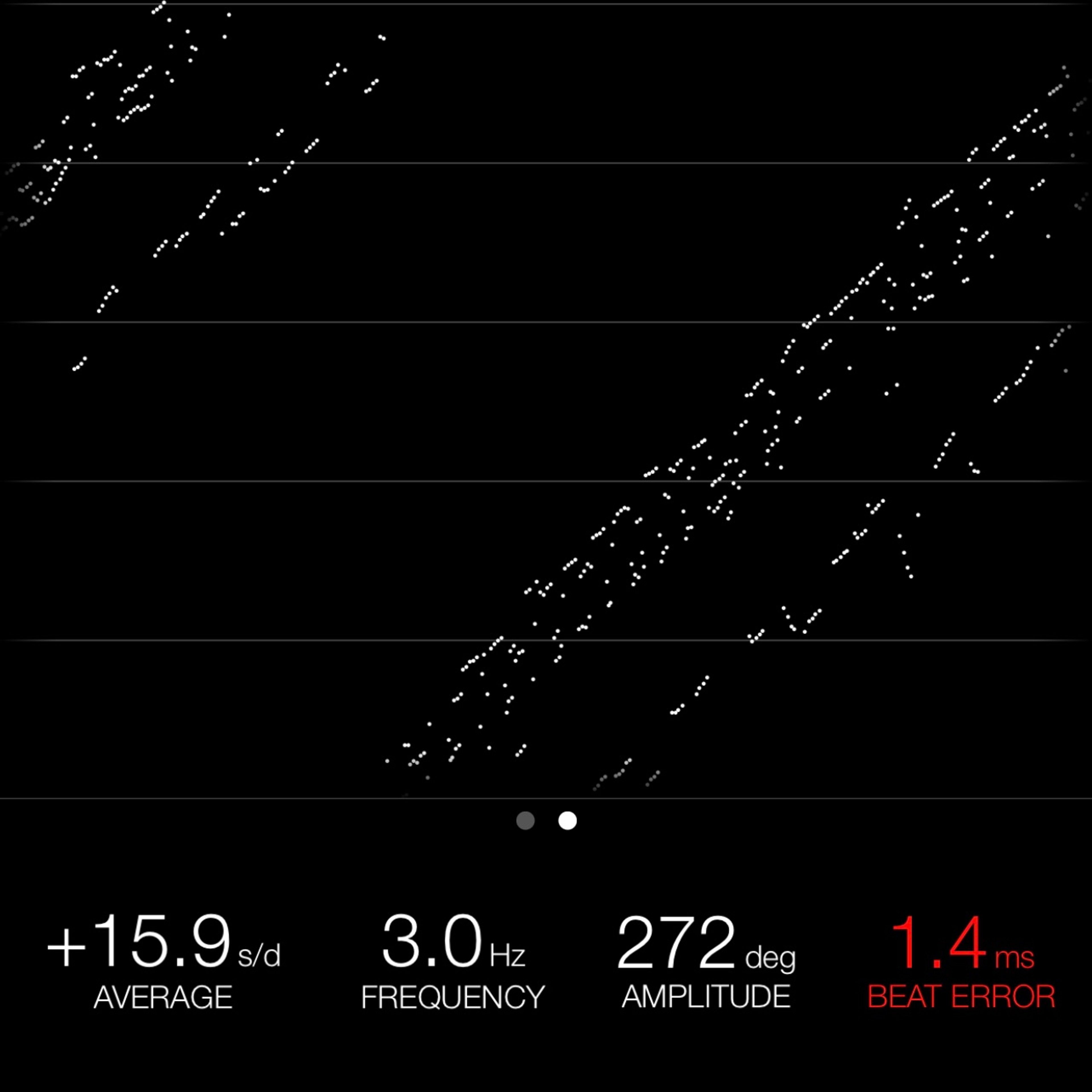 This reading was taken (crown down) with a ONEOF Accuracy Boutique Edition timing machine at time of cataloging. It is provided as a courtesy only, and shall not be construed as a warranty or guarantee of any kind. Please refer to our terms and conditions of sale for more information.