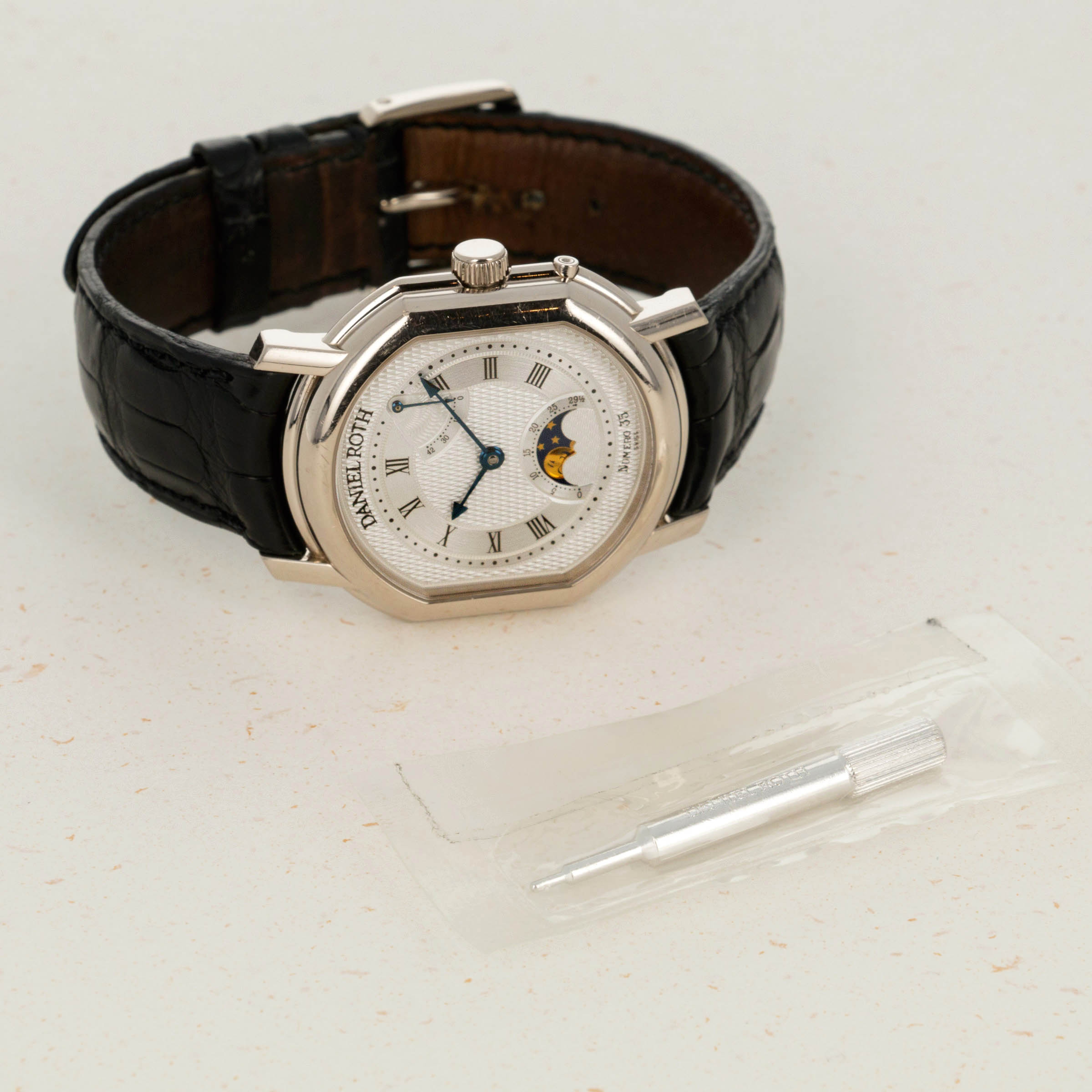 Additionally, this example is presented with a Daniel Roth-branded stylus still within its original packaging. This stylus enables the wearer to operate the pushers on the side of the timepiece's case that correlate with its moonphase complication, but it can also be used for other Daniel Roth timepieces with similar-sized complication pushers.