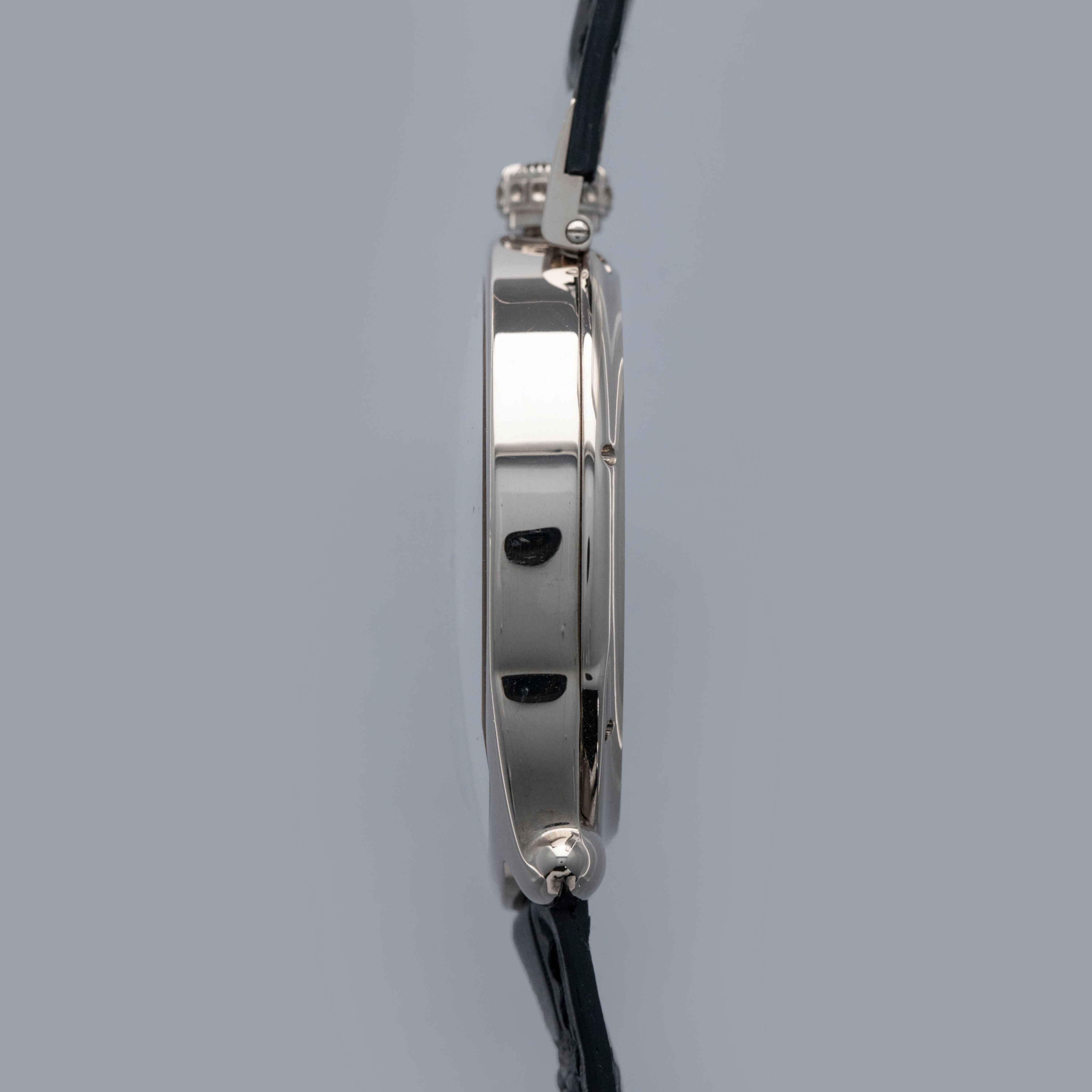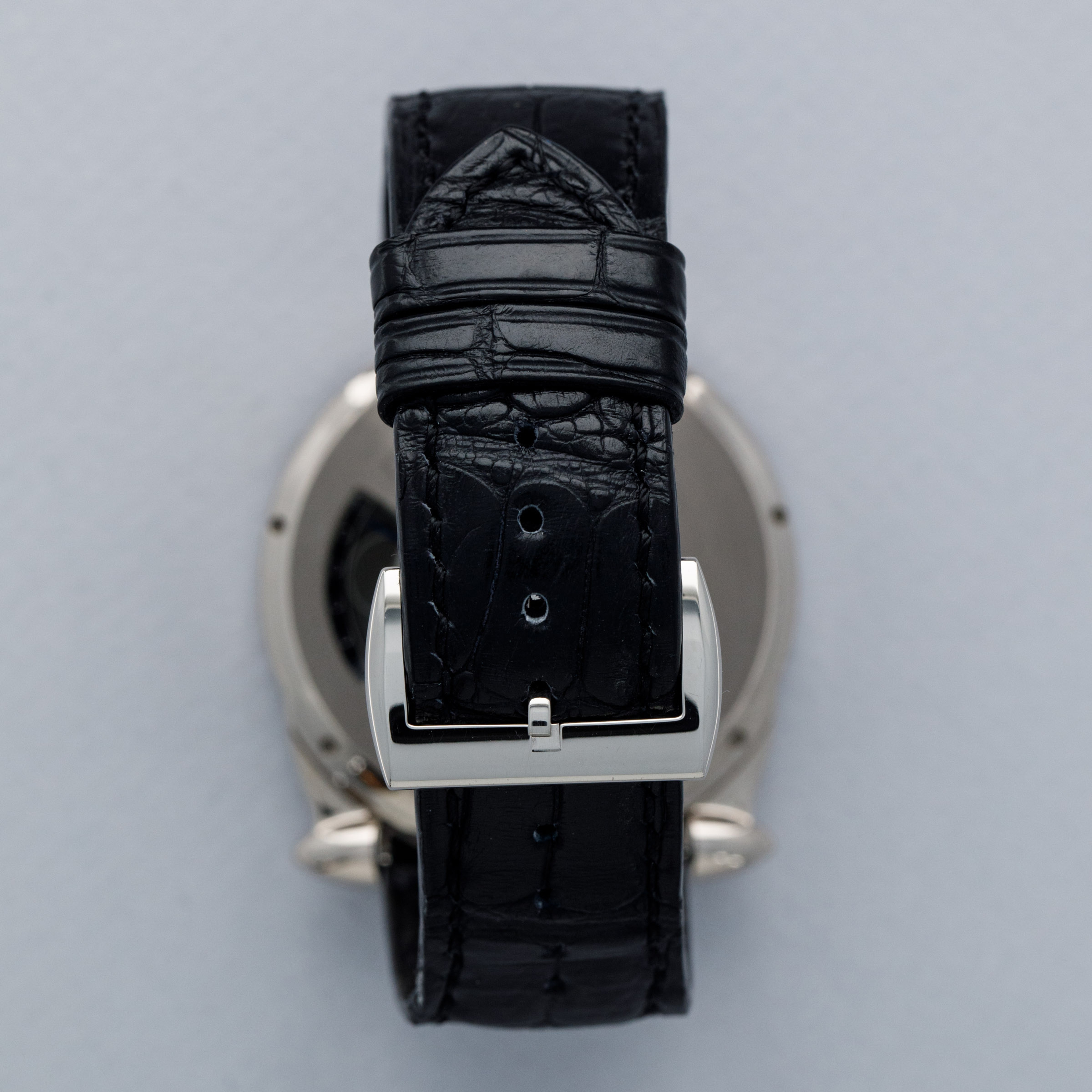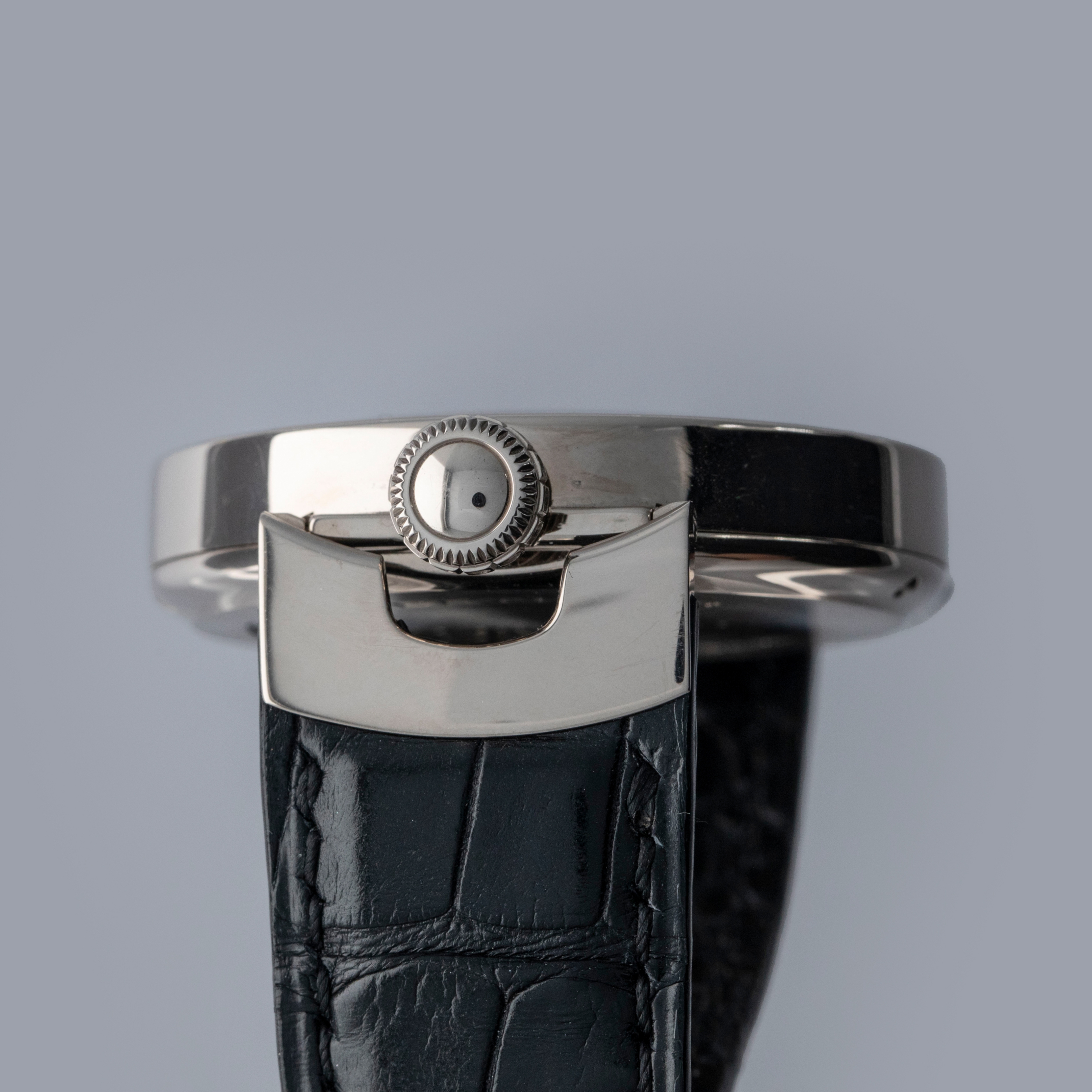 Watch is in overall near-mint condition. The white gold case shows signs of careful wear, with light surface scuffs and marks visible around the bezel, while the case back displays wear around the power reserve window and retains crisp engravings and hallmarks. The dial elements and hands remain like new. It is fitted with a black crocodile strap and a white gold pin buckle. Comes complete with box.