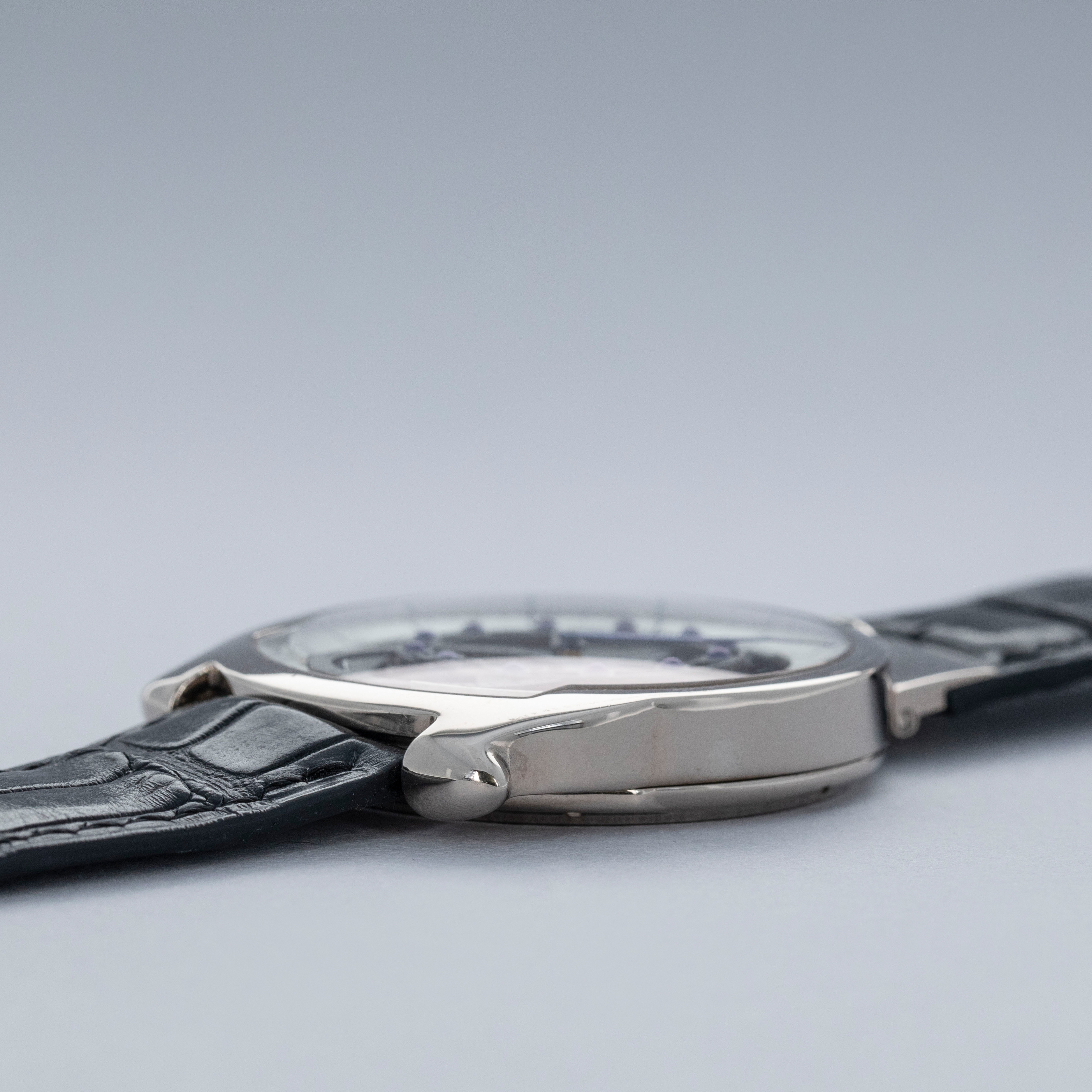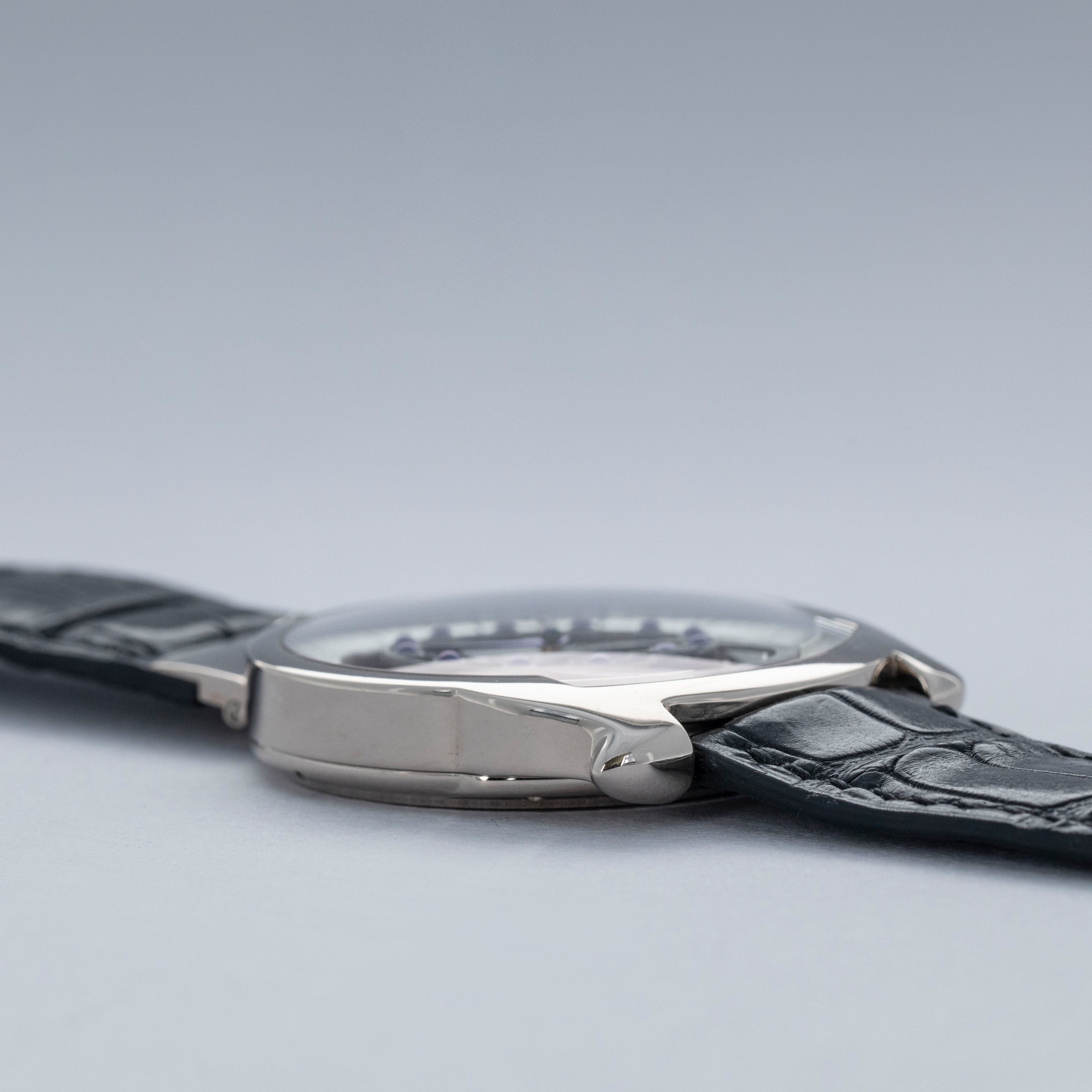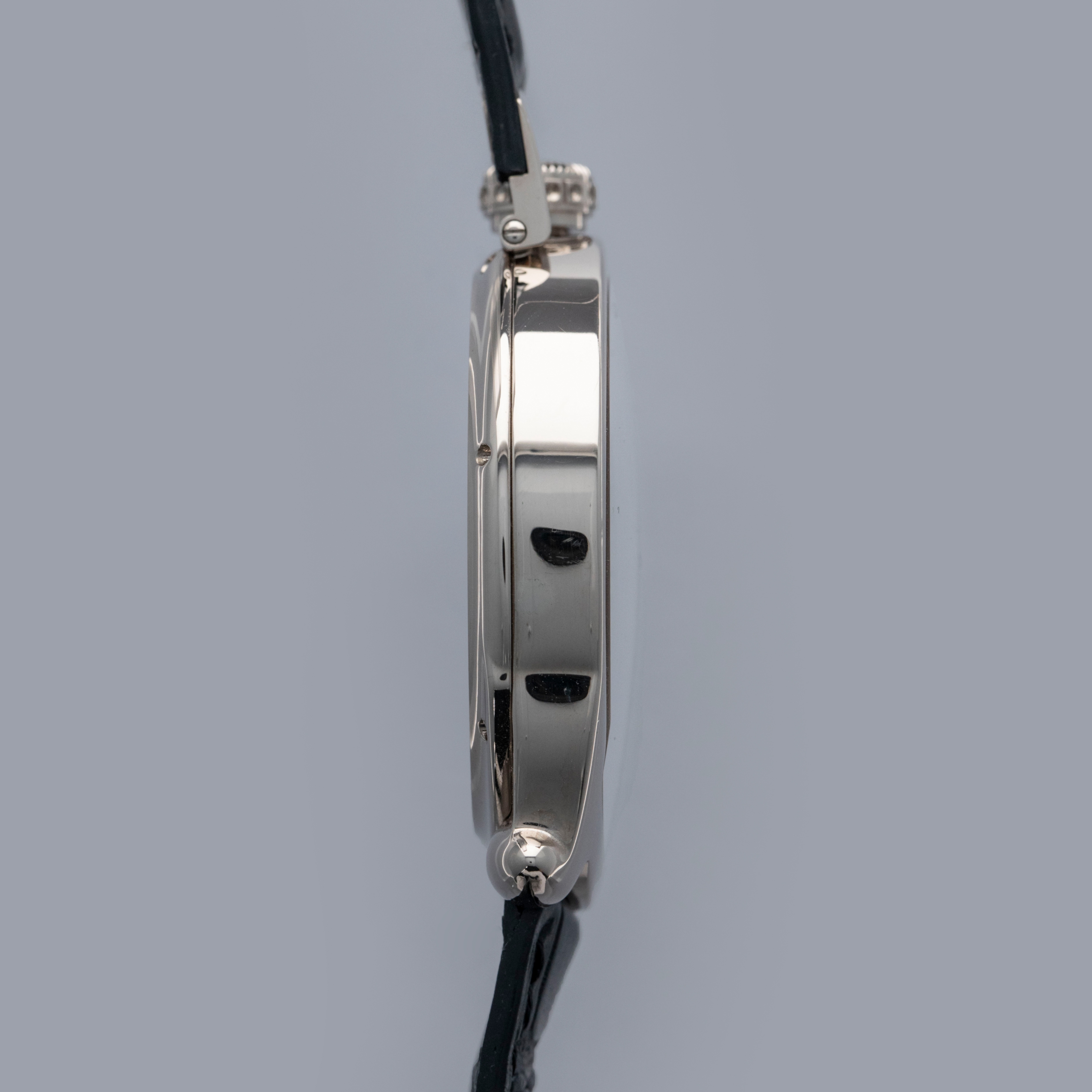 Watch is in overall near-mint condition. The white gold case shows signs of careful wear, with light surface scuffs and marks visible around the bezel, while the case back displays wear around the power reserve window and retains crisp engravings and hallmarks. The dial elements and hands remain like new. It is fitted with a black crocodile strap and a white gold pin buckle. Comes complete with box.