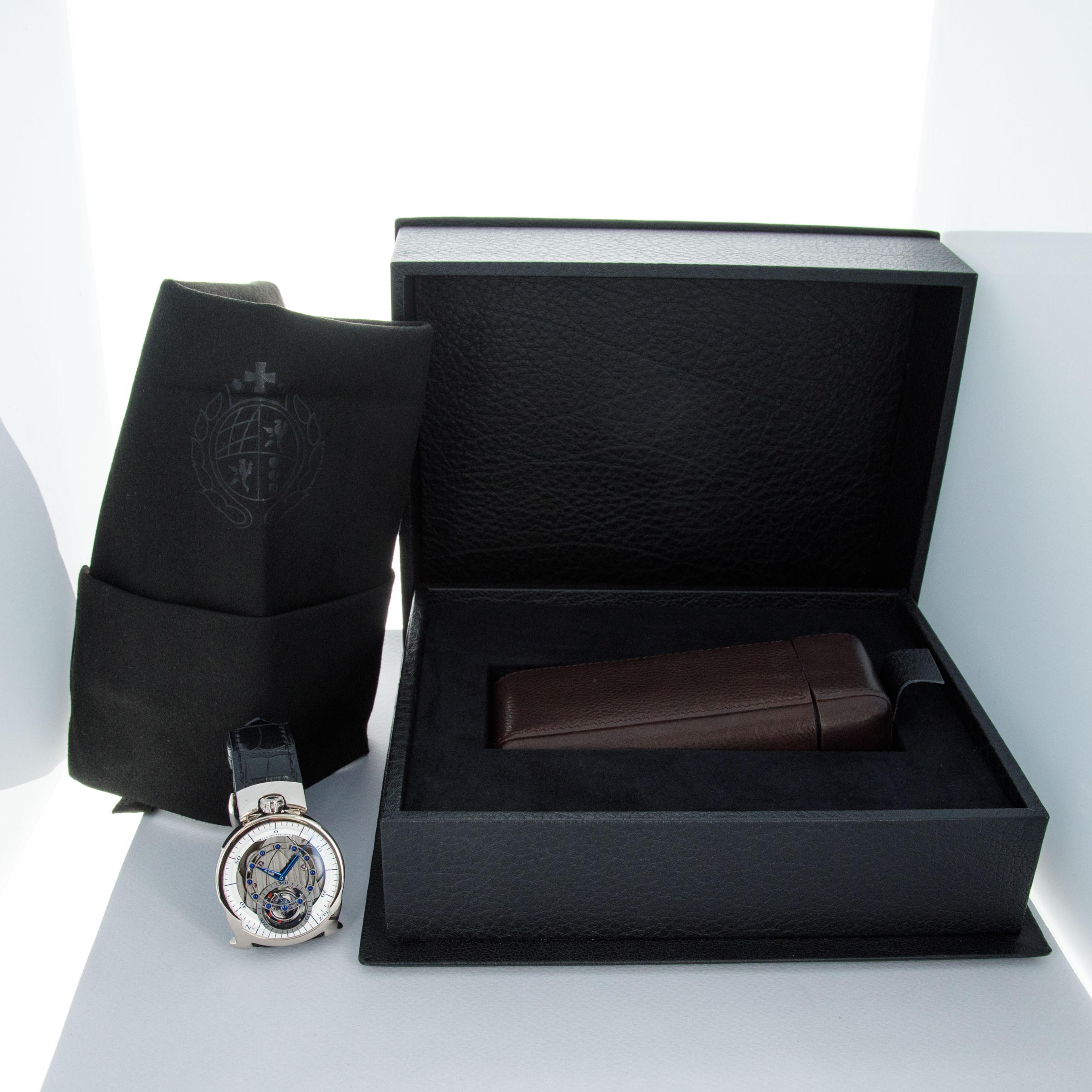 Launching in 2002, De Bethune has burst onto the watchmaking scene with hi-tech materials, innovative movements and stunning avant-garde designs that have enabled them to quickly become one of the most distinctive watchmakers in the industry. Founded by THA founders Denis Flageollet and David Zanetta, the idea for De Bethune was that it would be a true watch manufacture, something De Bethune has undoubtedly achieved with their models that encompass almost every facet of horology. Recognised as one of the most important indie watchmakers of recent times, De Bethune have created a powerful sense of self as they forge on with their own unique aesthetic and style. Carrying that aesthetic in abundance is the DBS Tourbillon that we have here. Made of 18kt white gold and launched in 2015 to celebrate the 10th anniversary of the DBS model that De Bethune created in support of the Only Watch charity auction, the DBS is an incredibly important part of De Bethune’s history, with a high-frequency tourbillon (36,000 vph), and a distinctive bell-shaped case that is wonderfully futuristic. Featuring a silver skeletonized dial that showcases the wonderful finishing across its movement, this is a special watch from a special brand.