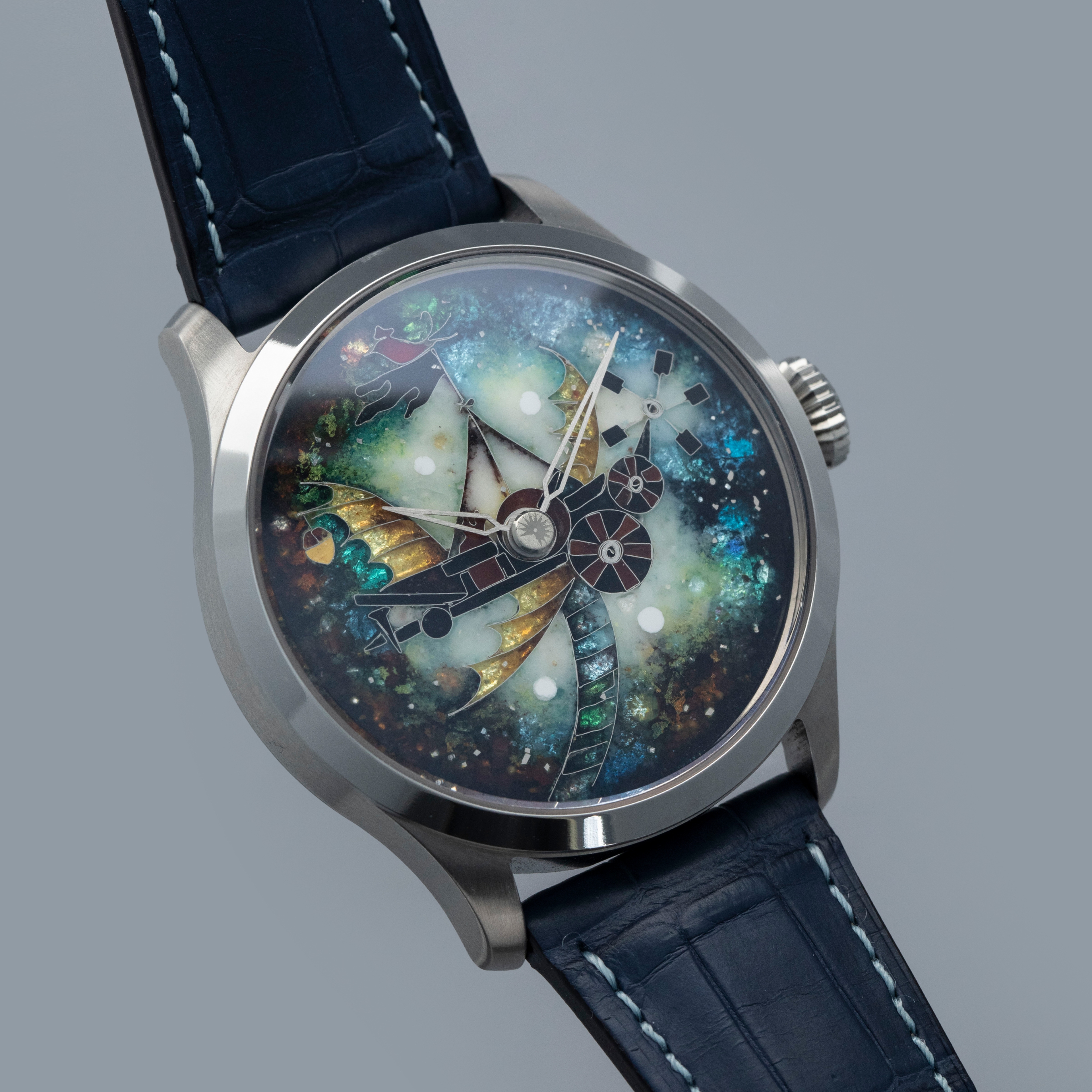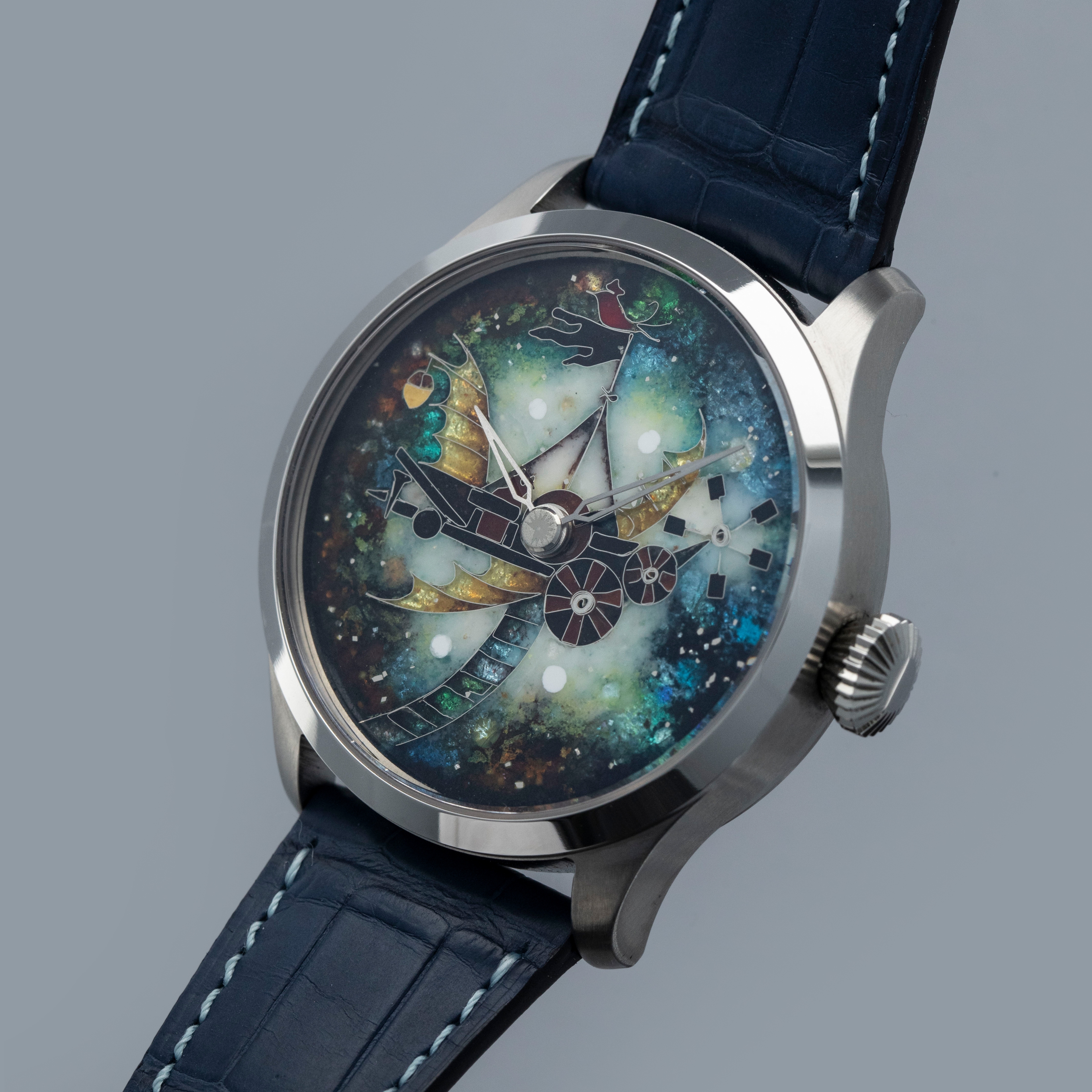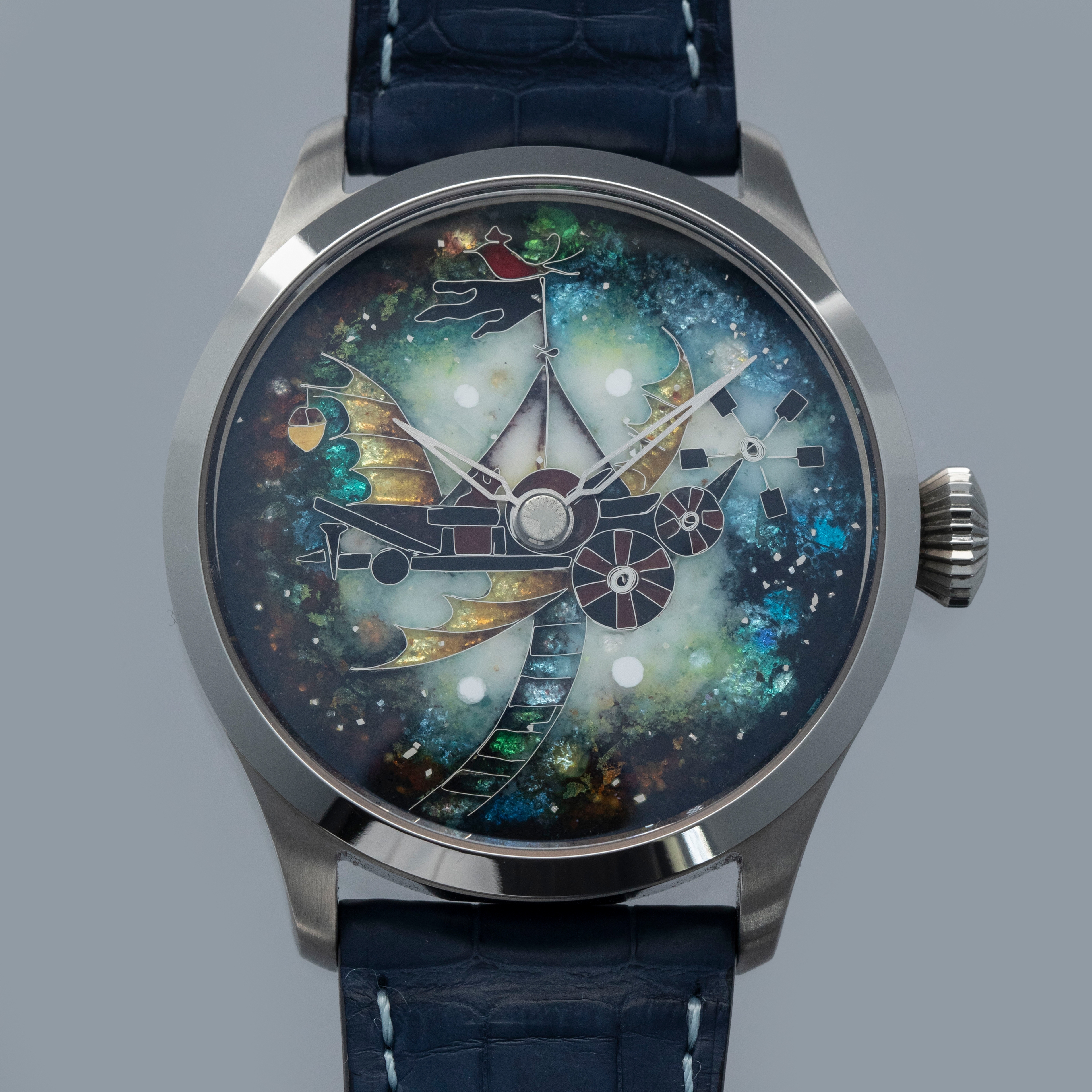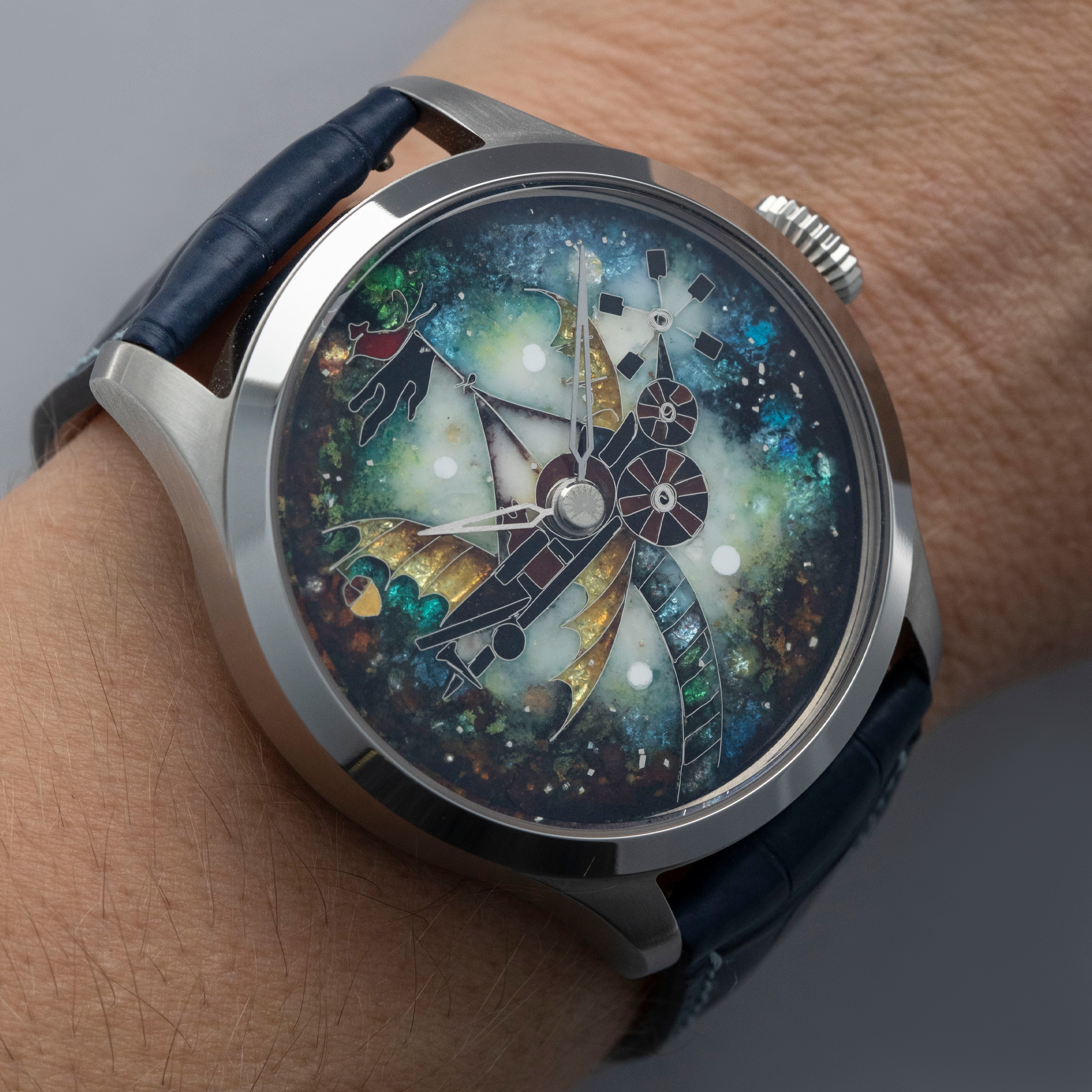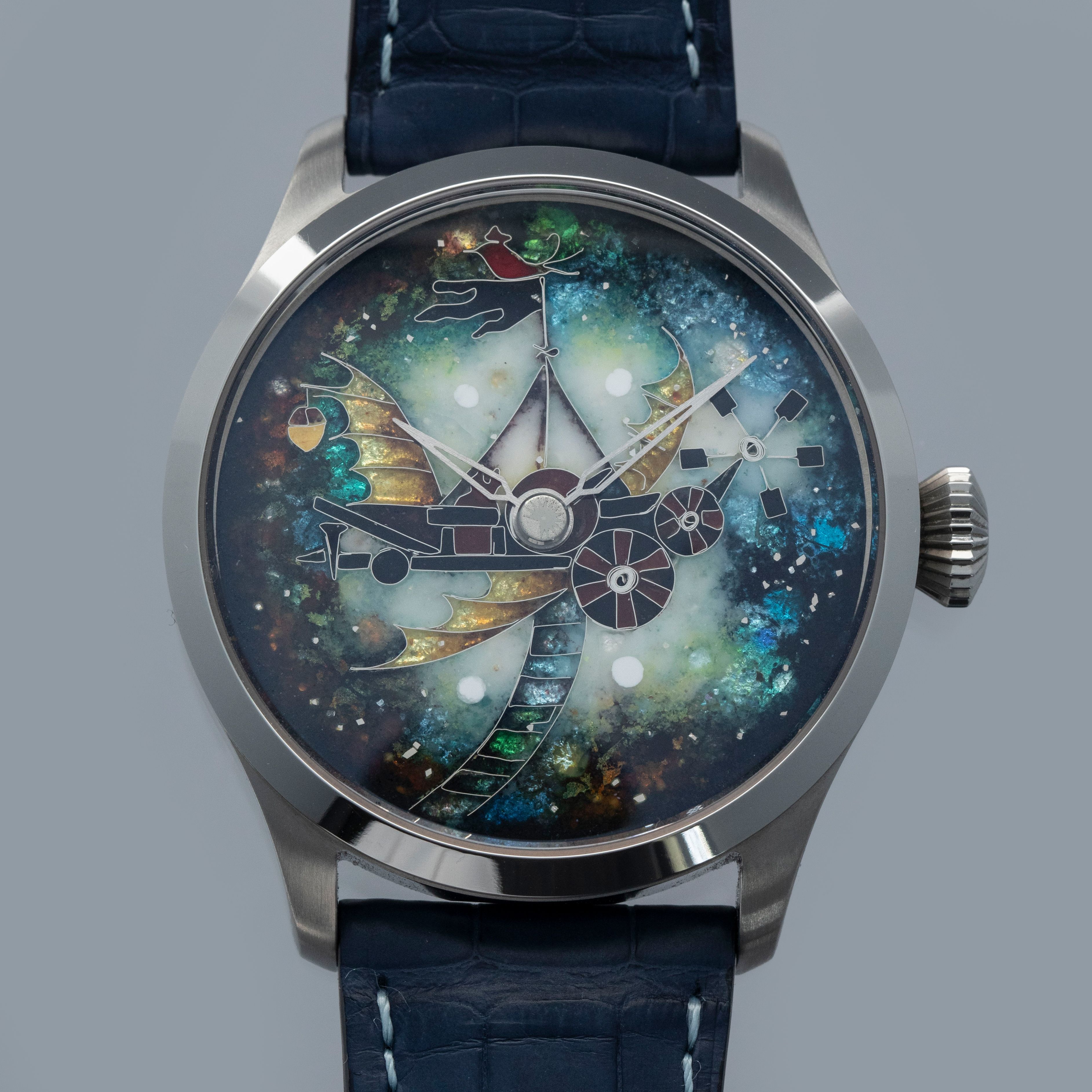 Made with cloisonne enamel, this example's dial is a wonderfully bright and colorful rendition of a flying contraption as inspired by the film "The Eccentrics (Sherekilebi)" by Eldar Shengelaia.
