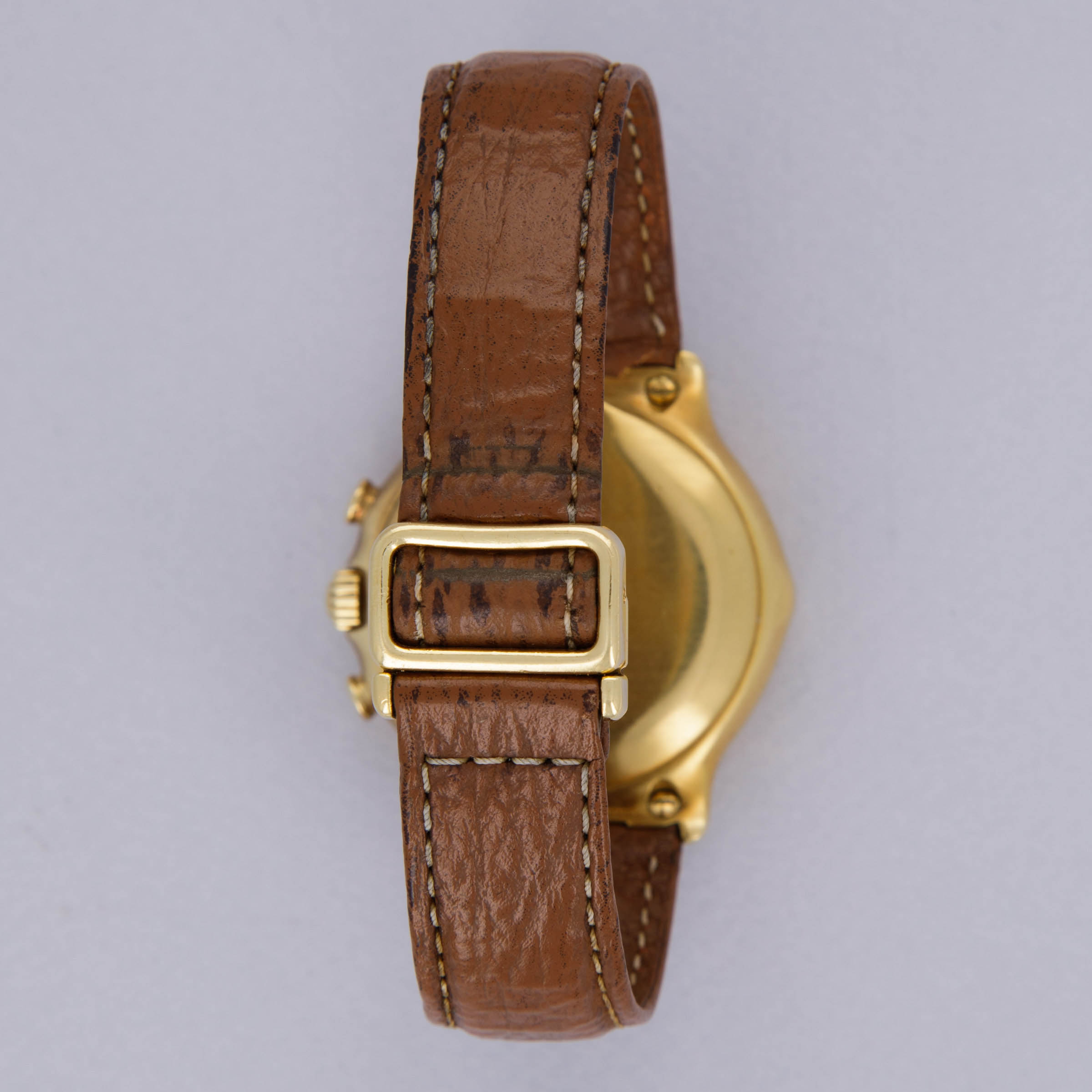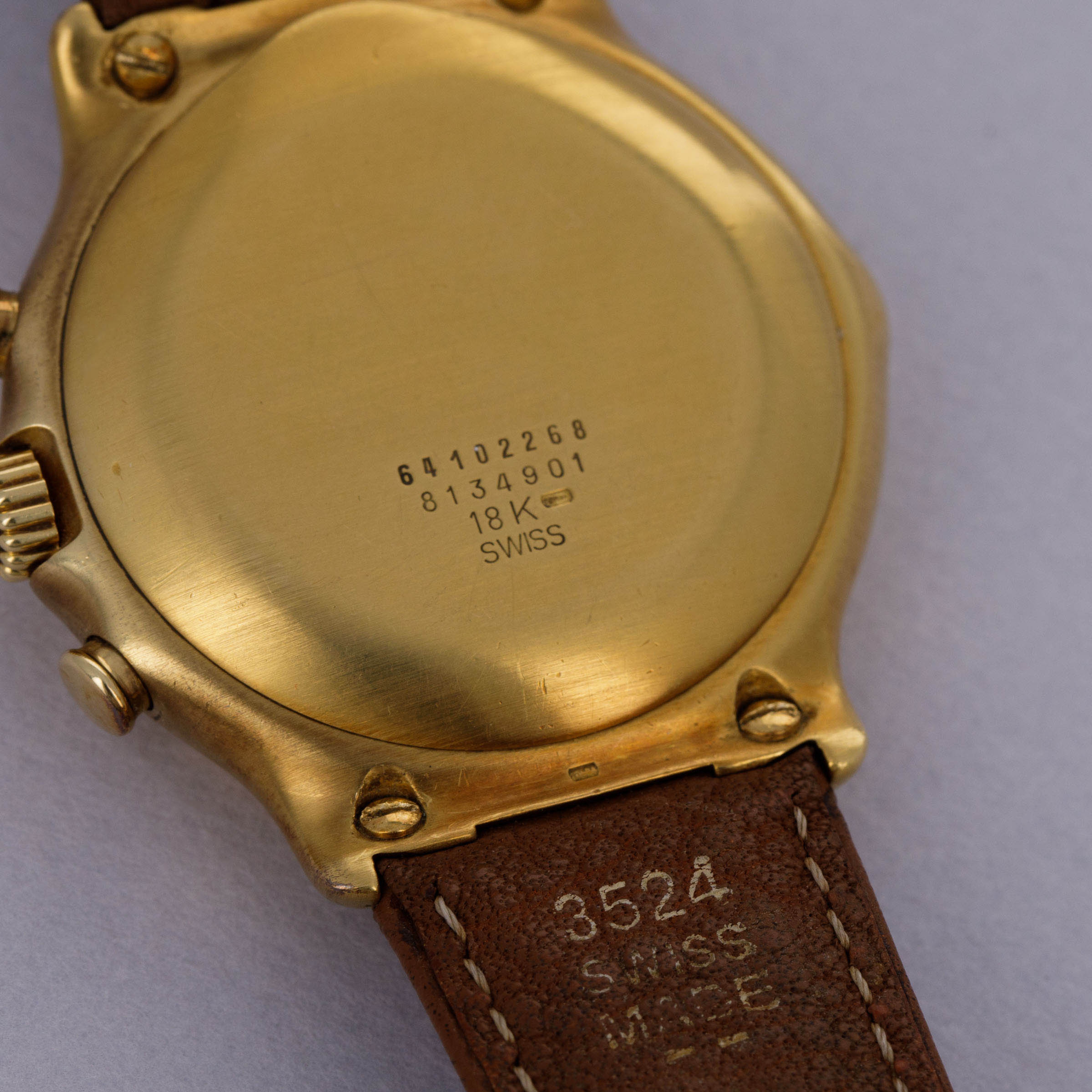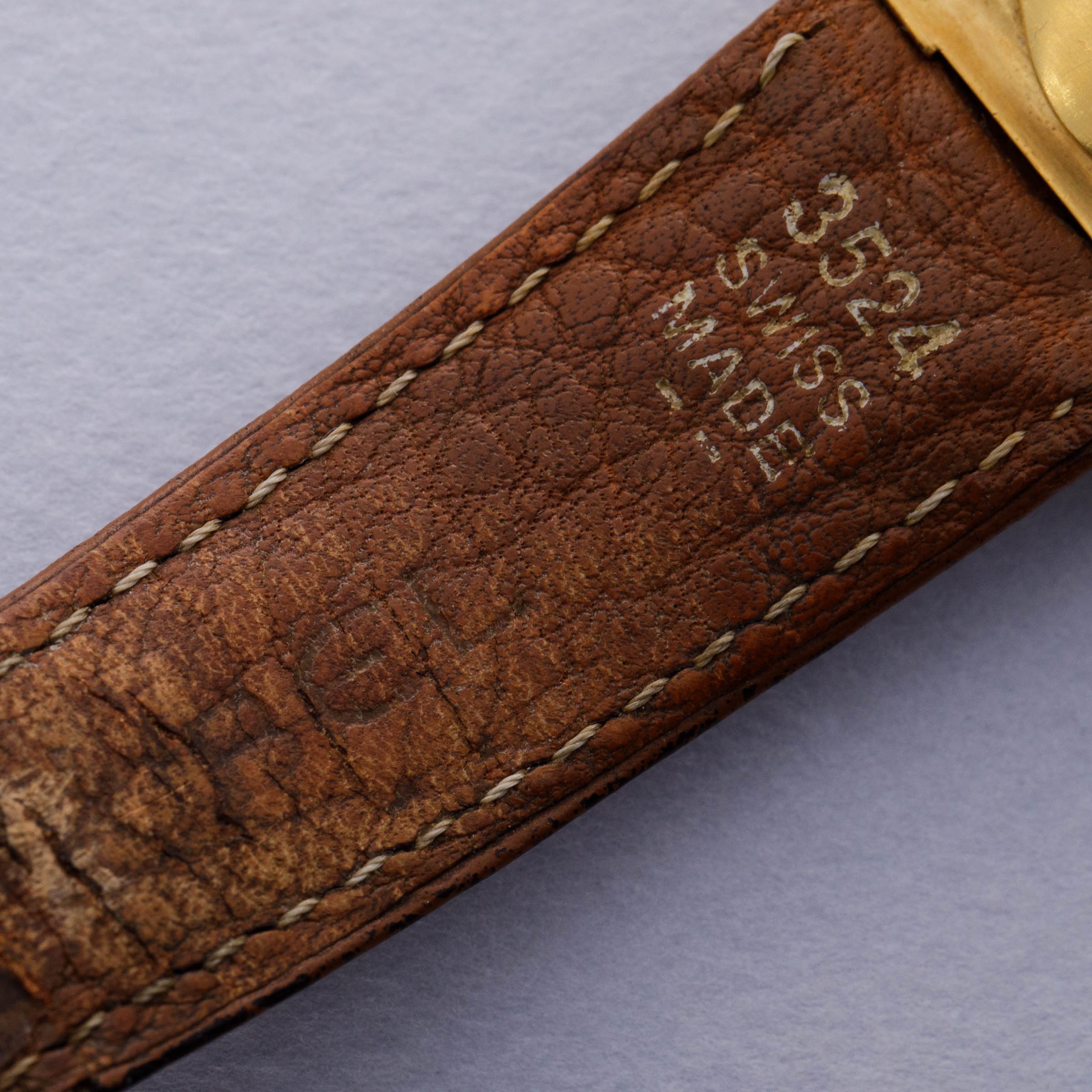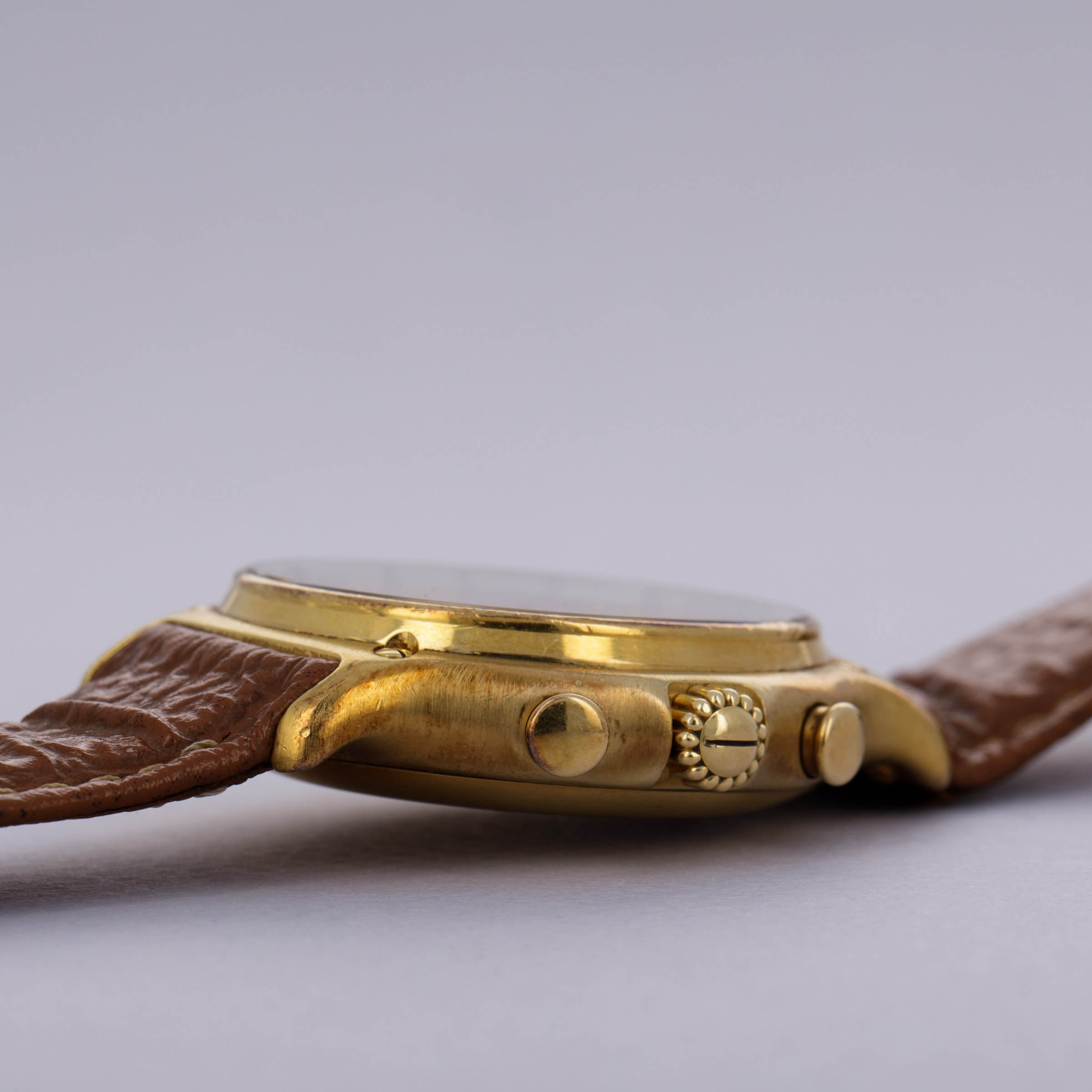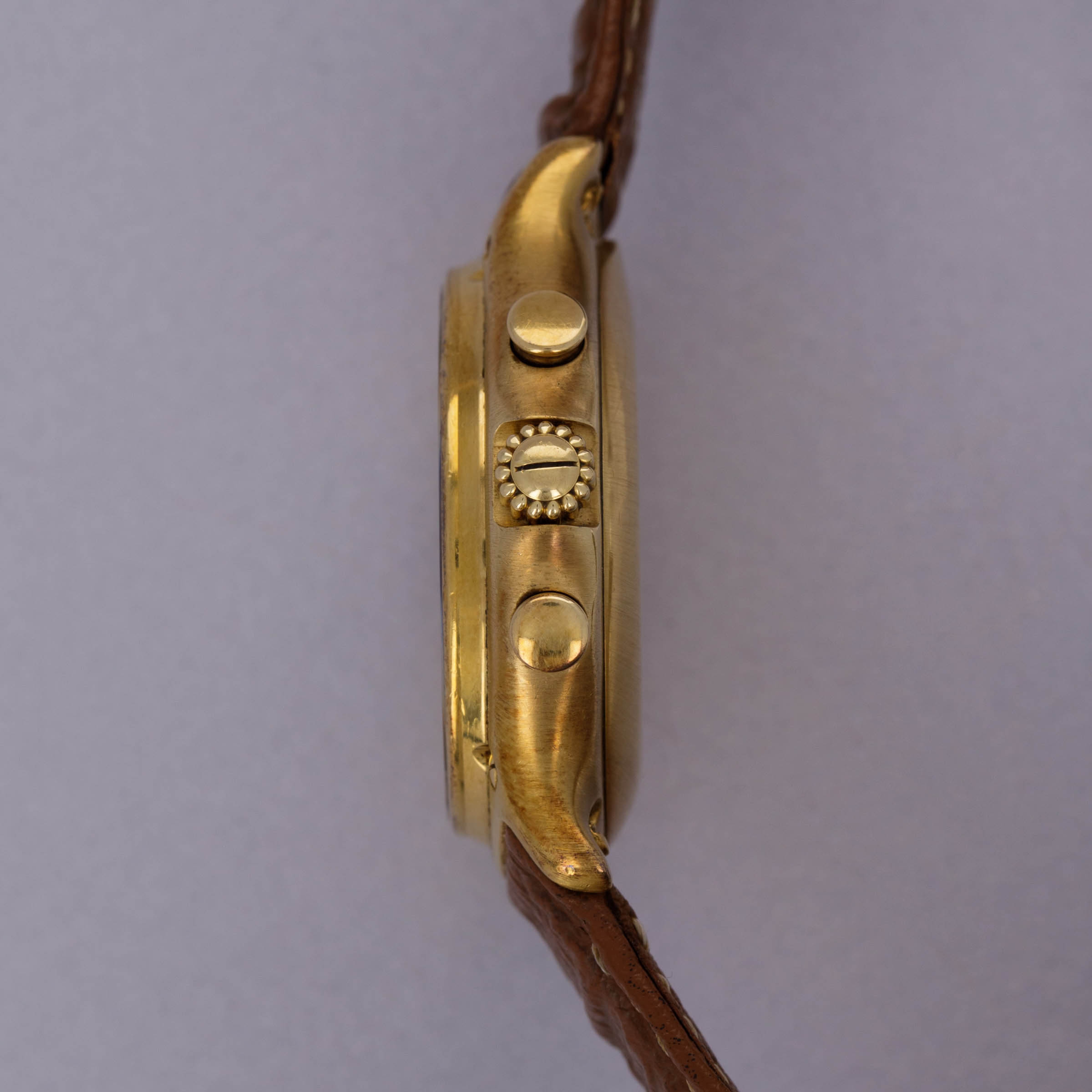 Watch is in very good overall condition. The gold case shows various scratches and marks, with oxidation visible along the surfaces. There are small dings visible along the edge of the bezel. Dial is in excellent condition, with only minor signs of aging visible. The crystal has minor chips and scratches on the surface and edge. Caseback numbers and hallmarks are crisp and fully visible. There is some minor wear visible on the screw heads. Watch comes on an original leather strap with original 18k gold deployant buckle. Please note: The watch is ticking at time of cataloging, but the timing readout is poor and a service is recommended.