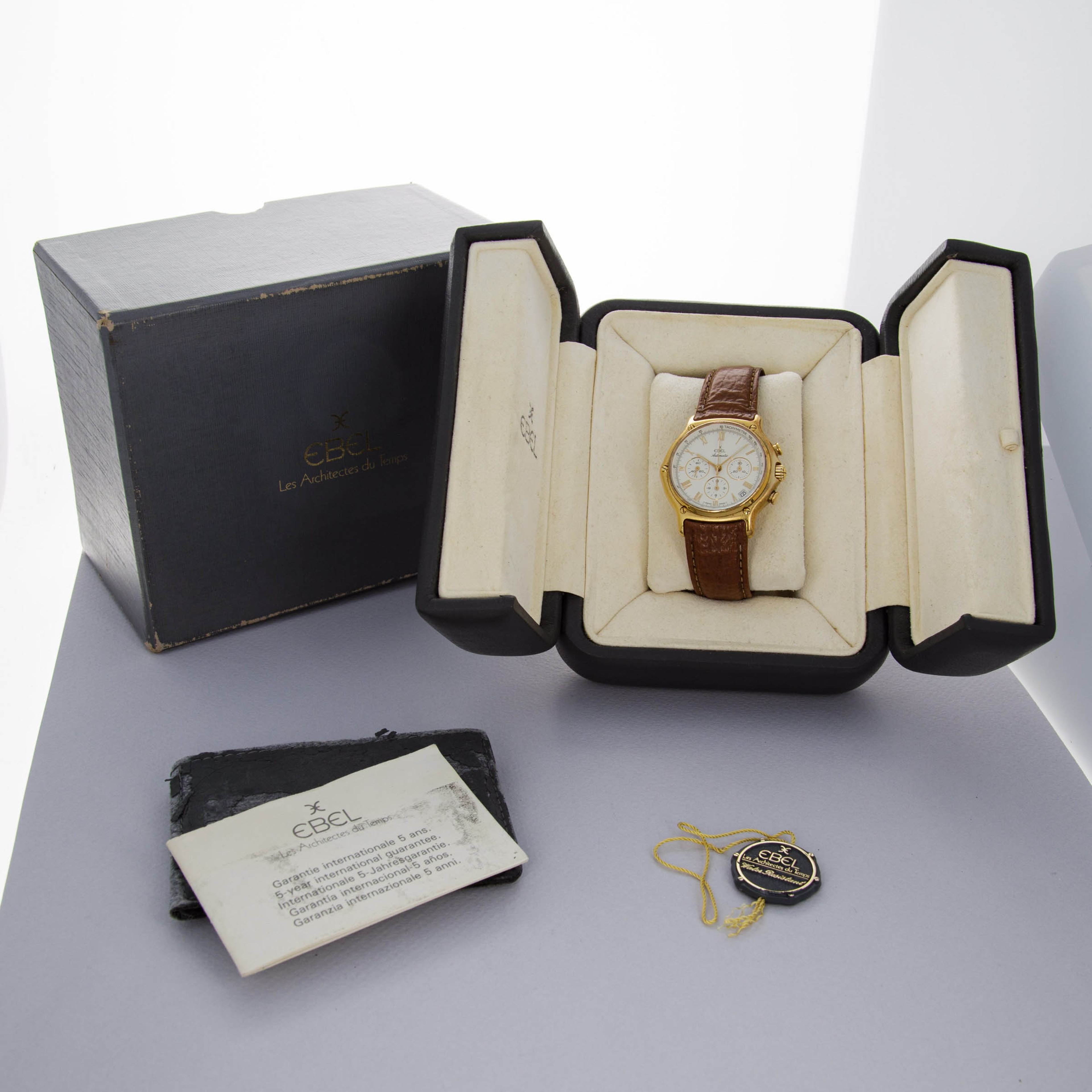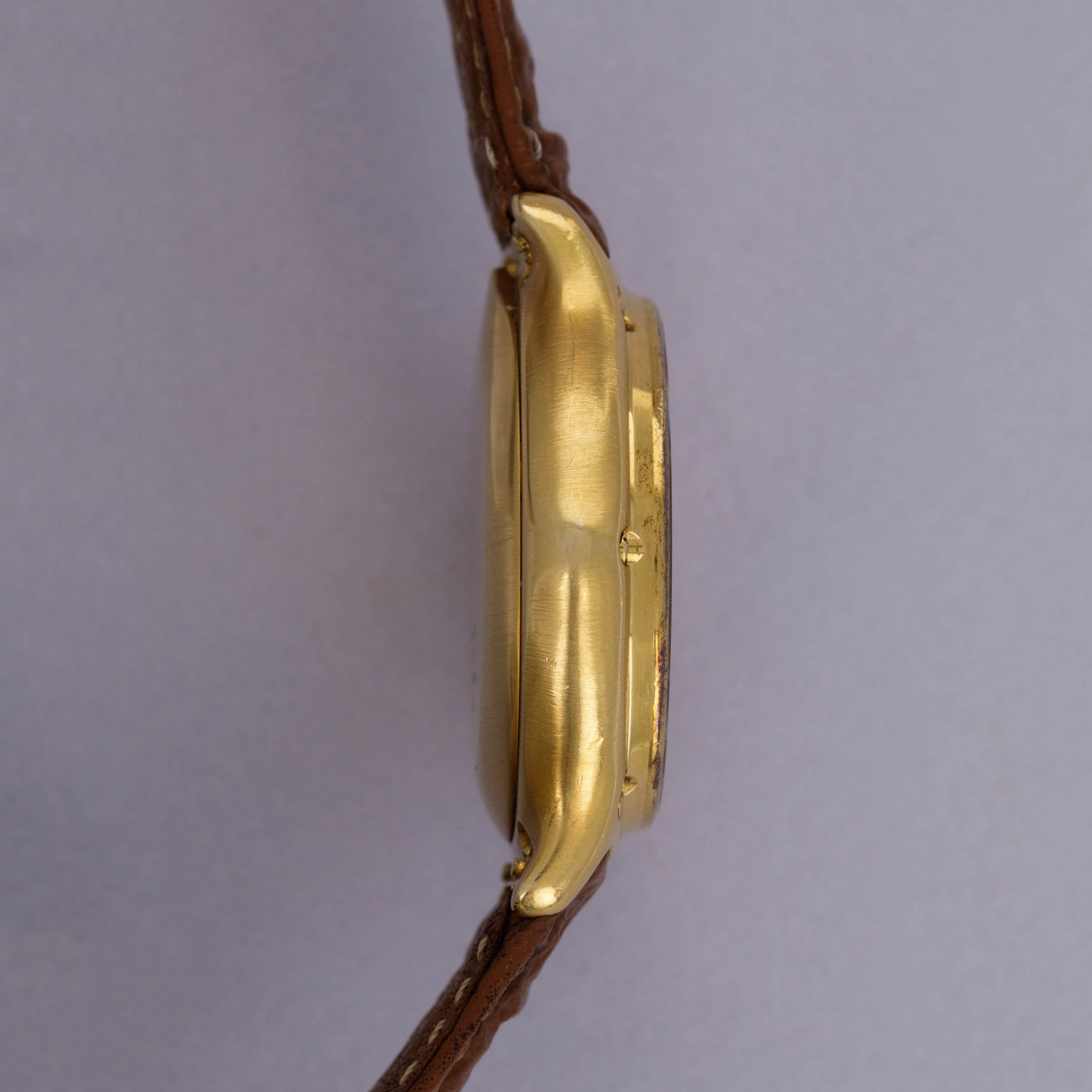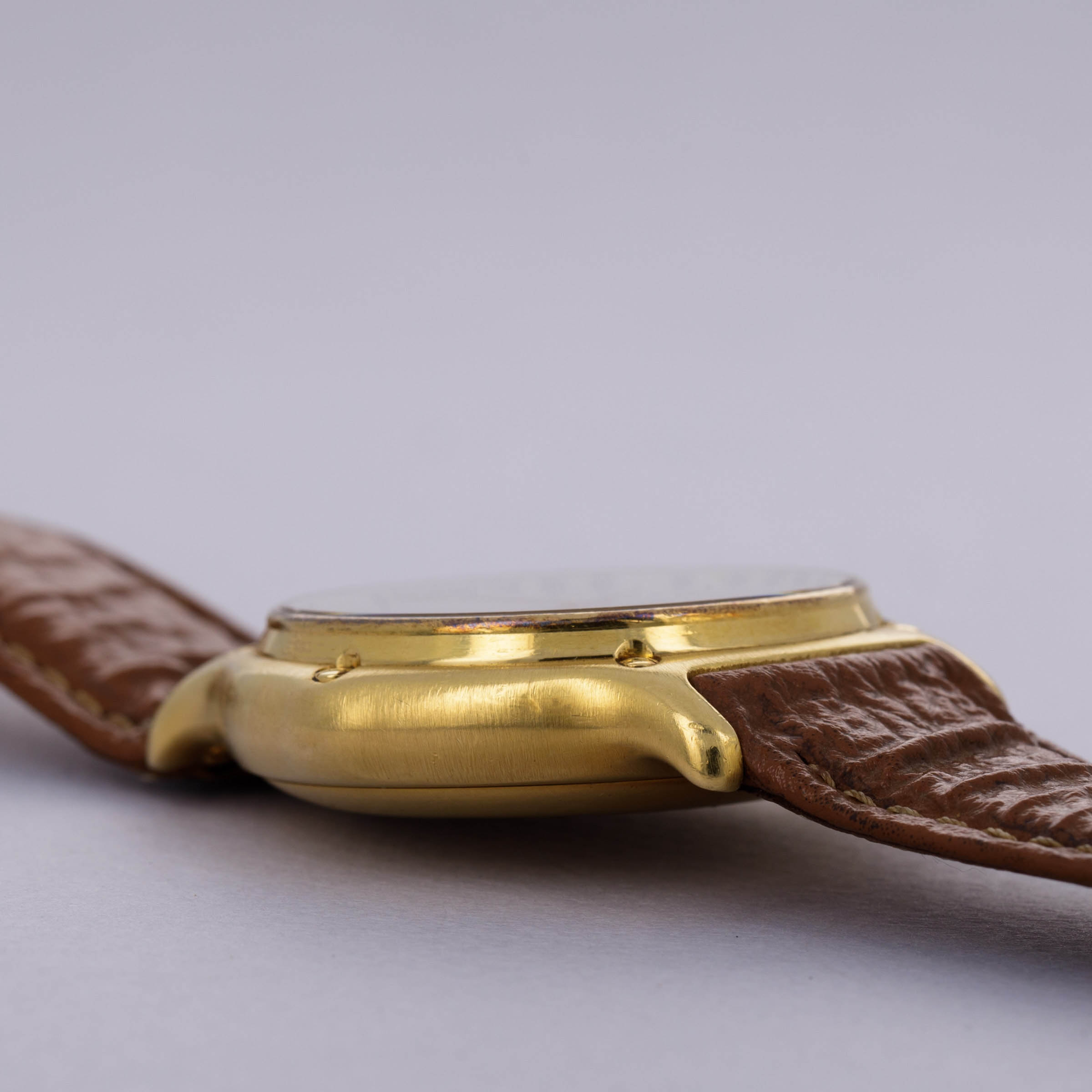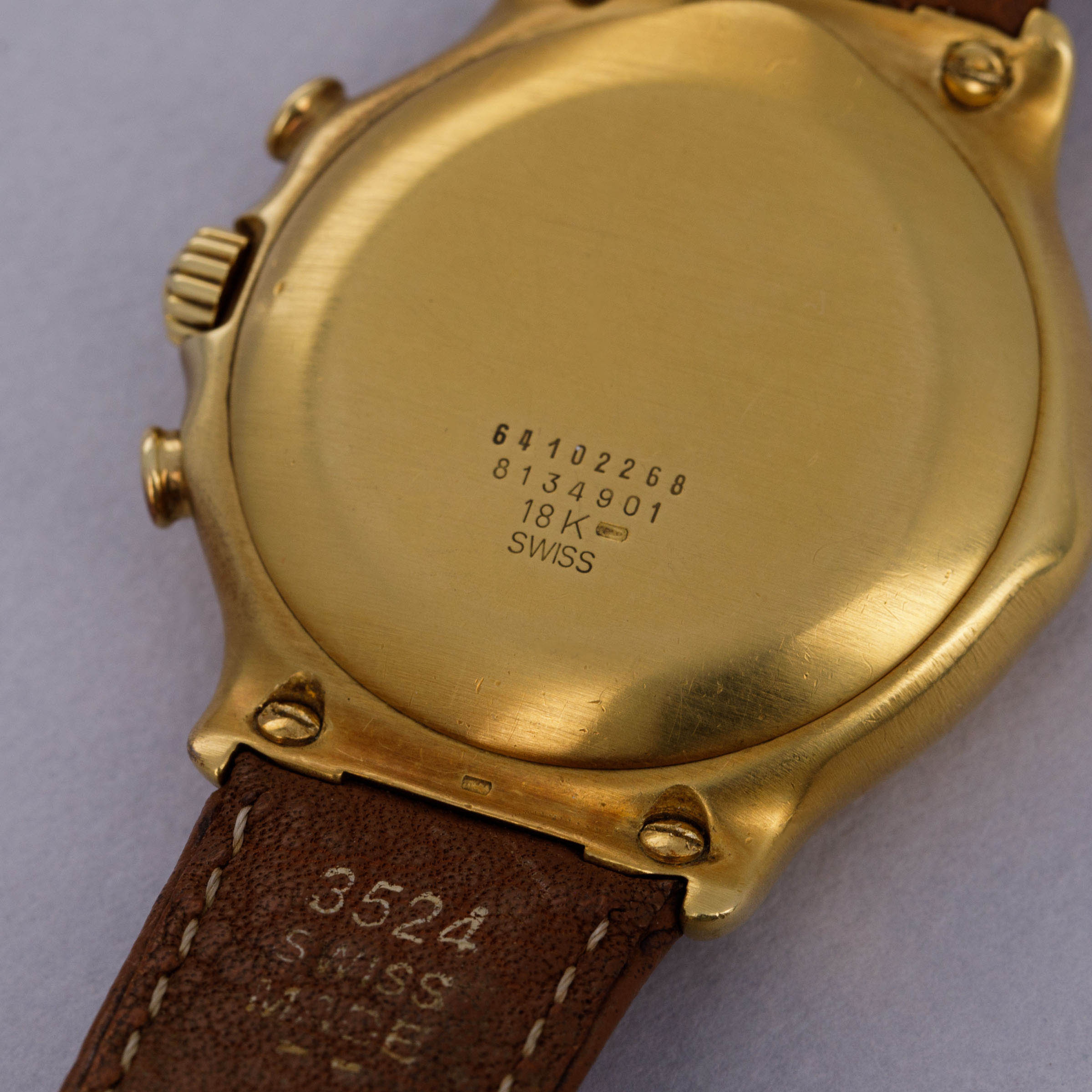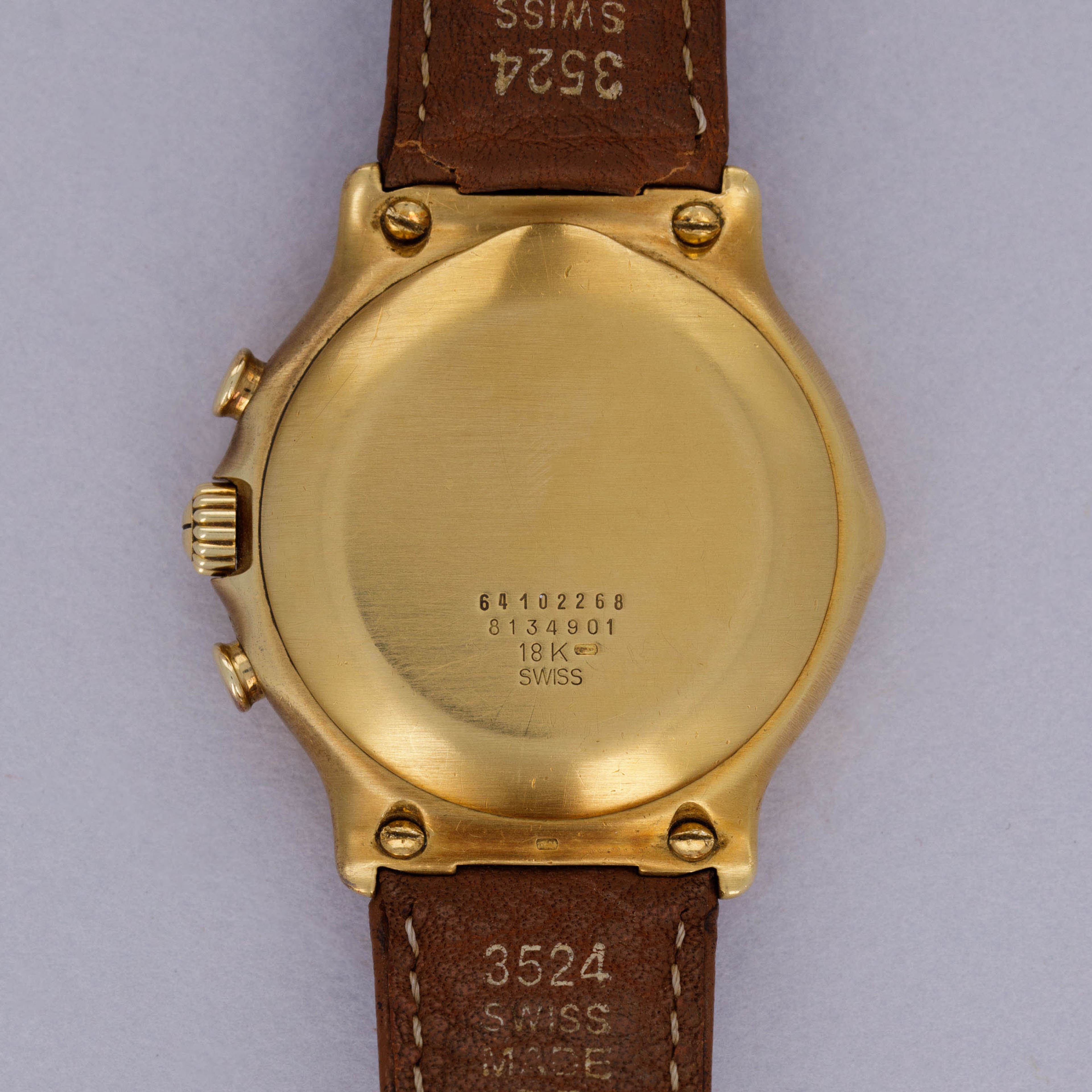 Watch is in very good overall condition. The gold case shows various scratches and marks, with oxidation visible along the surfaces. There are small dings visible along the edge of the bezel. Dial is in excellent condition, with only minor signs of aging visible. The crystal has minor chips and scratches on the surface and edge. Caseback numbers and hallmarks are crisp and fully visible. There is some minor wear visible on the screw heads. Watch comes on an original leather strap with original 18k gold deployant buckle. Please note: The watch is ticking at time of cataloging, but the timing readout is poor and a service is recommended.