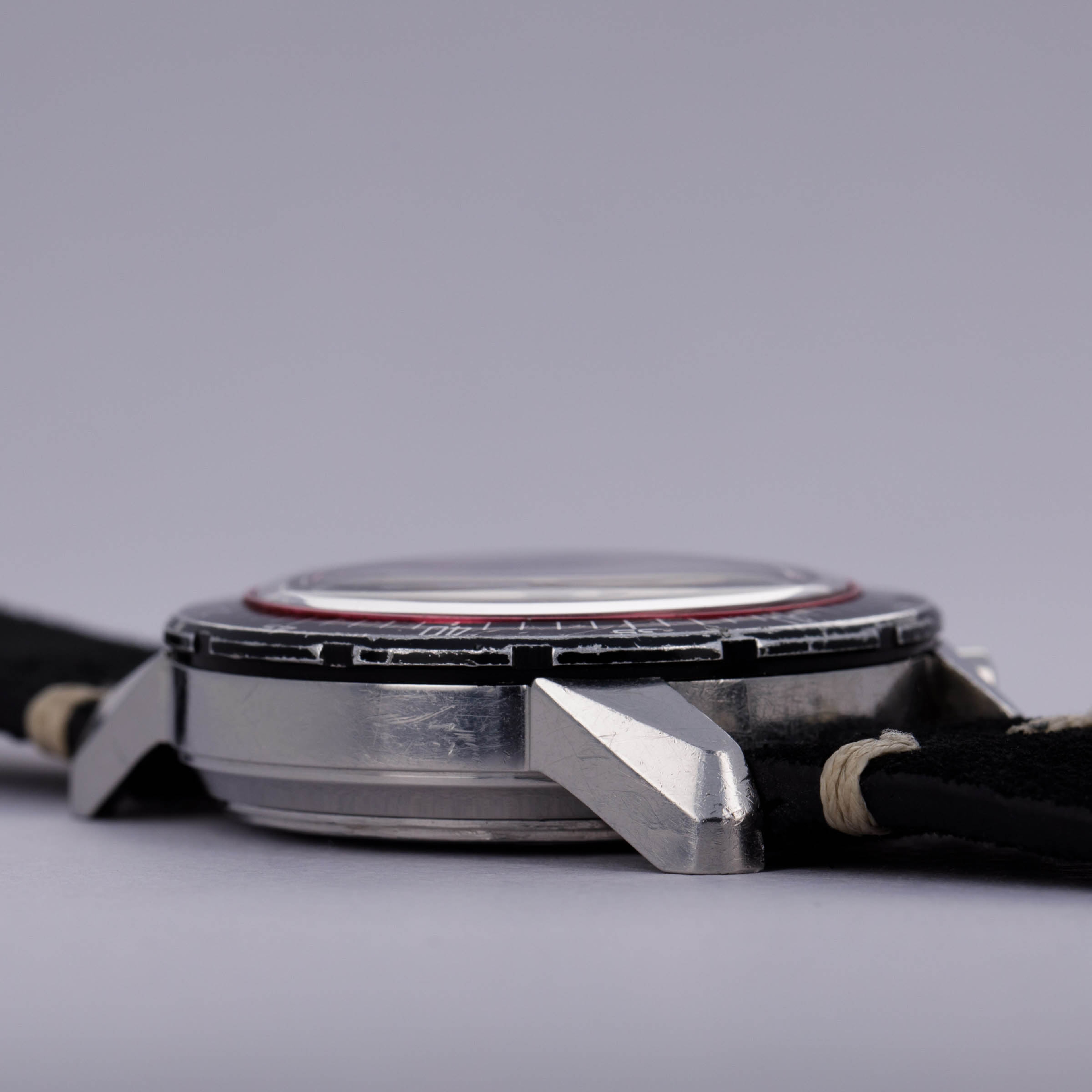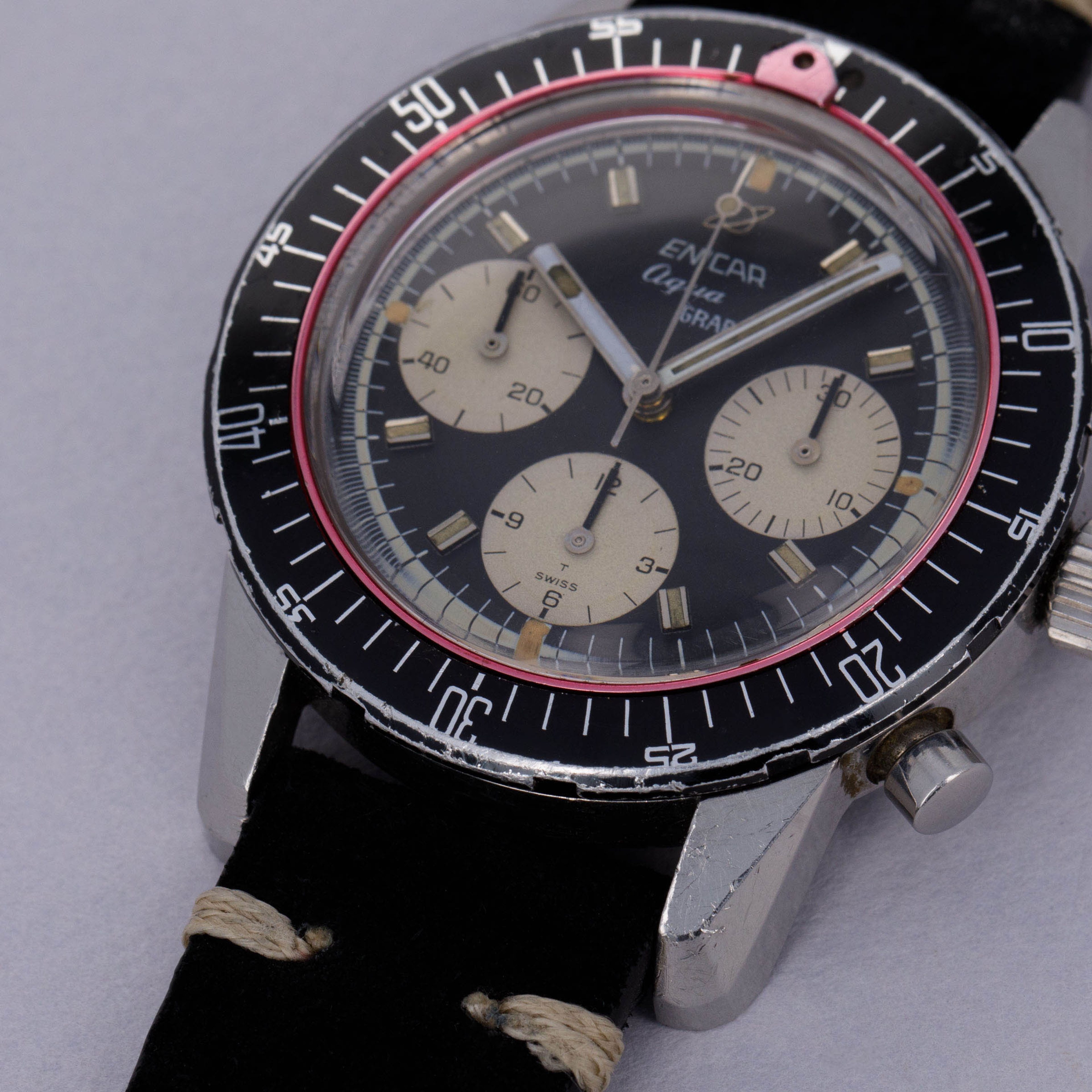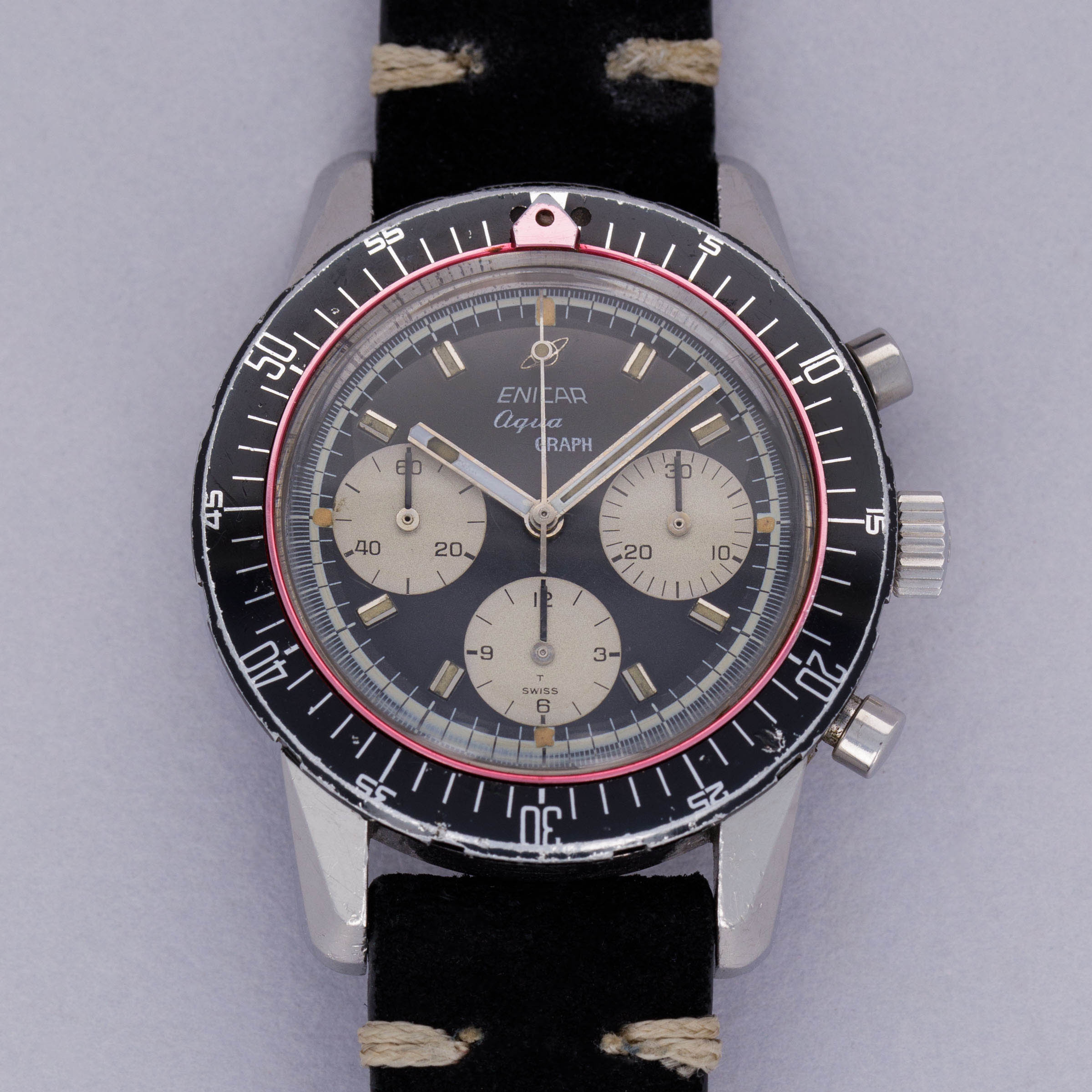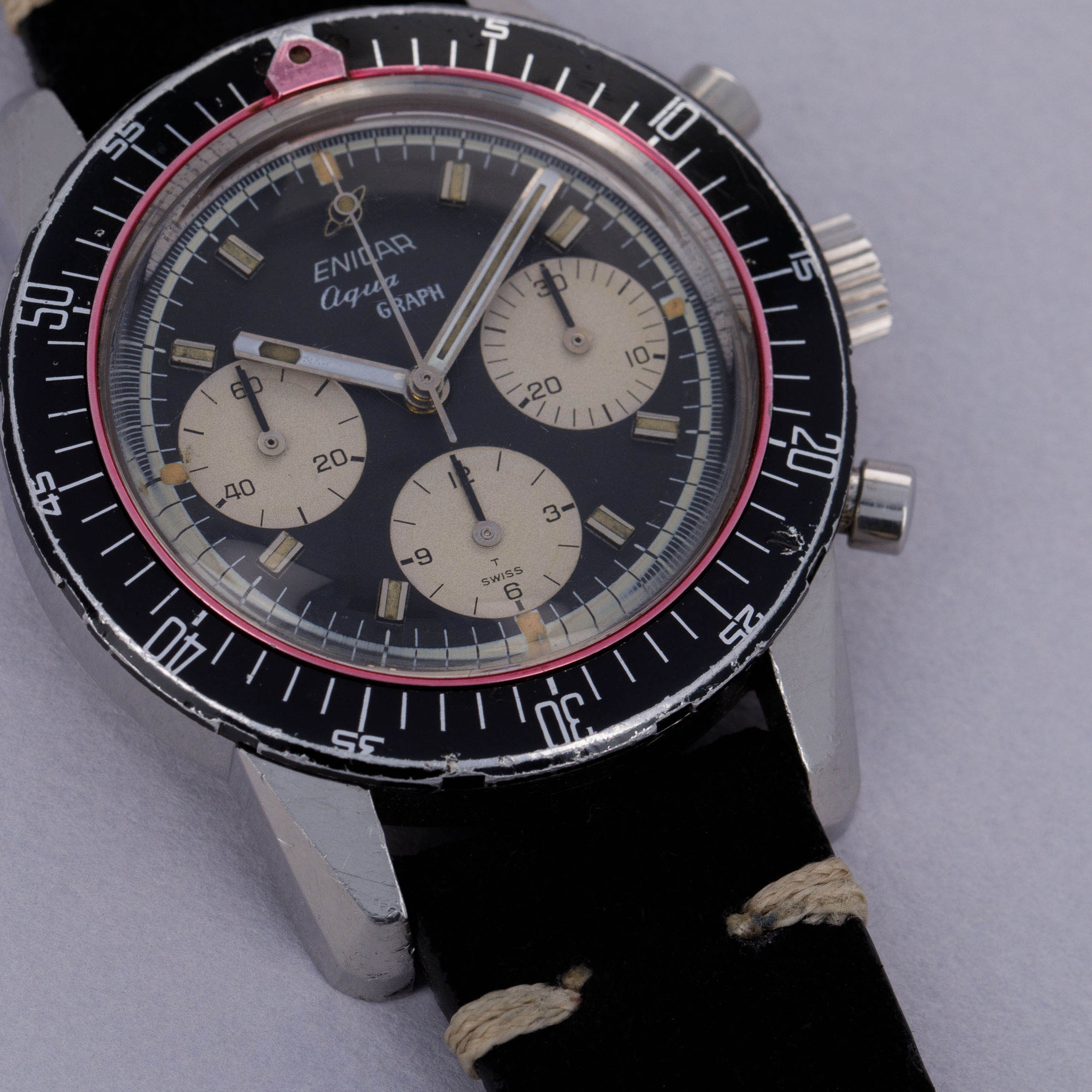 Founded in 1913 by the Racine family, Enicar ('Racine' backwards) grew in popularity thanks to their marketing tactic of supplying mountaineers and other adventurers with their watches in the 1950s. One particularly iconic event in Enicar's growth was when a team of Swiss climbers wore Enicar watches to the top of Lhoste and Mount Everest in 1956. As a result, Enicar registered the sub-brand "Sherpa" and began releasing its first Sherpa watches later in the same year to capitalise on this success. Following on from that, Enicar began to launch other tool watches like the Aqua Graph in 1963, which is a diving chronograph, combining water resistance with the functionality of a chronograph and a rotating 60-minute bezel. Offered here we have a Mk.3 variant of the Aqua Graph from circa. 1967 with a red outer bezel that allowed the wearer to measure elapsed time while diving, without interfering with the bezel’s functionality. Made of stainless steel and measuring 40.5mm in diameter, the Aqua Graph was a huge watch for when it was released, and as a result, it now provides modern collectors to enjoy the world of vintage without compromising on contemporary sizing.
