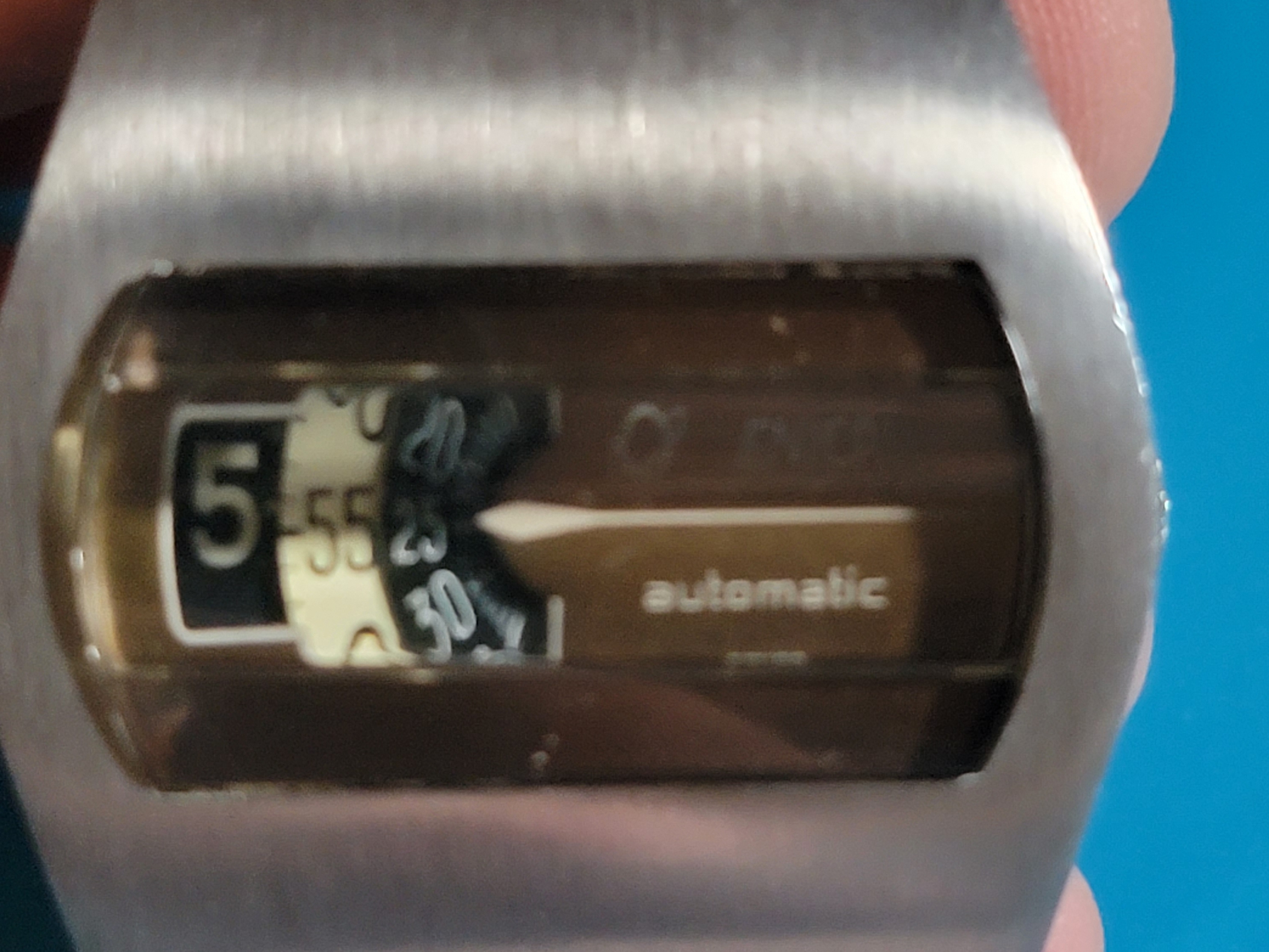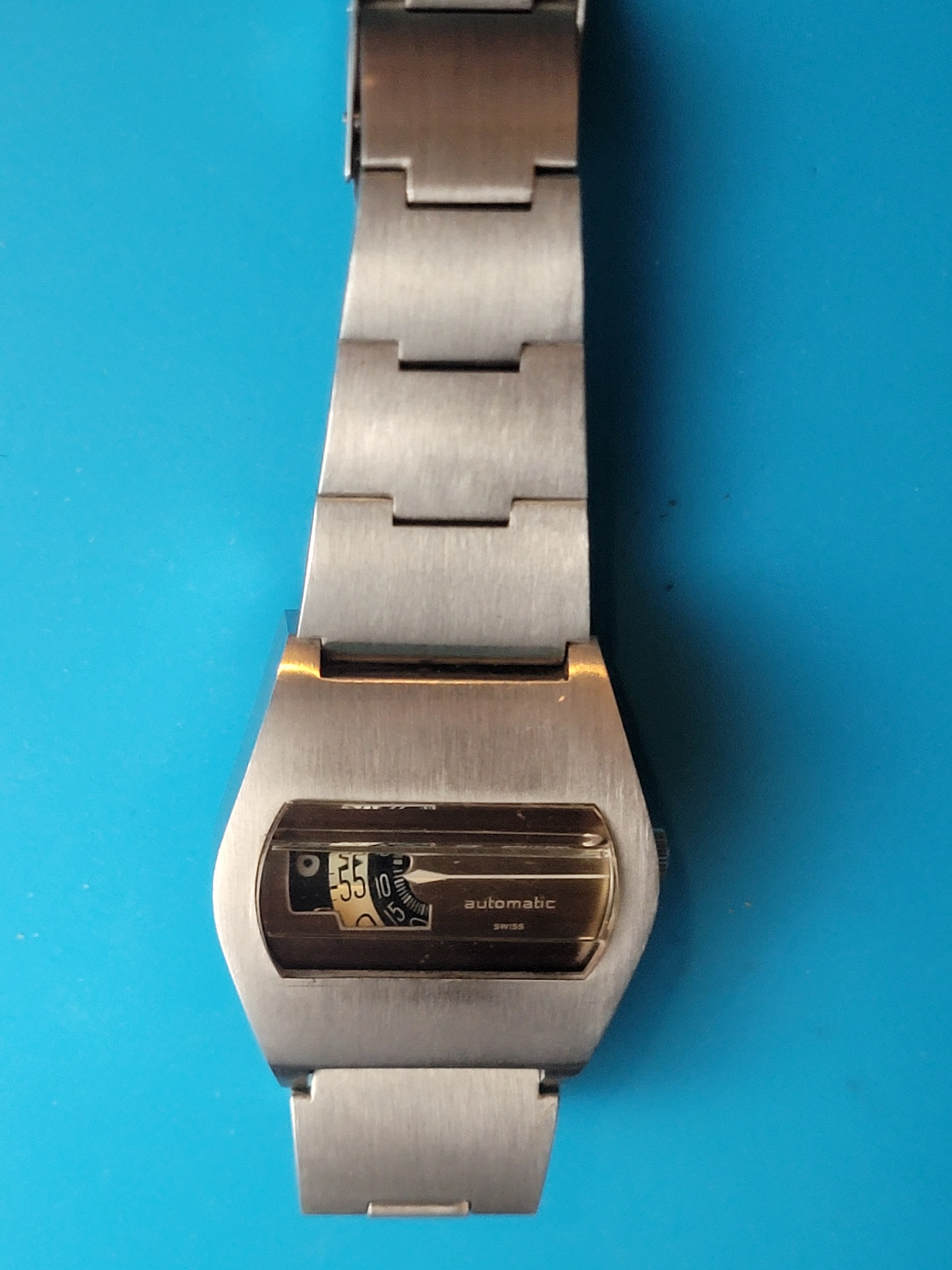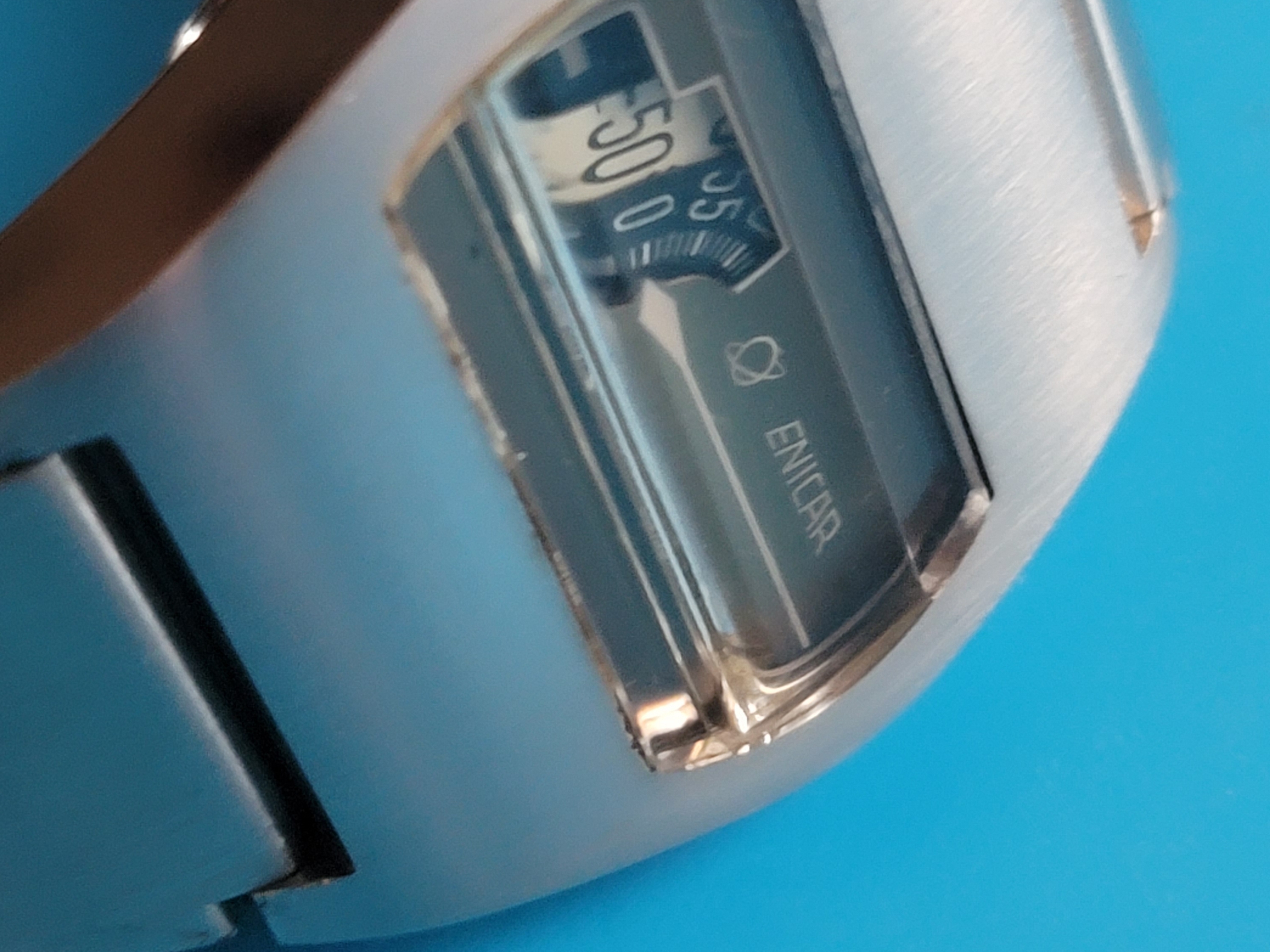 Enicar Automatic Mechanical Digital Jump Hour. The watch is in excellent condition for a vintage watch with some minor blemishes/hairline scratches on the brushed bezel and bracelet that are barely visible. The watch runs, however service history is unknown and accuracy is not guaranteed.