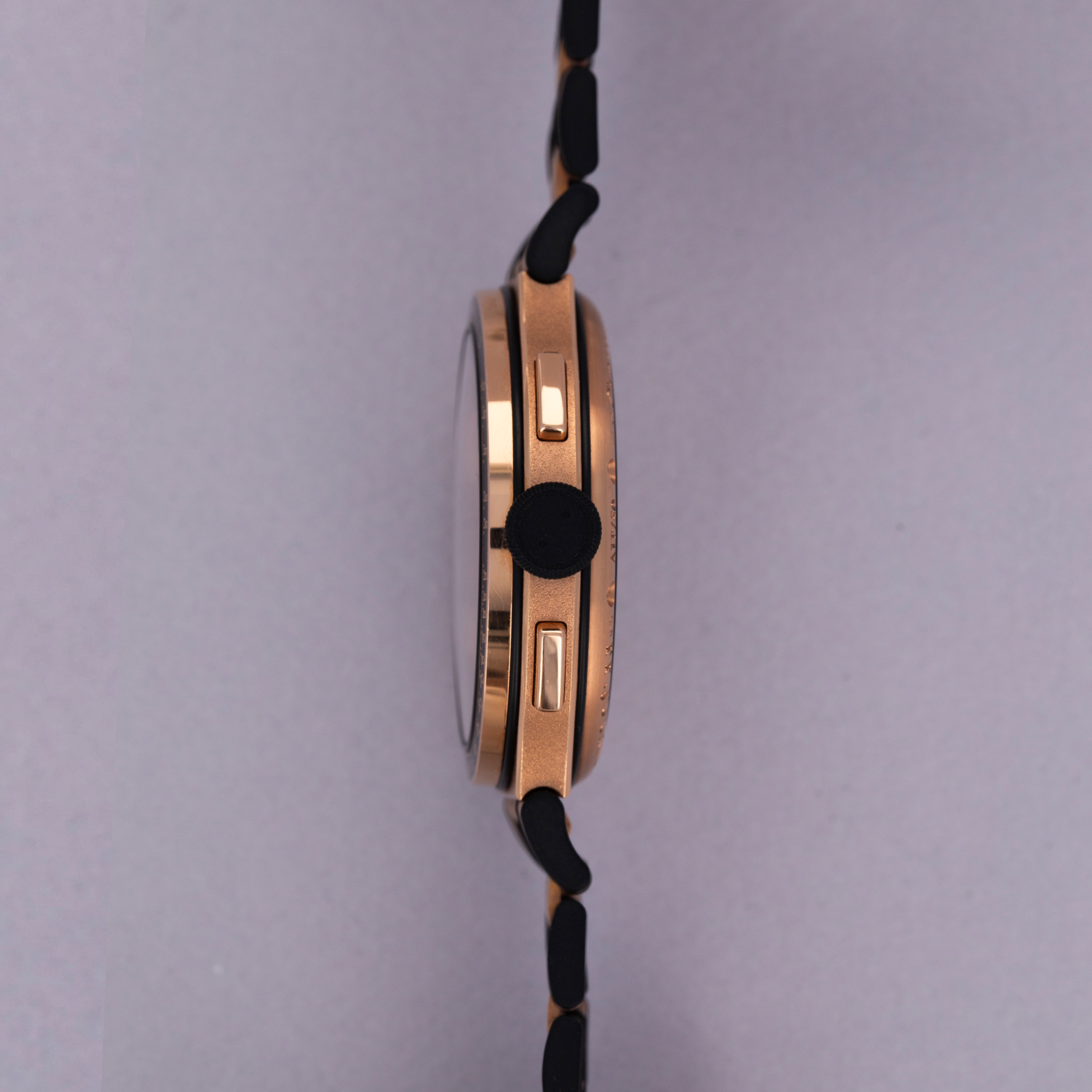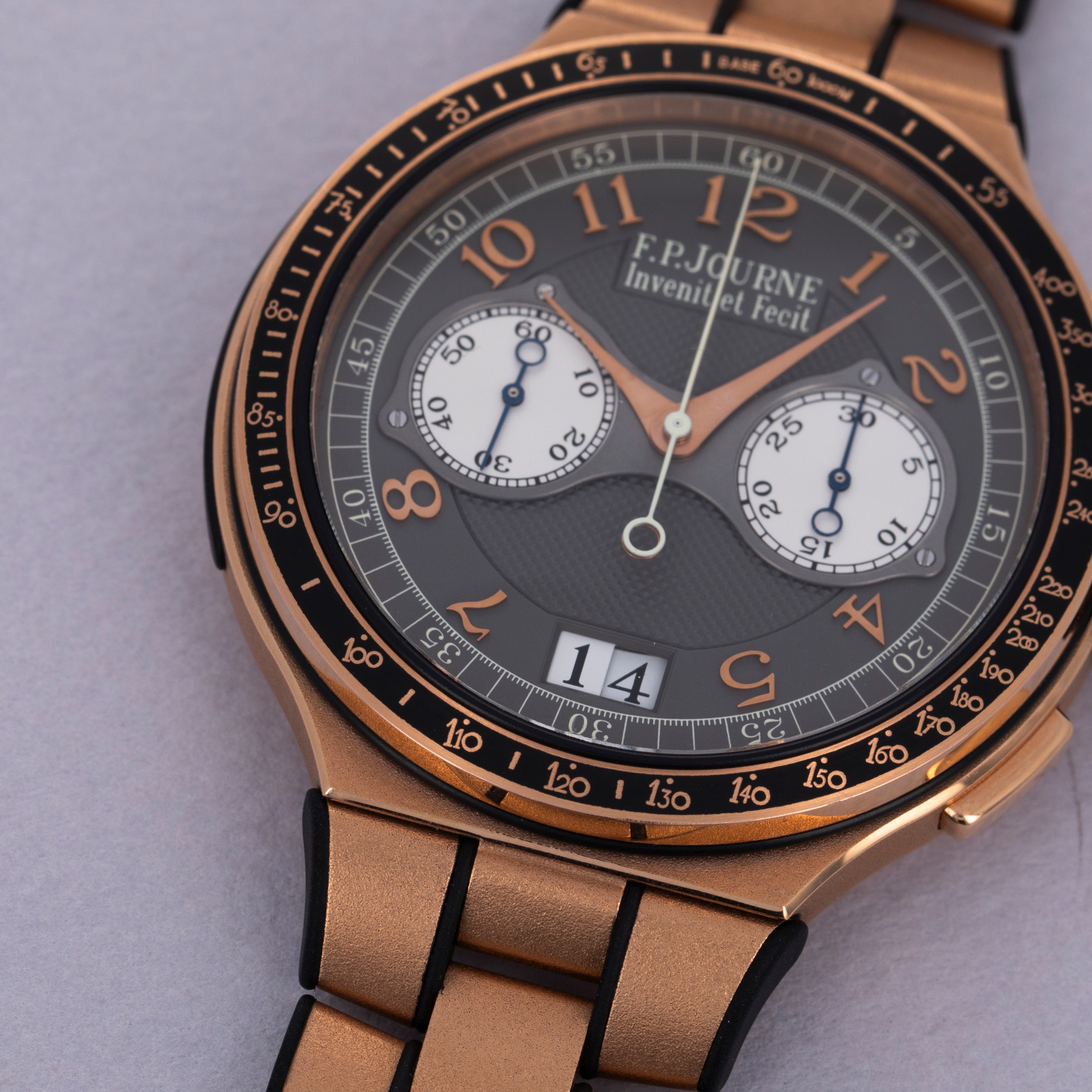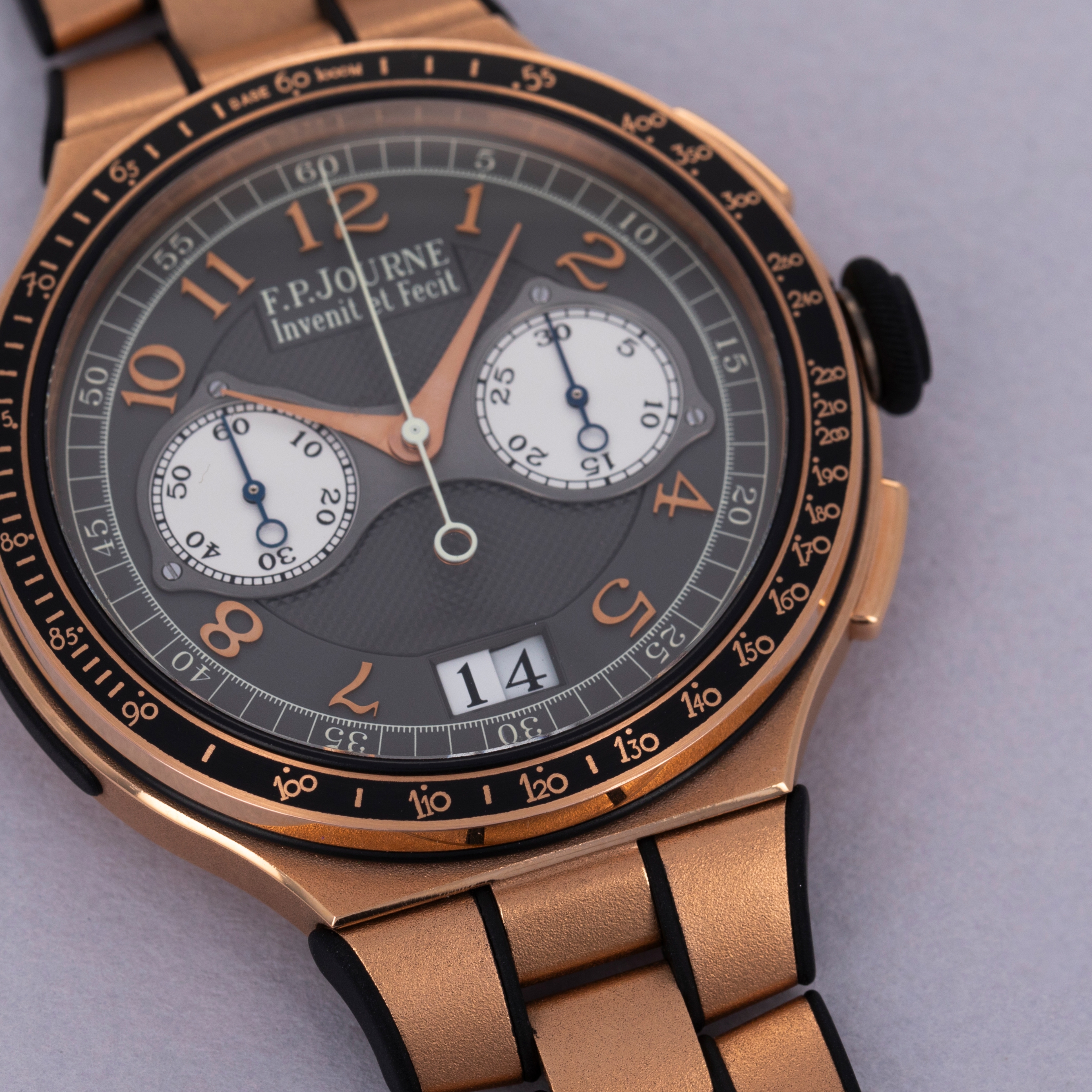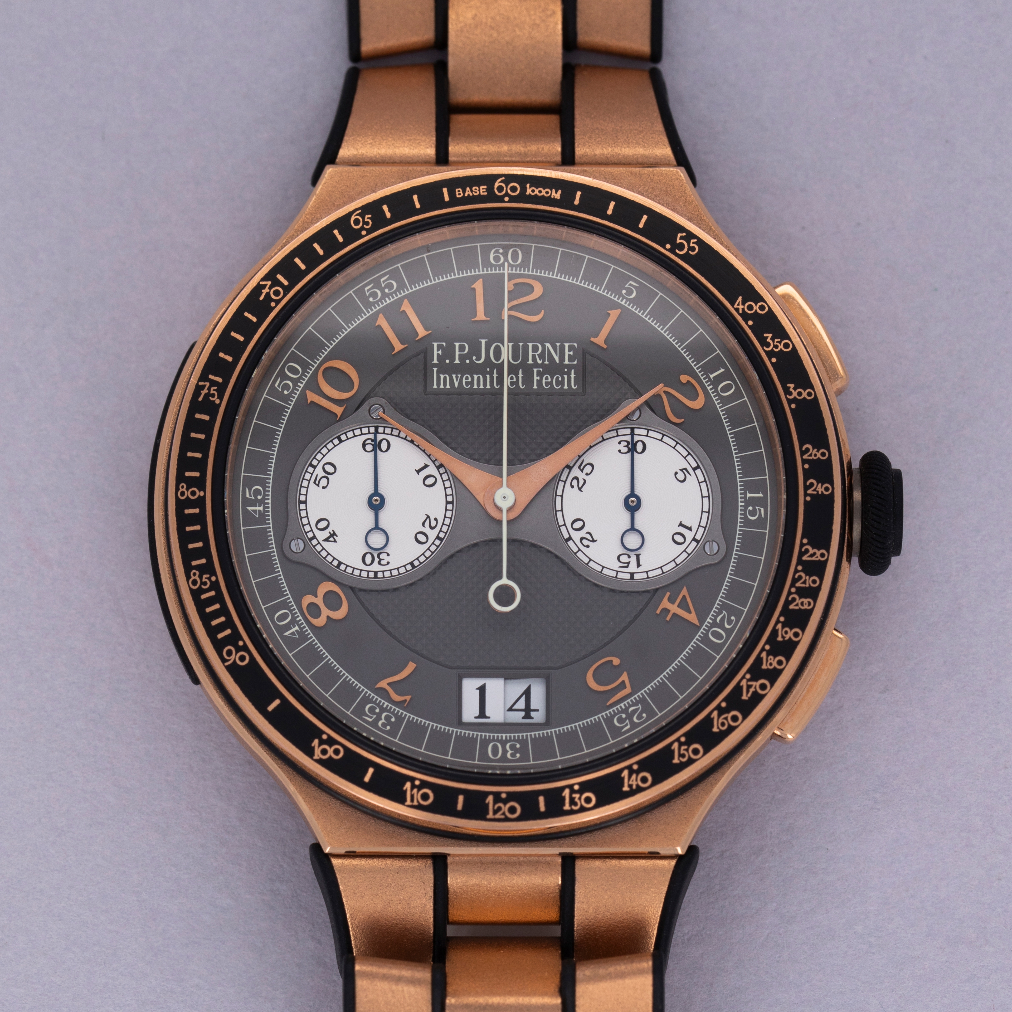Boasting a grey dial with brown undertones that contrast the warm hue of its 18kt rose gold case, the Monopusher Chronograph sports large Arabic numerals with a large date aperture at 6 o'clock and F.P. Journe's signature screw-down dial plate making up the two subdials.