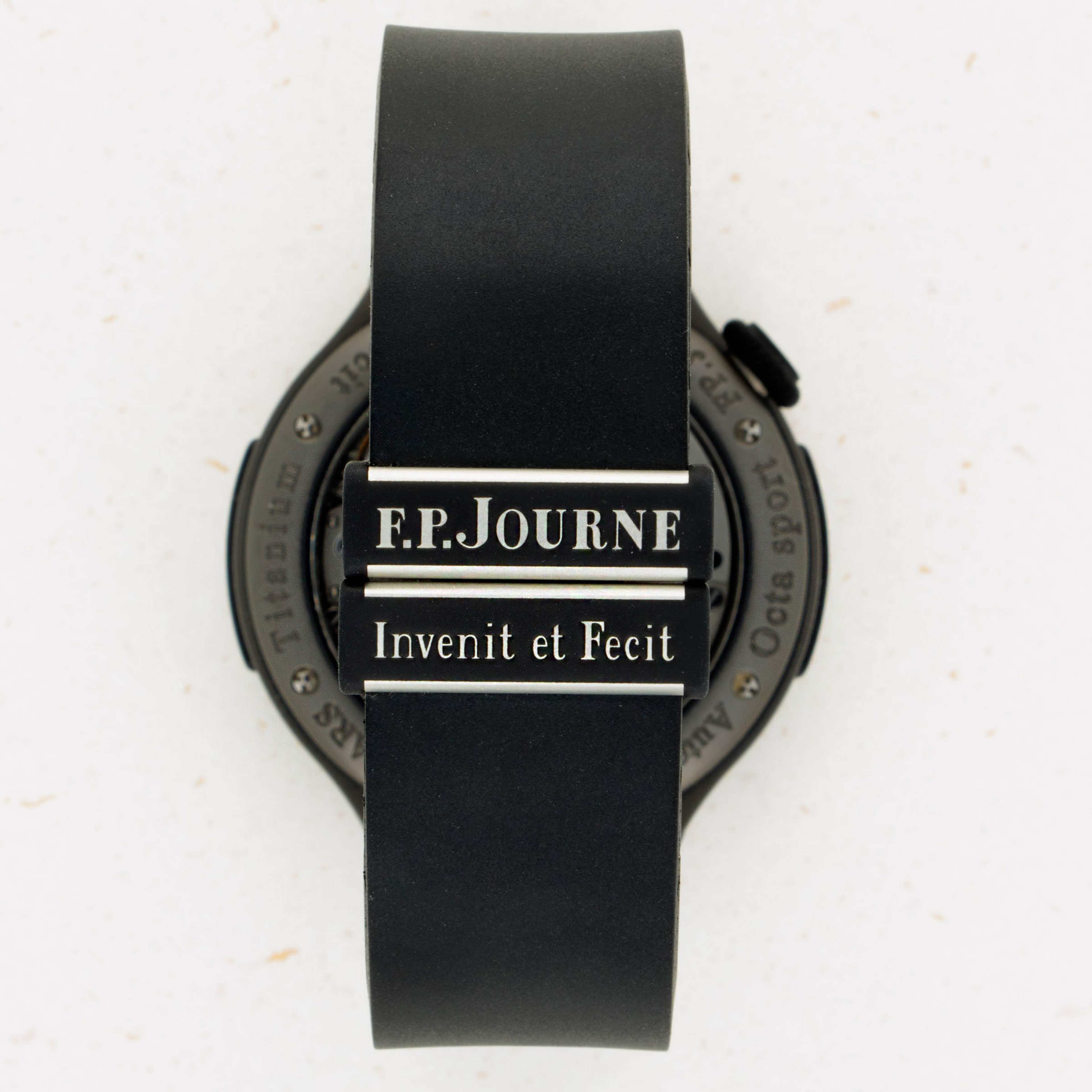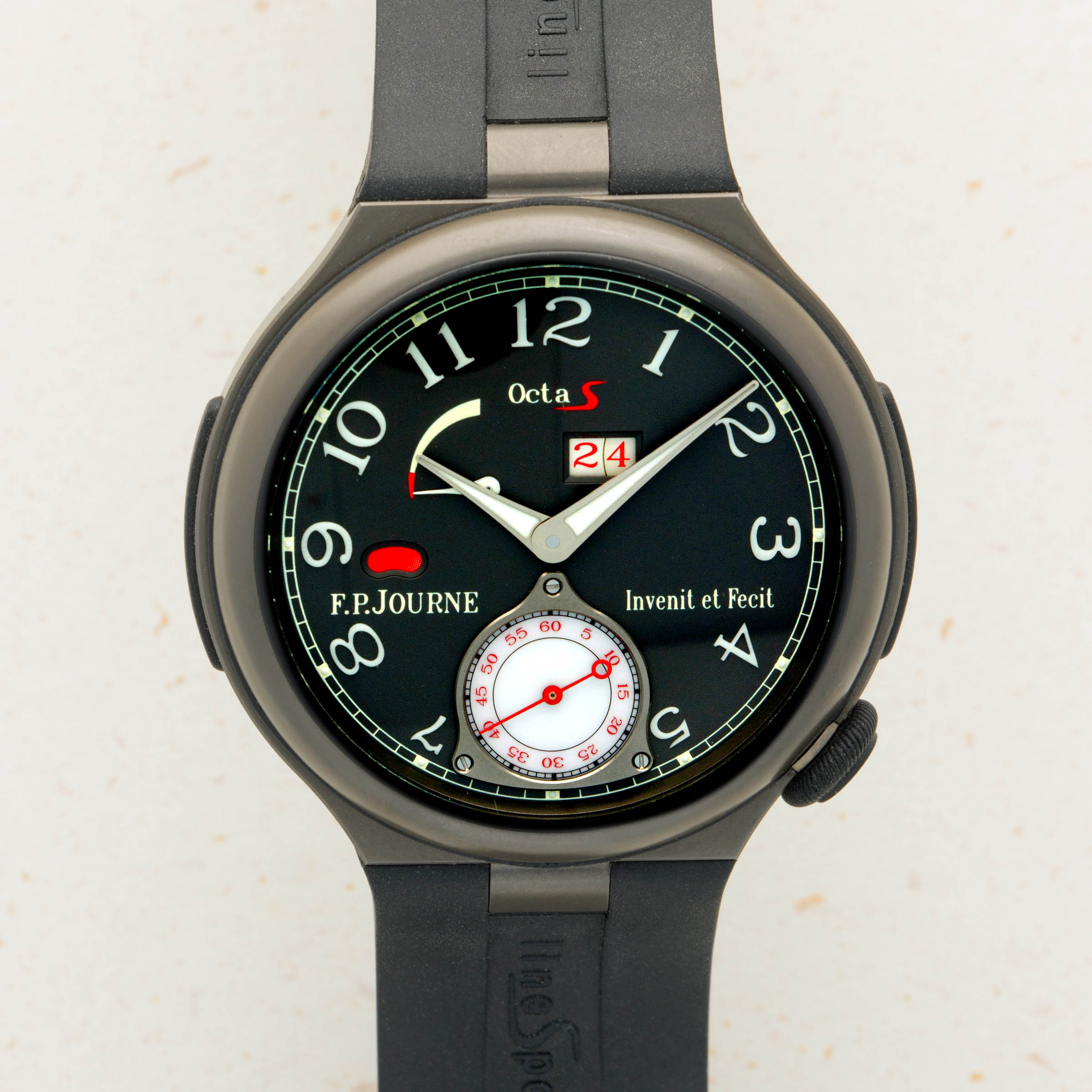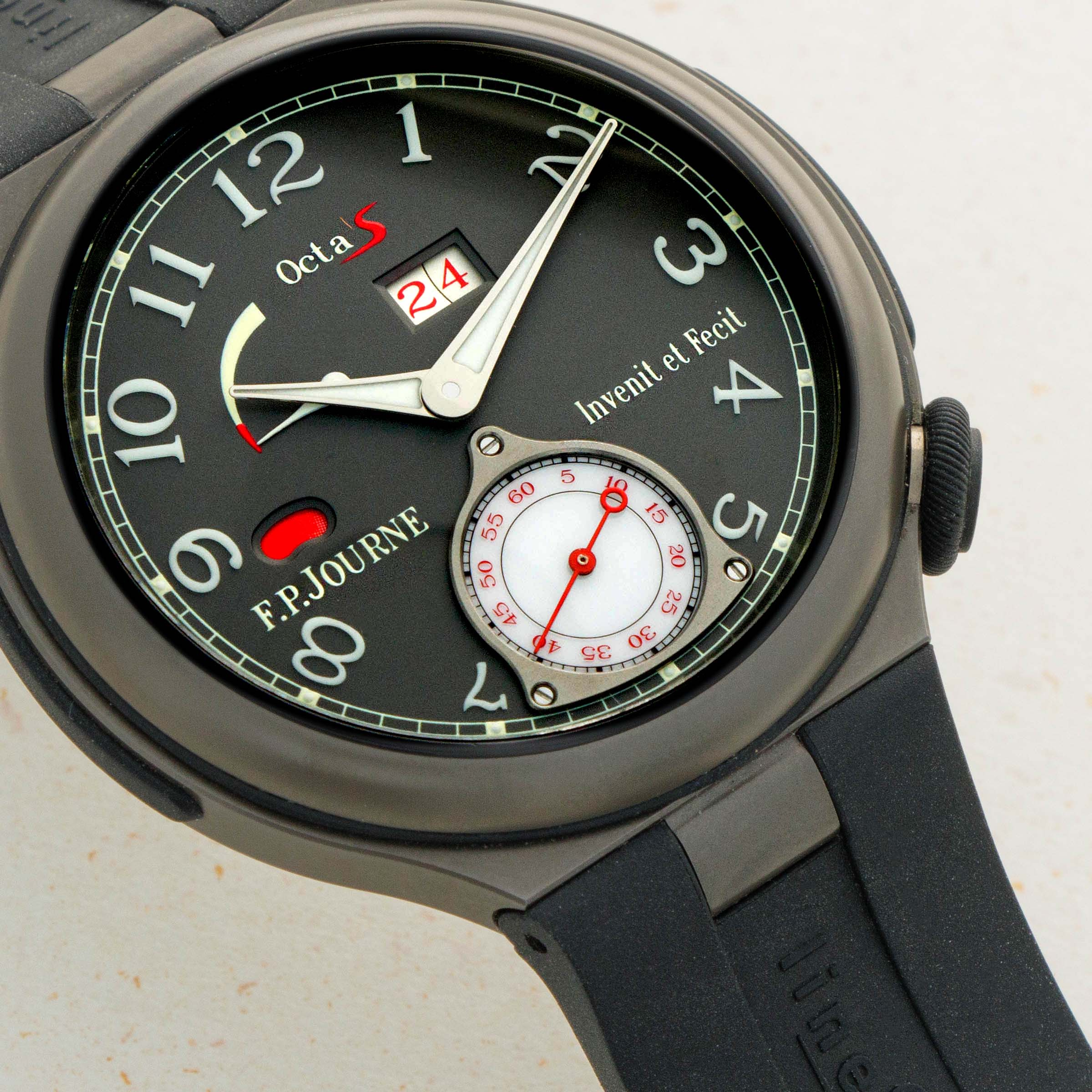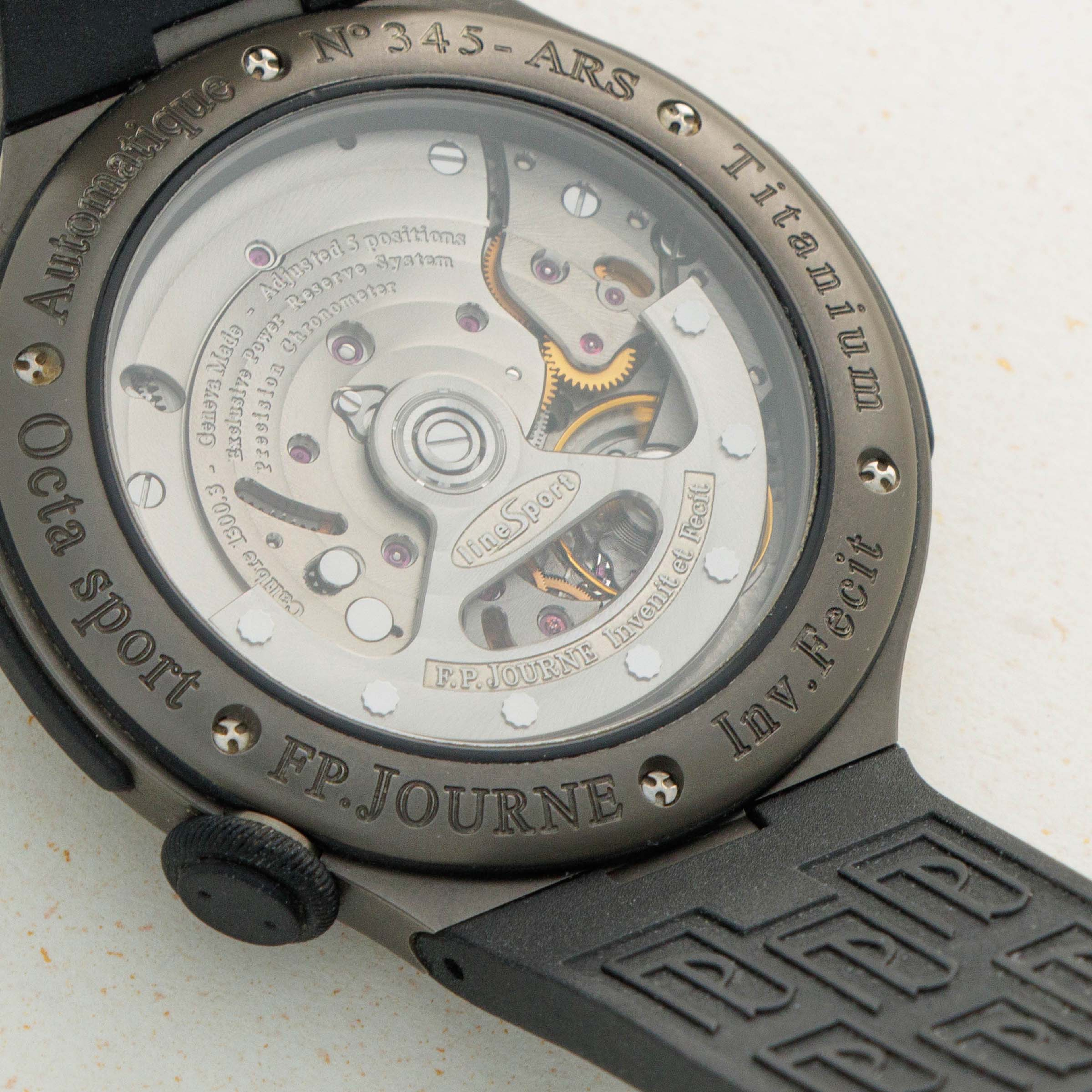 First launched in 2011 as F.P. Journe’s first sports watch and originally made of aluminium, the Octa Sport has long been established as an extension of F.P. Journe's unwavering desire to create timepieces that push boundaries that other watchmakers never even knew existed. Inspired by one of F.P. Journe’s most dedicated collectors who wanted a light F.P. Journe timepiece to wear during his marathons and triathlon events, the Octa Sport is an incredibly light timepiece boasting all of F.P. Journe’s famed high-horology. With its case made of titanium and featuring an aluminum movement, the cal. 1300.3, the Octa Sport weighs an incredibly light 60 grams on its black rubber strap. With a rubber reinforced case designed to protect the watch against shocks, a sleek monochromatic aesthetic and an impressive array of complications such as a power reserve indicator, a screwed-down small seconds display at 6 o'clock, a day/night indication at 8 o'clock, and large luminescent Arabic numerals, the Octa Sport still retains the capable essence of a sports watch but with a F.P. Journe's distinctive design language. Featuring the brand’s signature braided rope crown at 4:30 and branding across its dial, there is certainly no doubt which powerhouse of horology created this immaculate timepiece.