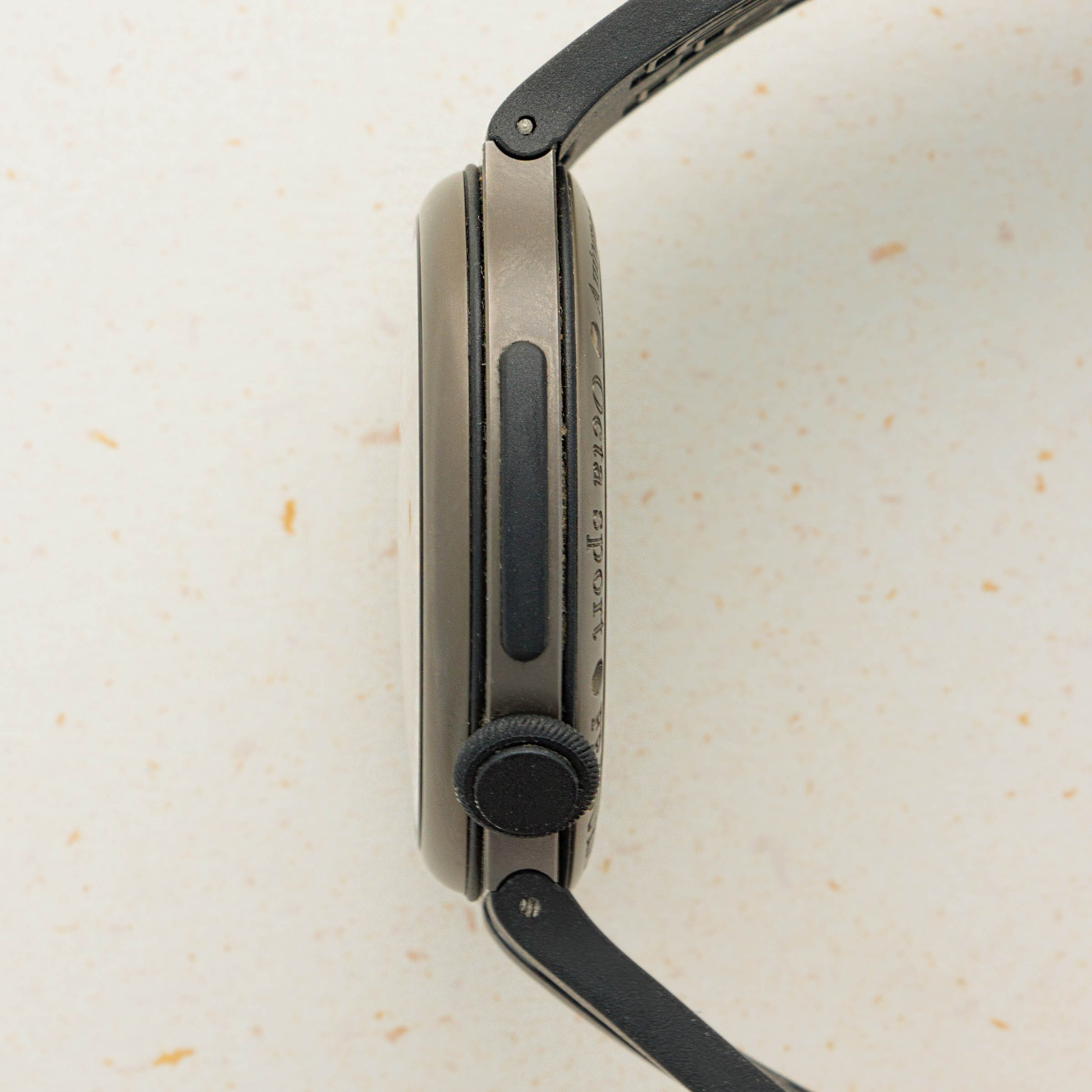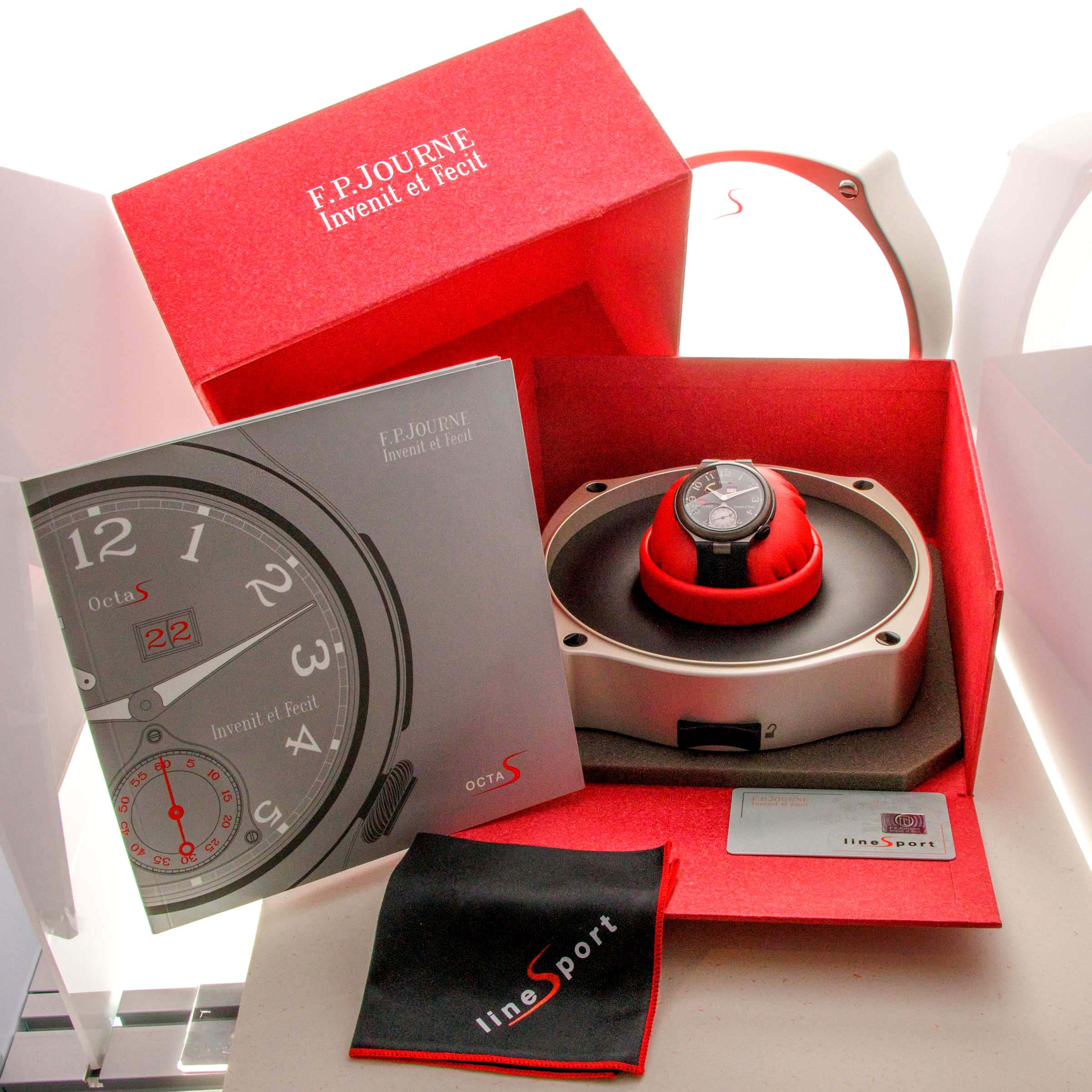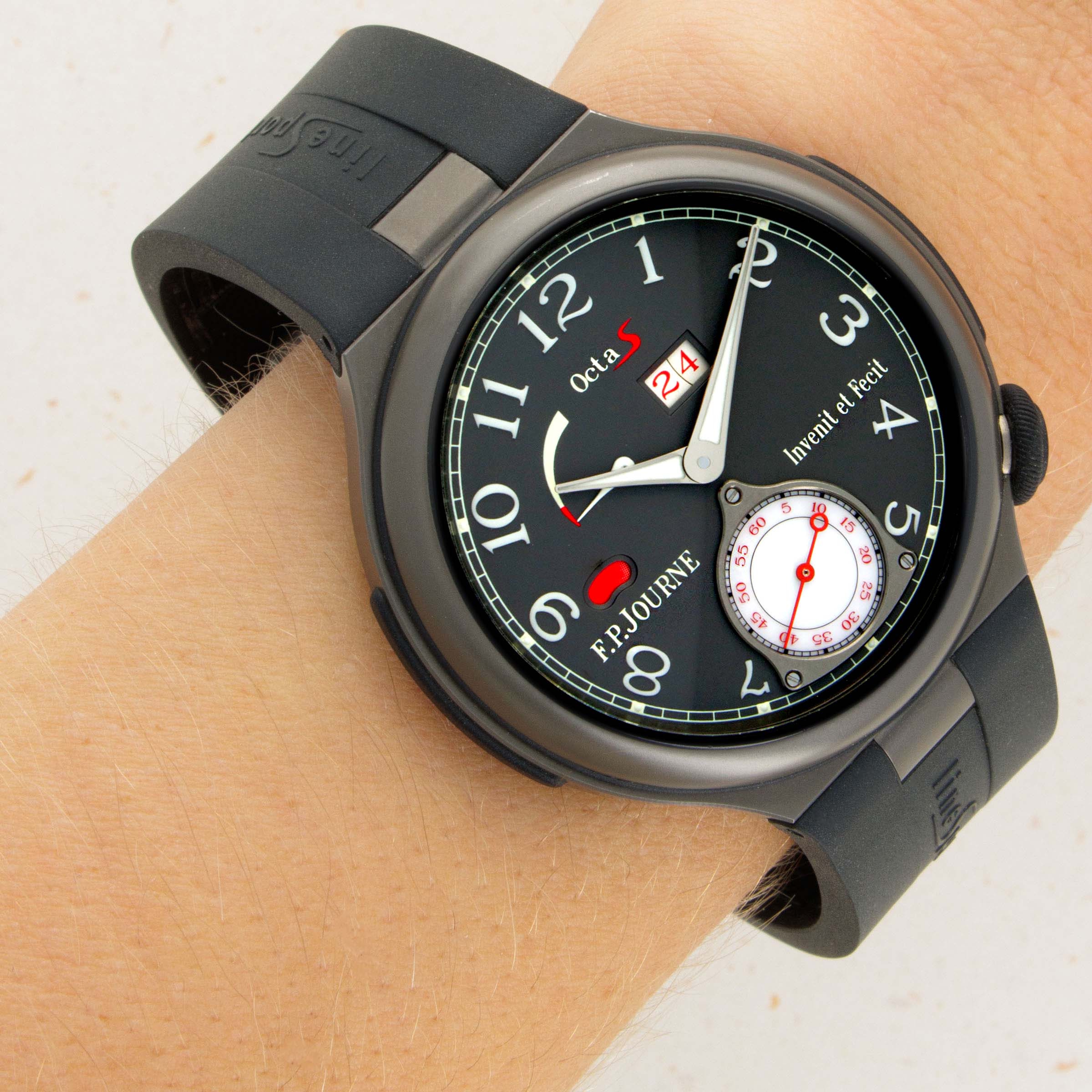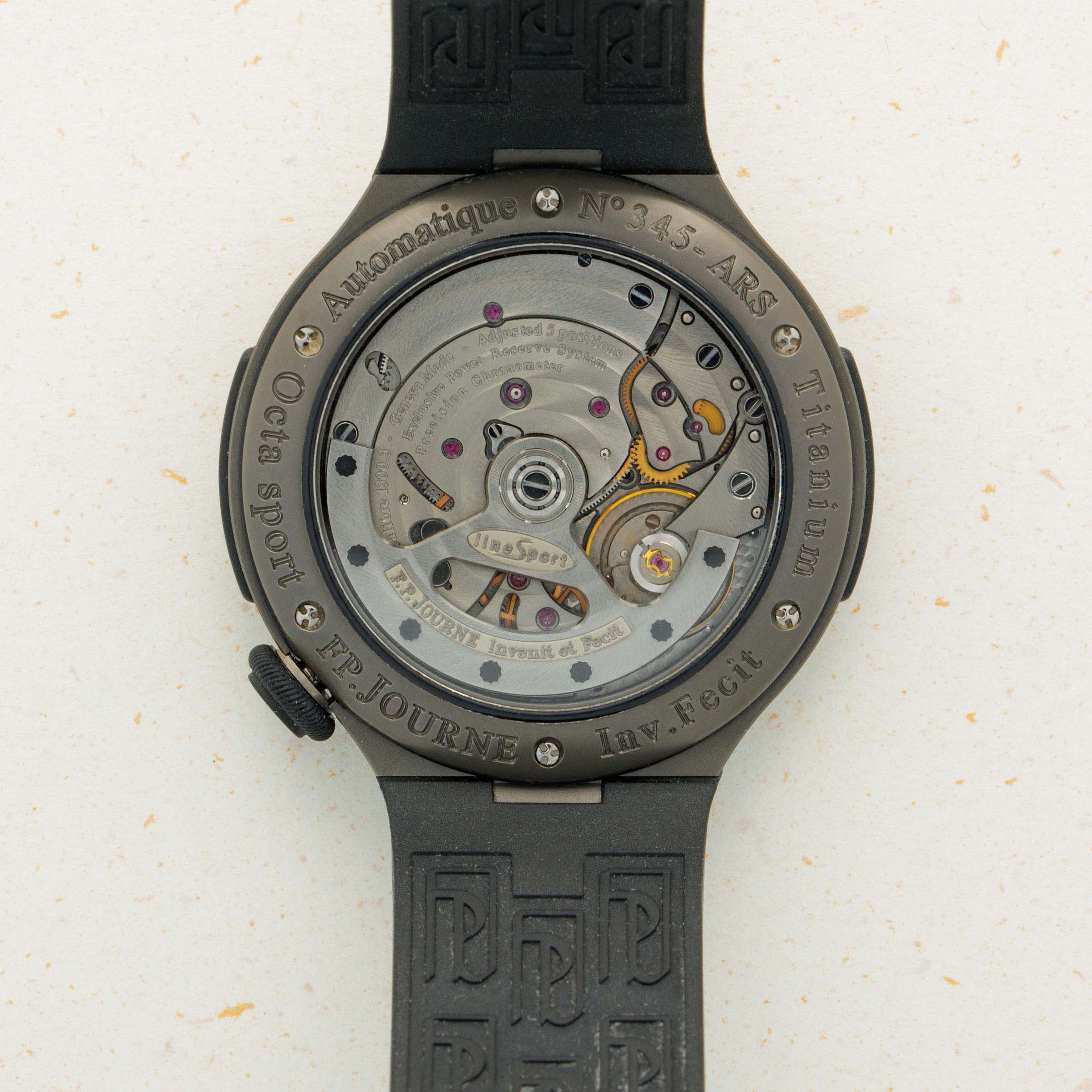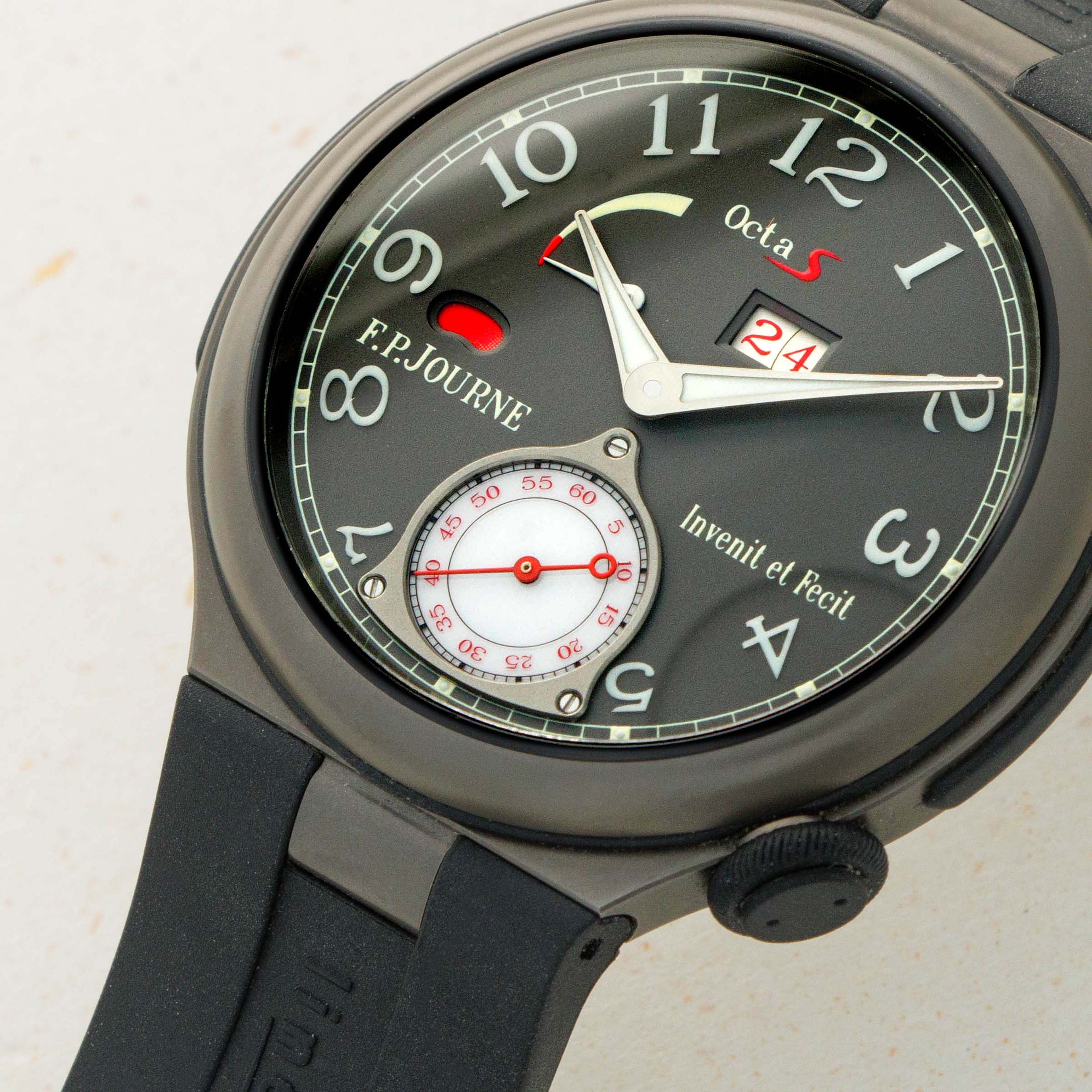 First launched in 2011 as F.P. Journe’s first sports watch and originally made of aluminium, the Octa Sport has long been established as an extension of F.P. Journe's unwavering desire to create timepieces that push boundaries that other watchmakers never even knew existed. Inspired by one of F.P. Journe’s most dedicated collectors who wanted a light F.P. Journe timepiece to wear during his marathons and triathlon events, the Octa Sport is an incredibly light timepiece boasting all of F.P. Journe’s famed high-horology. With its case made of titanium and featuring an aluminum movement, the cal. 1300.3, the Octa Sport weighs an incredibly light 60 grams on its black rubber strap. With a rubber reinforced case designed to protect the watch against shocks, a sleek monochromatic aesthetic and an impressive array of complications such as a power reserve indicator, a screwed-down small seconds display at 6 o'clock, a day/night indication at 8 o'clock, and large luminescent Arabic numerals, the Octa Sport still retains the capable essence of a sports watch but with a F.P. Journe's distinctive design language. Featuring the brand’s signature braided rope crown at 4:30 and branding across its dial, there is certainly no doubt which powerhouse of horology created this immaculate timepiece.