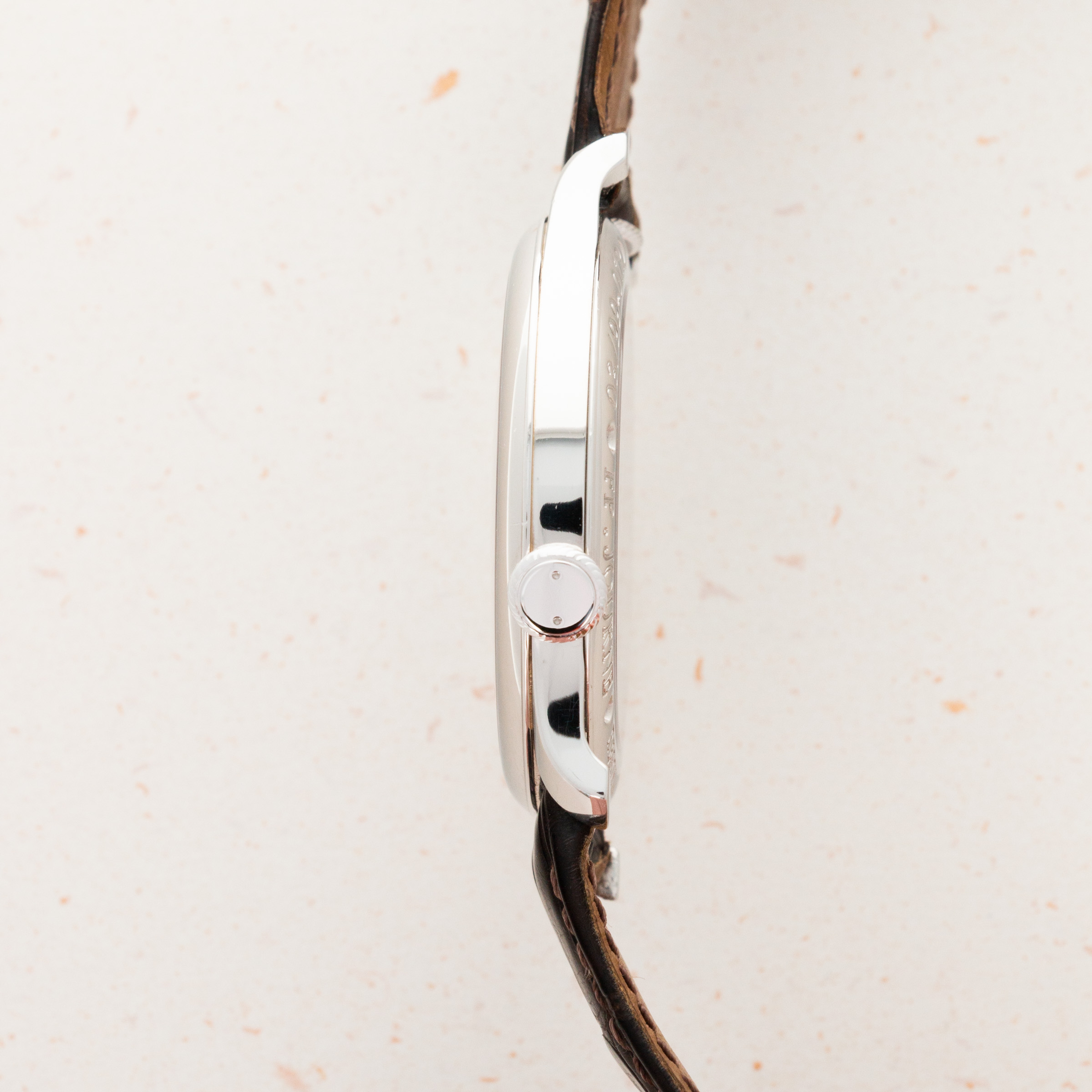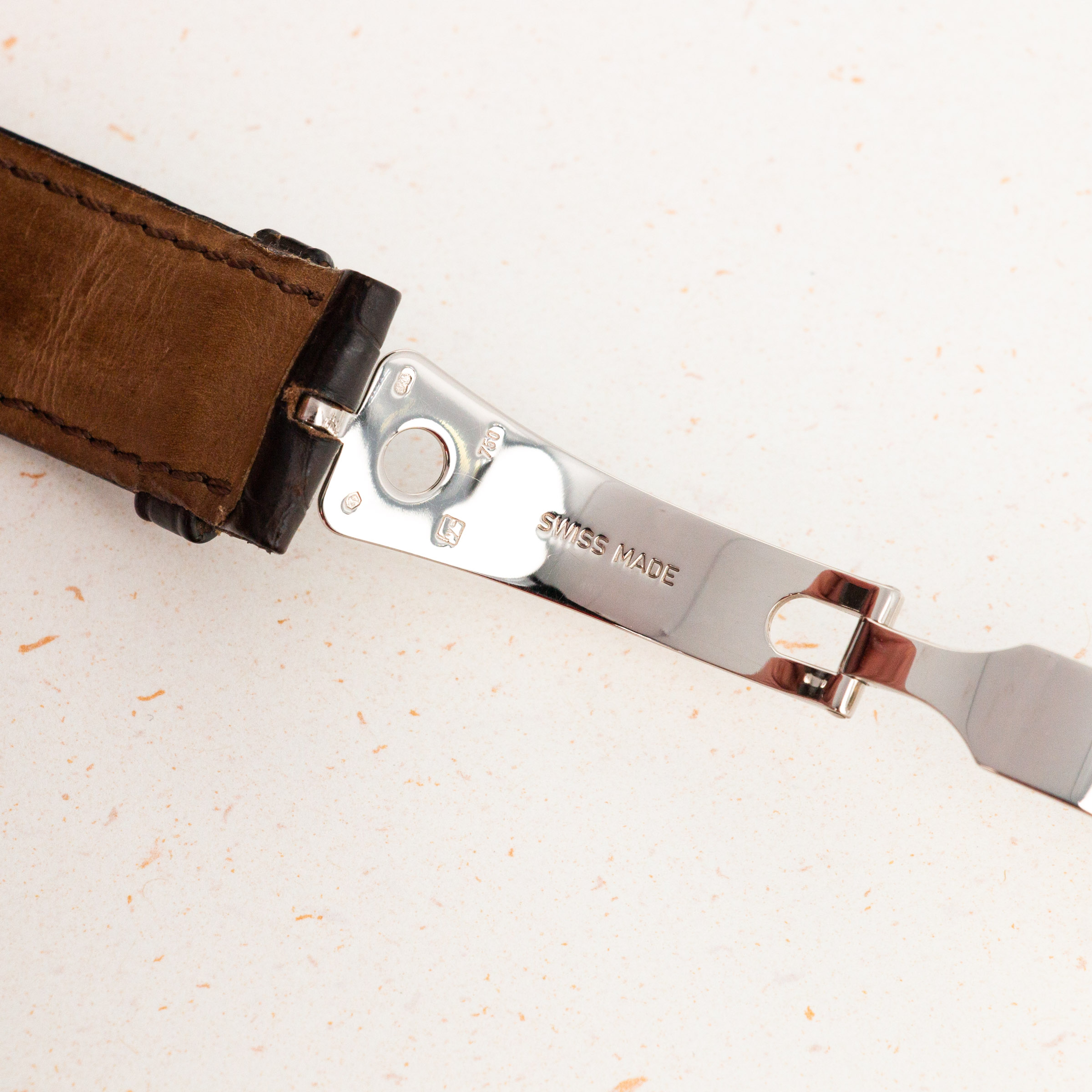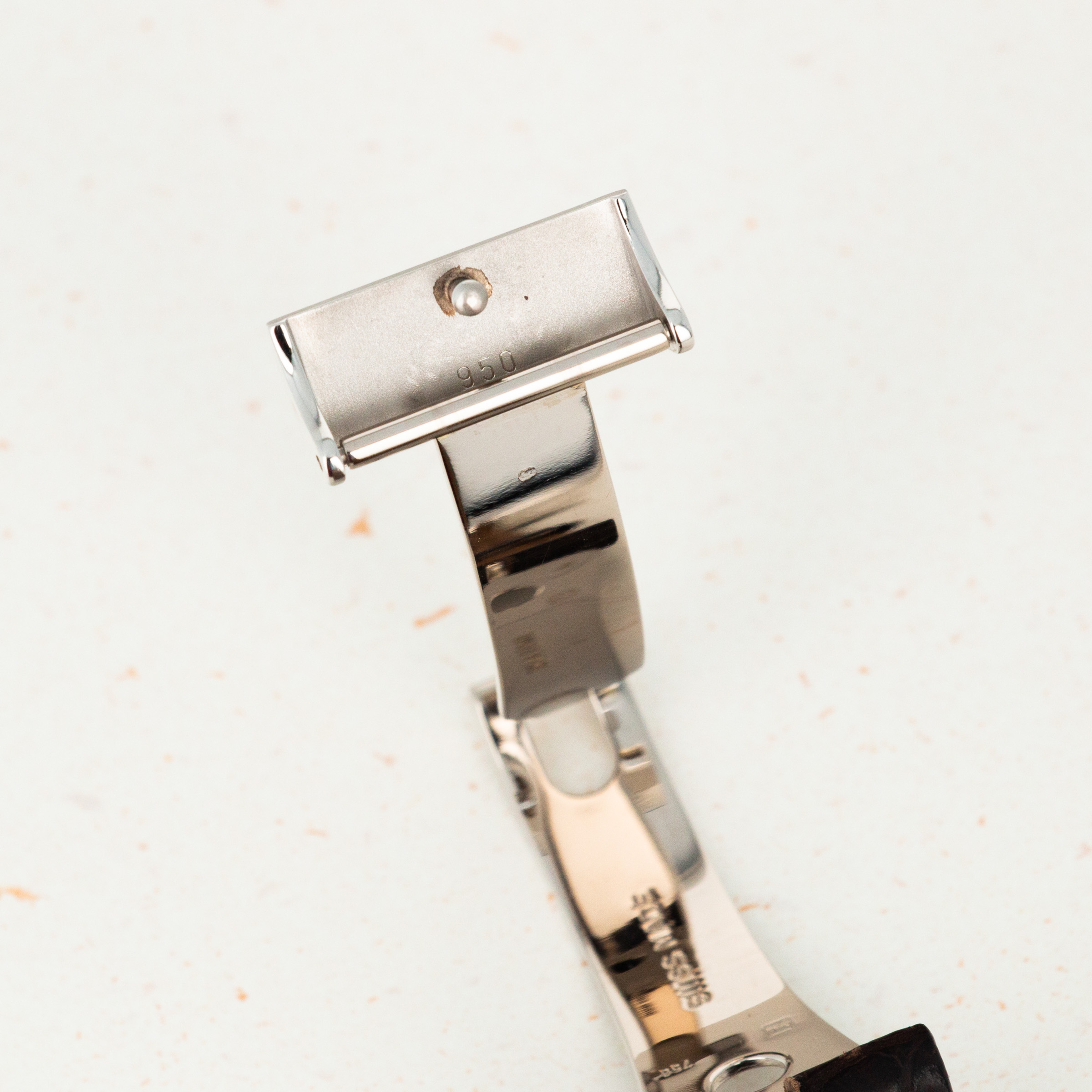 Watch is in very good to excellent original condition. Ruthenium dial has no imperfections. Case has minor surface scratches consistent with average wear. Most of of the scratches are along the bezel of the watch. Original strap has moderate signs of wear along the lining. It comes with both the platinum deployant buckle, as well as the original platinum tang buckle.