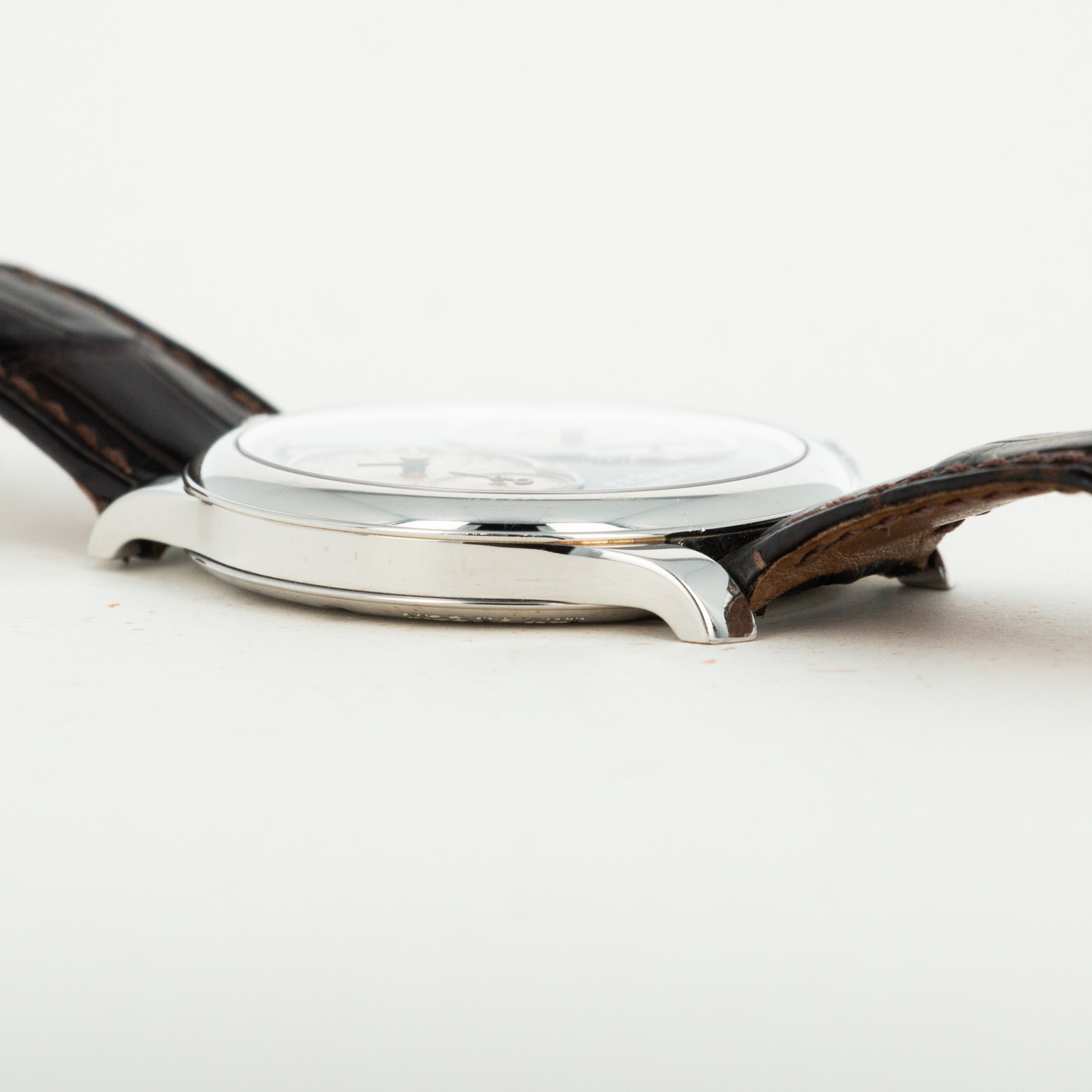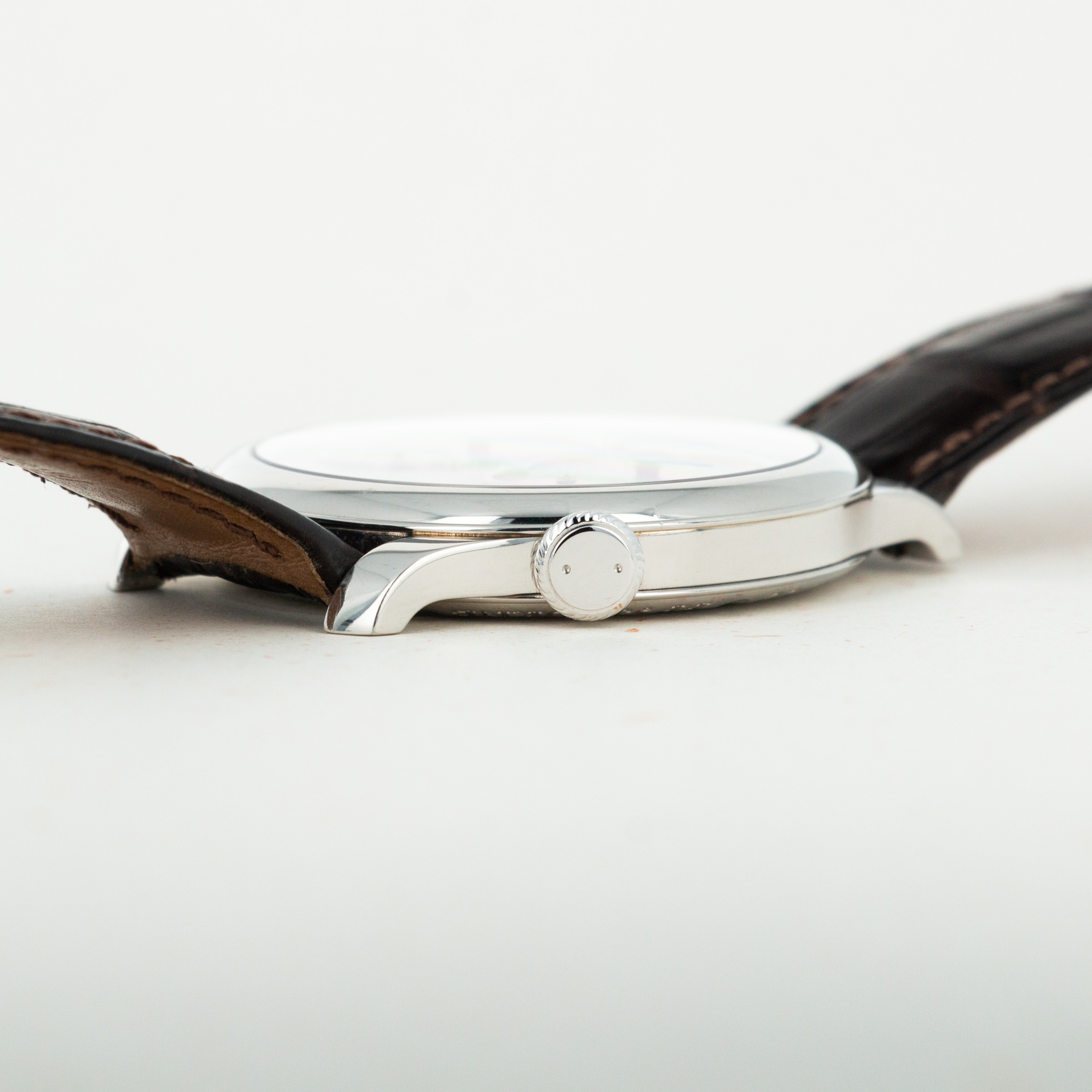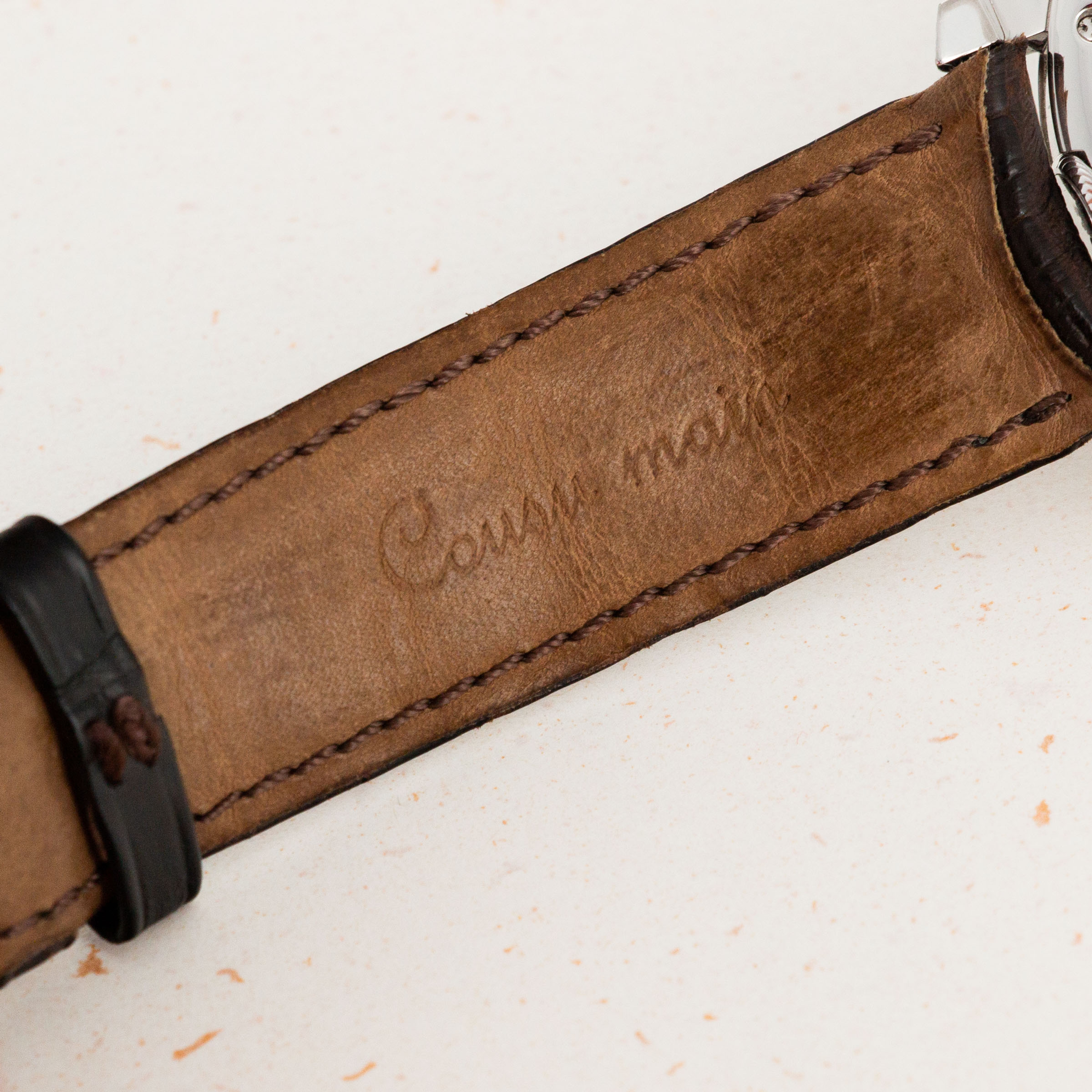 Watch is in very good to excellent original condition. Ruthenium dial has no imperfections. Case has minor surface scratches consistent with average wear. Most of of the scratches are along the bezel of the watch. Original strap has moderate signs of wear along the lining. It comes with both the platinum deployant buckle, as well as the original platinum tang buckle.