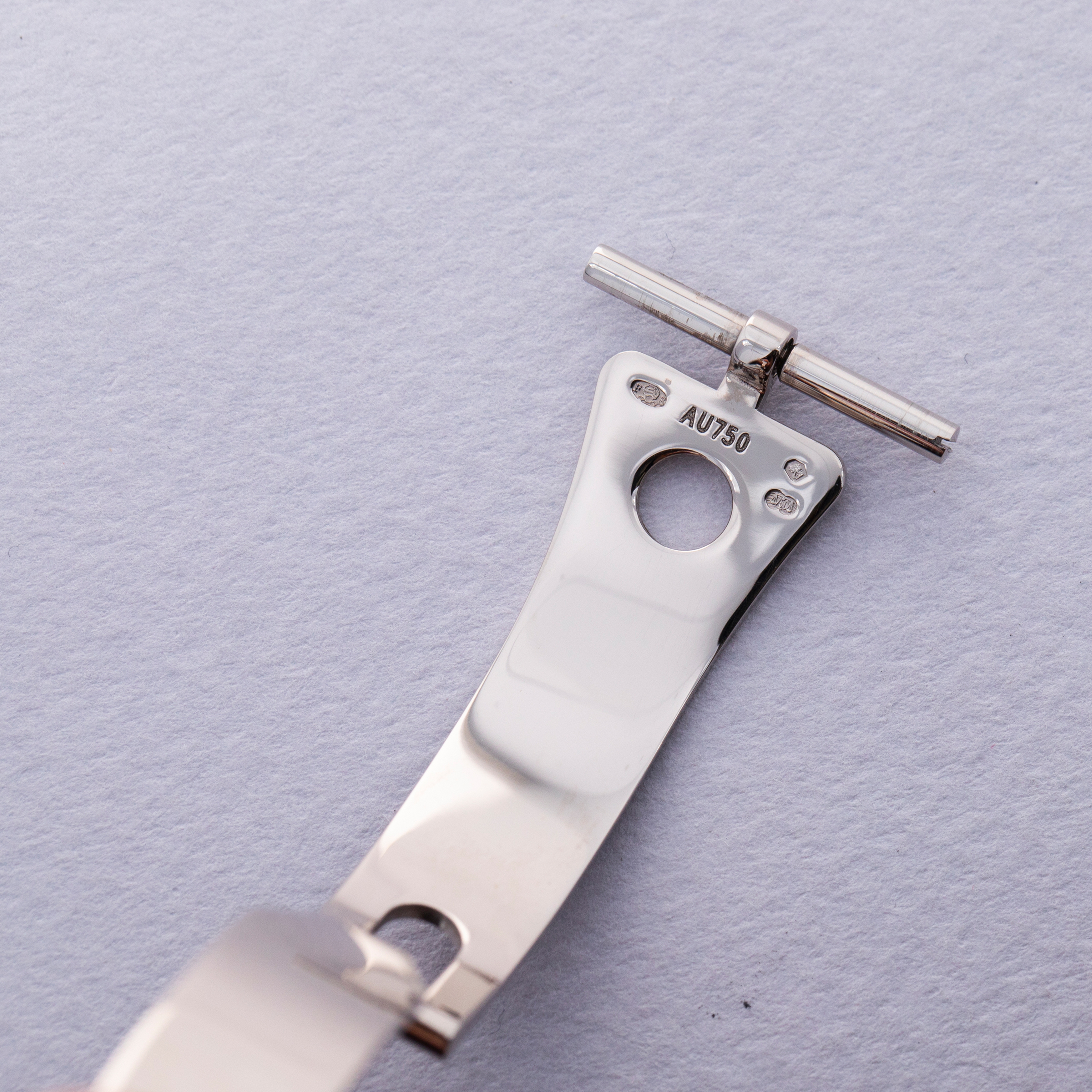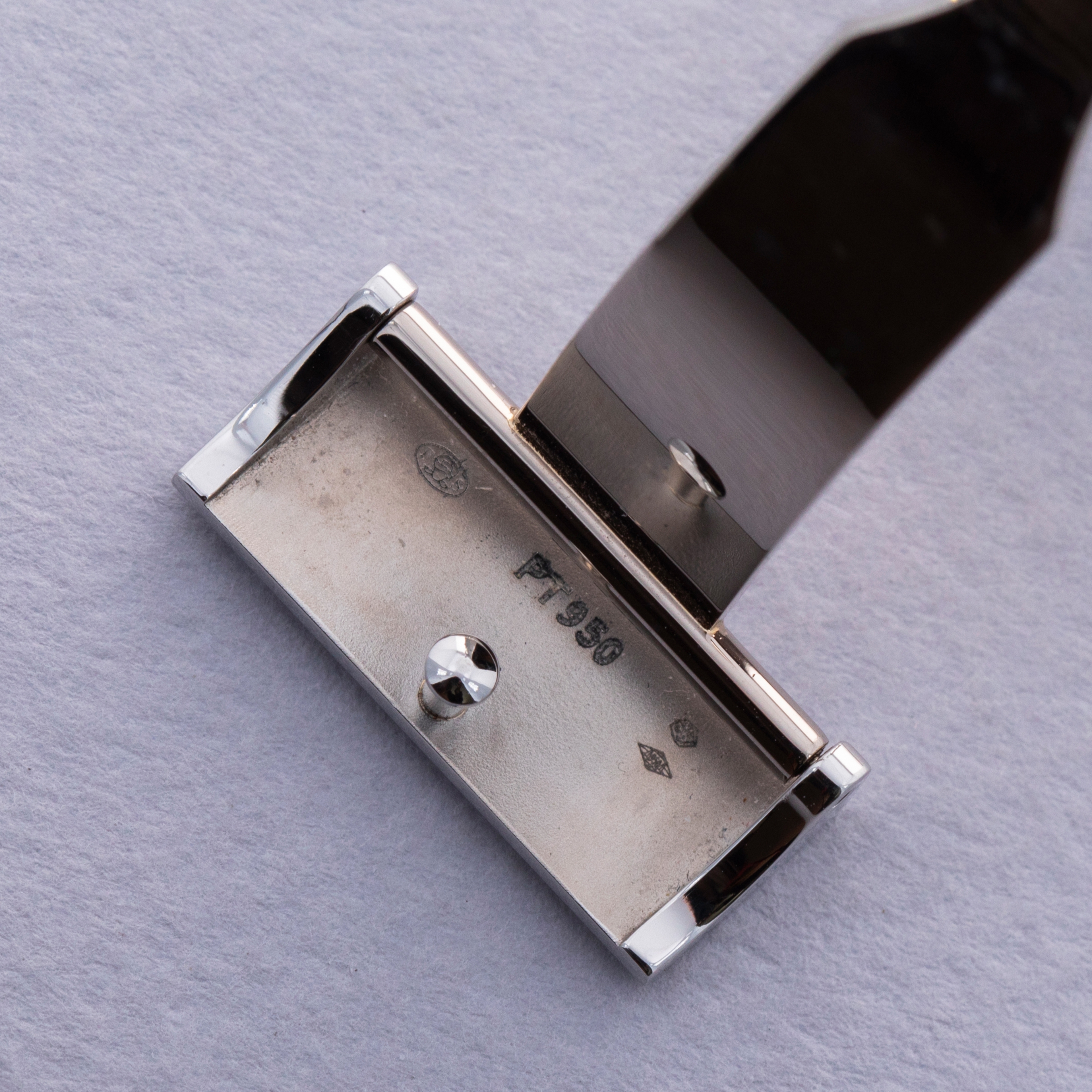 Buckle is in near-mint overall condition. Minor signs of wear, with some small surface scratches visible along the face of the buckle. Face is stamped PT 950, but the blades are made of WG and stamped AU 750.