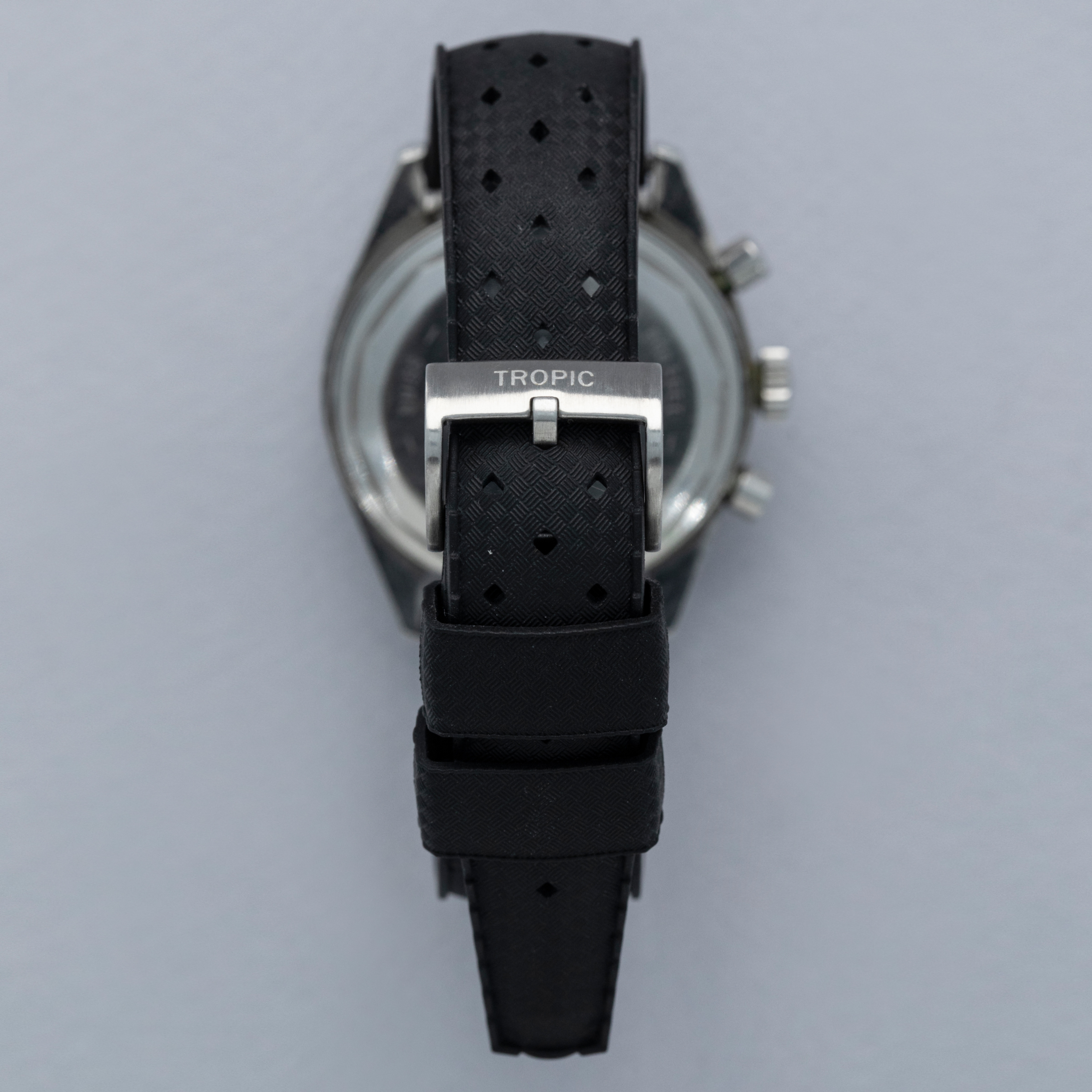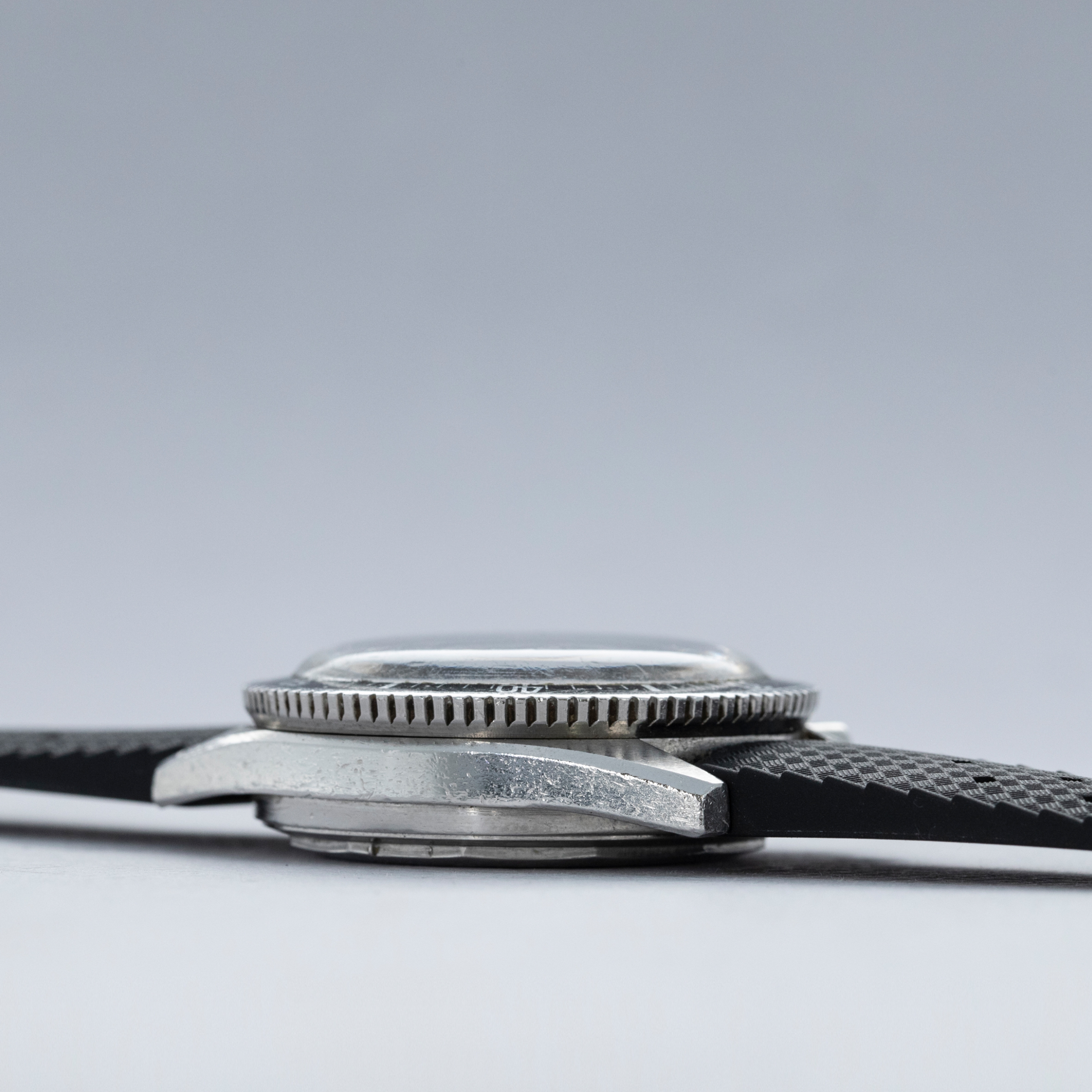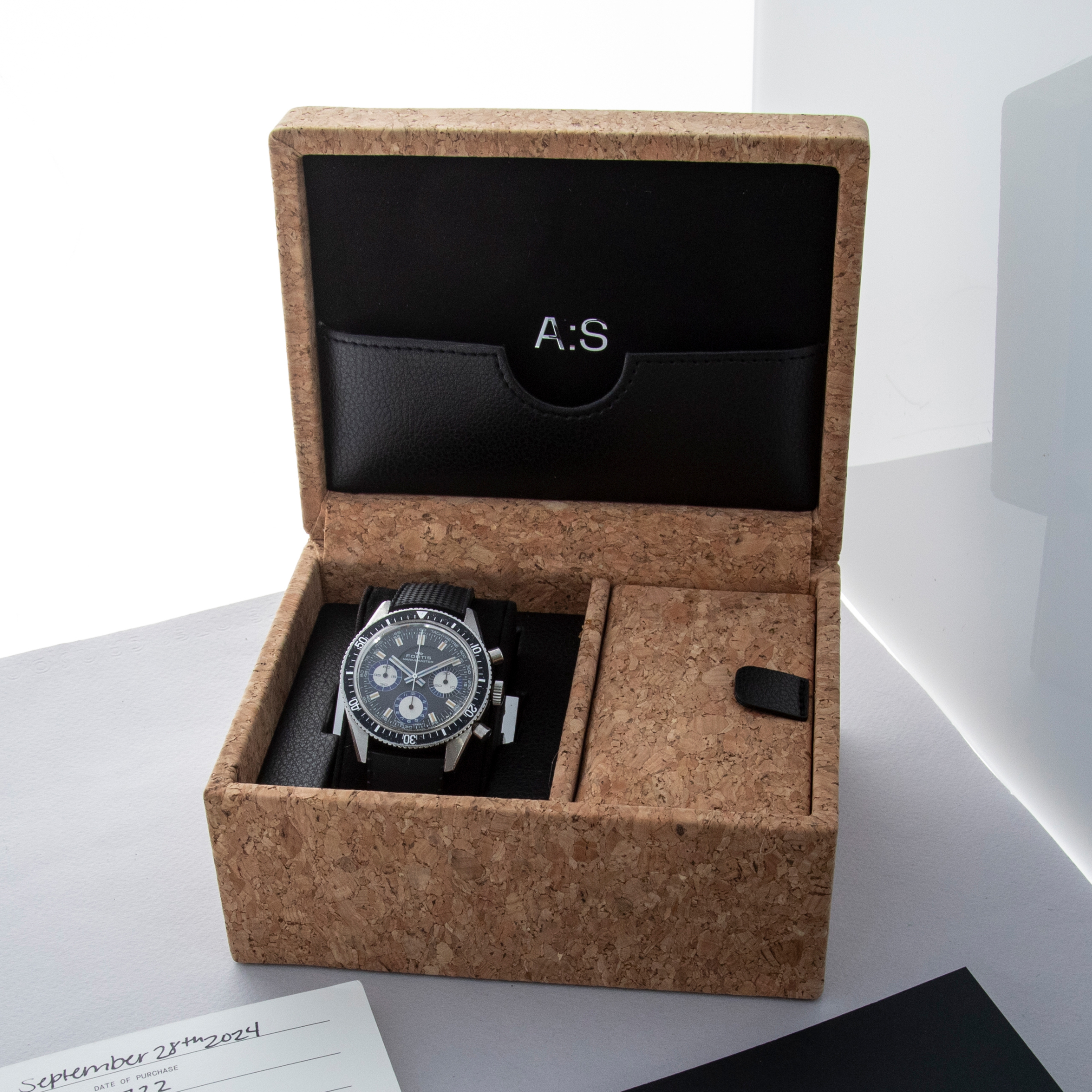Boasting an attractive grey dial, the ref. 8001's blue subdial chapter rings and hands combine with its aged tritium lume to create a wonderfully unique display that is full of color.