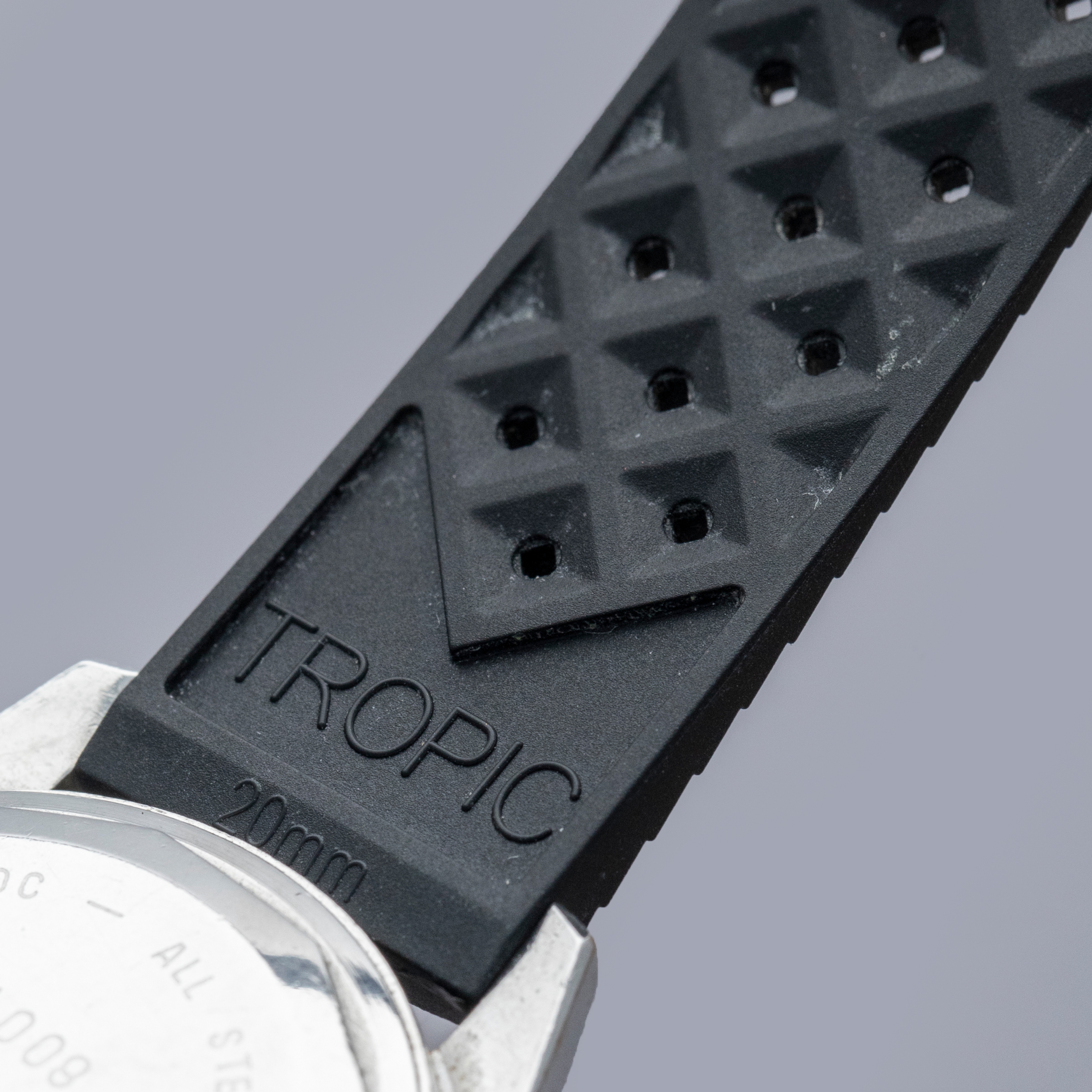 The watch is in very good condition, with scratches and nicks visible on the case and case back. The stainless steel bezel remains well-defined, while the insert shows scratches and marks. The black dial is in excellent condition, featuring crisp text and vibrant blue sub dial rings. Little to no aging or damage visible on the dial surface. The lume plots at the hours have aged to a medium tone, while the lume in the hands is a shade lighter. The watch is fitted with a modern Tropic rubber strap and a stainless steel buckle. It comes in a generic dealer's box and includes a dealer purchase card.