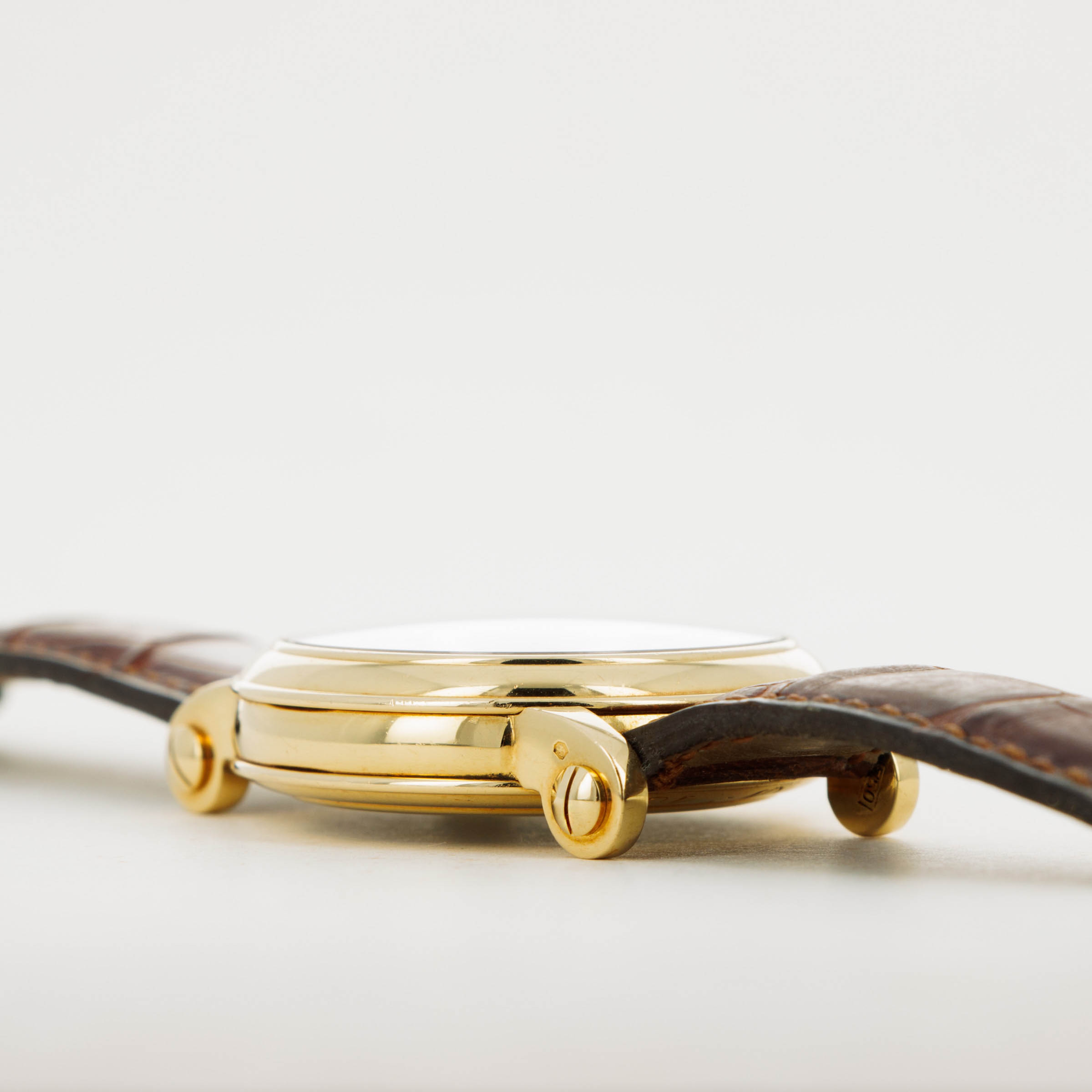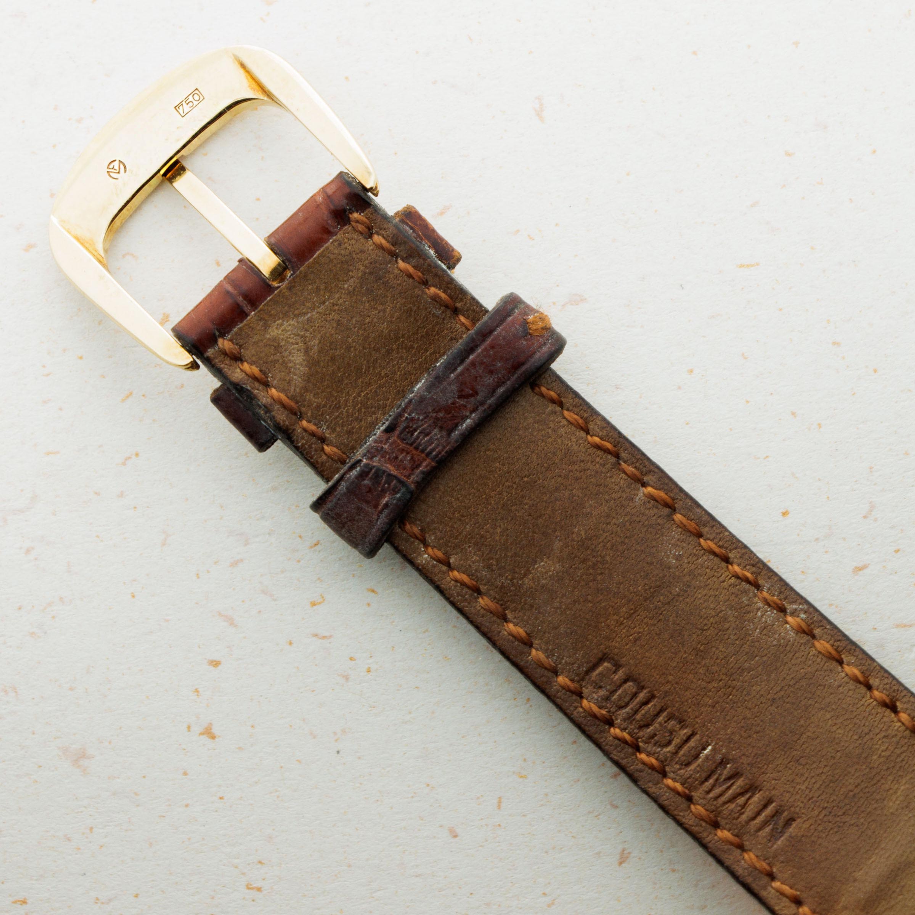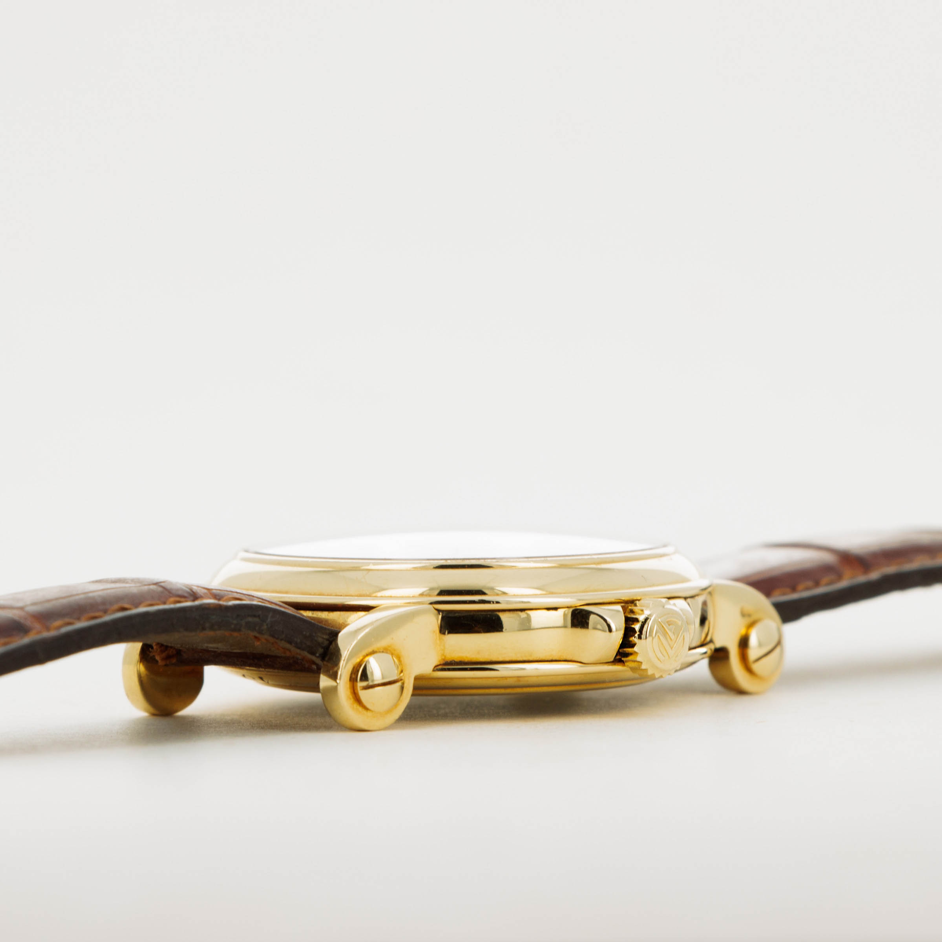Founded in 1992 by Franck Muller and Vartan Sirmakes and known as the "Master of Complications," Franck Muller, the brand, has grown to become synonymous with complex microengineering, original whacky designs, and incredible attention to detail. While tonneau-shaped cases and colorful dials dominate Franck Muller's modern aesthetic, their earlier watches were more traditional round timepieces that featured somewhat classic design motifs, much like this Franck Muller Master Banker 3802. Launched as a watch for the international businessman that is always on the move, the Master Banker collection seeks to provide useful complications that are all operable using just one crown, as can be seen on this ref. 3802, as its silver dial plays home to two independent timezone subdials, one at 12 and 6 o’clock on the dial. Along with these subdials, the ref. 3802 also boasts a date aperture at 3 o’clock, luminous Arabic numerals at 12, 6, and 9 and a regular hour, minutes and seconds trio of hands, with the seconds hand being made of blued steel, and the others made of 18kt yellow gold to match this beauty’s 18kt yellow gold construction. Measuring 37.5mm and featuring a delectable stepped bezel and screw-bar lugs, the ref. 3802 is a stylish timepiece that is just as functional as it is good-looking.