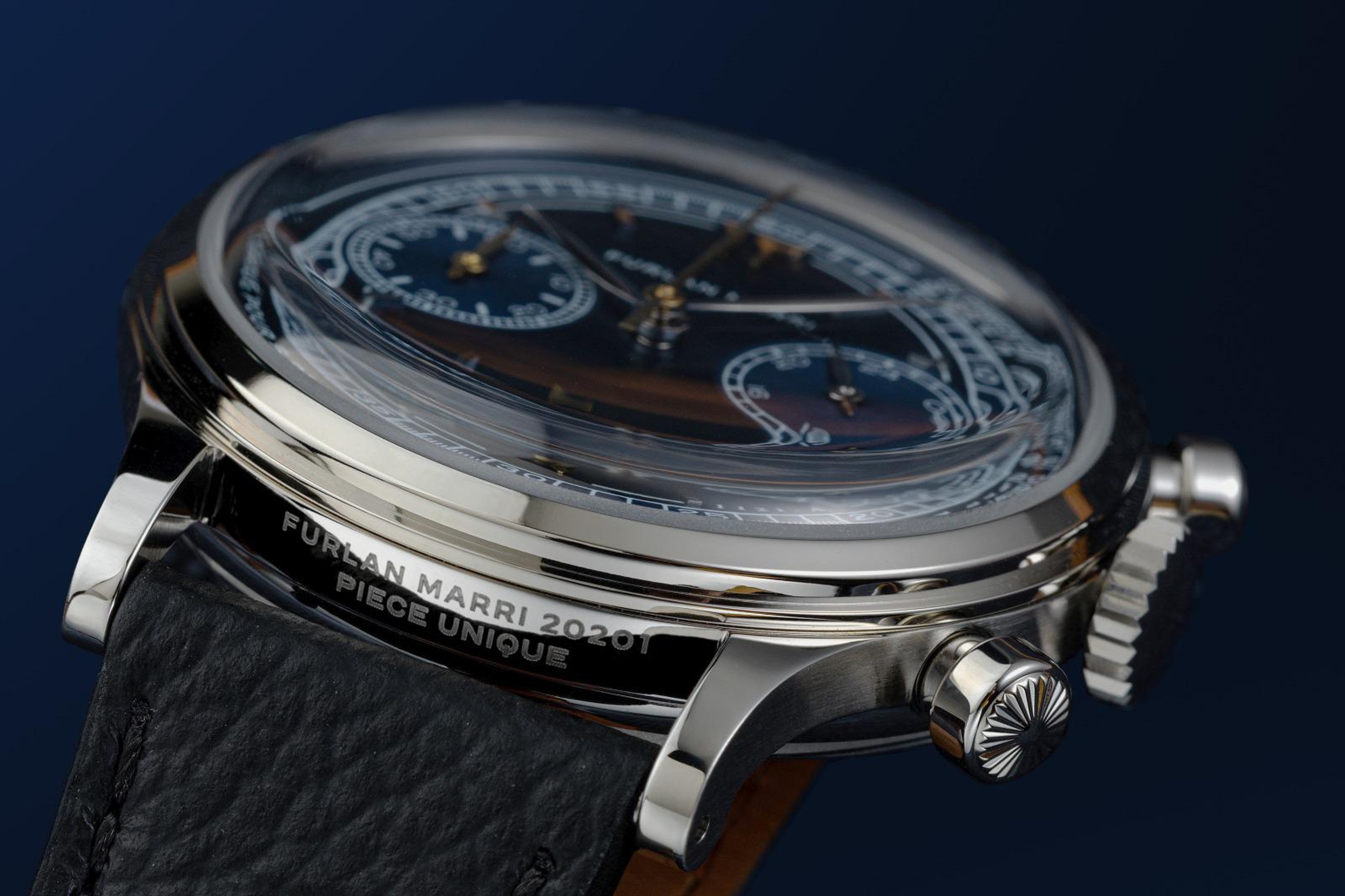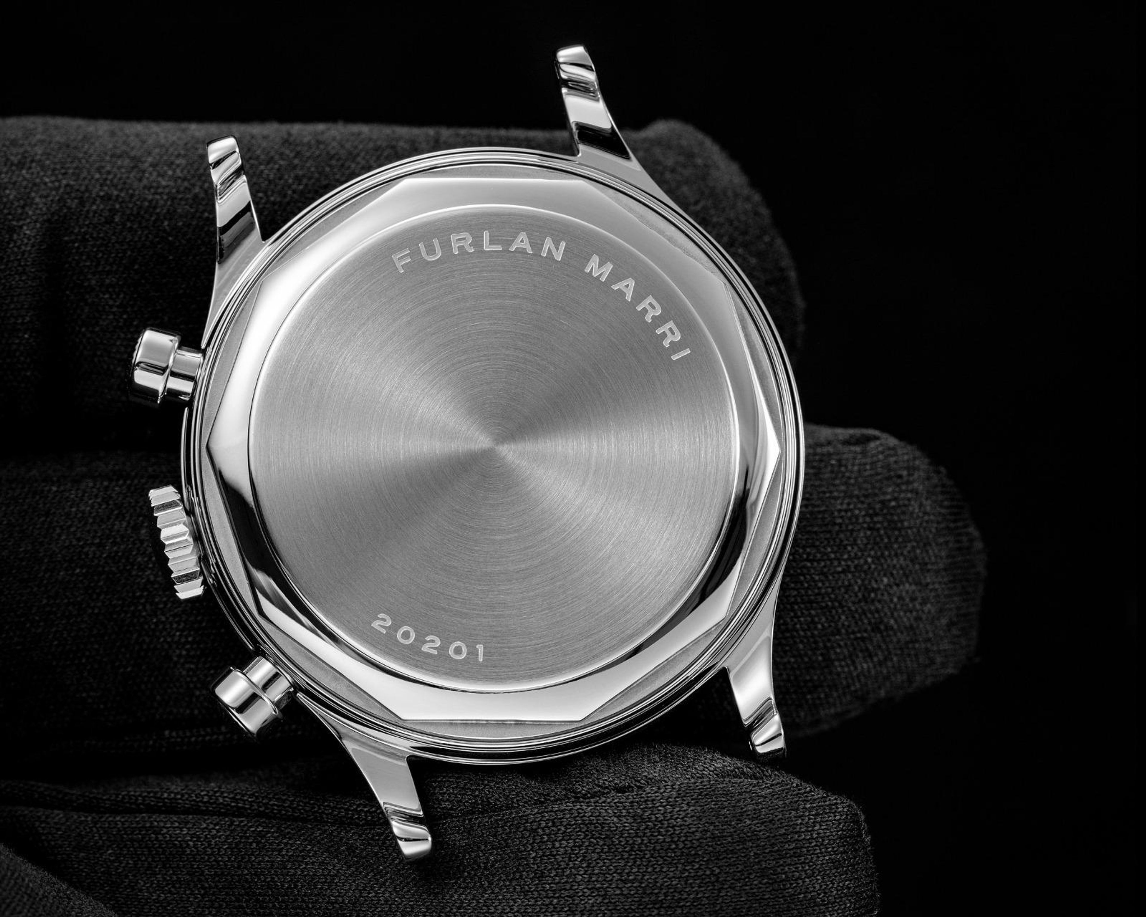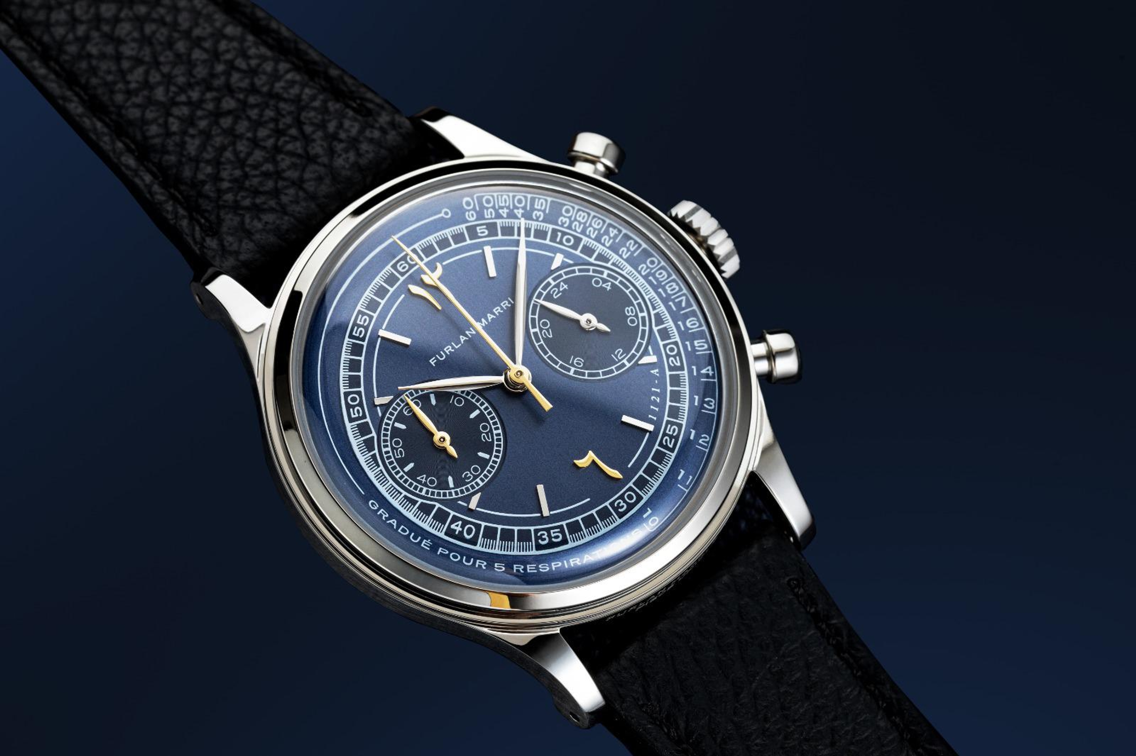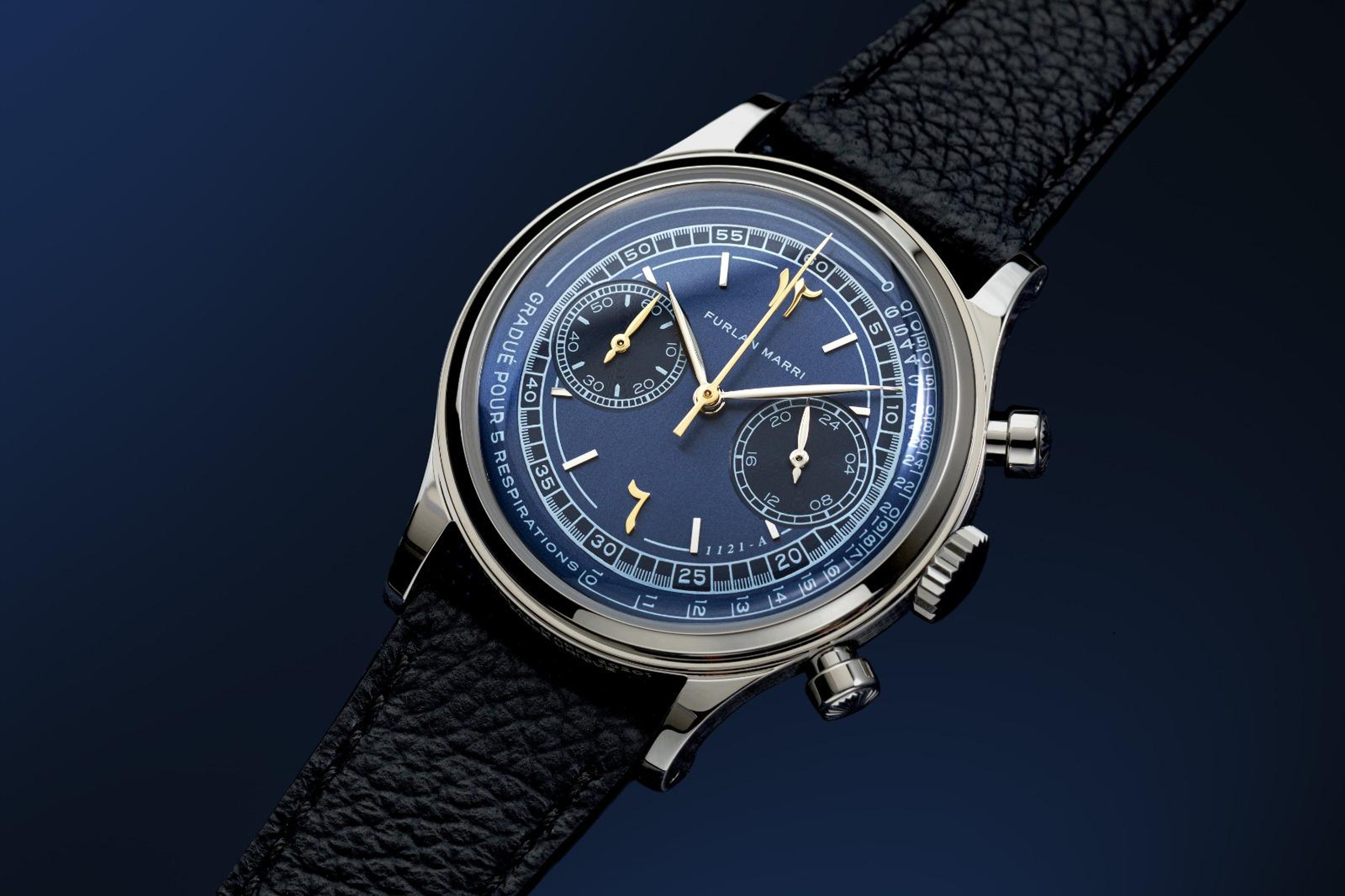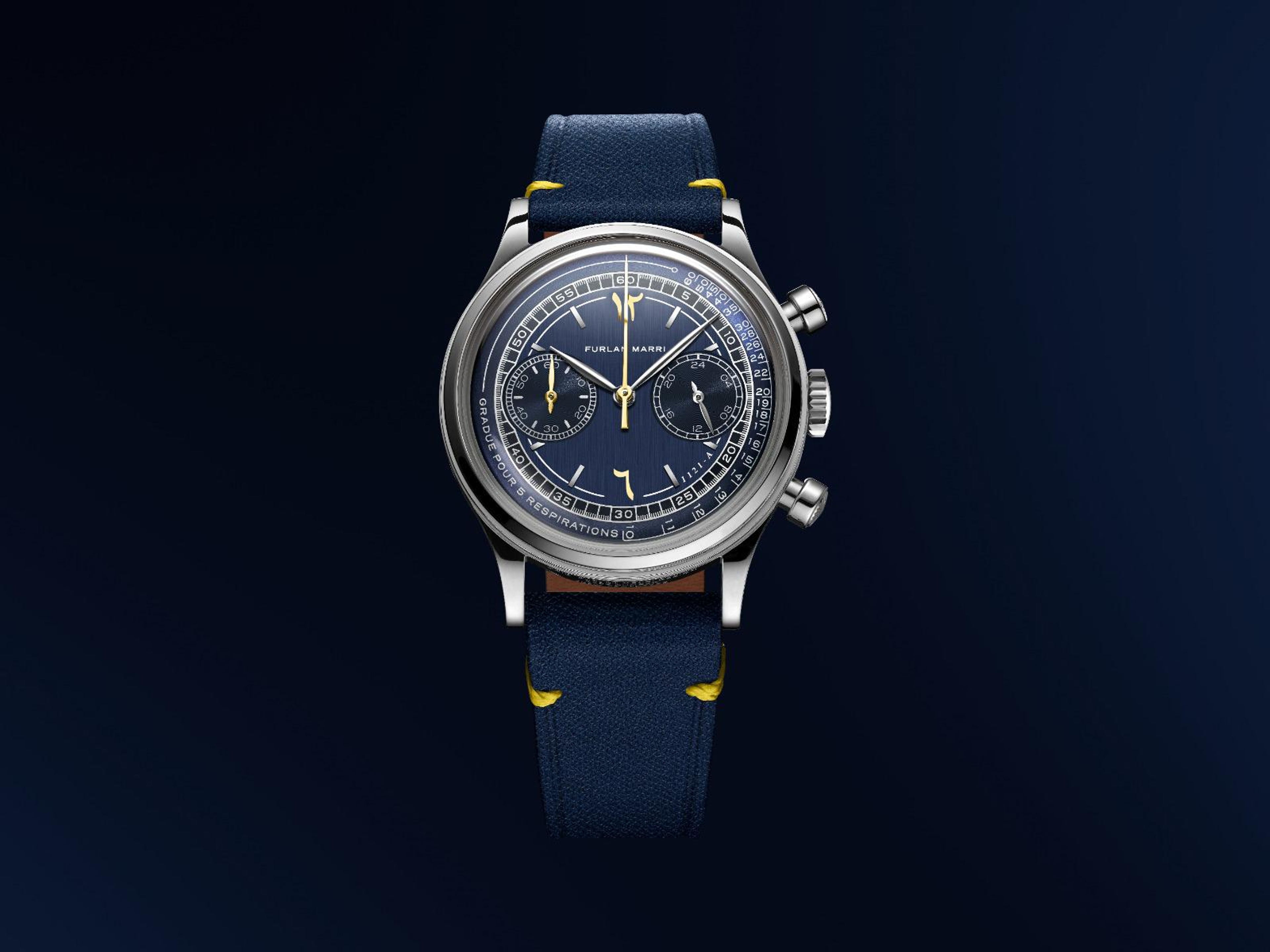 The Furlan Marri chronograph is a 1940s inspired watch. Launched in 2020 during the COVID-19 pandemic. In 2021, the brand received the Horological Revelation Prize from the GPHG (Grand Prix de l'Horlogerie de Genève). The model proposed is a unique piece in a 38mm step case in steel and double domed sapphire crystal. This watch was part of the first ever collection of the brand, the " Mecaquartz " Story. It features many details such as engraved pushers, decagonal case back, curved and domed hands. The dial is particularly appealing with a vertical brushed and circular brushed finish as well as the applied Hindu Arabic polished indexes and an asthmometer scale. It comes with two straps, a black Italian leather strap and a unique custom strap manufactured in Geneva, with yellow stitching and blue leather.