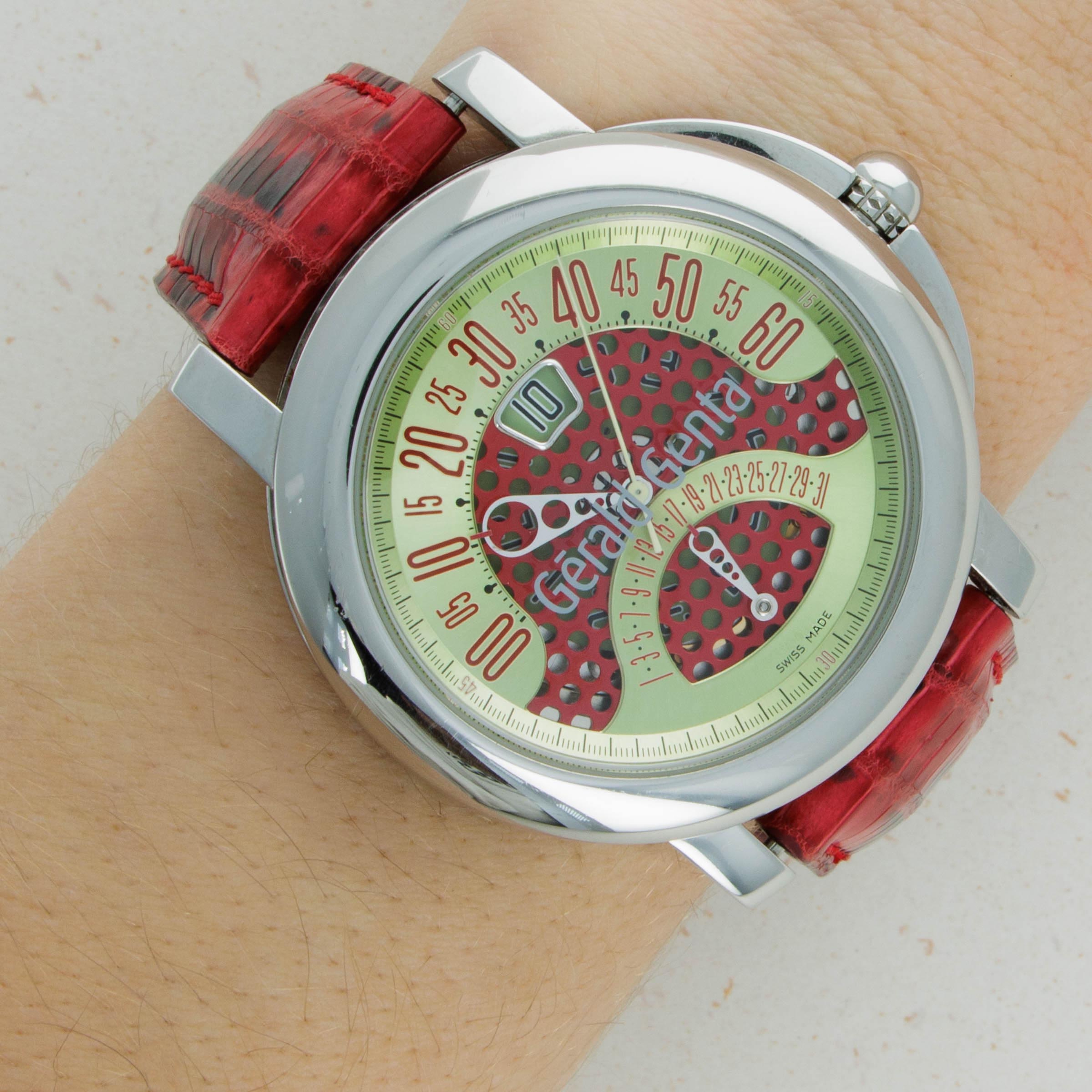 Unapologetically "Genta" in its design, the Arena Bi-Retro large circular stainless steel constuction and colorful retrograde display leave no uncertainty as to the designer of this incredibly unique timepiece.