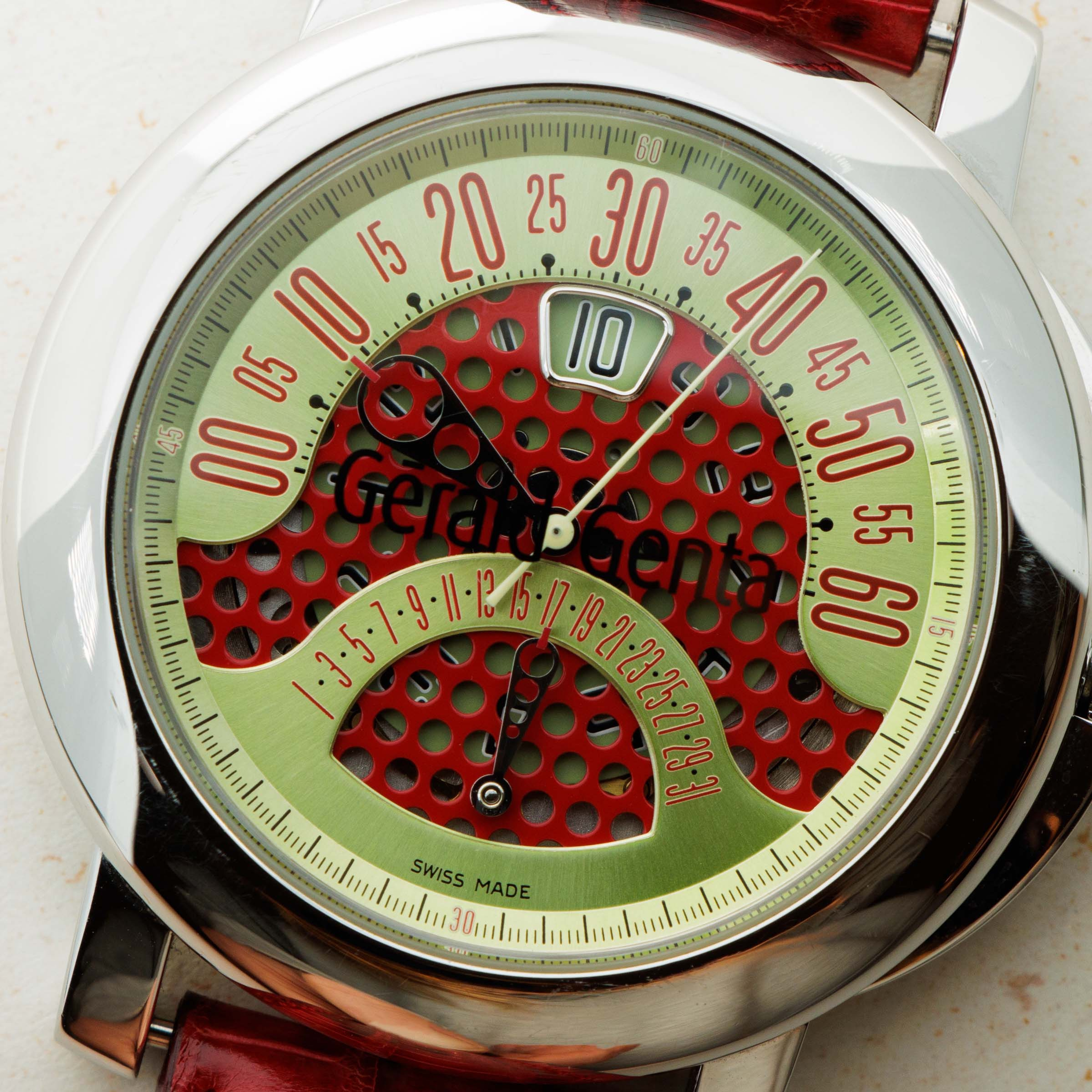 Featuring a perforated red base plate, the Arena Bi-Retro provides a semi-skeletonized view of its movement beneath, with the jump hour's discs on view. Furthermore, the Retro Sport's green chapter ring provides a colorful contrast to this already unique dial.
