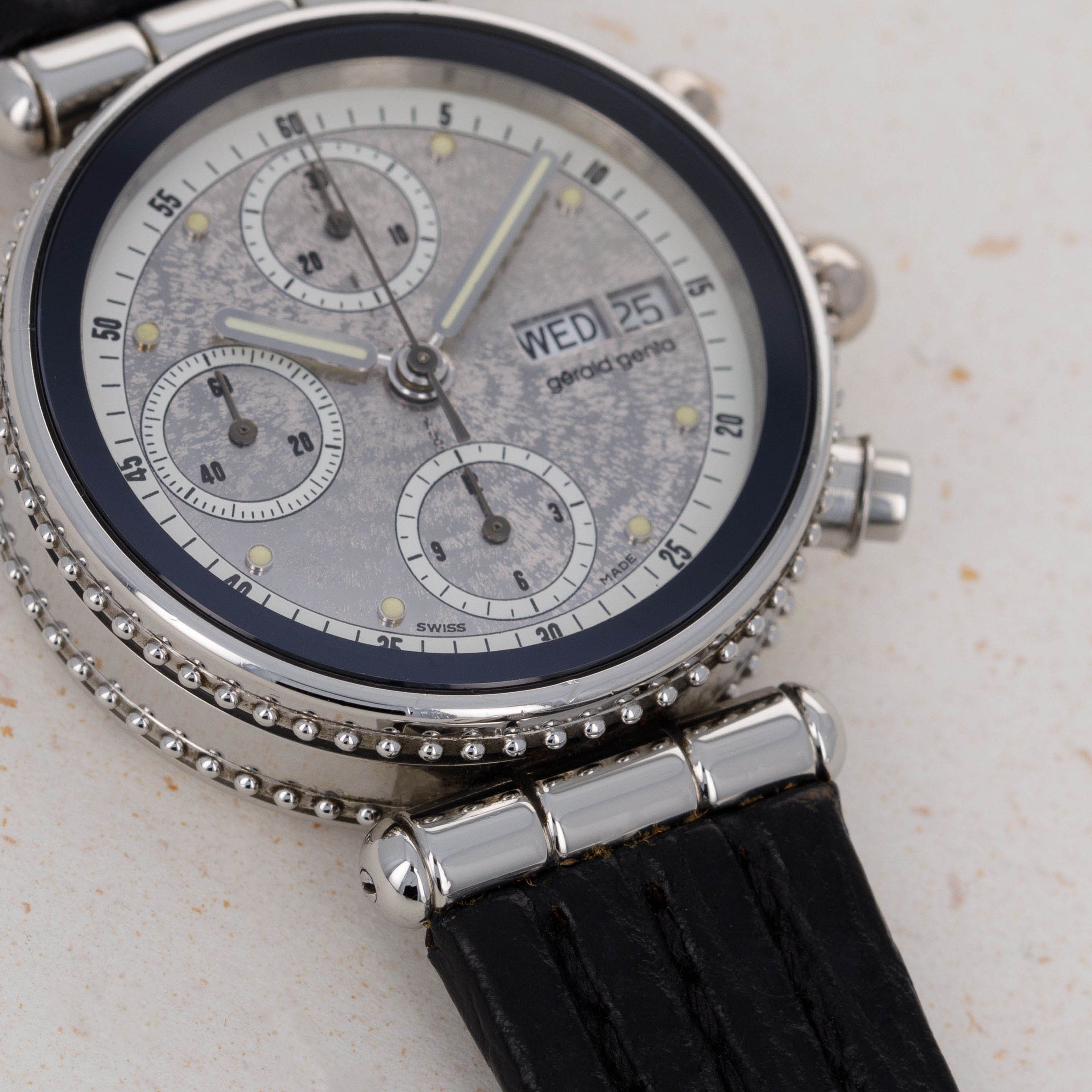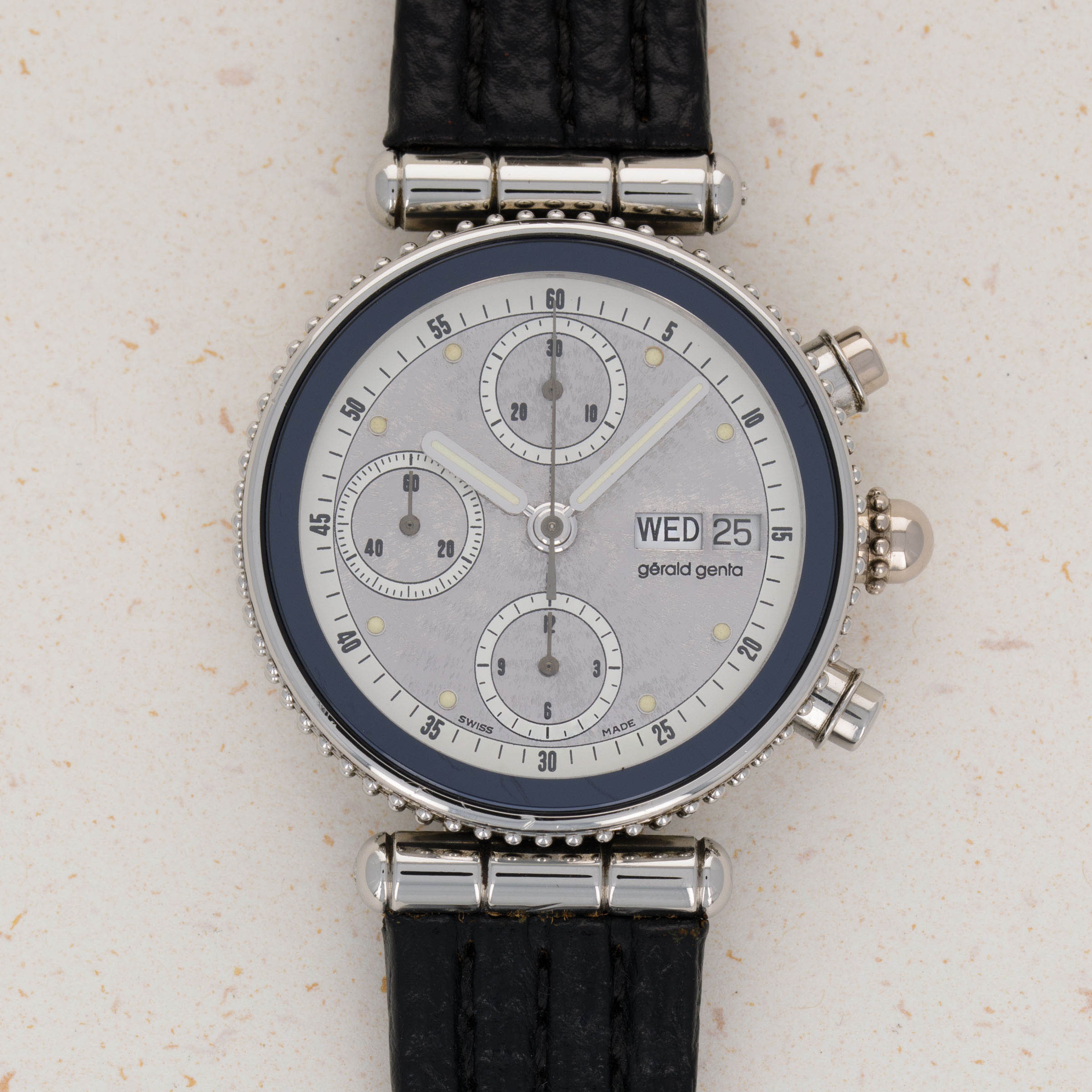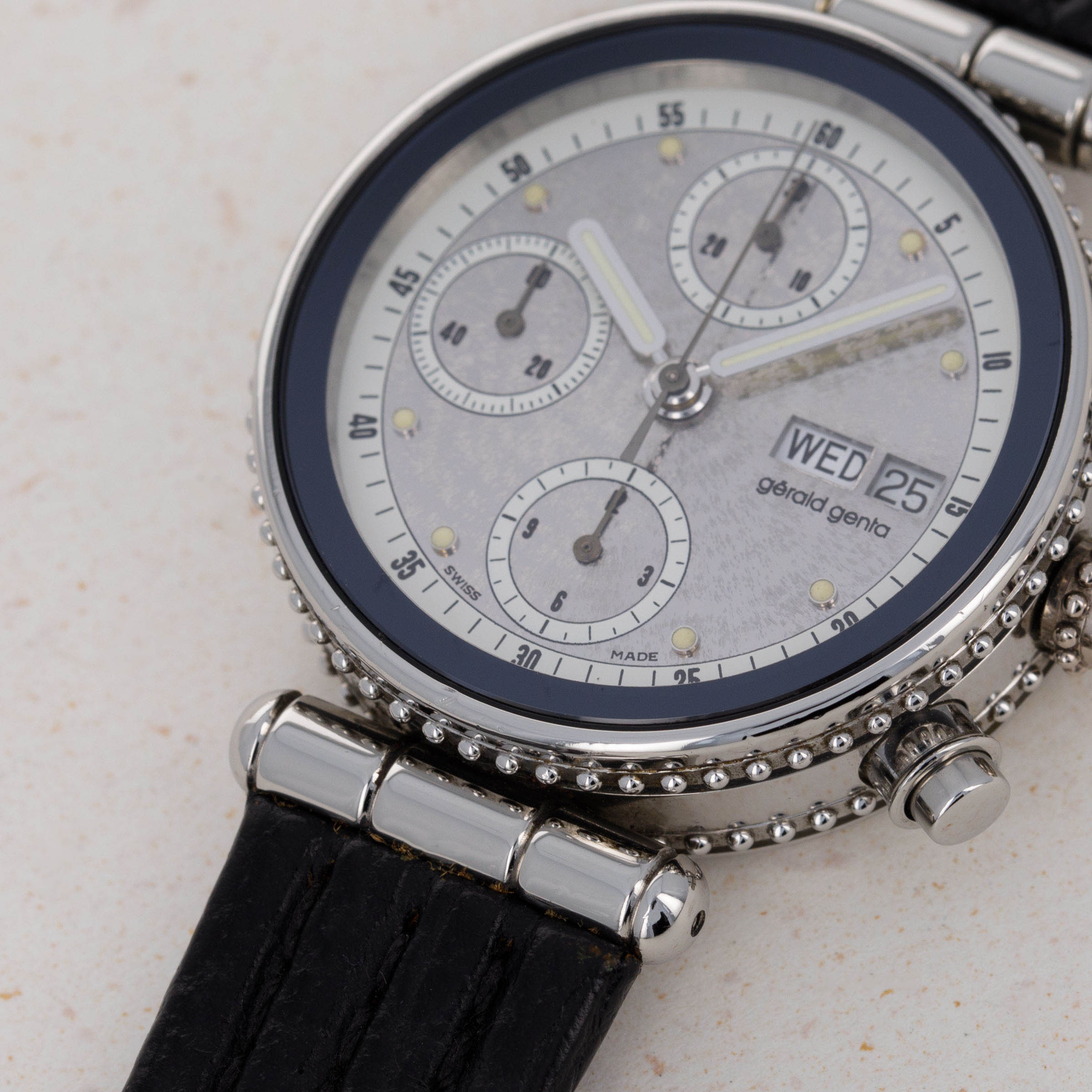 Launched in 1969, Gerald Genta, the brand, was founded by the famed eponymous watch designer best known for creating the Patek Philippe Nautilus and Audemars Piguet Royal Oak amongst countless other designs. While both of those watches were launched in the 1970s, his brand was immediately successful on account of his already growing renown in the industry. With a growing clientele of royalty such as the Moroccan King, the Sultans of both, Oman and Brunei, the King of Spain, the King of Saudi Arabia, the Queen Mother of England and several leading businessmen, sportsmen and entertainers, Gerald Genta's own timepieces quickly became sought-after pieces of horological royalty. Amongst those pieces of horological royalty was the Genta Gefica Chronograph Day-Date that we have here. An unusual-looking stainless timepiece that features a slew of complications on its beautiful silver dial, it boasts day and date apertures at 3 o’clock along with a conventional chronograph display via three subdials at 12, 6 and 9 o’clock. Featuring a black bezel and a beaded midcase with two rows of beads encircling the watch, the Gefica Chronograph Day-Date celebrates the fact that it is a watch like none other, just like how its designer is a watch designer like none other.