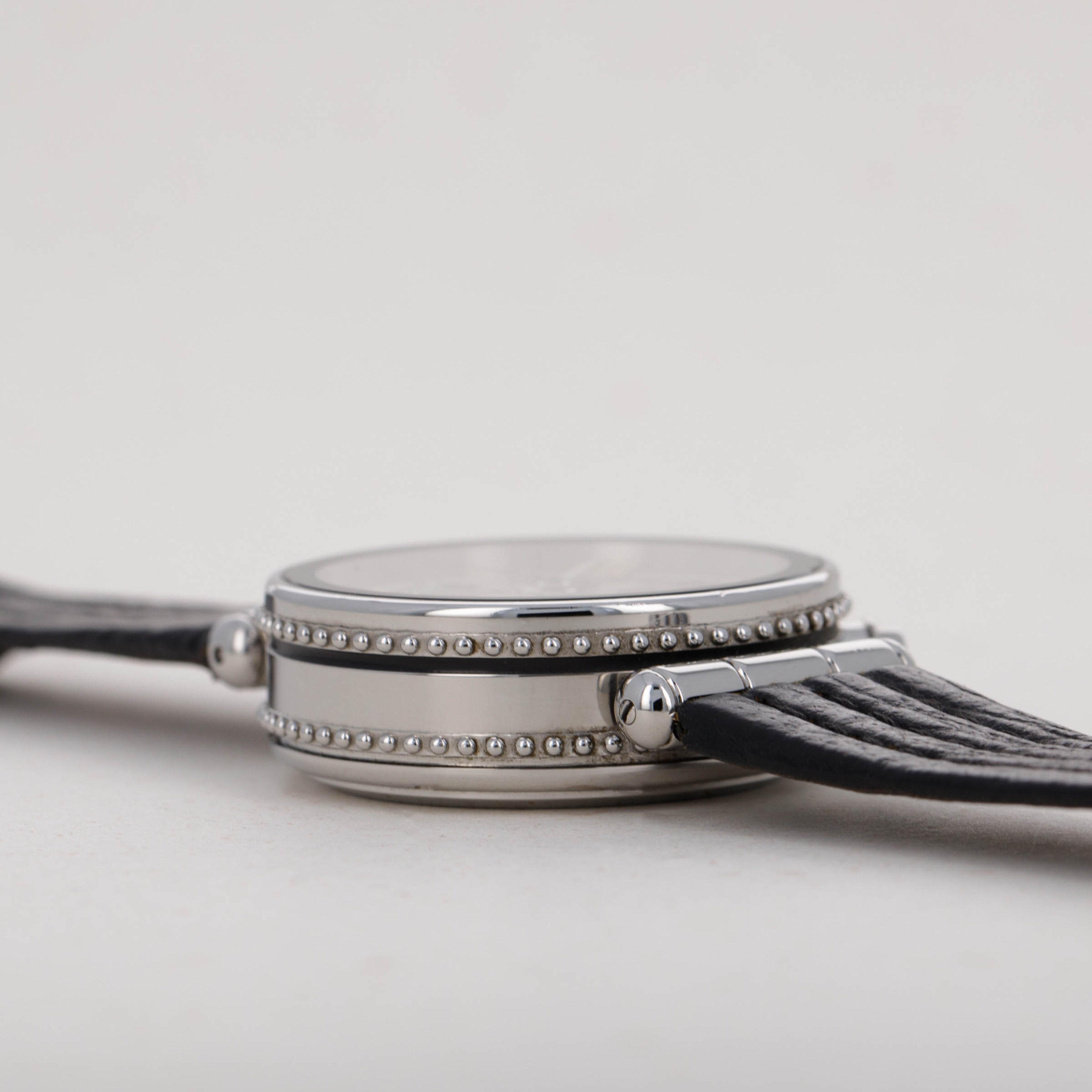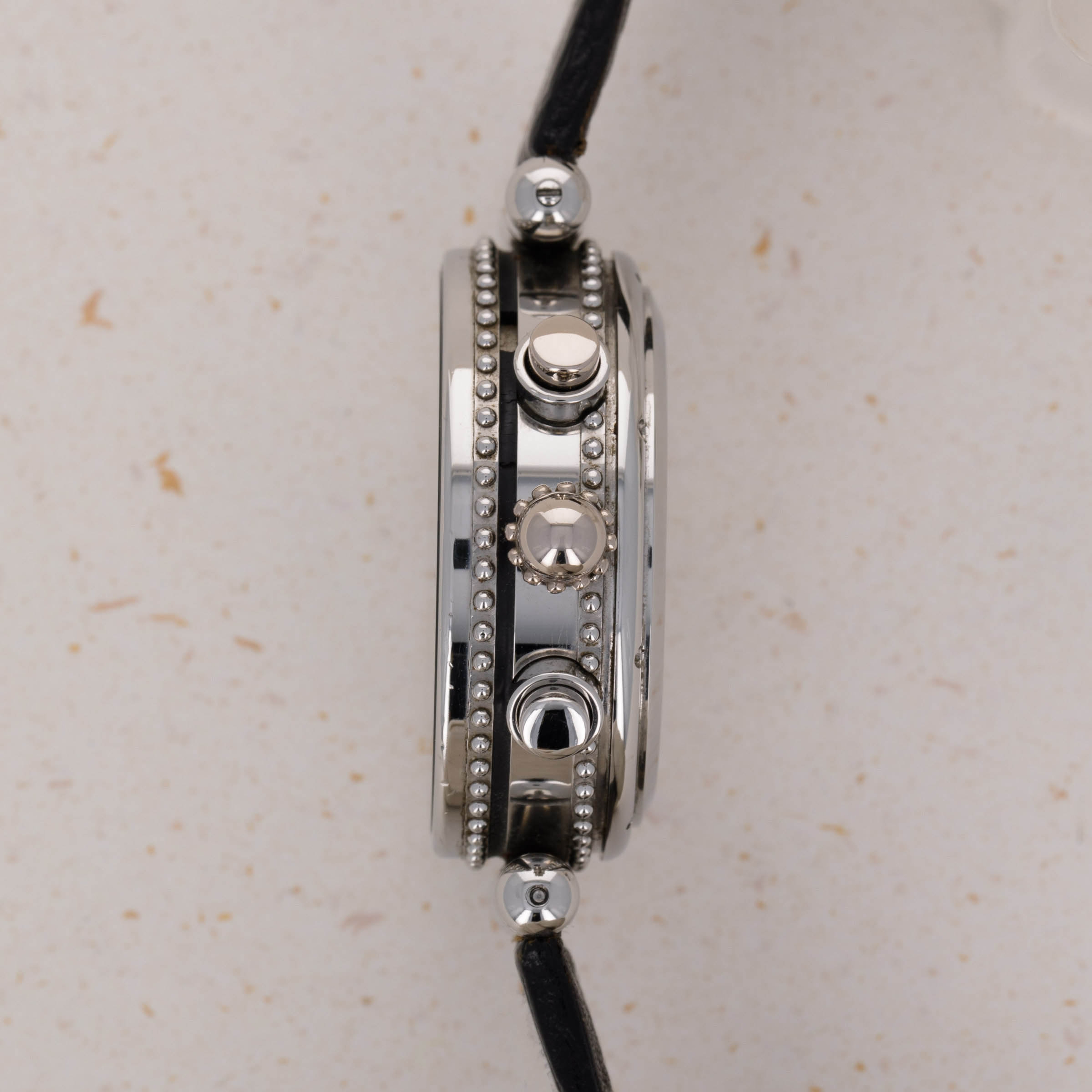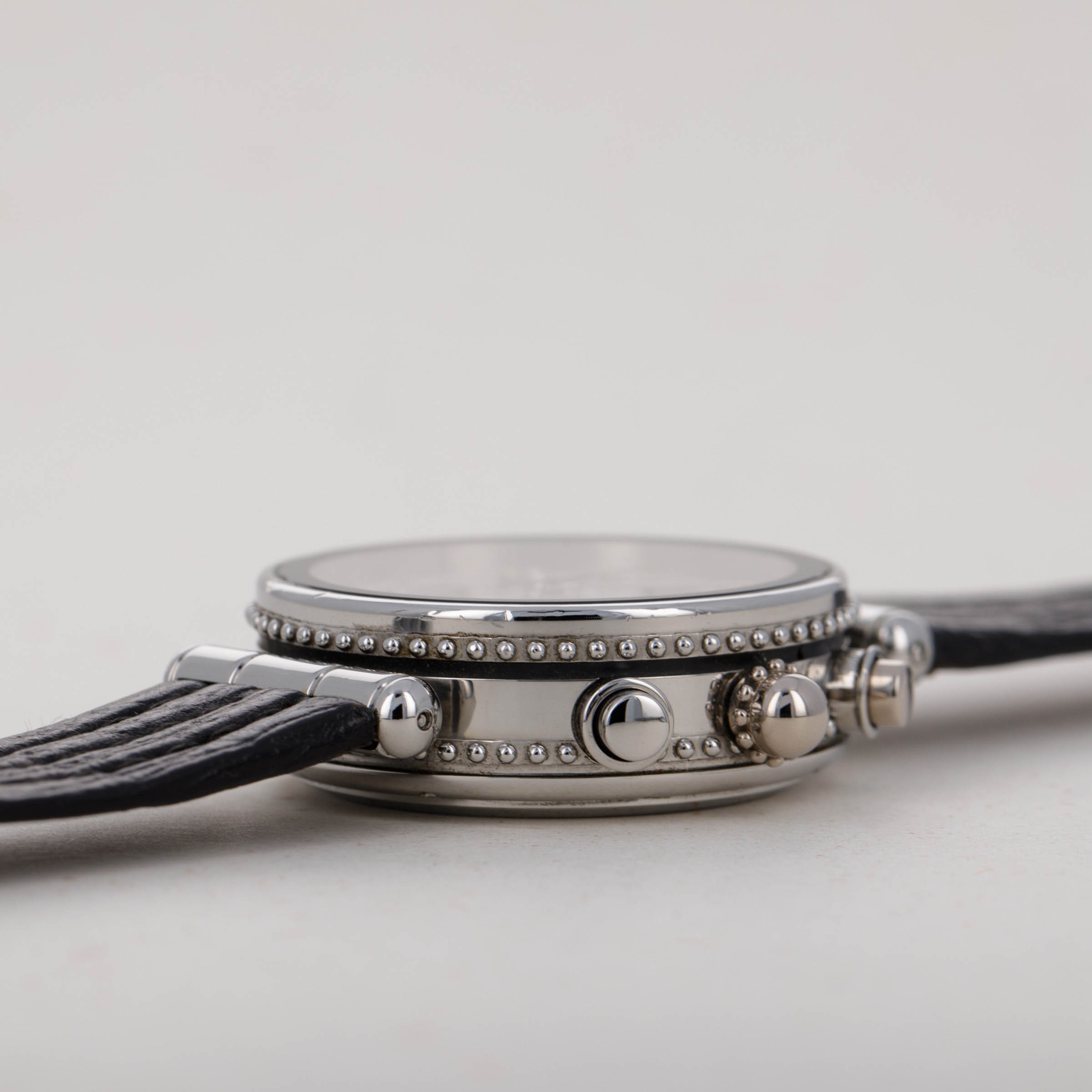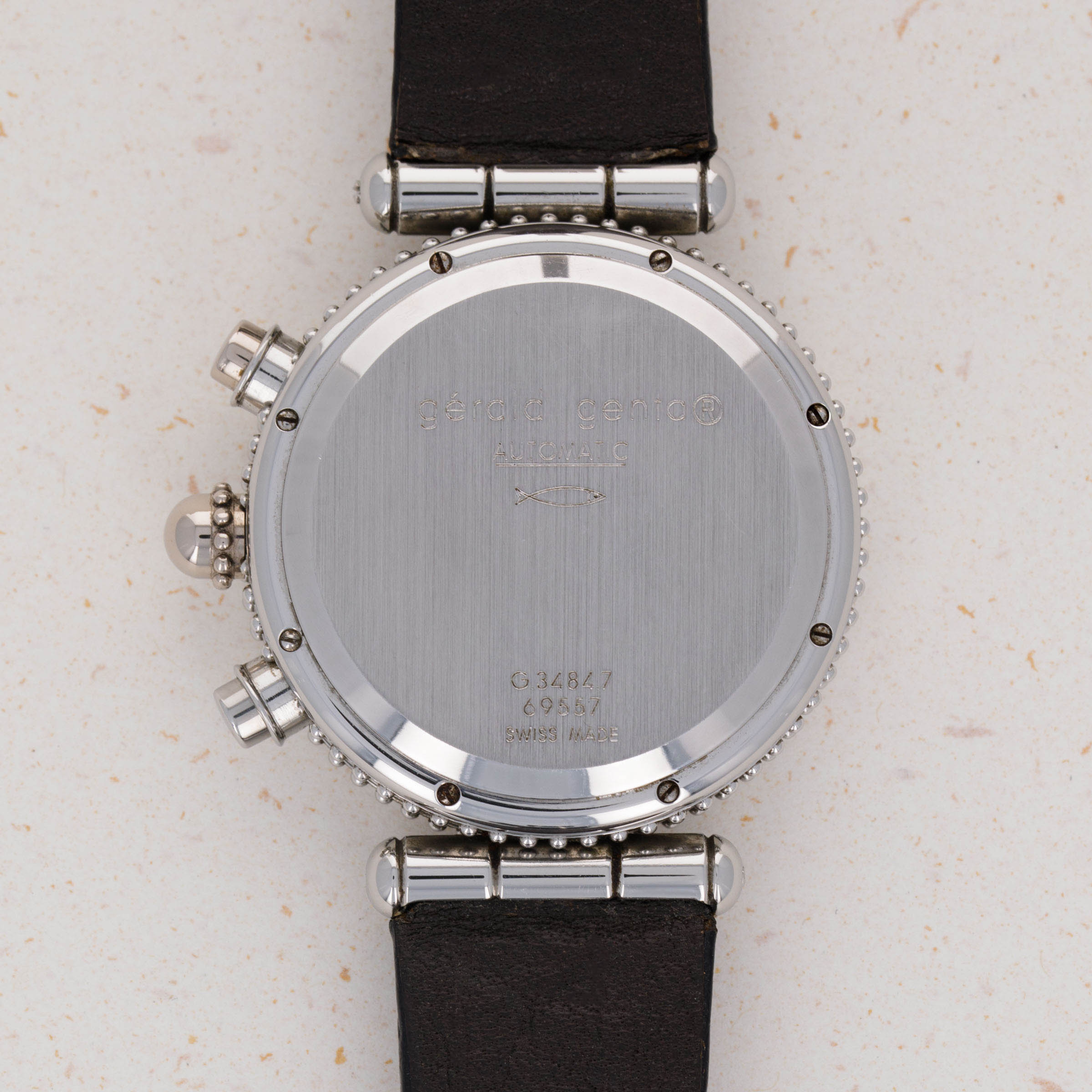 Launched in 1969, Gerald Genta, the brand, was founded by the famed eponymous watch designer best known for creating the Patek Philippe Nautilus and Audemars Piguet Royal Oak amongst countless other designs. While both of those watches were launched in the 1970s, his brand was immediately successful on account of his already growing renown in the industry. With a growing clientele of royalty such as the Moroccan King, the Sultans of both, Oman and Brunei, the King of Spain, the King of Saudi Arabia, the Queen Mother of England and several leading businessmen, sportsmen and entertainers, Gerald Genta's own timepieces quickly became sought-after pieces of horological royalty. Amongst those pieces of horological royalty was the Genta Gefica Chronograph Day-Date that we have here. An unusual-looking stainless timepiece that features a slew of complications on its beautiful silver dial, it boasts day and date apertures at 3 o’clock along with a conventional chronograph display via three subdials at 12, 6 and 9 o’clock. Featuring a black bezel and a beaded midcase with two rows of beads encircling the watch, the Gefica Chronograph Day-Date celebrates the fact that it is a watch like none other, just like how its designer is a watch designer like none other.