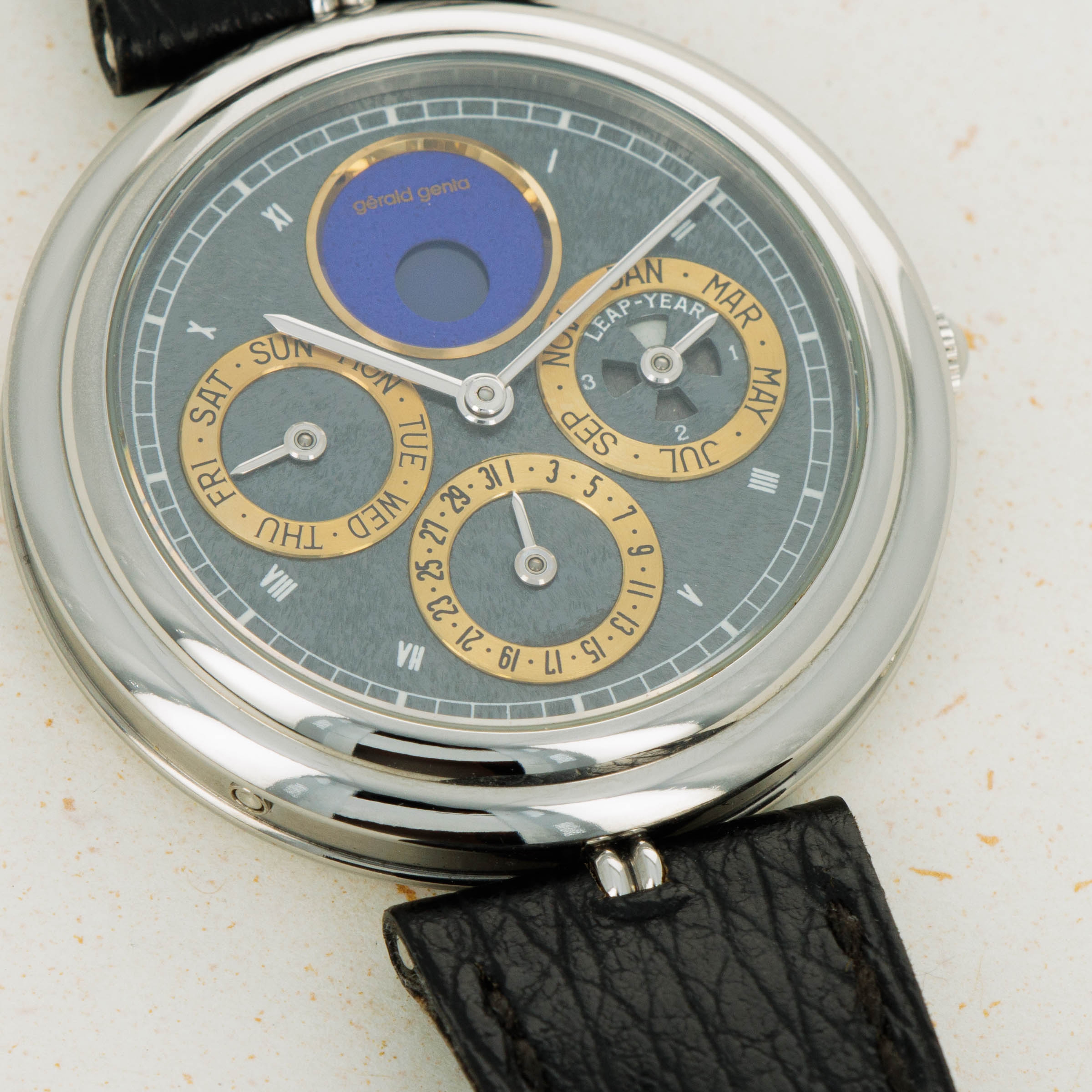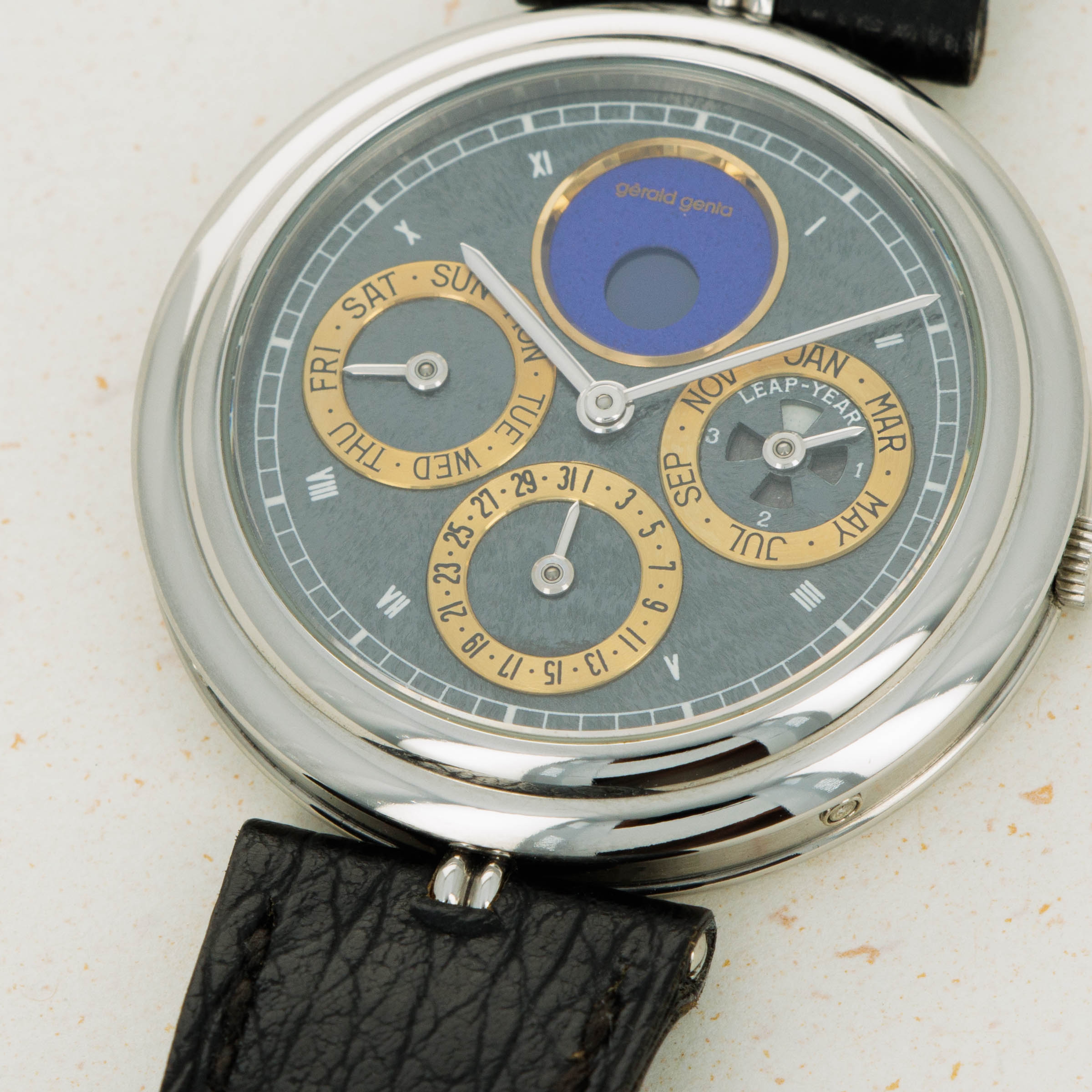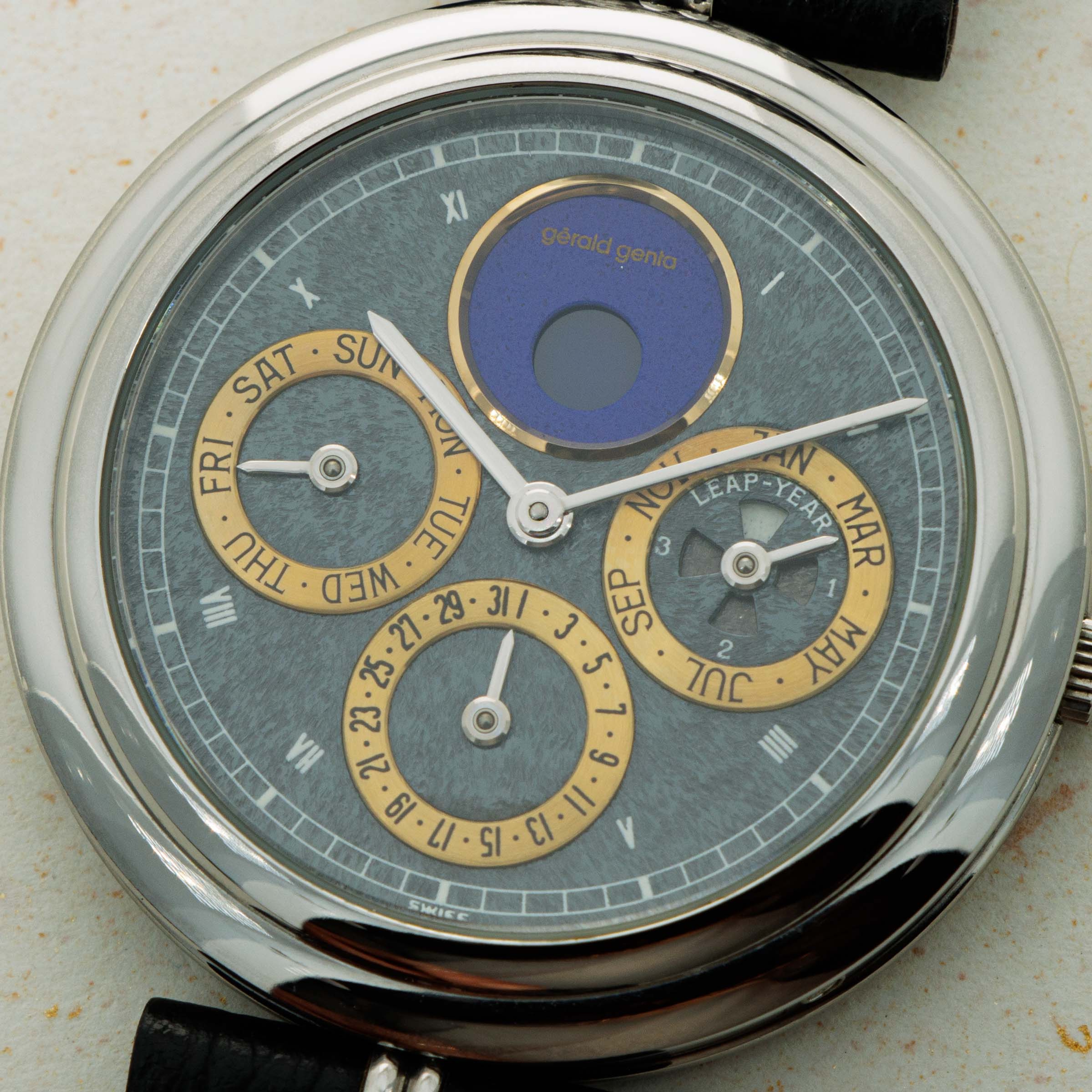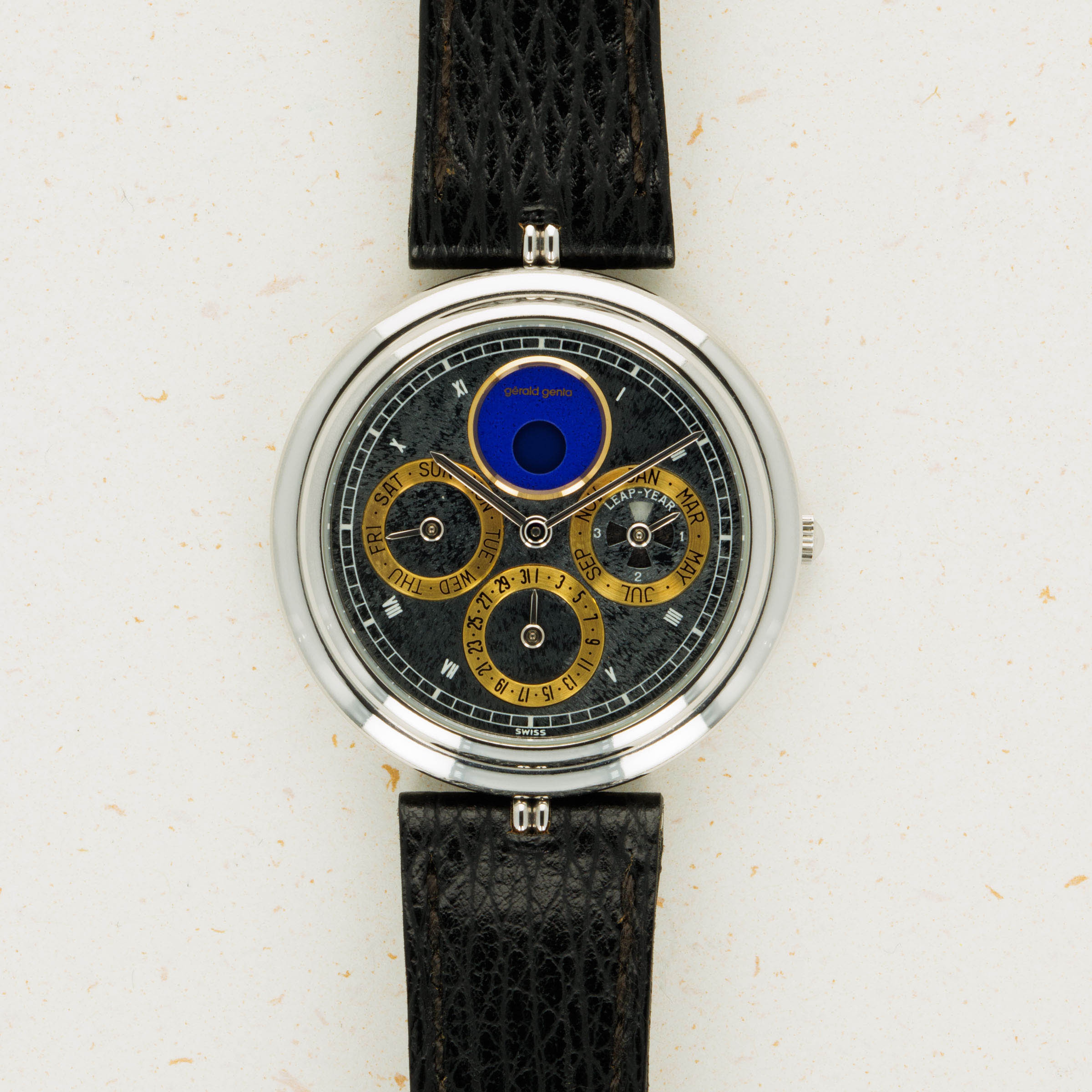 Launched in 1969, Gerald Genta, the brand, was founded by the famed eponymous watch designer best known for creating the Patek Philippe Nautilus and Audemars Piguet Royal Oak amongst countless other designs. While both of those watches were launched in the 1970s, his brand was immediately successful on account of his already growing renown in the industry. With a growing clientele of royalty such as the Moroccan King, the Sultans of both, Oman and Brunei, the King of Spain, the King of Saudi Arabia, the Queen Mother of England and several leading businessmen, sportsmen and entertainers, Gerald Genta's own timepieces quickly became sought-after pieces of horological royalty. Amongst those pieces of horological royalty was this, Genta’s perpetual calendar that was introduced in the mid 1990s. Not one to skimp on the finer details, this Perpetual Calendar is a beautifully constructed timepiece that showcases a wealth of luxury across the range of materials that were used to make it. As such, it features a stainless steel case that boasts a perfectly circular construction with a stepped bezel and central lug design and a dark blue meteorite effect dial that boasts golden chapter rings for the subdials and a bright blue lapis lazuli moonphase indicator at 12 o’clock that serves as a subtle pop of color to this stunning timepiece.