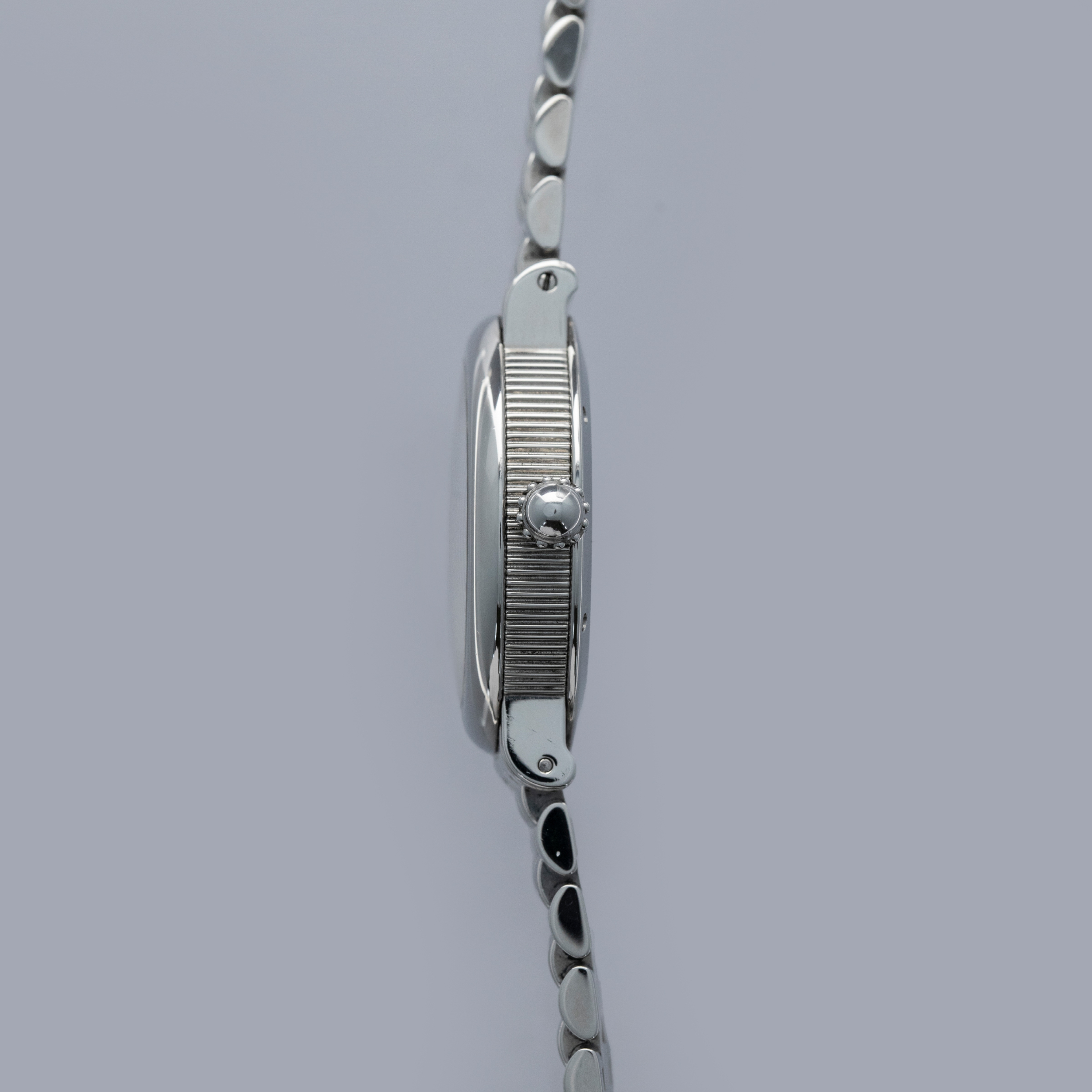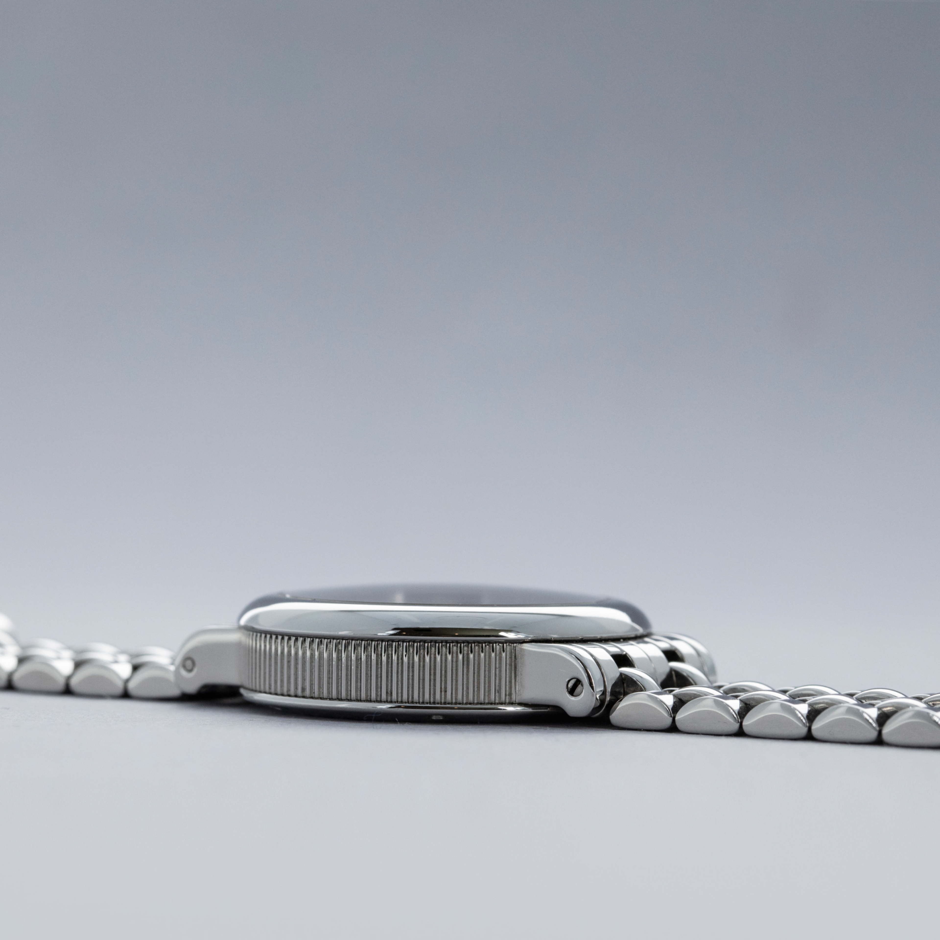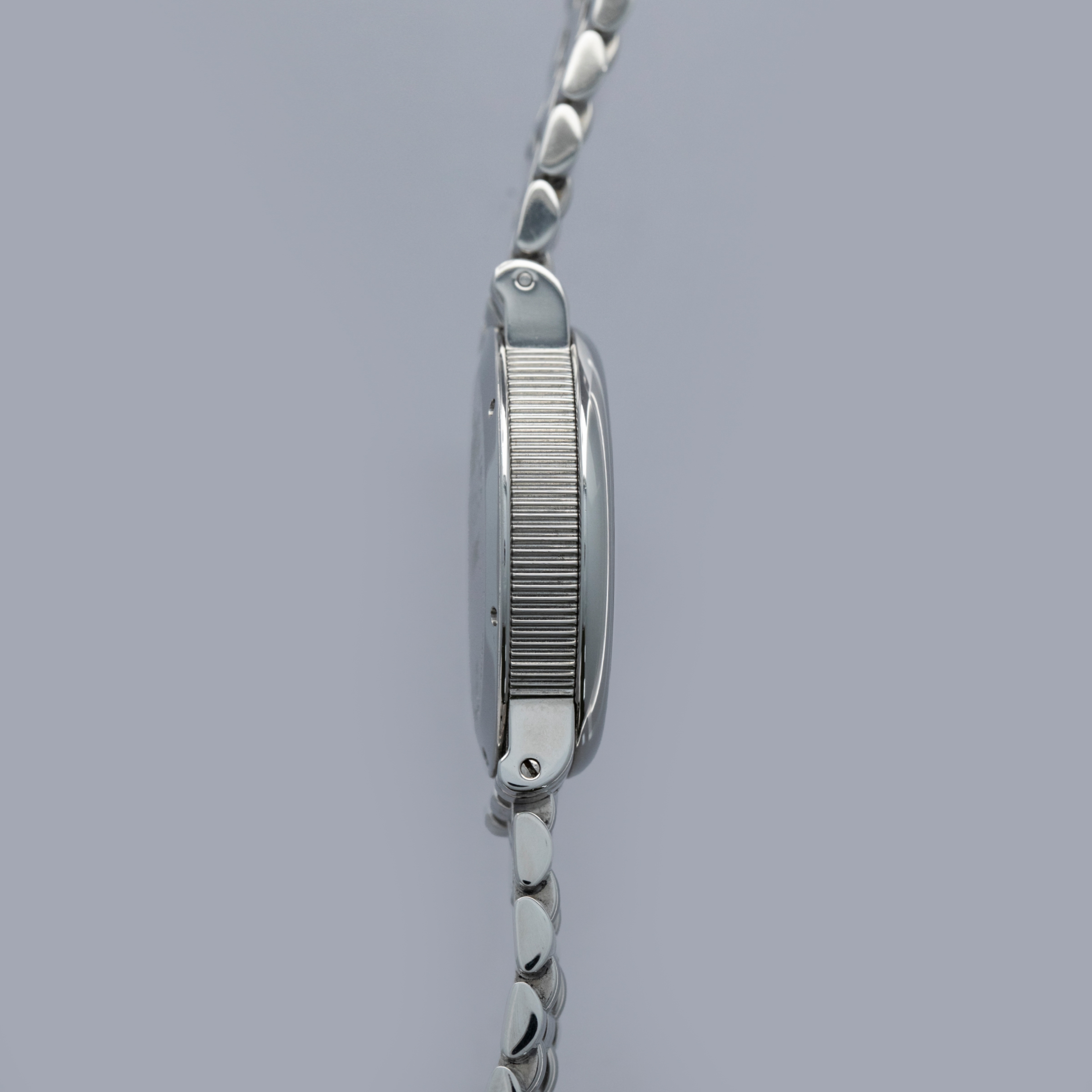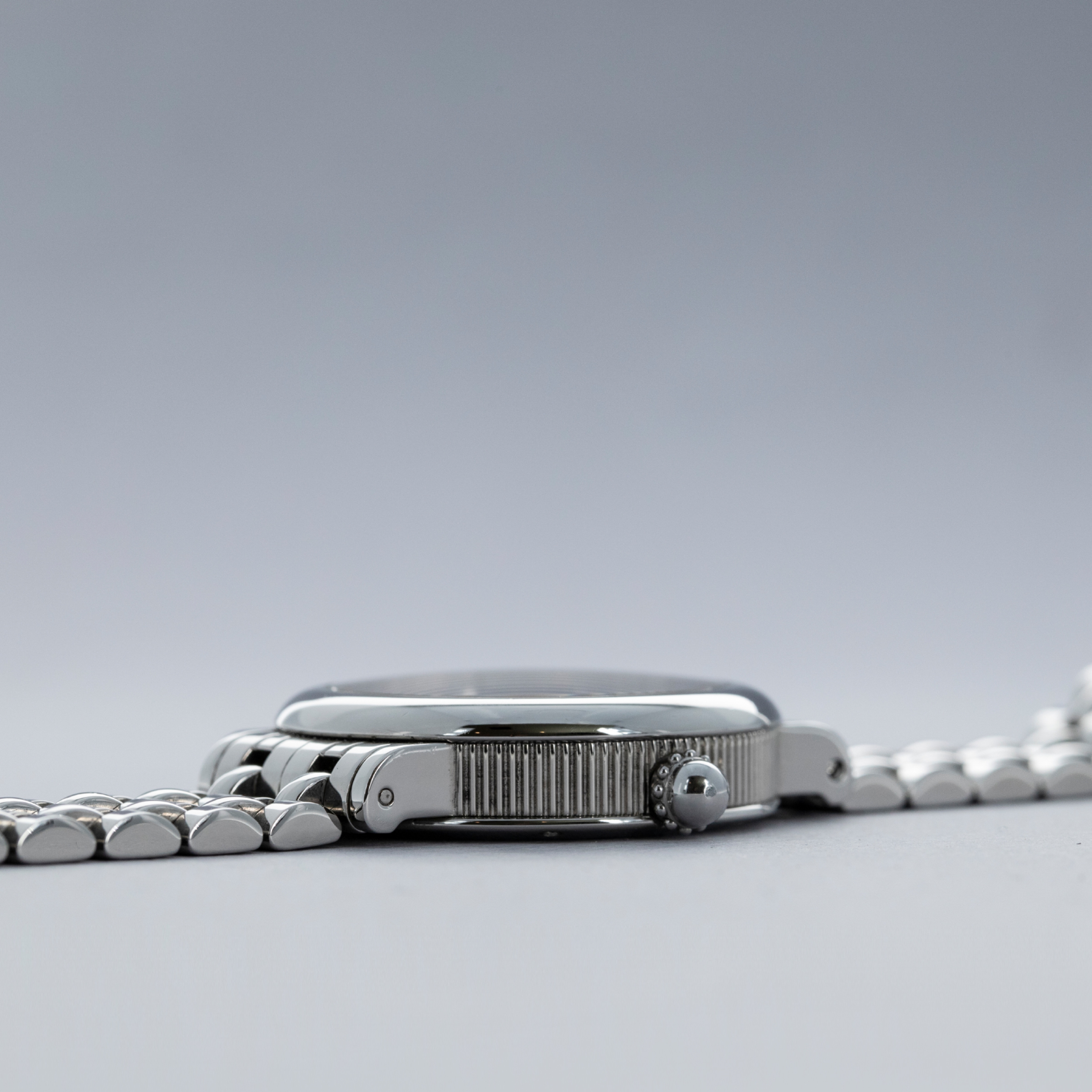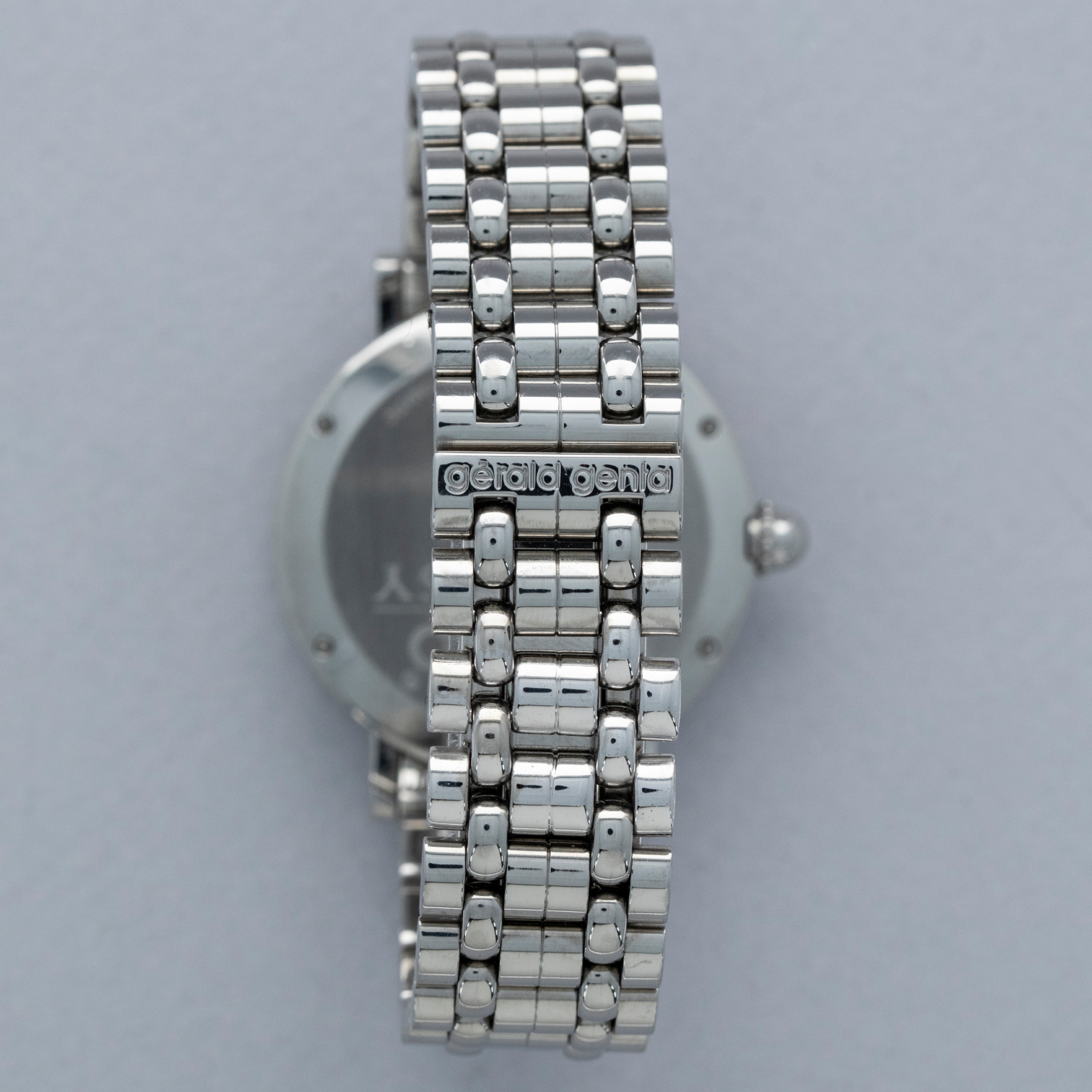 Designed as a simple 34mm case with a polished domed bezel, Genta introduced some flair into the ref. G3612 via its coin-edge mid-case and distinctive winding crown. Offered on an intricate bracelet, this example is all the more desirable and carries even more wrist presence.