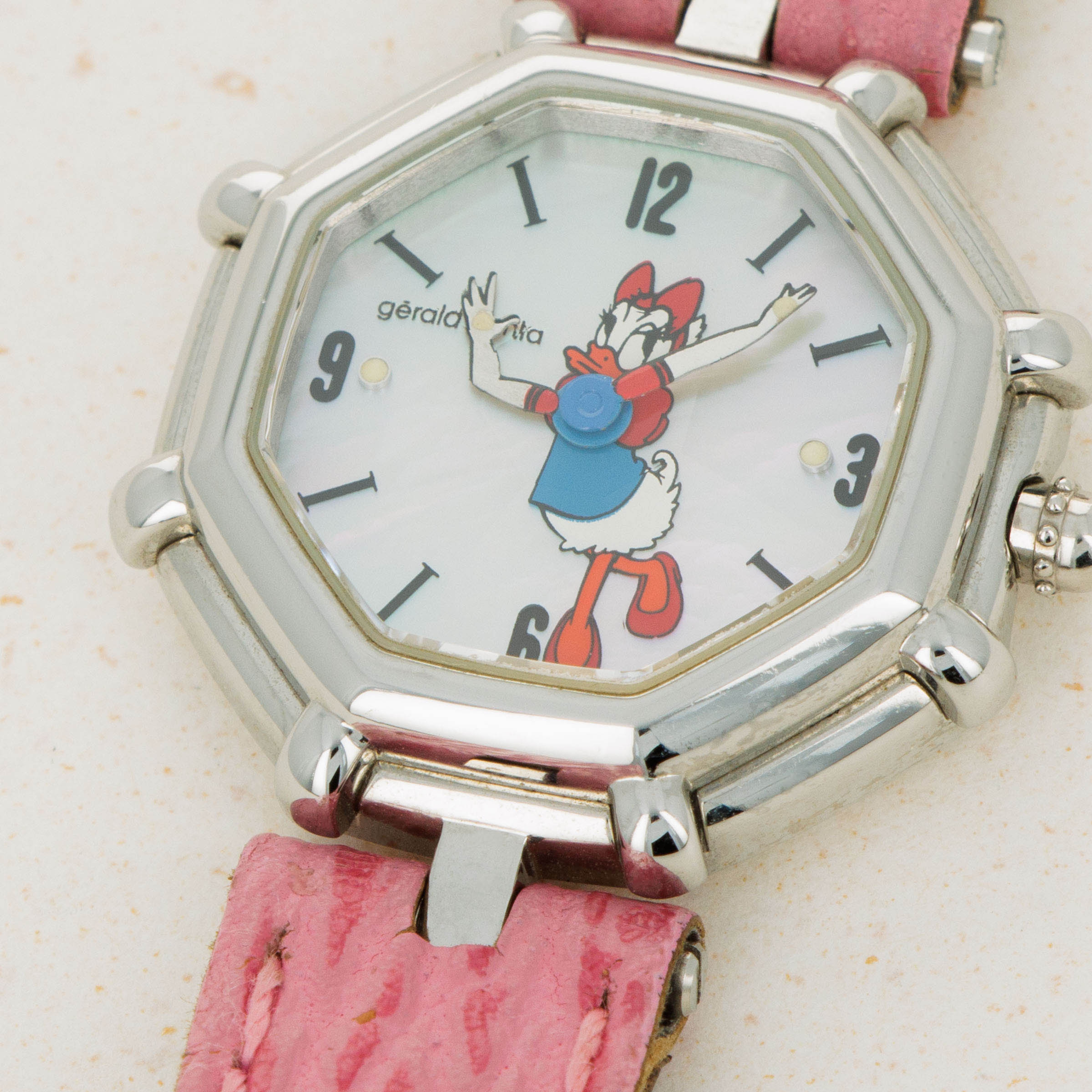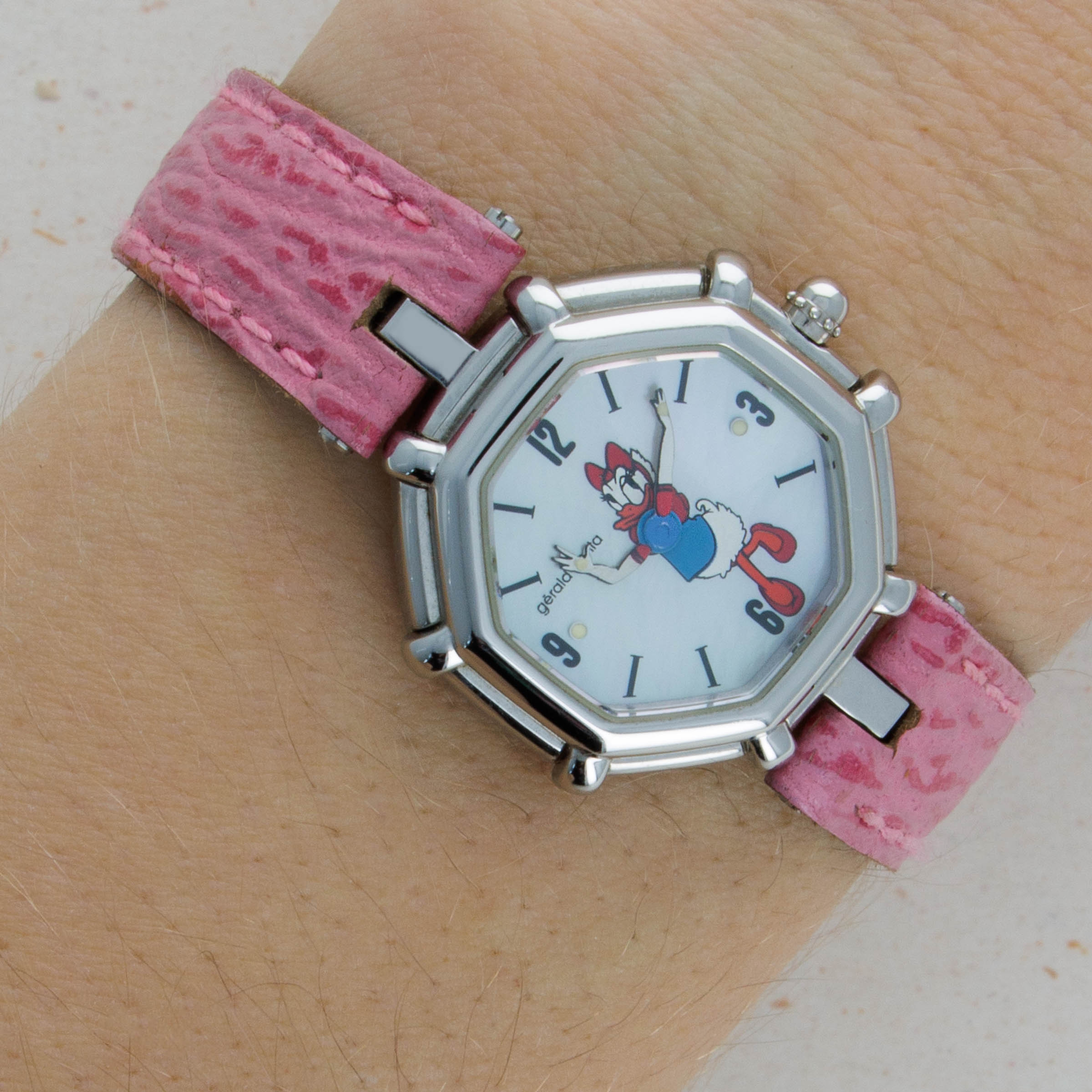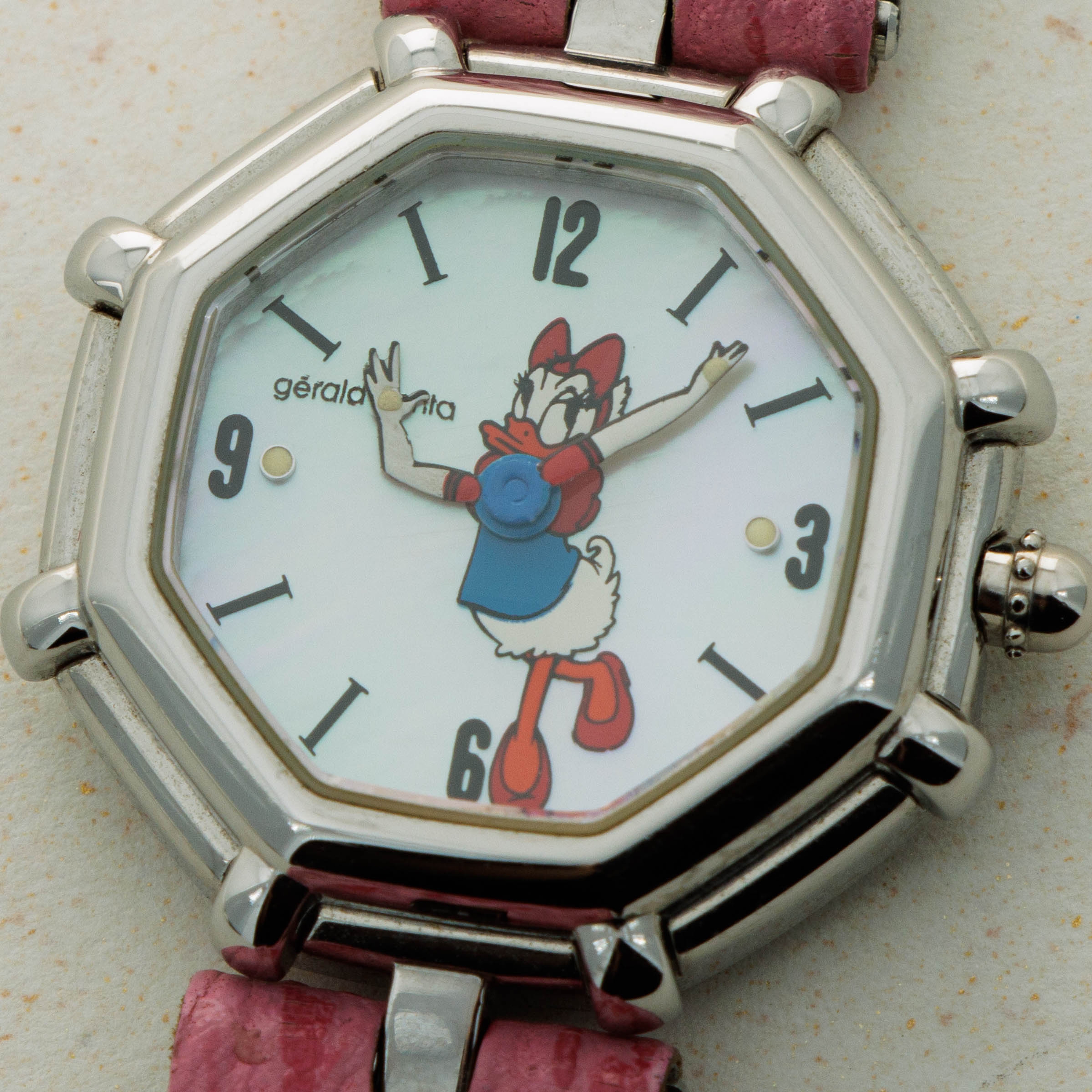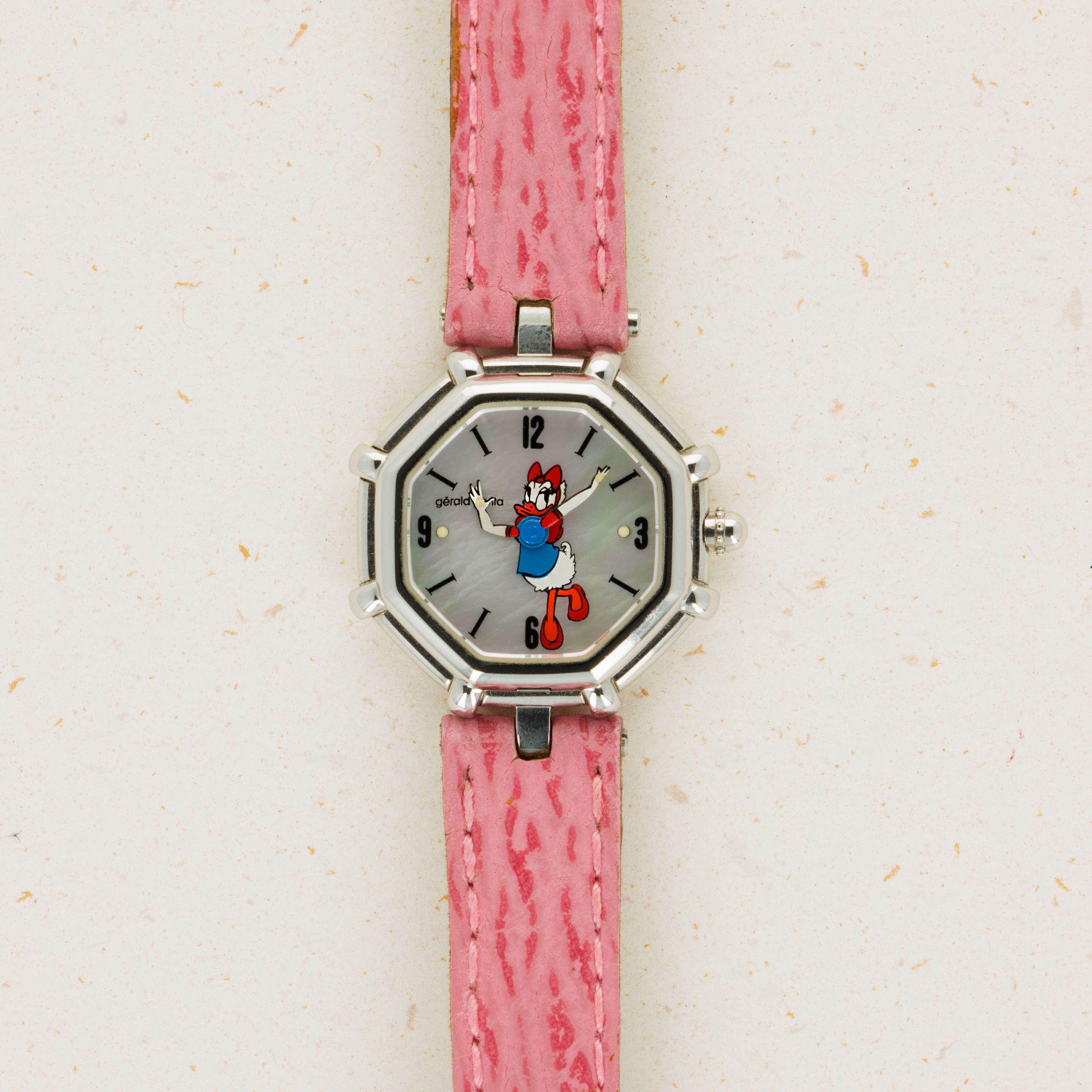 Famed for first fixing the friendly faces of everyone’s favorite Disney friends onto his watches in the 1980s as the watch designer of his own brand following his acquisition of the rights to do so, Gérald Genta’s design DNA has largely been linked with Mickey Mouse and Disney’s other cartoon characters. Often dressed in various costumes or during a random activity such as golfing, Genta’s depiction of the characters often enables the character to seamlessly integrate into the function of the watch, with these watches often featuring hour and minute hands that are designed to operate and appear as both; the watch’s and the character’s hands. Horologically astute while remaining whimsical in nature, these timepieces have become iconic within the pantheon of Gerald Genta as a brand, and the man’s own legacy. Depicted here is Daisy Duck in her original blue shirt and red shoes printed over a simple silver dial. Contrasting the otherwise understated dial, this timepiece also boasts a distinctive single-lug design and a stepped bezel tracing along the border of this octagonal timepiece like spokes sticking out from each of the timepiece’s eight corners that combines with the rest of its design to create a visually unique timepiece that speaks to Genta’s unique design language and iconic eye for detail.