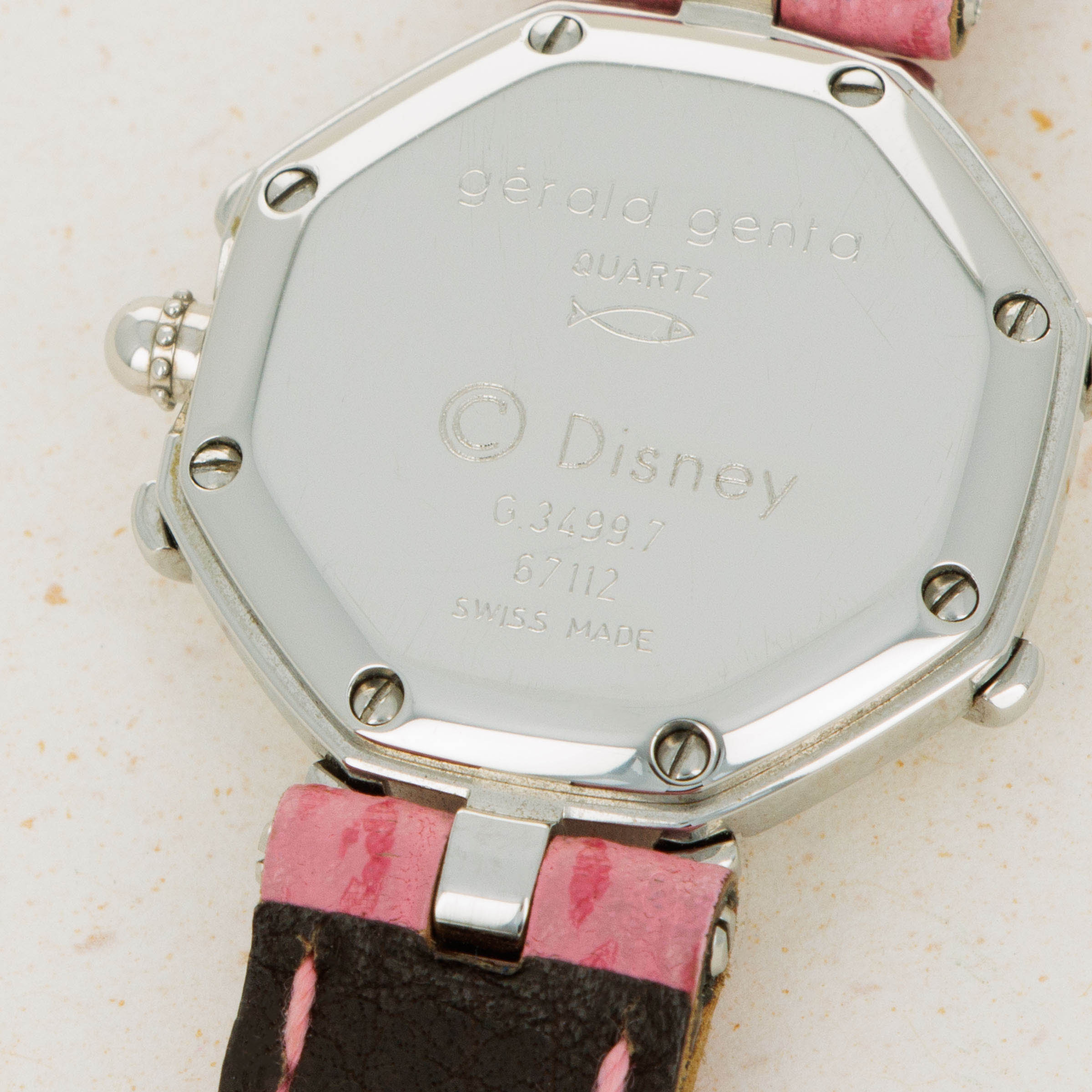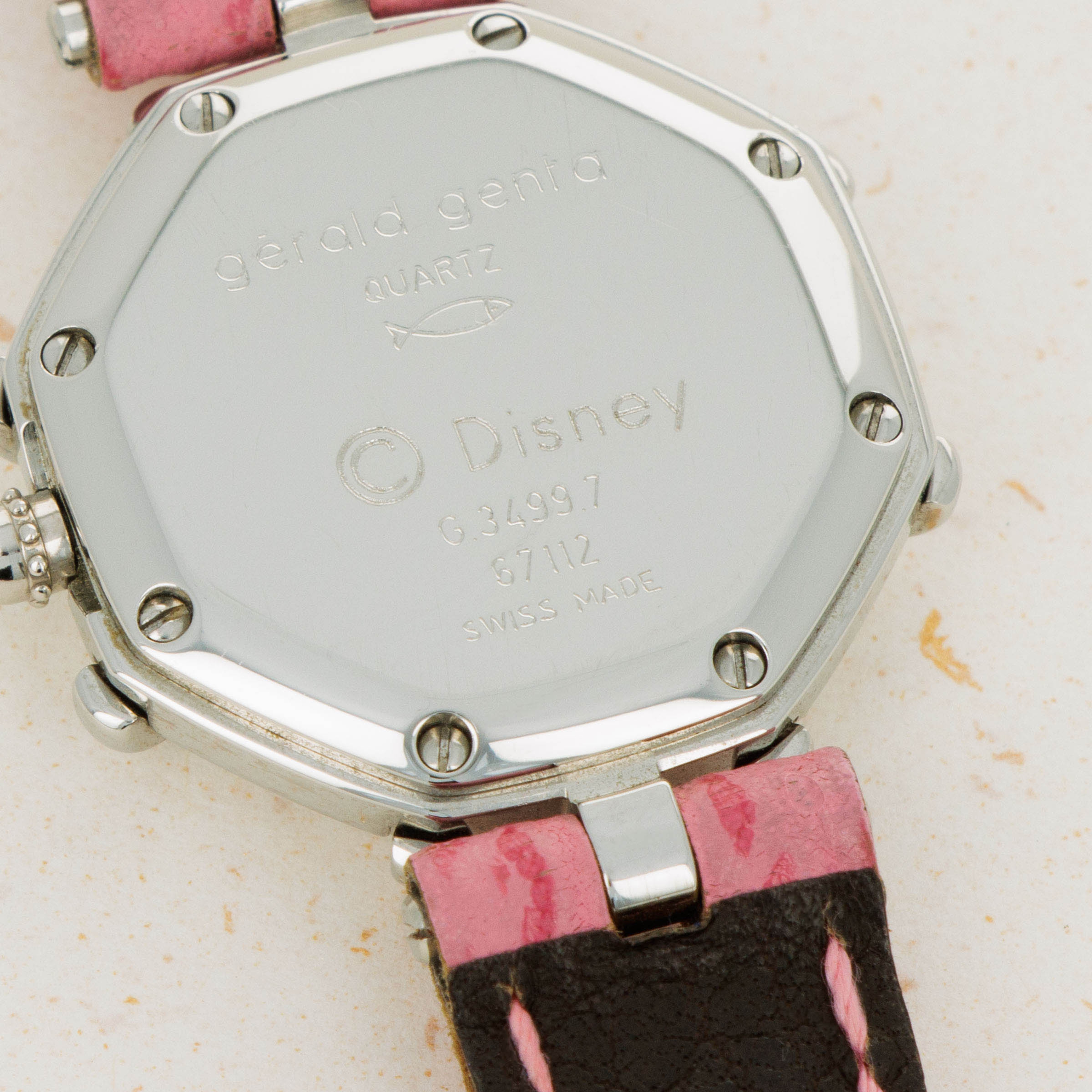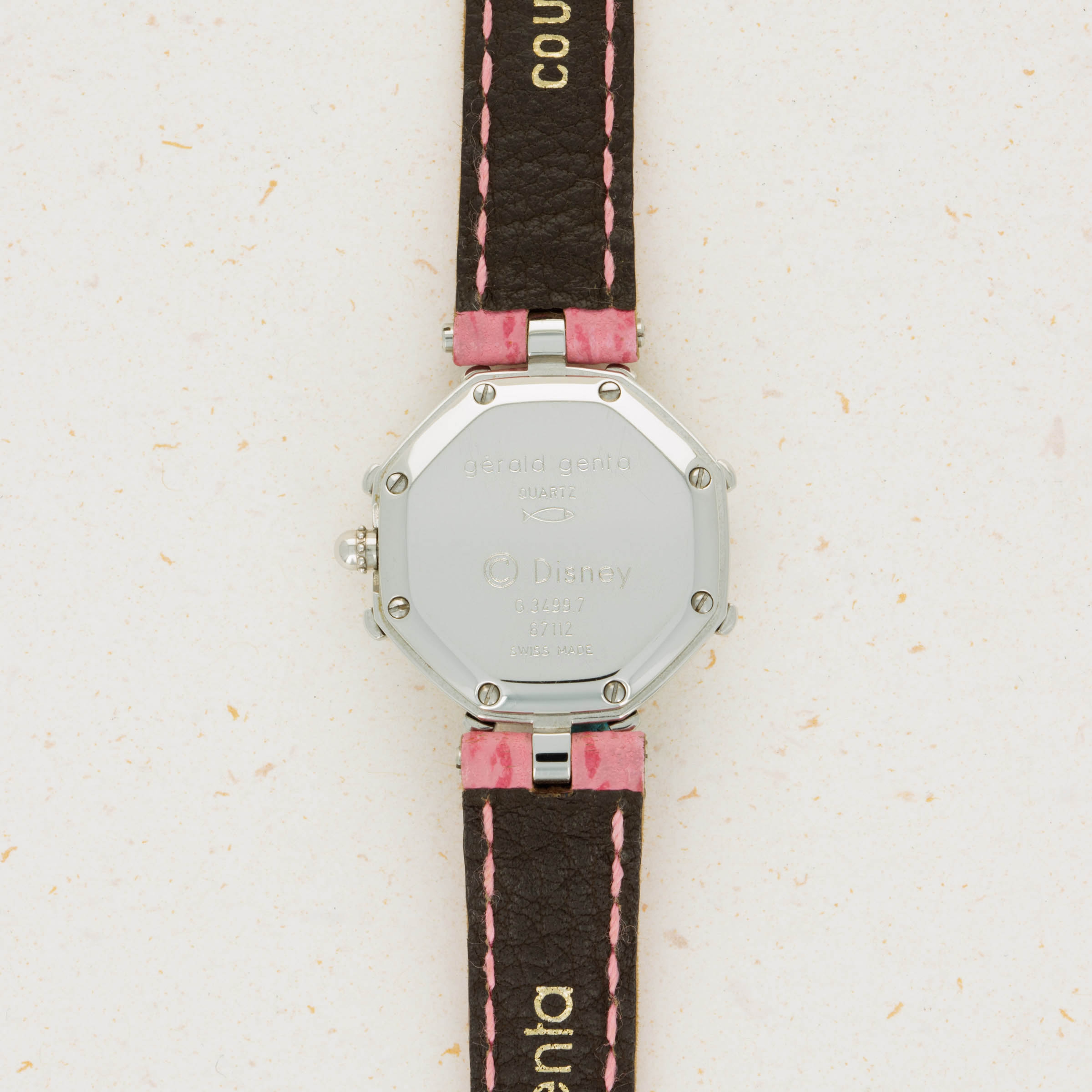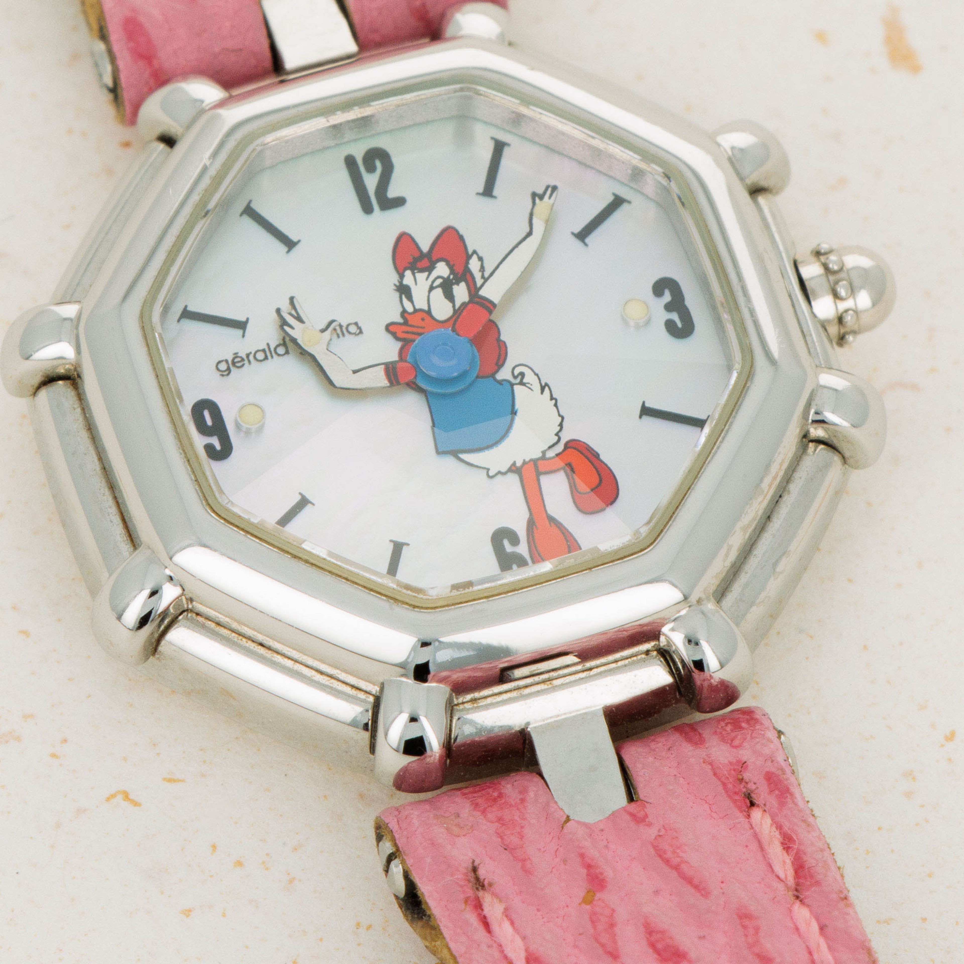 Famed for first fixing the friendly faces of everyone’s favorite Disney friends onto his watches in the 1980s as the watch designer of his own brand following his acquisition of the rights to do so, Gérald Genta’s design DNA has largely been linked with Mickey Mouse and Disney’s other cartoon characters. Often dressed in various costumes or during a random activity such as golfing, Genta’s depiction of the characters often enables the character to seamlessly integrate into the function of the watch, with these watches often featuring hour and minute hands that are designed to operate and appear as both; the watch’s and the character’s hands. Horologically astute while remaining whimsical in nature, these timepieces have become iconic within the pantheon of Gerald Genta as a brand, and the man’s own legacy. Depicted here is Daisy Duck in her original blue shirt and red shoes printed over a simple silver dial. Contrasting the otherwise understated dial, this timepiece also boasts a distinctive single-lug design and a stepped bezel tracing along the border of this octagonal timepiece like spokes sticking out from each of the timepiece’s eight corners that combines with the rest of its design to create a visually unique timepiece that speaks to Genta’s unique design language and iconic eye for detail.