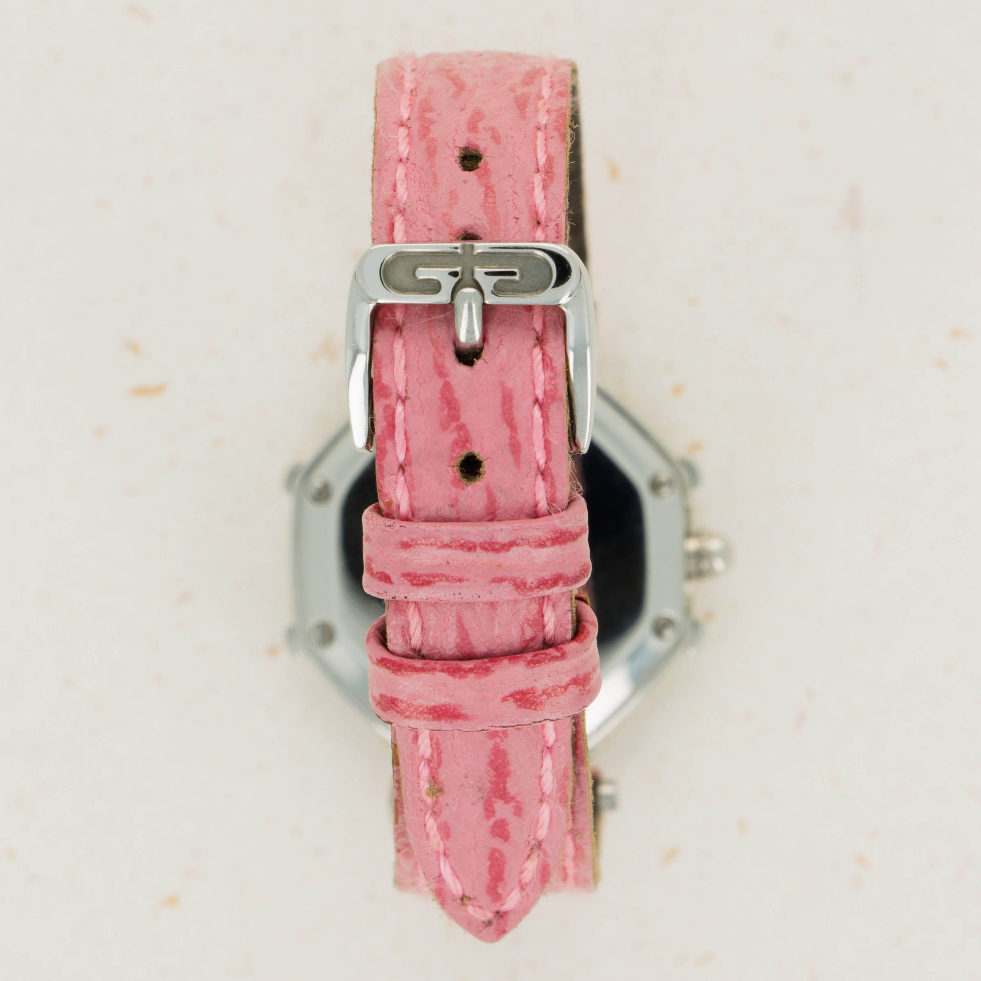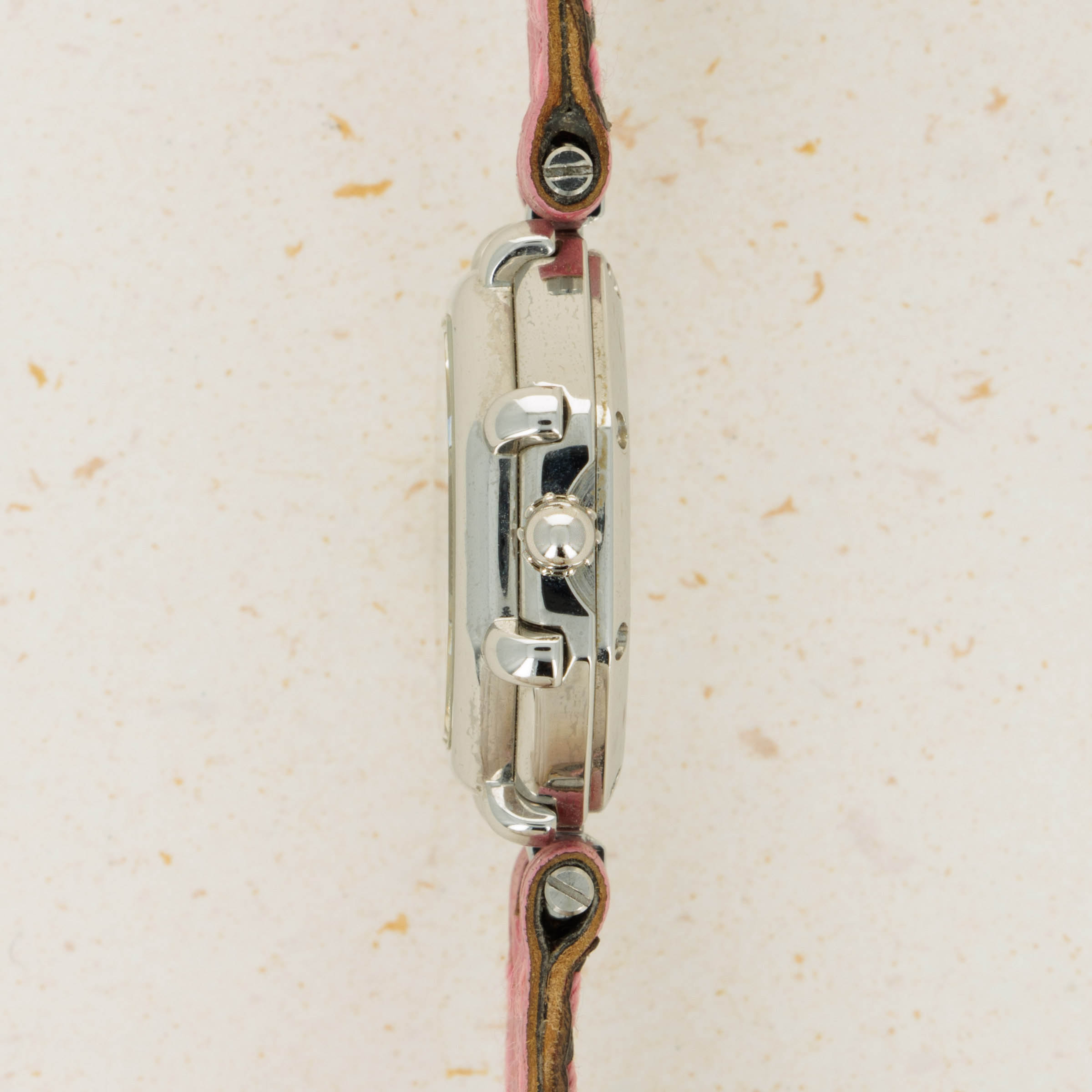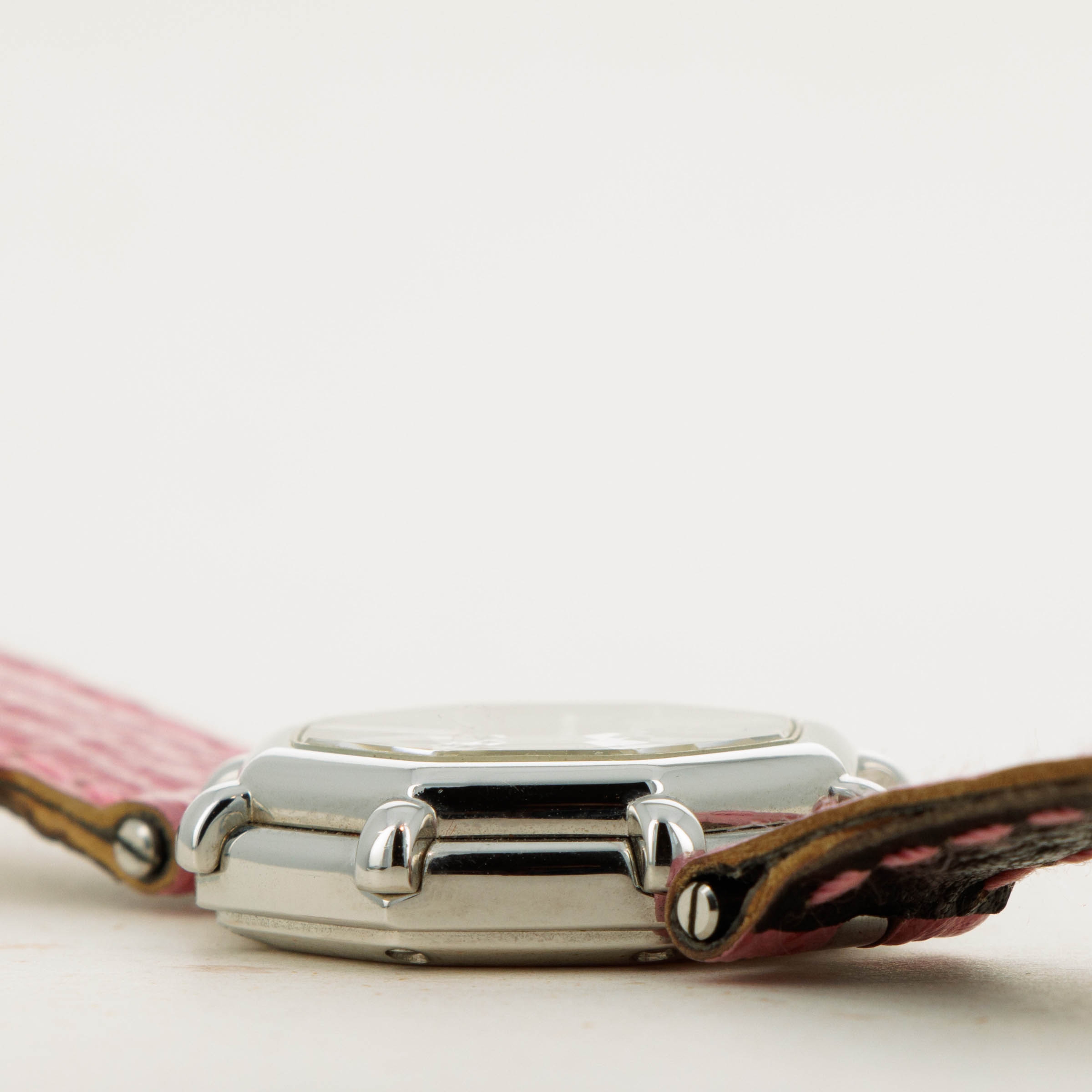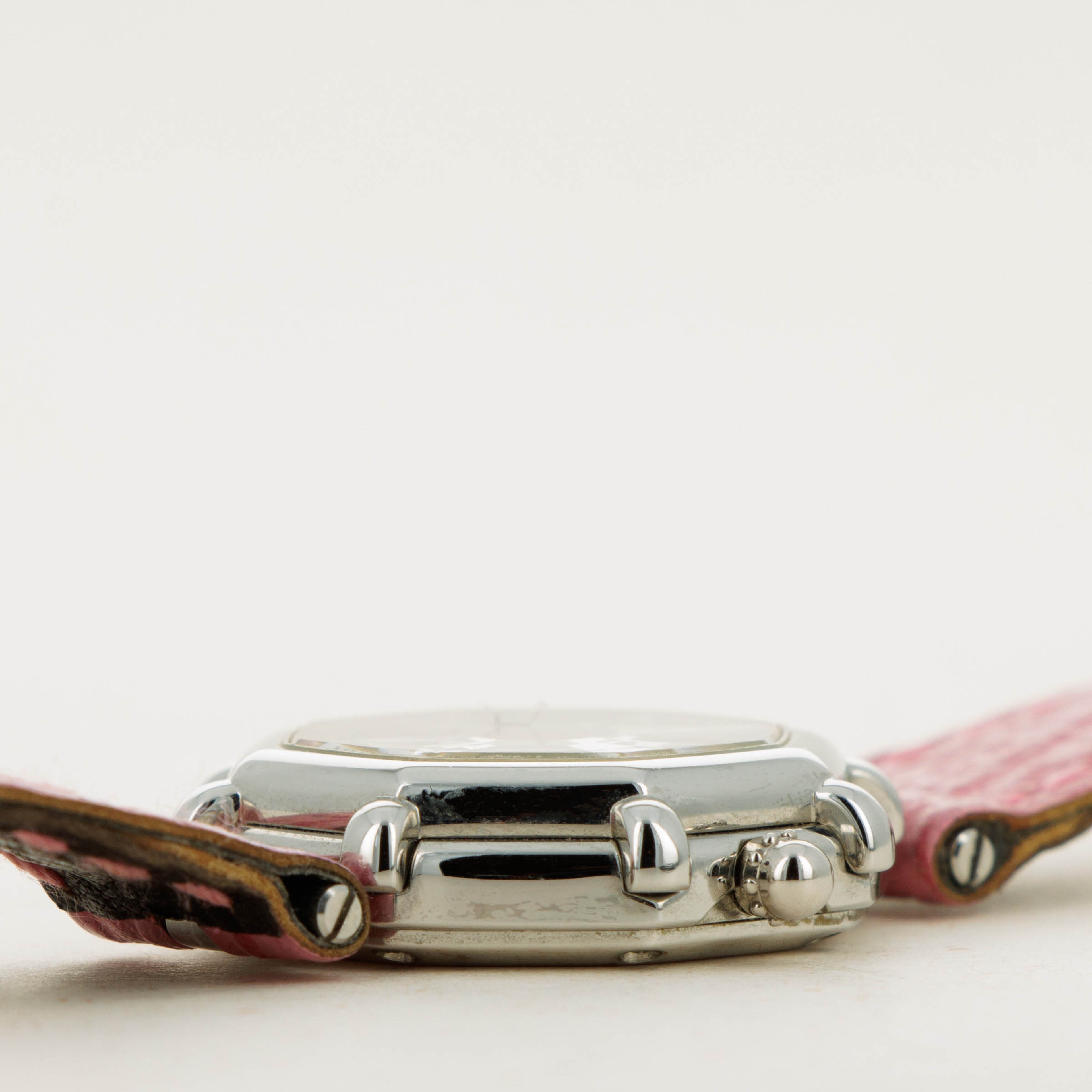 Famed for first fixing the friendly faces of everyone’s favorite Disney friends onto his watches in the 1980s as the watch designer of his own brand following his acquisition of the rights to do so, Gérald Genta’s design DNA has largely been linked with Mickey Mouse and Disney’s other cartoon characters. Often dressed in various costumes or during a random activity such as golfing, Genta’s depiction of the characters often enables the character to seamlessly integrate into the function of the watch, with these watches often featuring hour and minute hands that are designed to operate and appear as both; the watch’s and the character’s hands. Horologically astute while remaining whimsical in nature, these timepieces have become iconic within the pantheon of Gerald Genta as a brand, and the man’s own legacy. Depicted here is Daisy Duck in her original blue shirt and red shoes printed over a simple silver dial. Contrasting the otherwise understated dial, this timepiece also boasts a distinctive single-lug design and a stepped bezel tracing along the border of this octagonal timepiece like spokes sticking out from each of the timepiece’s eight corners that combines with the rest of its design to create a visually unique timepiece that speaks to Genta’s unique design language and iconic eye for detail.