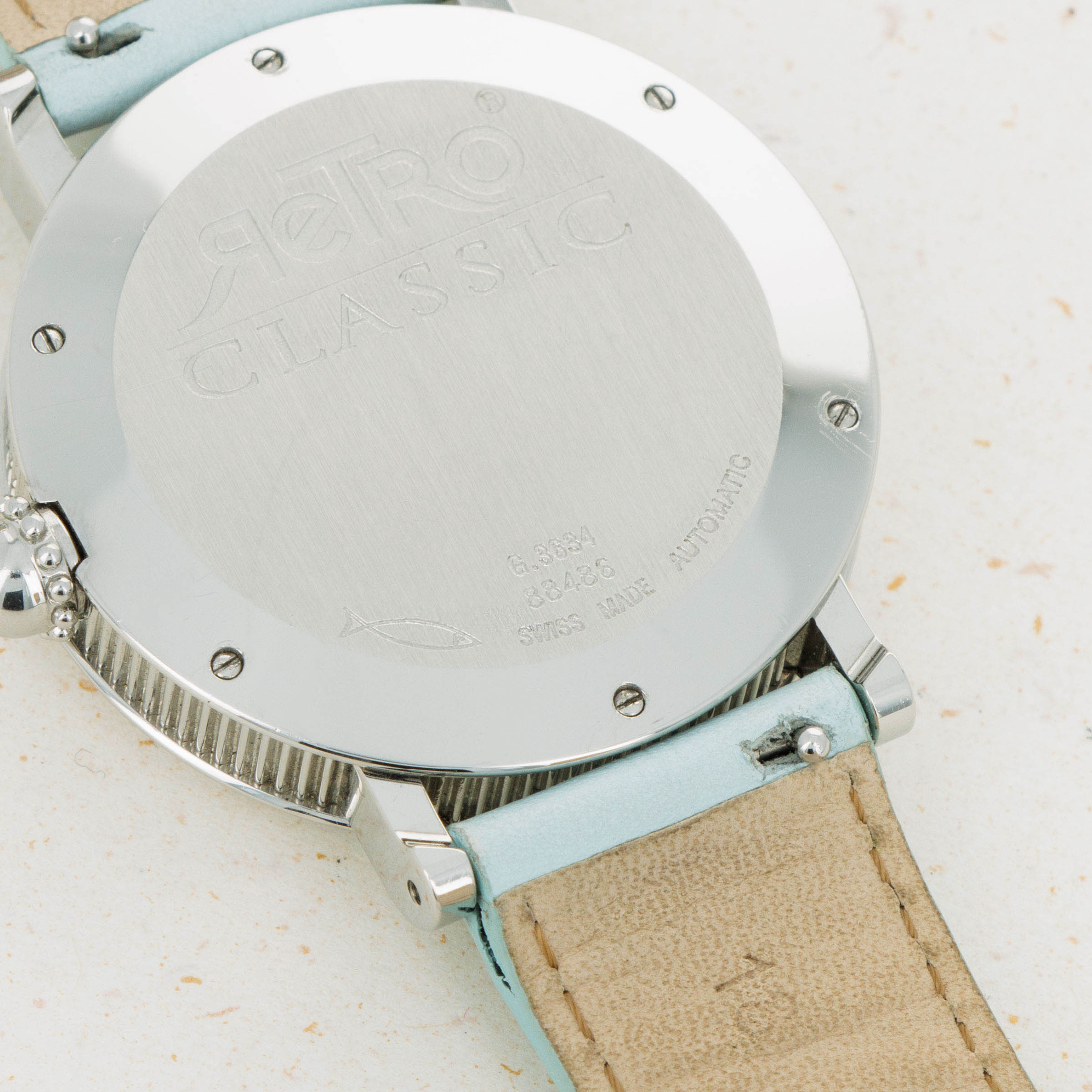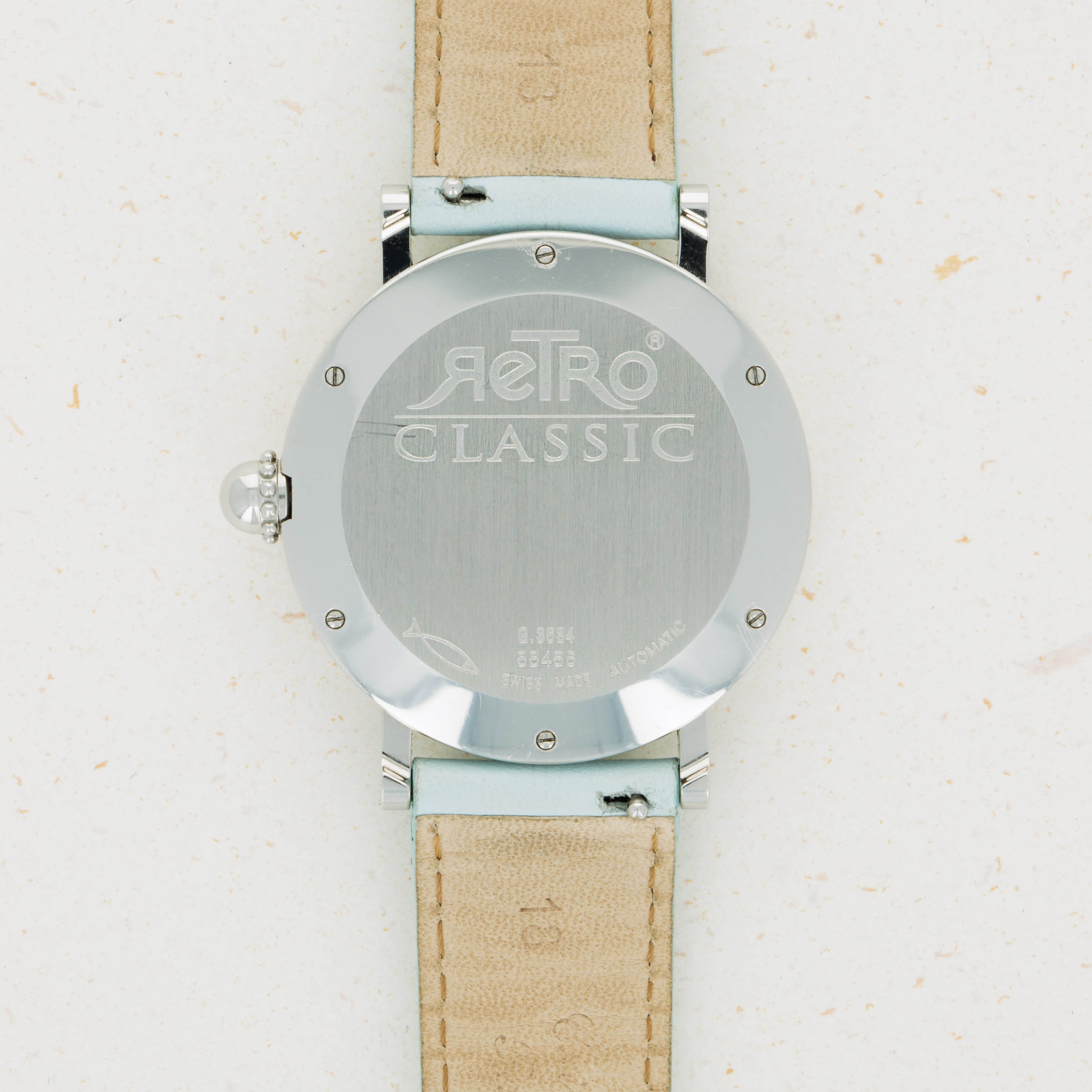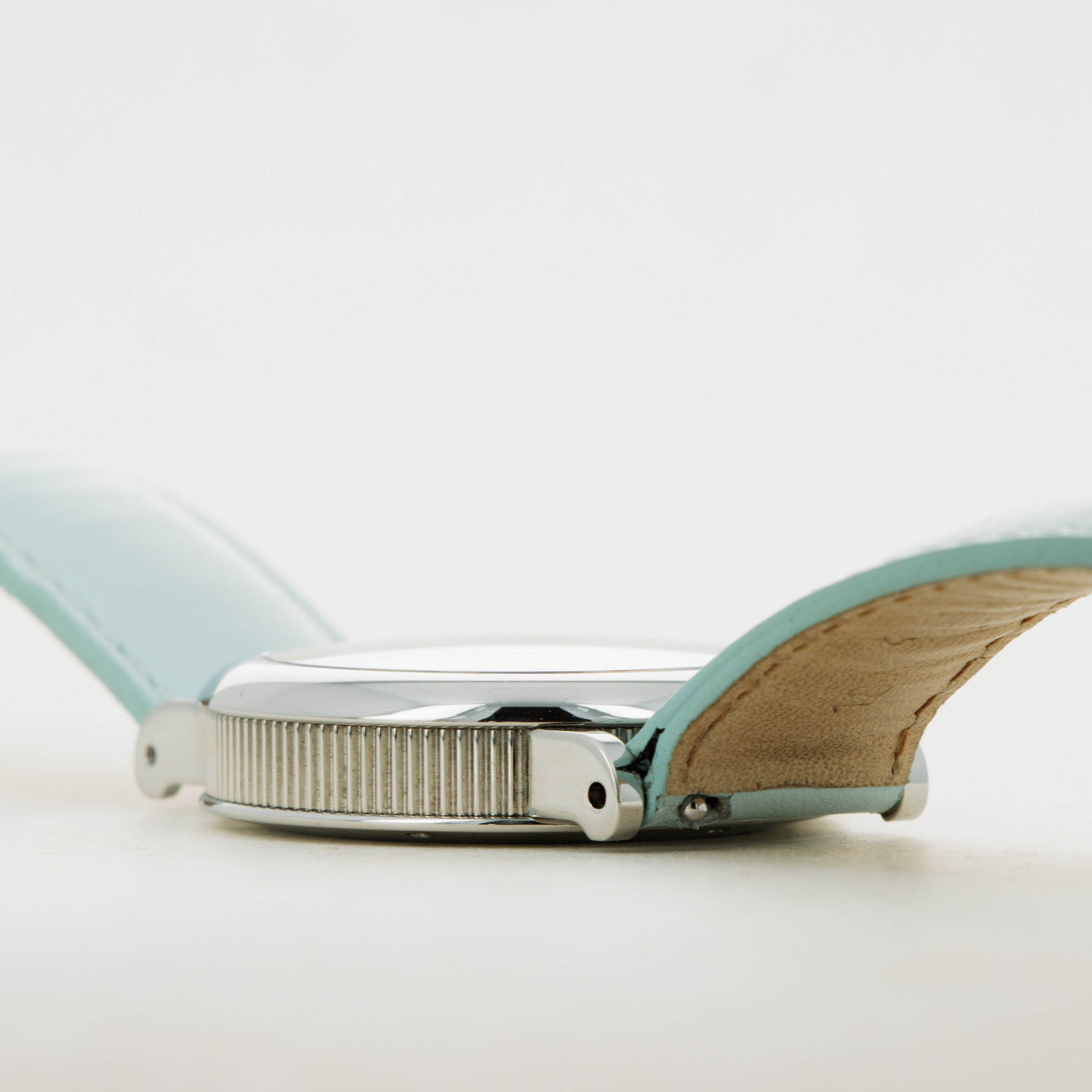 Made of Mother of Pearl, the Retro Classic's dial is a soft shade of blue with a subtle wavy texture that is almost entirely imperceptible, except for in certain condition.