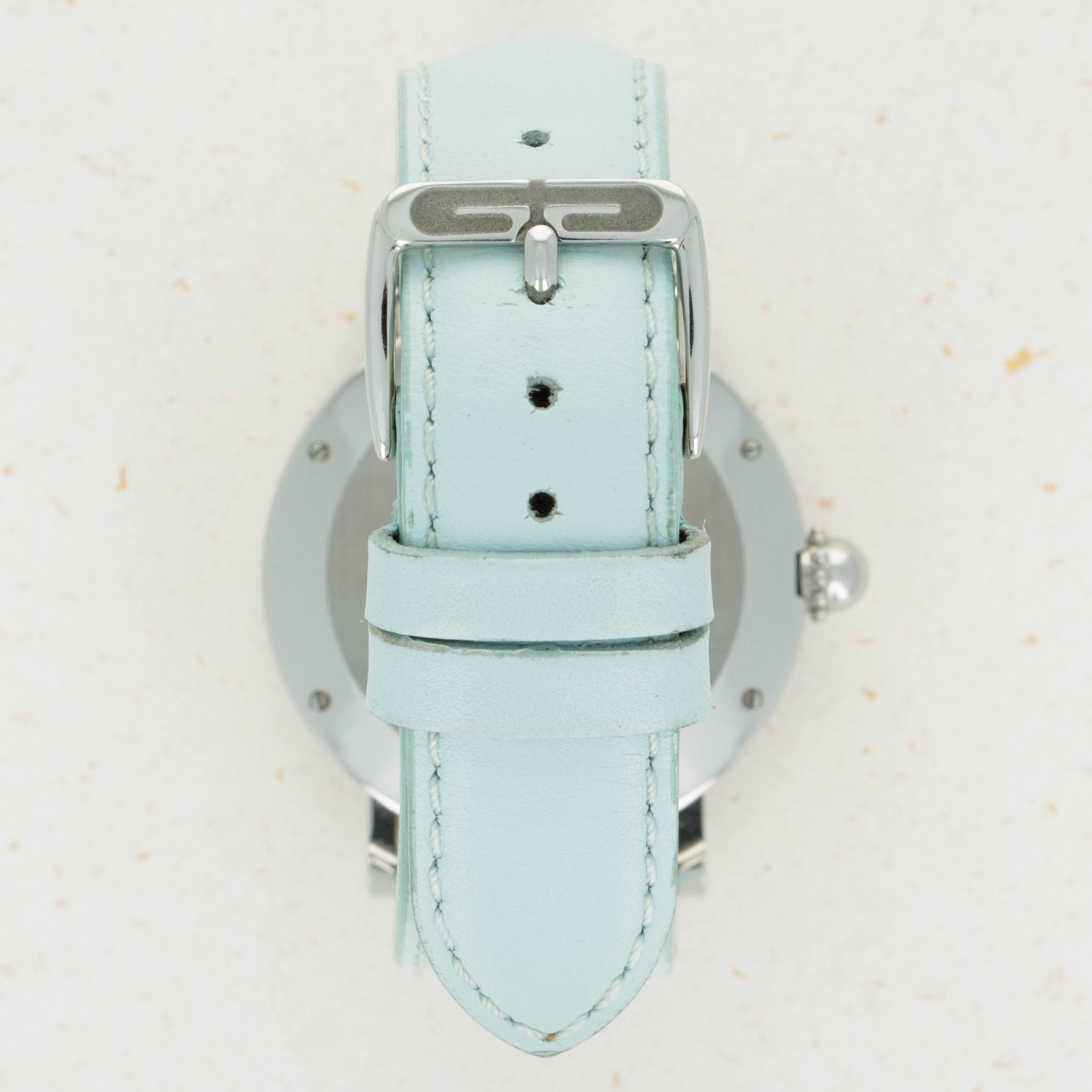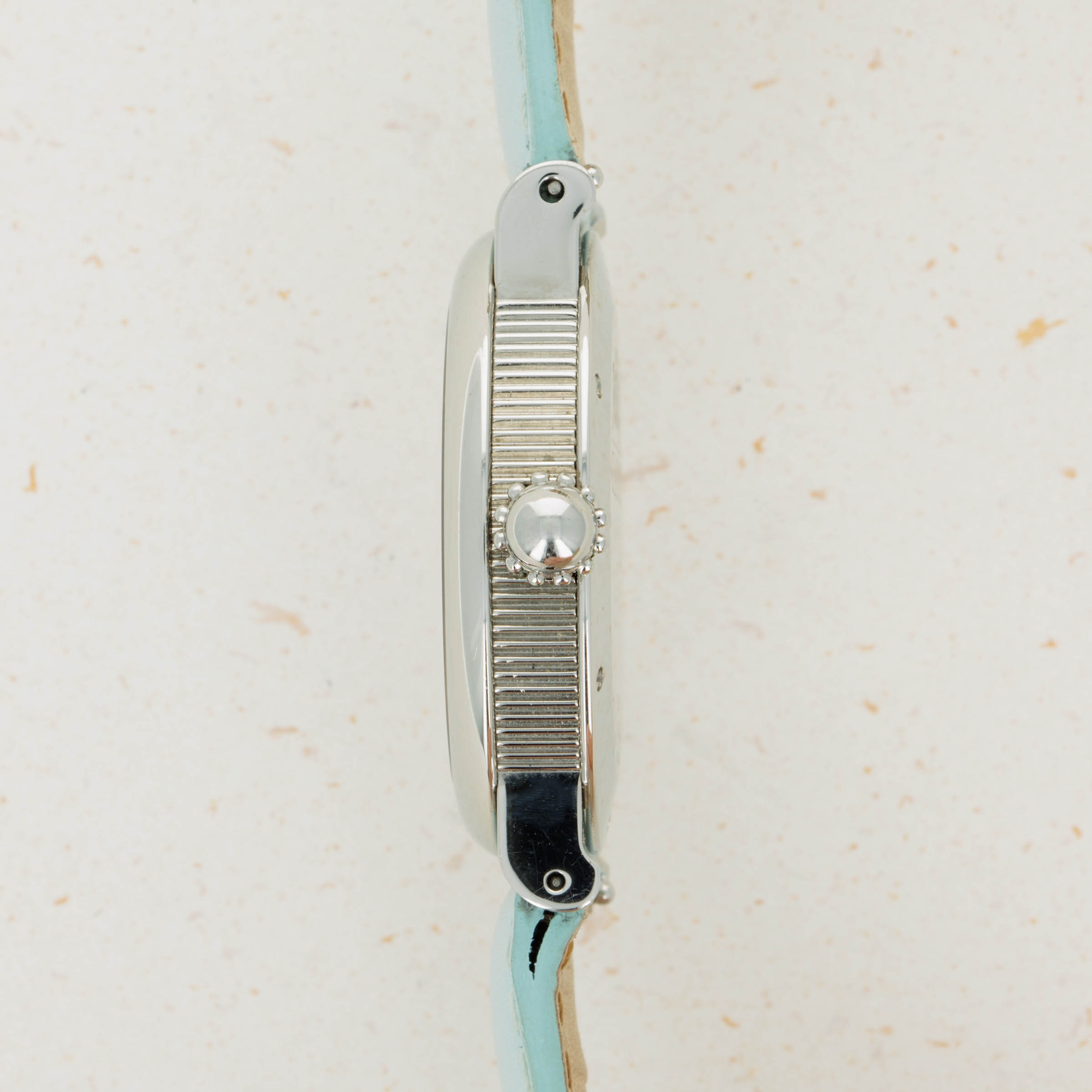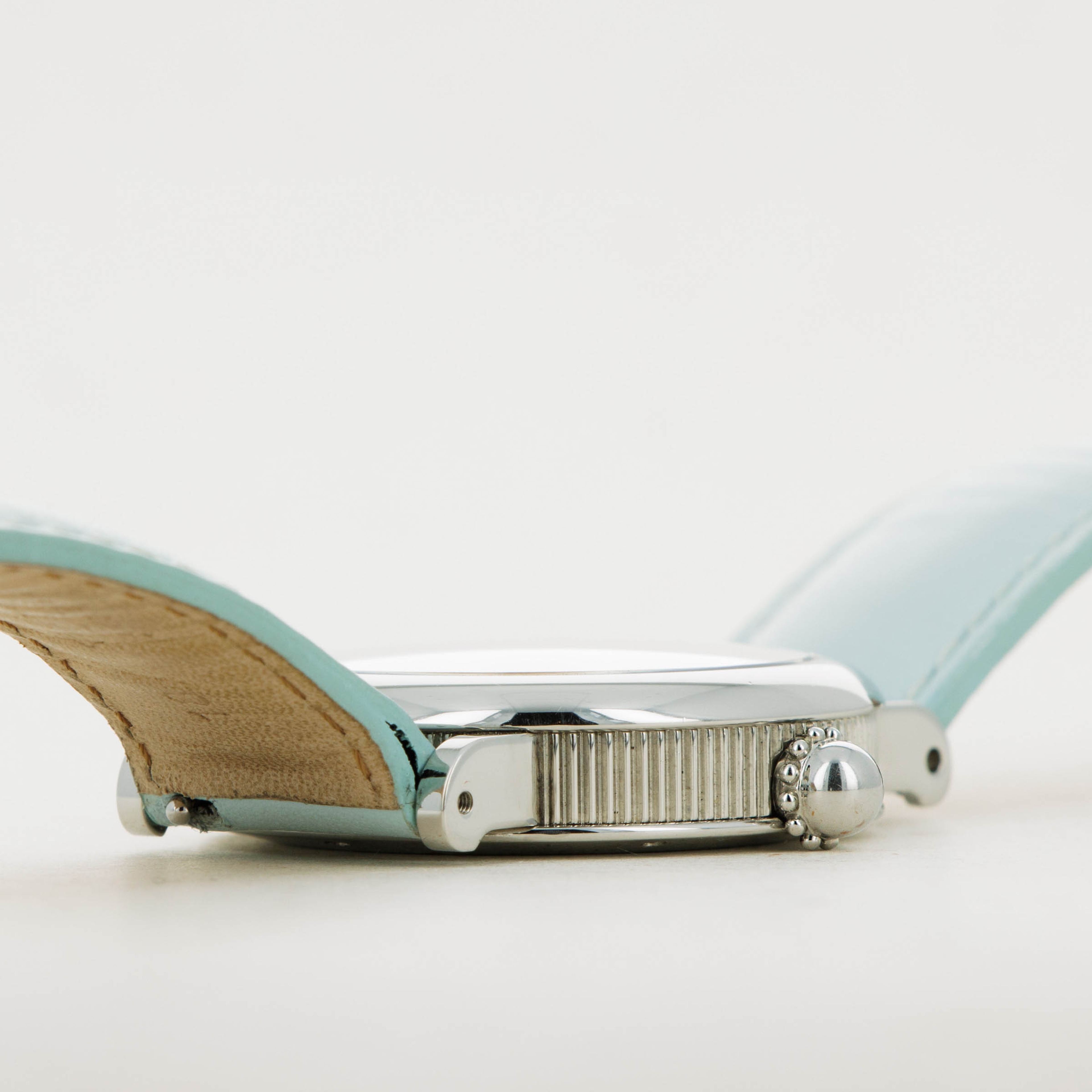 Made of Mother of Pearl, the Retro Classic's dial is a soft shade of blue with a subtle wavy texture that is almost entirely imperceptible, except for in certain condition.