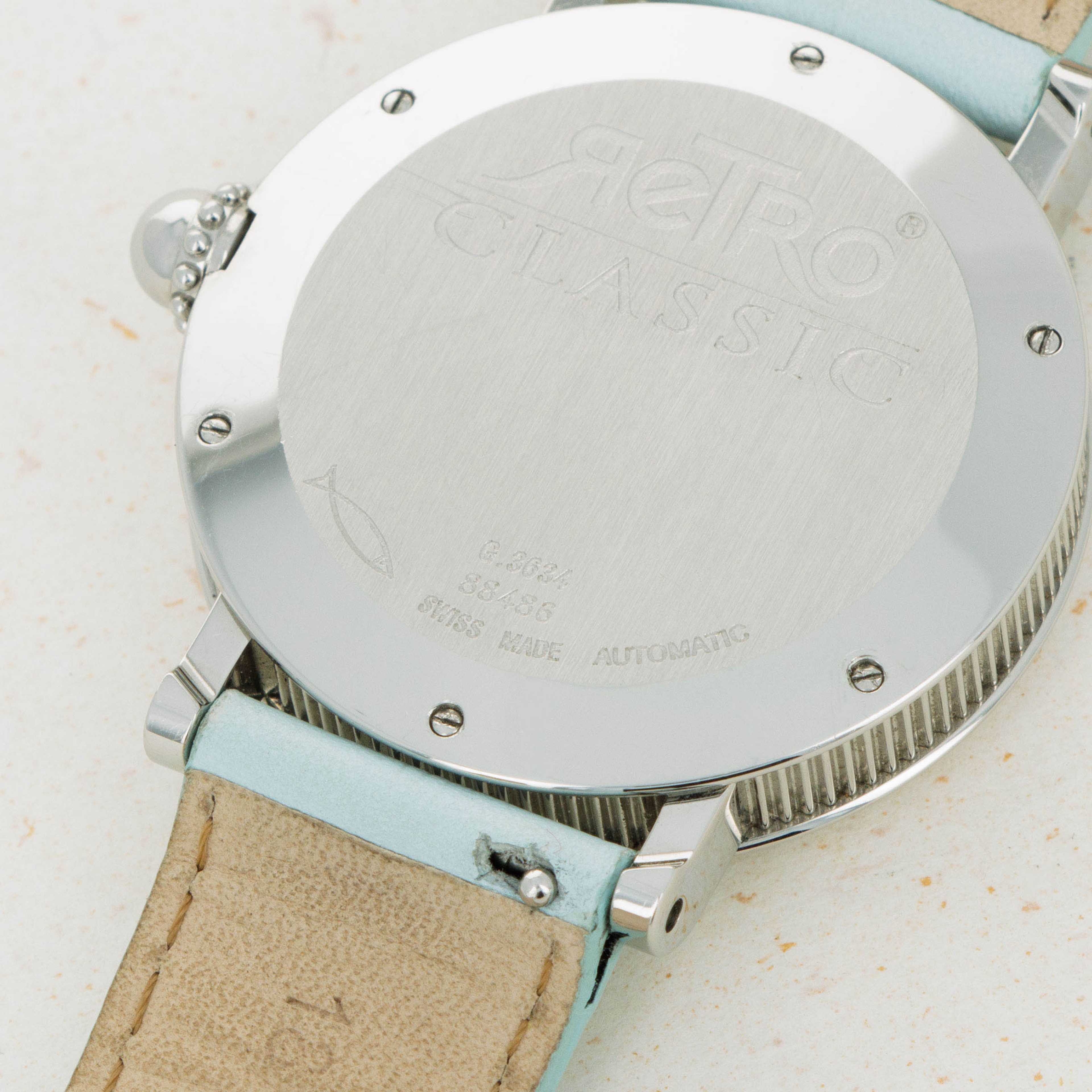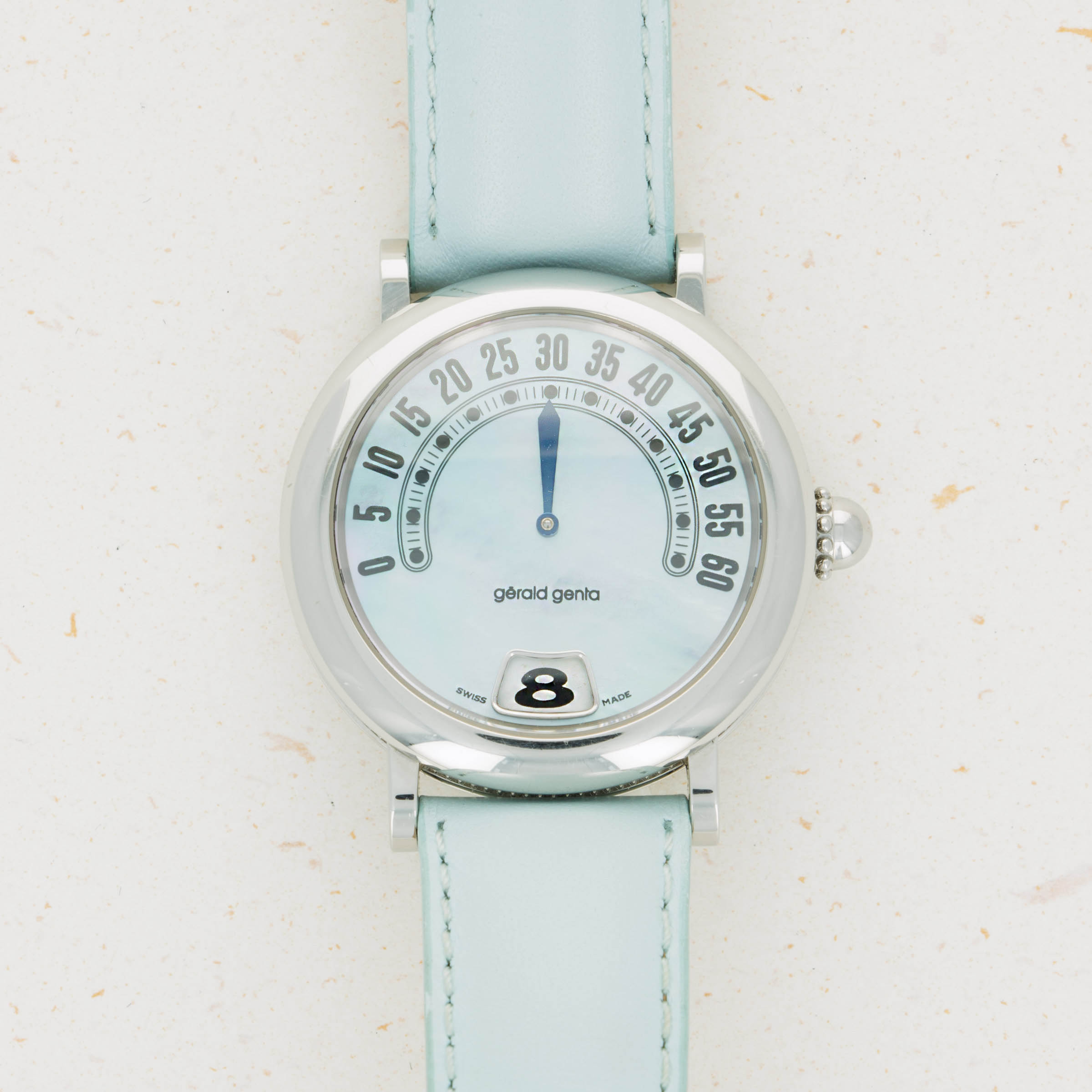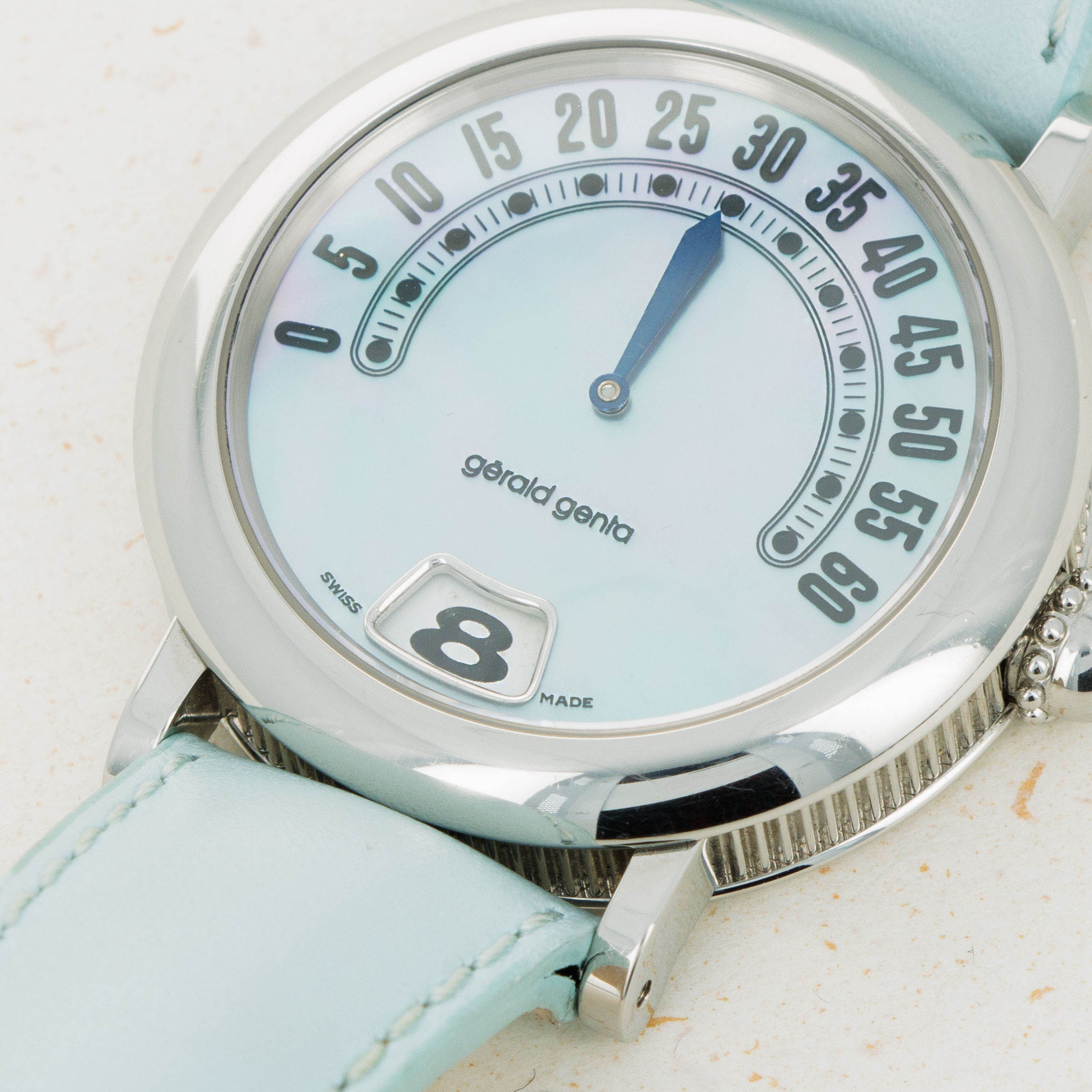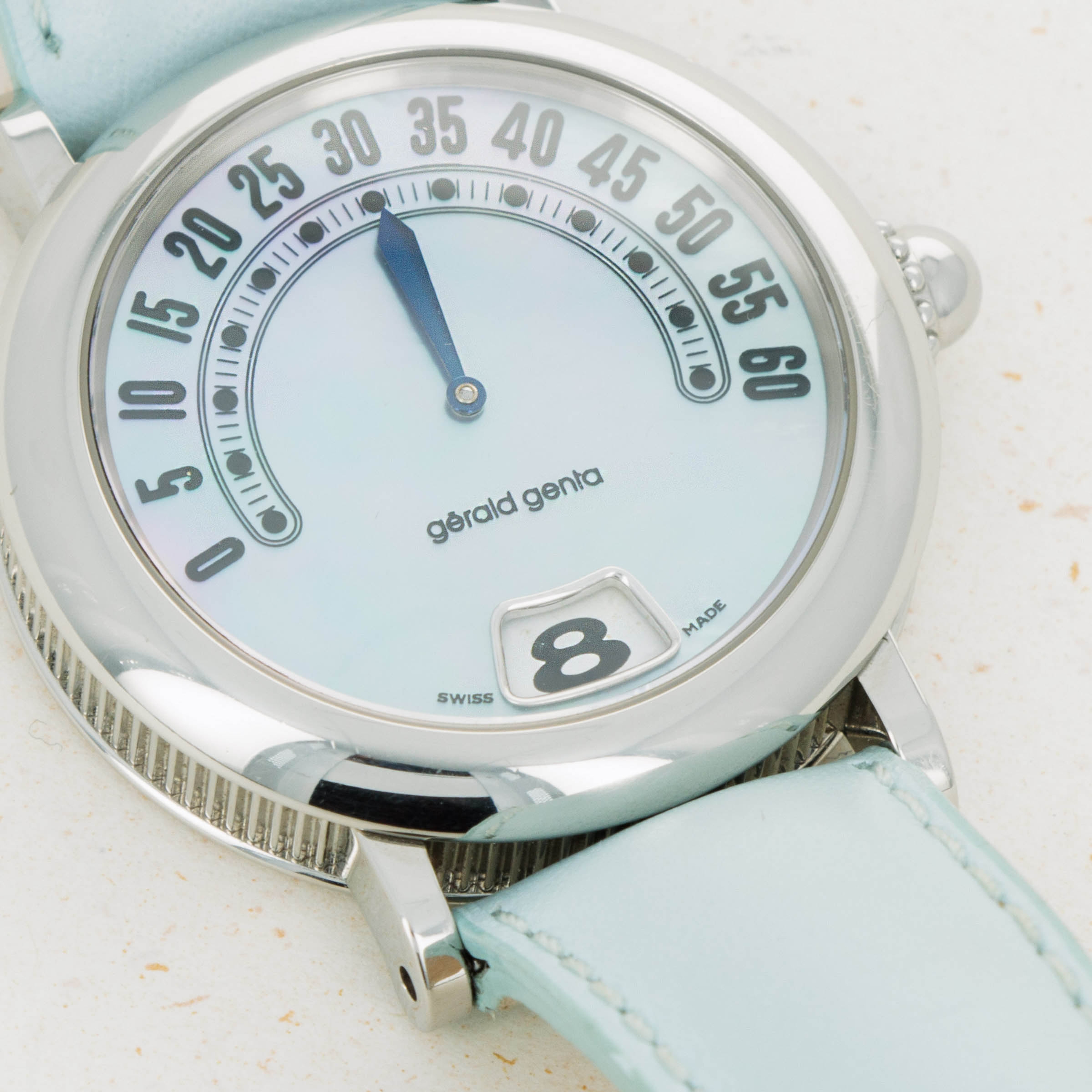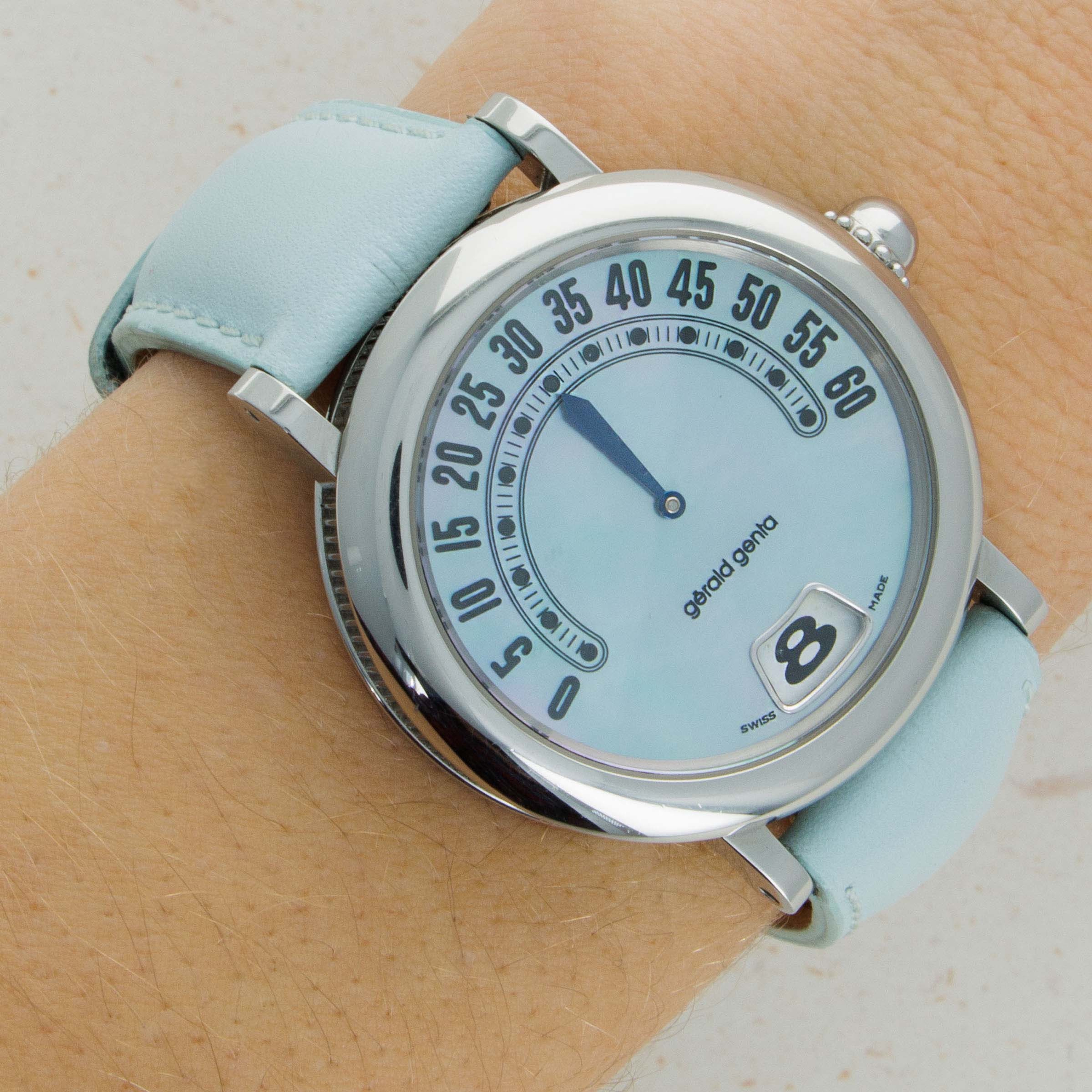 Launched in 1969, Gerald Genta, the brand, was founded by the famed eponymous watch designer best known best for creating the Patek Philippe Nautilus and Audemars Piguet Royal Oak amongst countless other watch designs. While both of those watches were launched in the 1970s, his brand was immediately successful on account of his already growing renown in the industry. With a growing clientele of royalty such as the Moroccan King, the Sultans of both, Oman and Brunei, the King of Spain, the King of Saudi Arabia, the Queen Mother of England and several leading businessmen, sportsmen and entertainers, Gerald Genta's own timepieces quickly became sought-after pieces of horological royalty. By the 1990s one of his best-known designs were round timepieces with retrograde displays and domed cases much like the Retro Classic ref. G. 3634 that we have here. Featuring its trademark retrograde display, the Retro Classic displays the minutes in its northern hemispehere, and the hours within its jump hour aperture at 6 o’clock. With its domed bezel, coin-edge midcase, stainless steel case, light blue strap and soft blue dial, the Retro Classic is an elegantly styled timepiece whose refined aesthetic juxtaposes its rather unique style of time-telling, a rather Genta-esque notion that is quite fitting. While the Gerald Genta brand was eventually sold to Bvlgari in 2000, the brand’s timepieces still conjure a close link to their famed designer and all of his other incredible work. An interesting watch linked to horology's most decorated designer, this timepiece is undoubtedly a must-have for any collector seeking to obtain a unique piece of true watchmaking history.