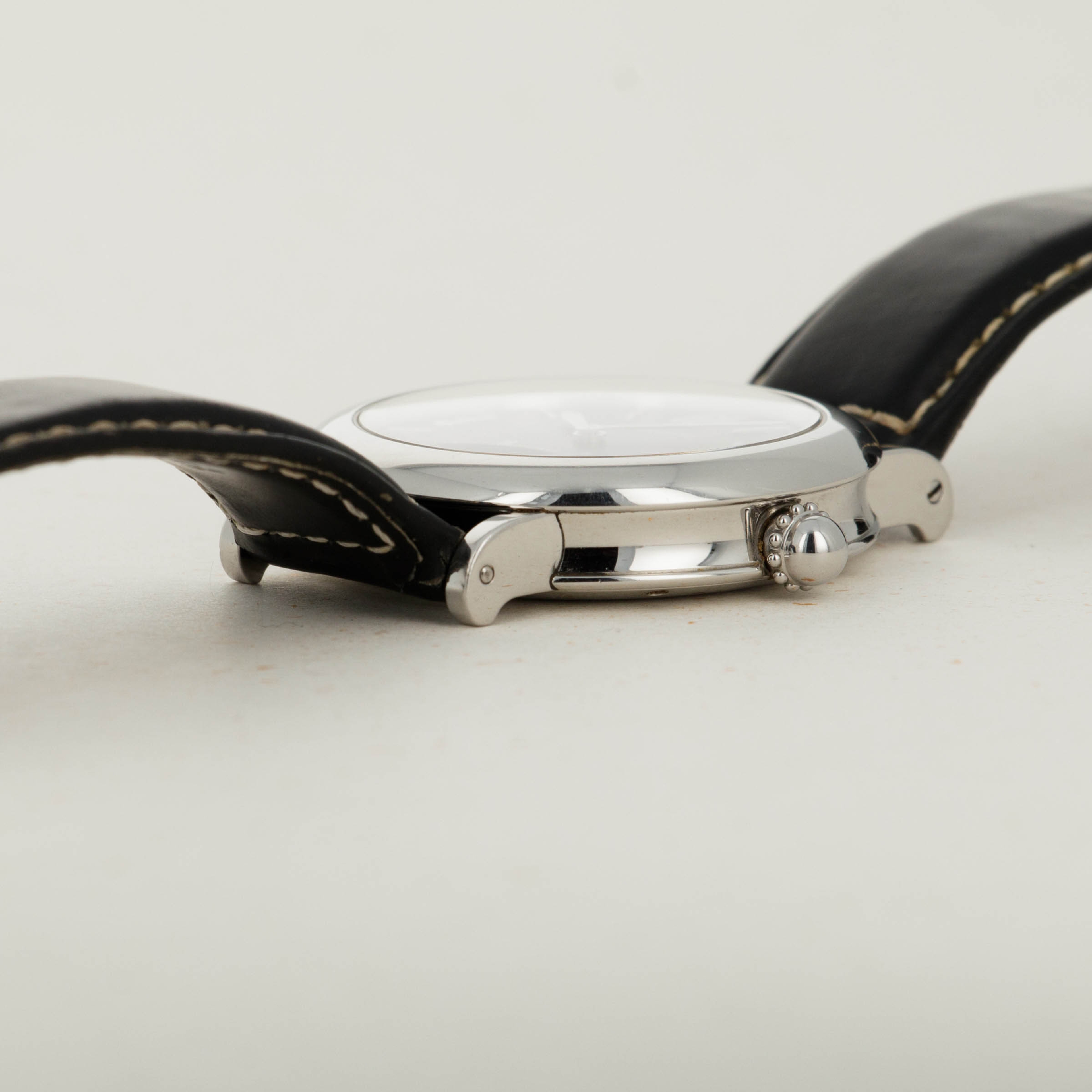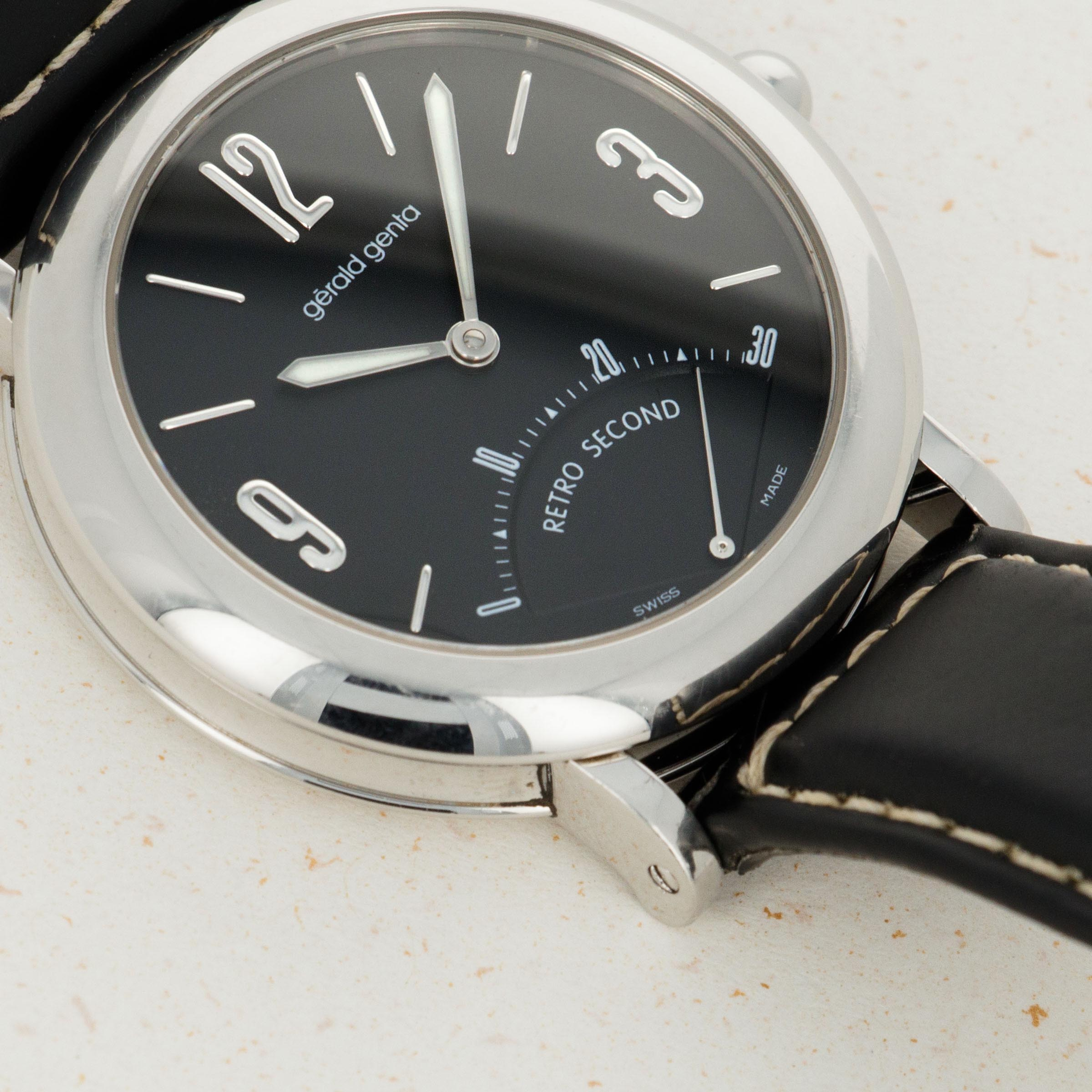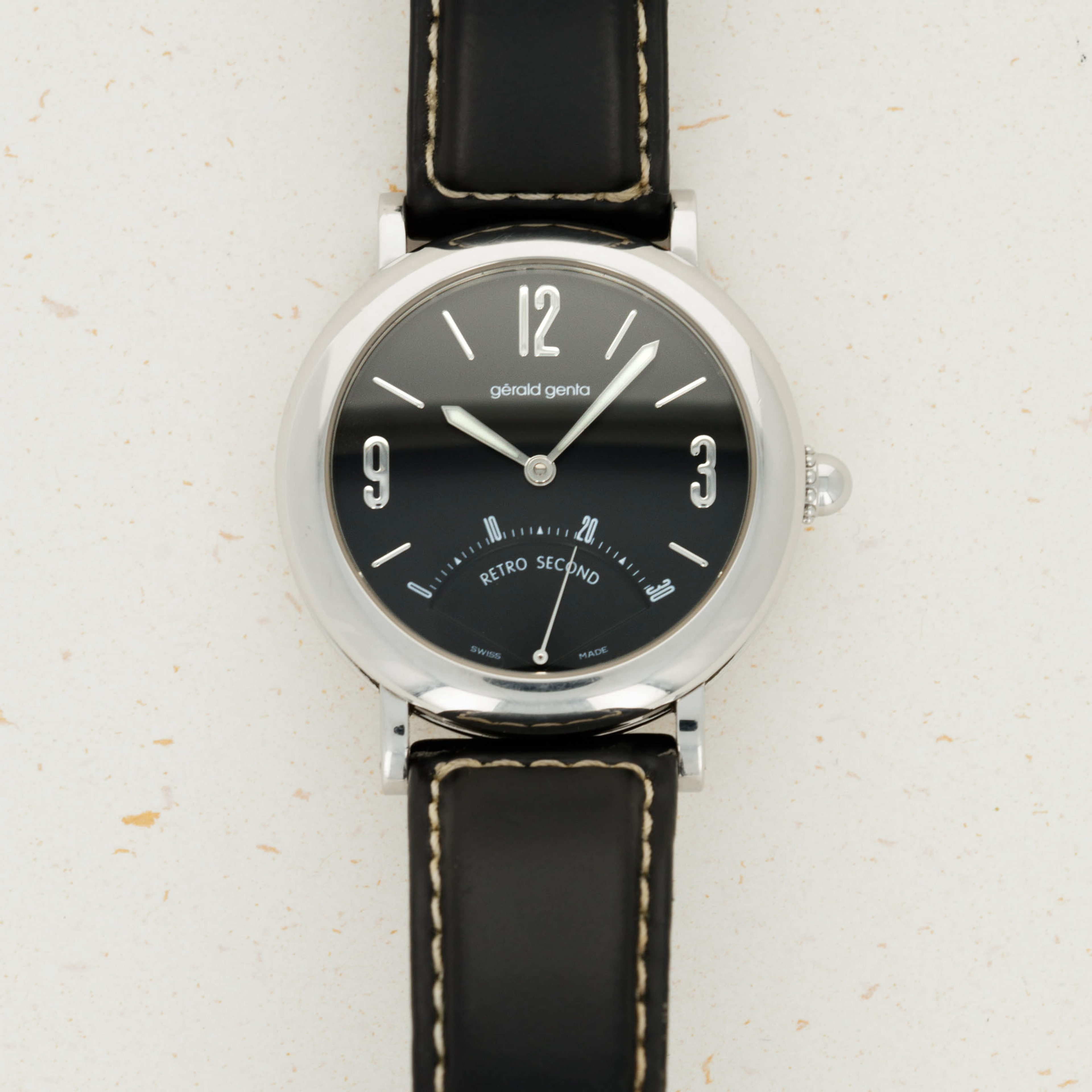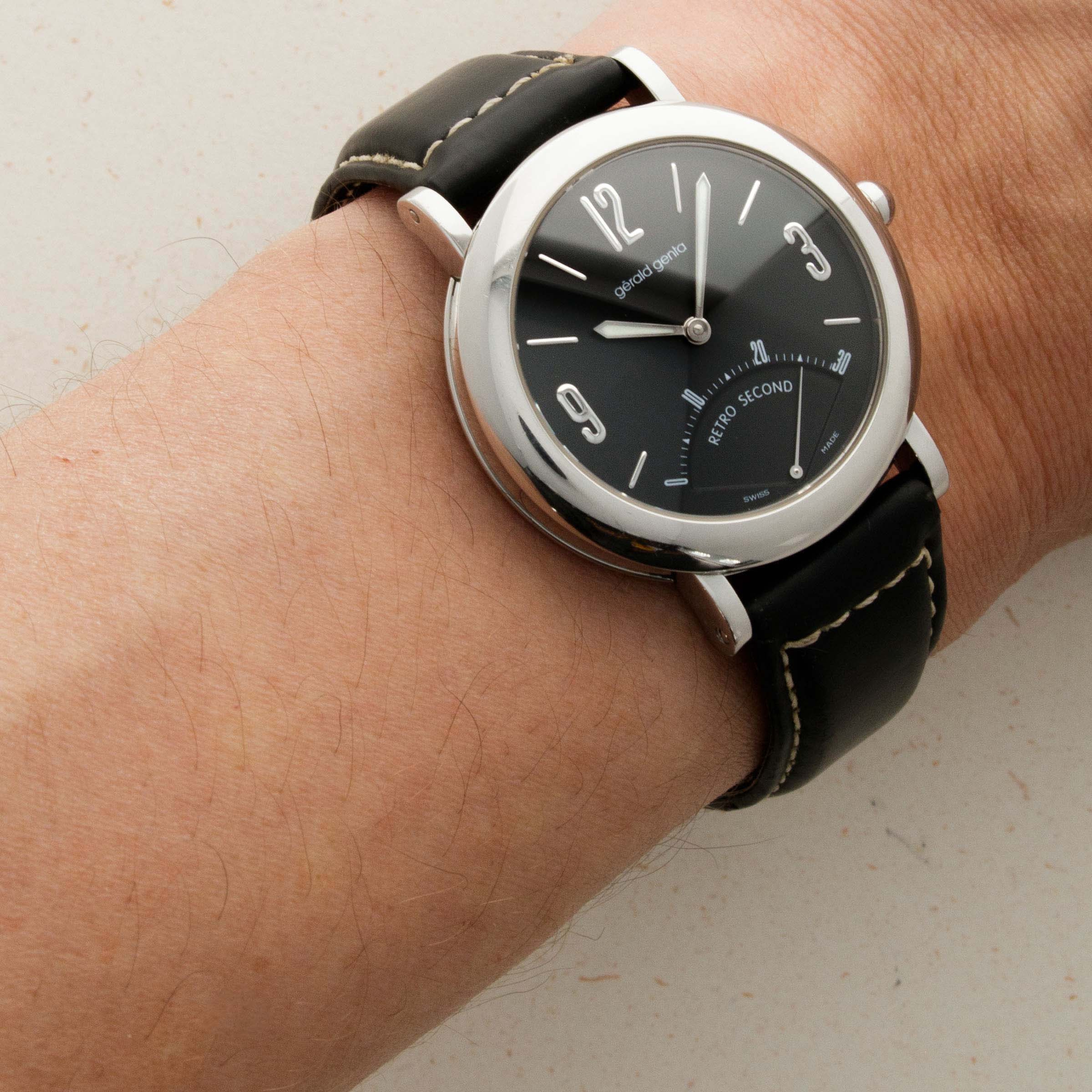 Launched in 1969, Gerald Genta, the brand, was founded by the famed eponymous watch designer best know for creating the Patek Philippe Nautilus and Audemars Piguet Royal Oak amongst countless other designs. While both of those watches were launched in the 1970s, his brand was immediately successful on account of his already growing renown in the industry. With a growing clientele of royalty such as the Moroccan King, the Sultans of both, Oman and Brunei, the King of Spain, the King of Saudi Arabia, the Queen Mother of England and several leading businessmen, sportsmen and entertainers, Gerald Genta's own timepieces quickly became sought-after pieces of horological royalty. By the 1990s one of his best-known designs was much like the Retro Seconds that we have here, a round watch with a domed case and a retrograde display. While the Gerald Genta brand would go on to be sold to Bvlgari in 2000, the brand itself still conjures a close link to its founder and all of his incredible work. An interesting watch linked to horology's most decorated designer, this timepiece is undoubtedly a must-have for any collector seeking to obtain a piece of true watchmaking history.