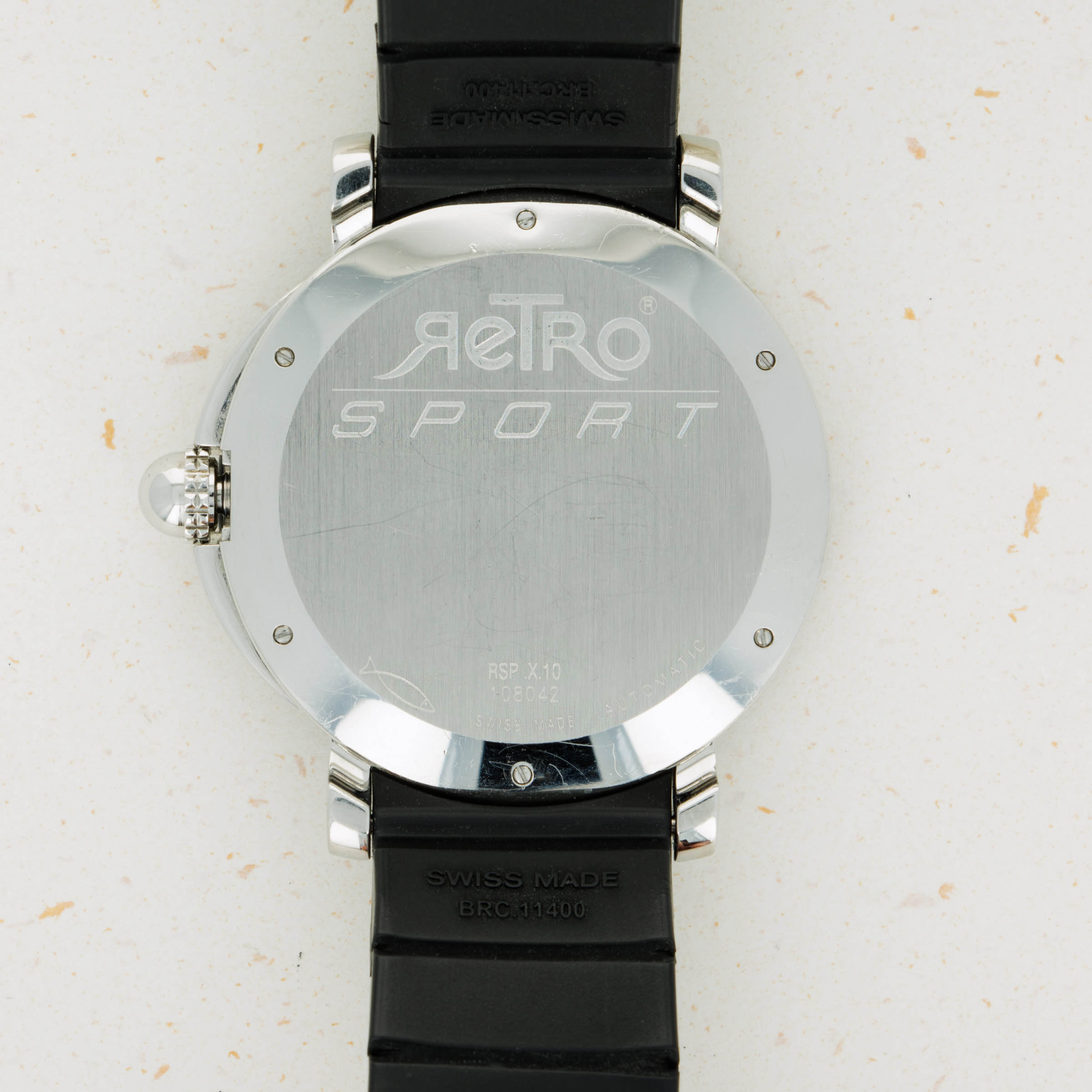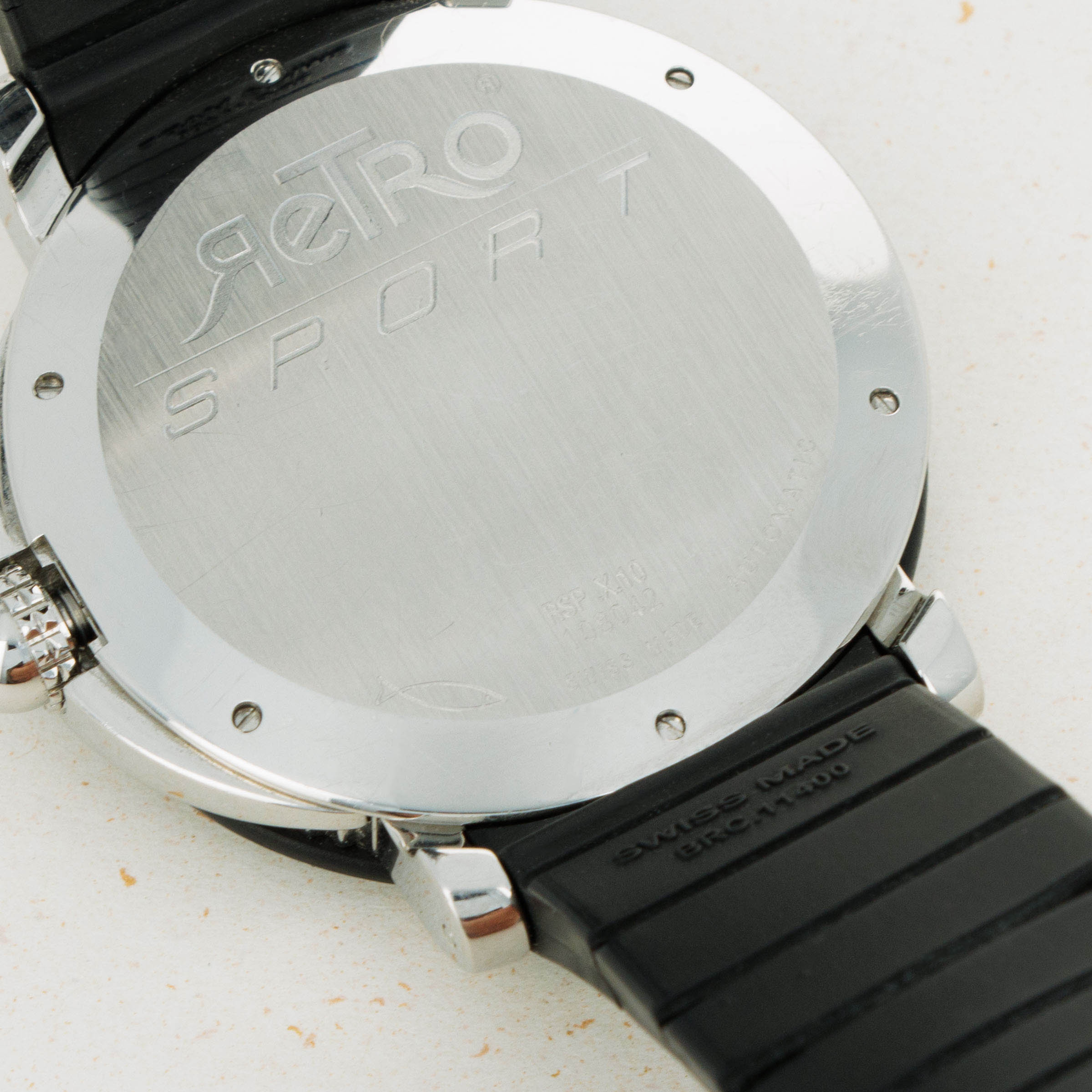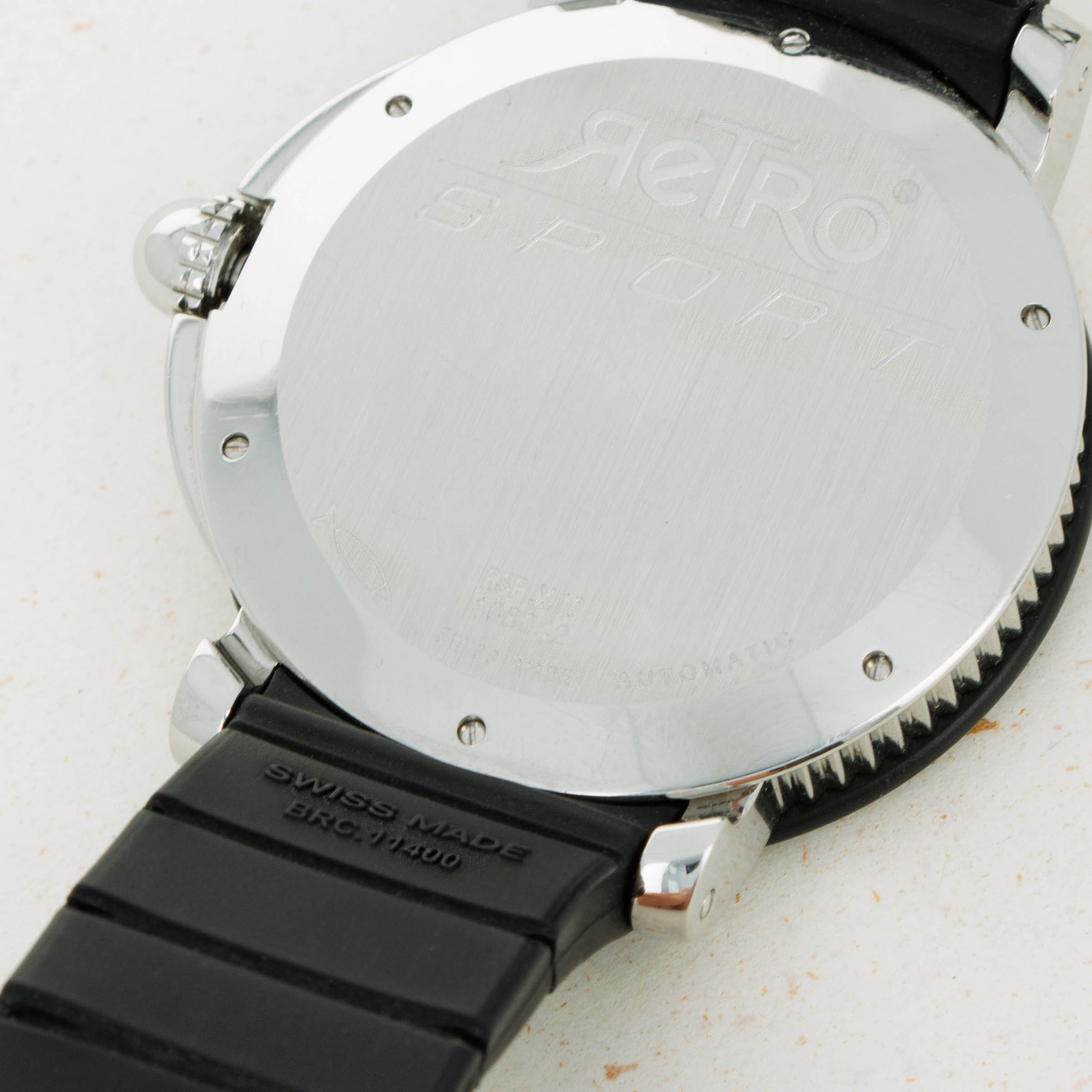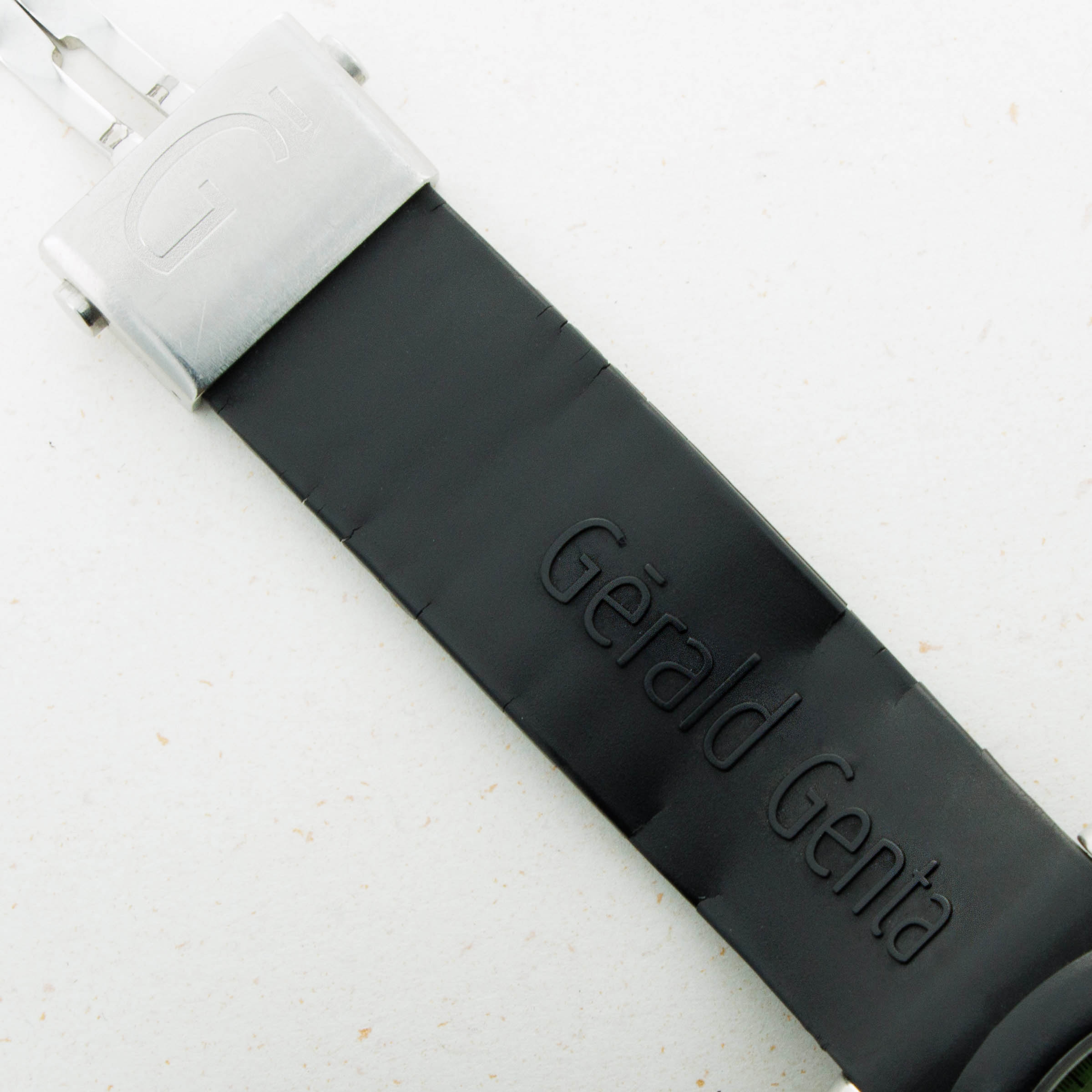 Launched in 1969, Gerald Genta, the brand, was founded by the famed eponymous watch designer best known best for creating the Patek Philippe Nautilus and Audemars Piguet Royal Oak amongst countless other watch designs. While both of those watches were launched in the 1970s, his brand was immediately successful on account of his already growing renown in the industry. With a growing clientele of royalty such as the Moroccan King, the Sultans of both, Oman and Brunei, the King of Spain, the King of Saudi Arabia, the Queen Mother of England and several leading businessmen, sportsmen and entertainers, Gerald Genta's own timepieces quickly became sought-after pieces of horological royalty. By the 1990s one of his best-known designs were round timepieces with retrograde displays and domed cases much like the Retro Sport ref. RSP.X.10.125 that we have here. Featuring a retrograde display, the Retro Sport displays the minutes in its northern hemispehere, and the hours within its jump hour display at 6 o’clock. With its black PVD bezel, stainless steel case and black rubber strap, the Retro Sport is a wonderfully capable timepiece that can handle hard wear and continue to look great while doing it. While the Gerald Genta brand was eventually sold to Bvlgari in 2000, the brand’s timepieces still conjure a close link to their famed designer and all of his other incredible work. An interesting watch linked to horology's most decorated designer, this timepiece is undoubtedly a must-have for any collector seeking to obtain a unique piece of true watchmaking history.