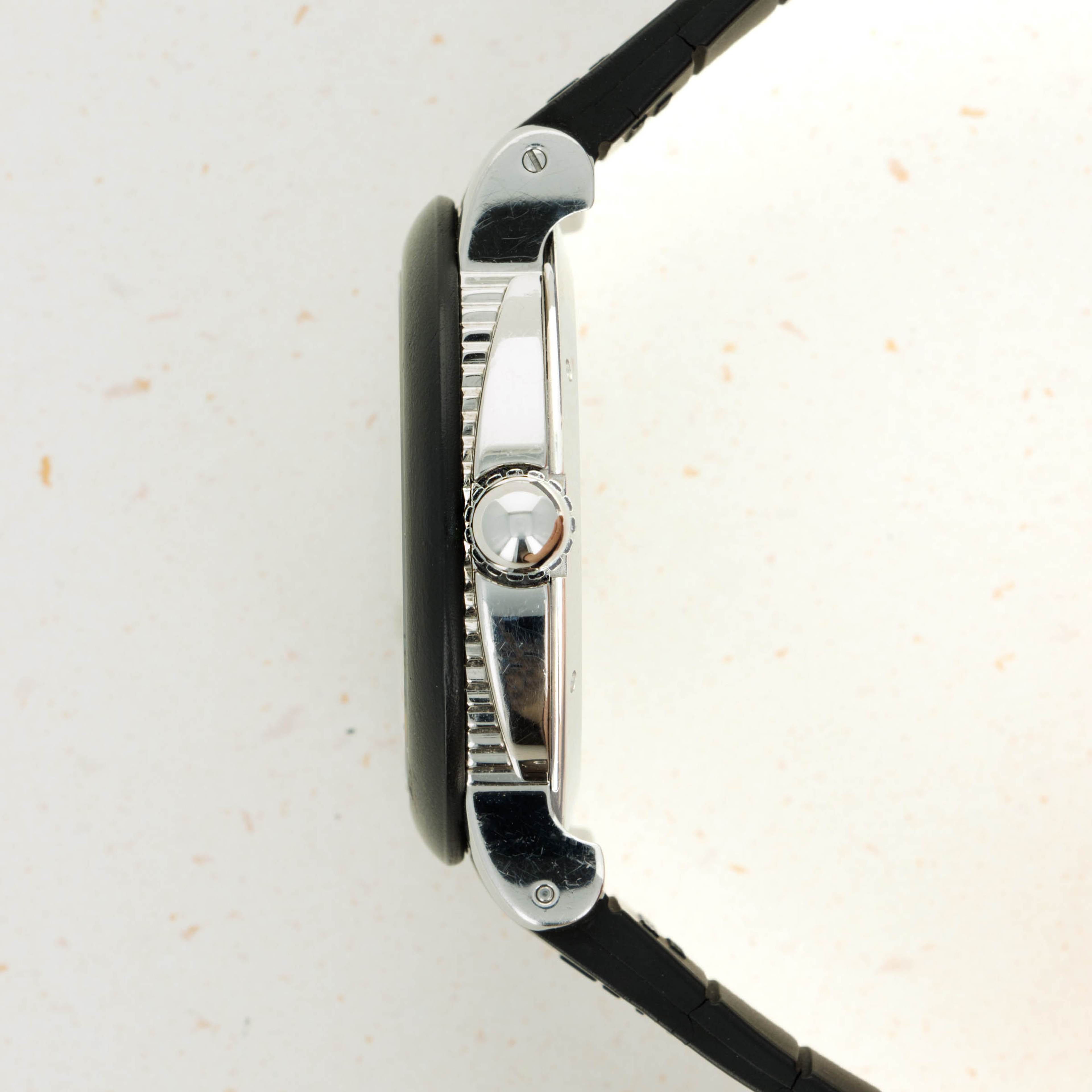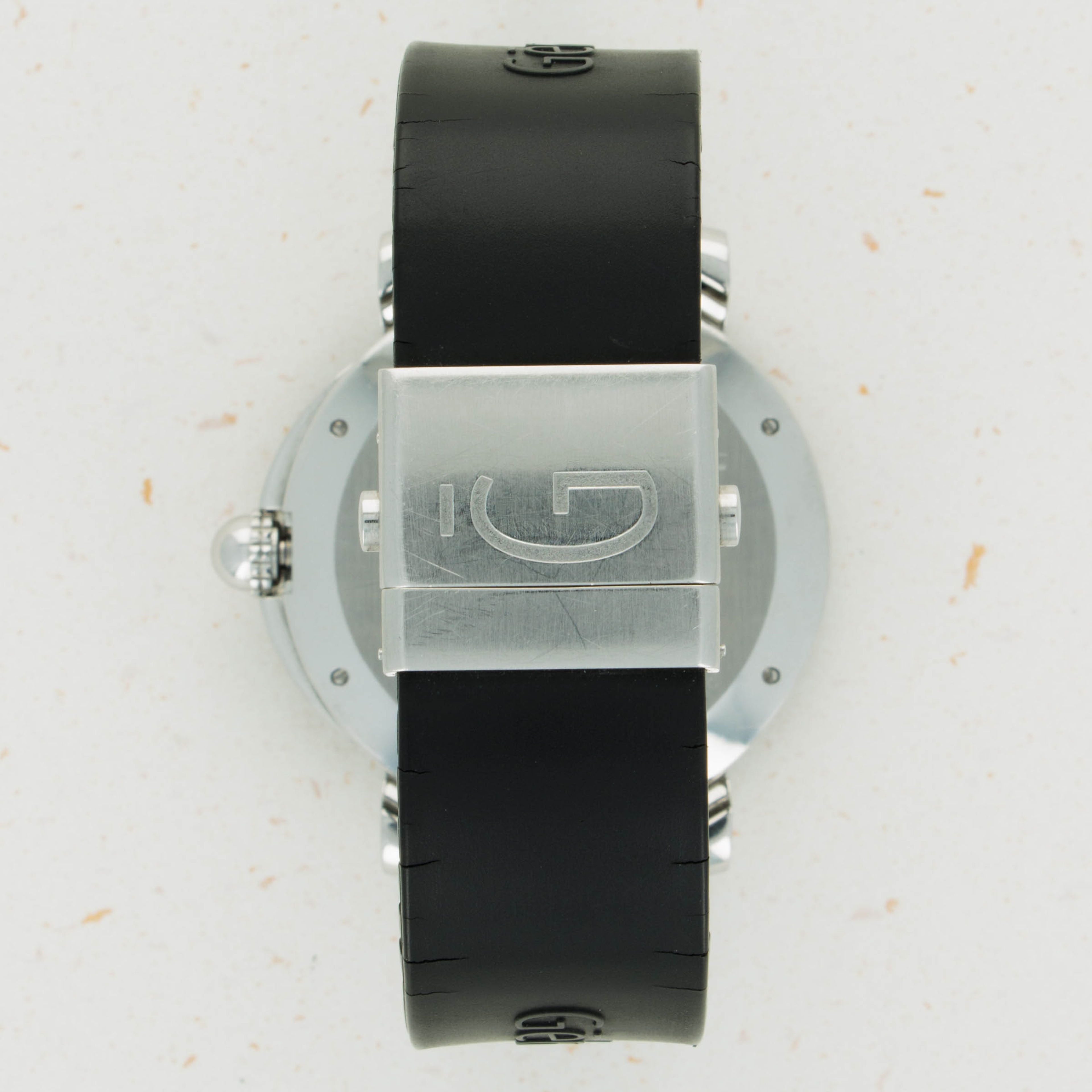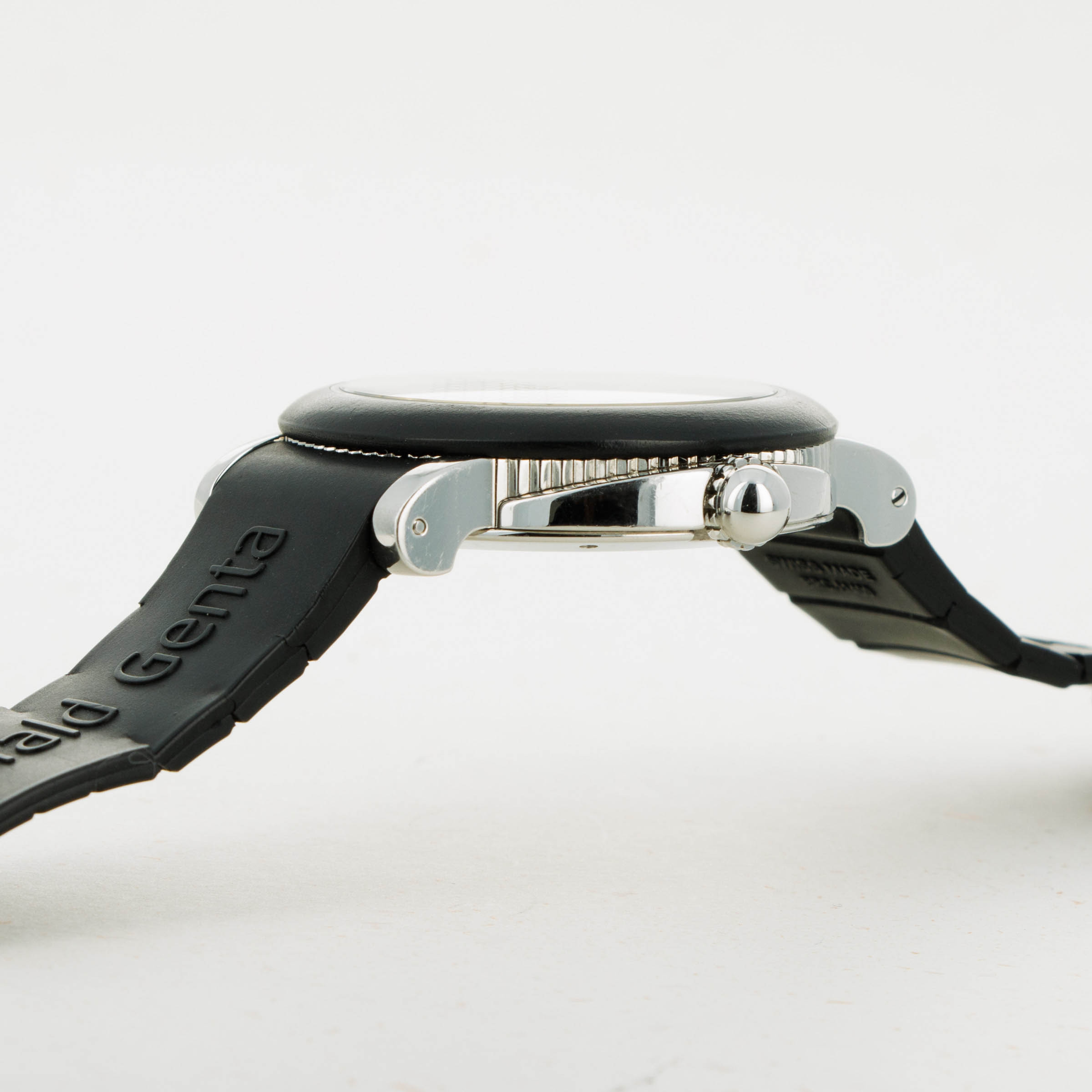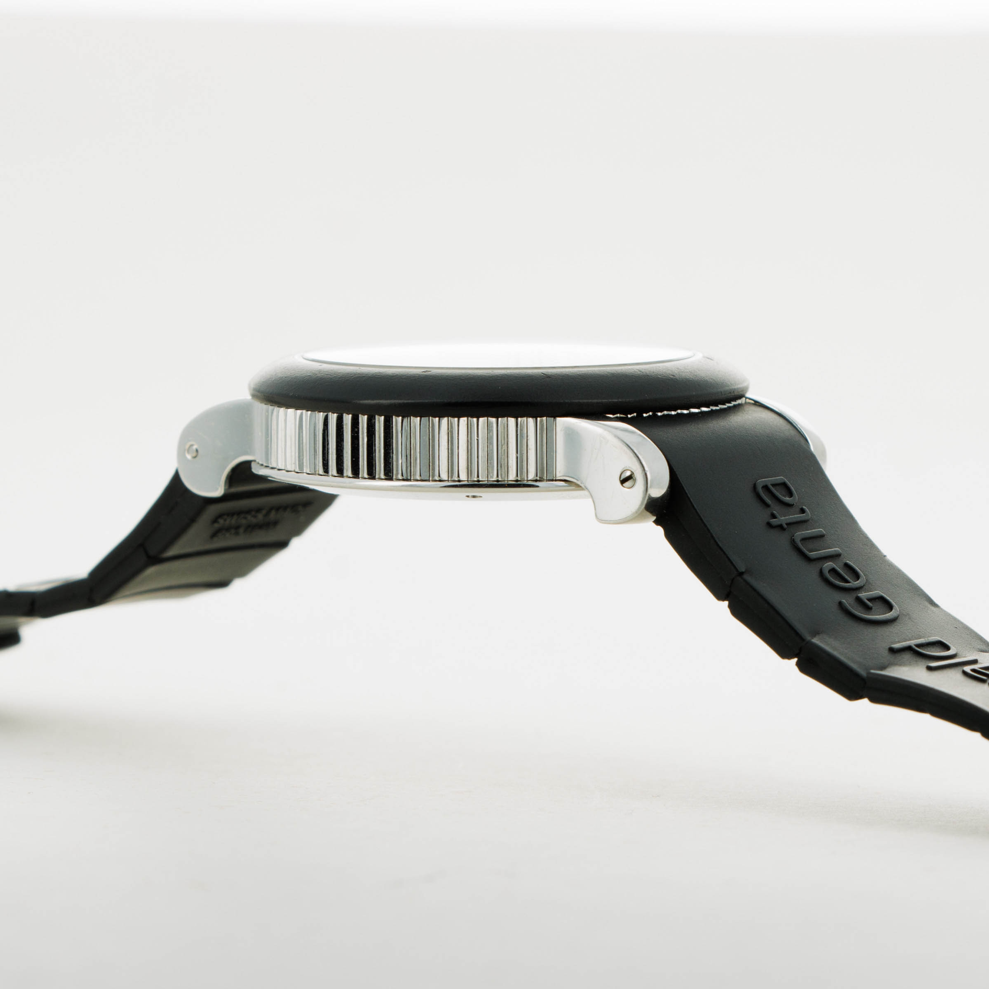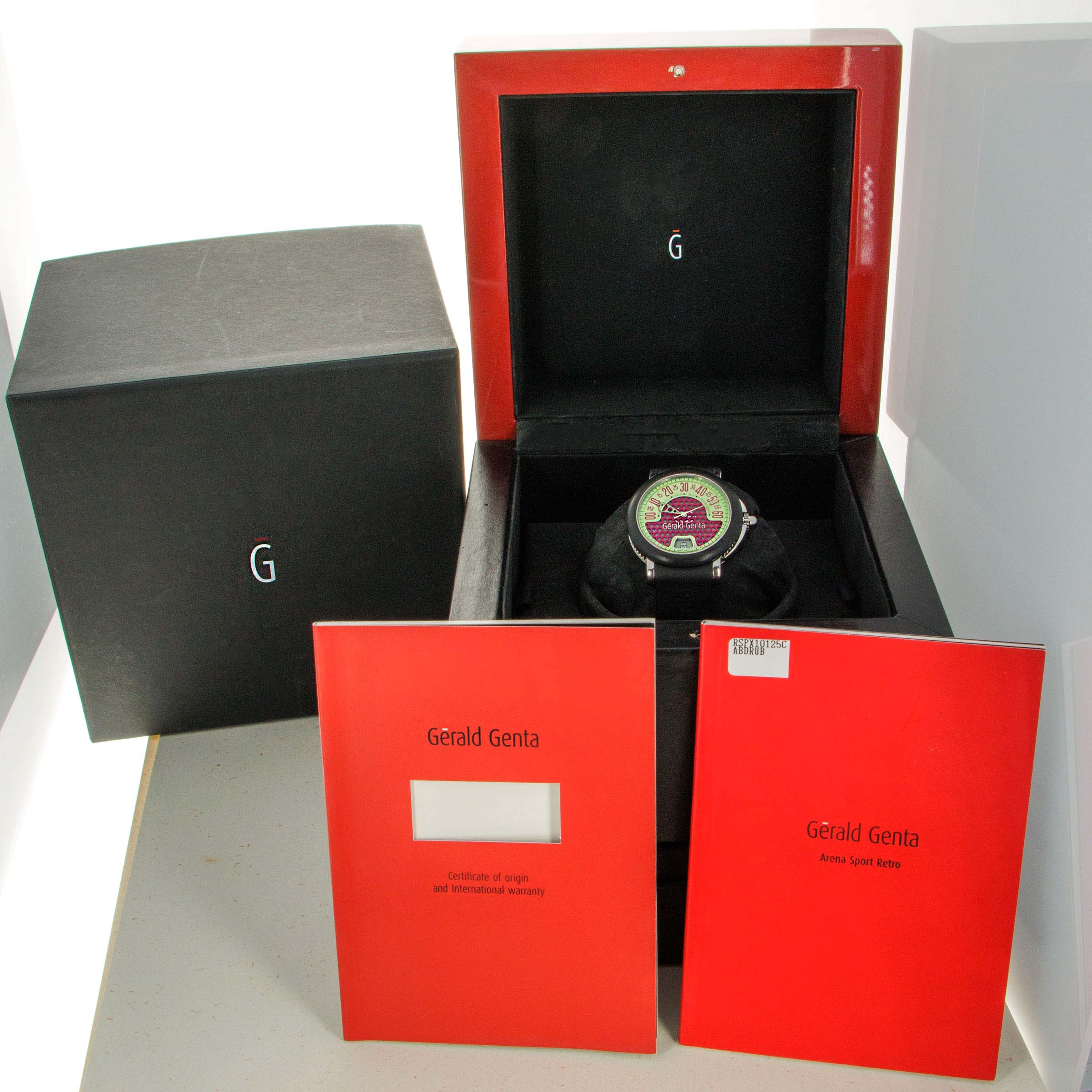 Launched in 1969, Gerald Genta, the brand, was founded by the famed eponymous watch designer best known best for creating the Patek Philippe Nautilus and Audemars Piguet Royal Oak amongst countless other watch designs. While both of those watches were launched in the 1970s, his brand was immediately successful on account of his already growing renown in the industry. With a growing clientele of royalty such as the Moroccan King, the Sultans of both, Oman and Brunei, the King of Spain, the King of Saudi Arabia, the Queen Mother of England and several leading businessmen, sportsmen and entertainers, Gerald Genta's own timepieces quickly became sought-after pieces of horological royalty. By the 1990s one of his best-known designs were round timepieces with retrograde displays and domed cases much like the Retro Sport ref. RSP.X.10.125 that we have here. Featuring a retrograde display, the Retro Sport displays the minutes in its northern hemispehere, and the hours within its jump hour display at 6 o’clock. With its black PVD bezel, stainless steel case and black rubber strap, the Retro Sport is a wonderfully capable timepiece that can handle hard wear and continue to look great while doing it. While the Gerald Genta brand was eventually sold to Bvlgari in 2000, the brand’s timepieces still conjure a close link to their famed designer and all of his other incredible work. An interesting watch linked to horology's most decorated designer, this timepiece is undoubtedly a must-have for any collector seeking to obtain a unique piece of true watchmaking history.