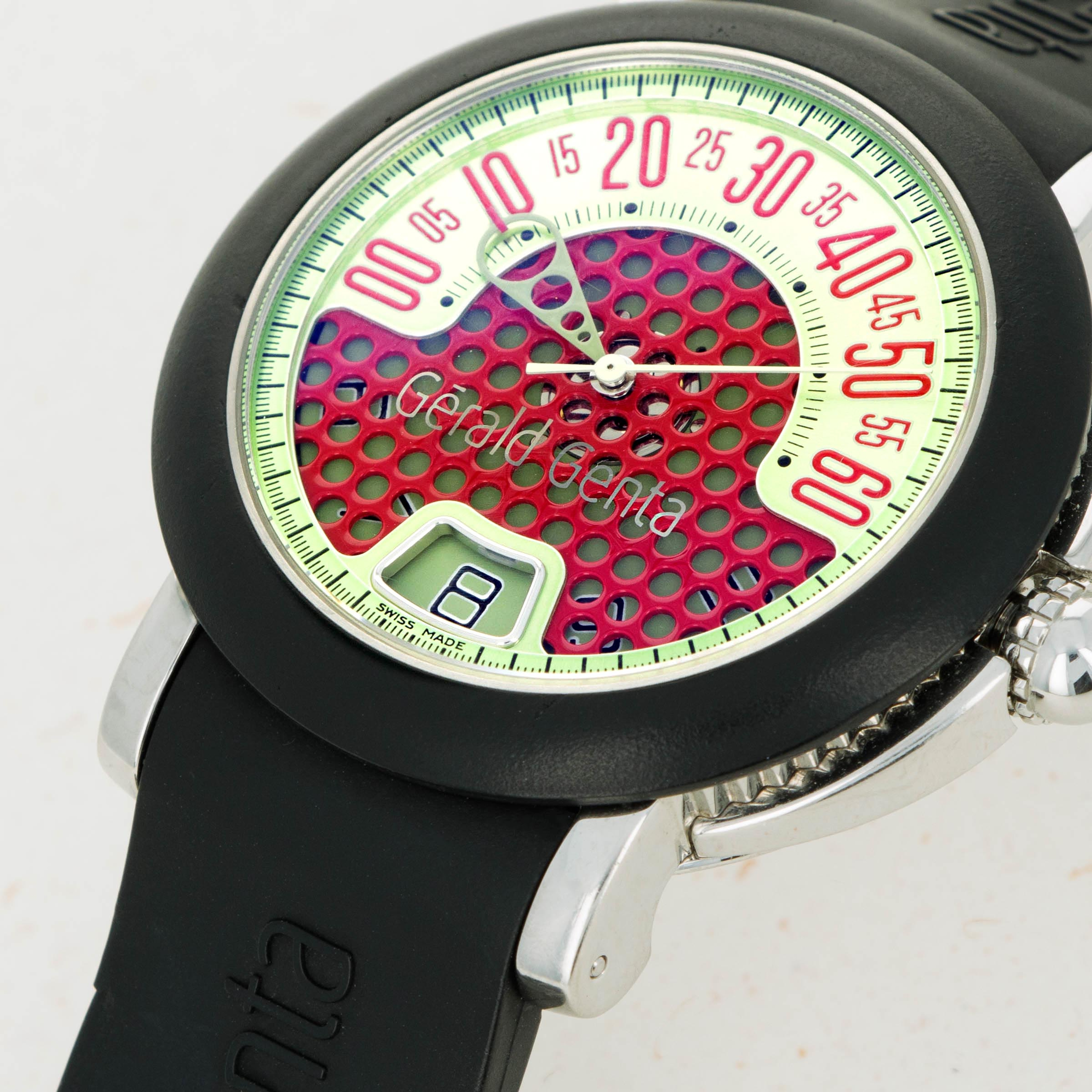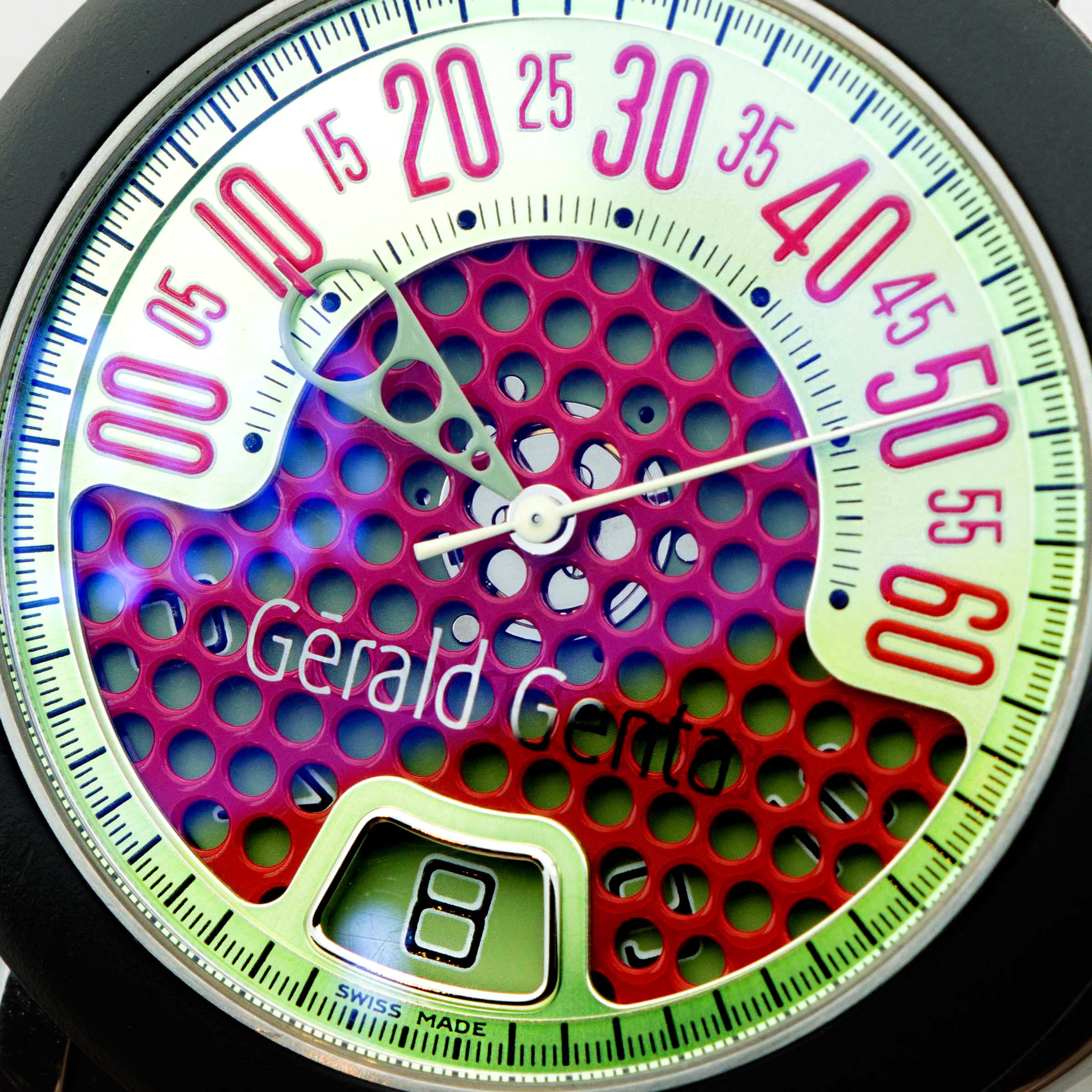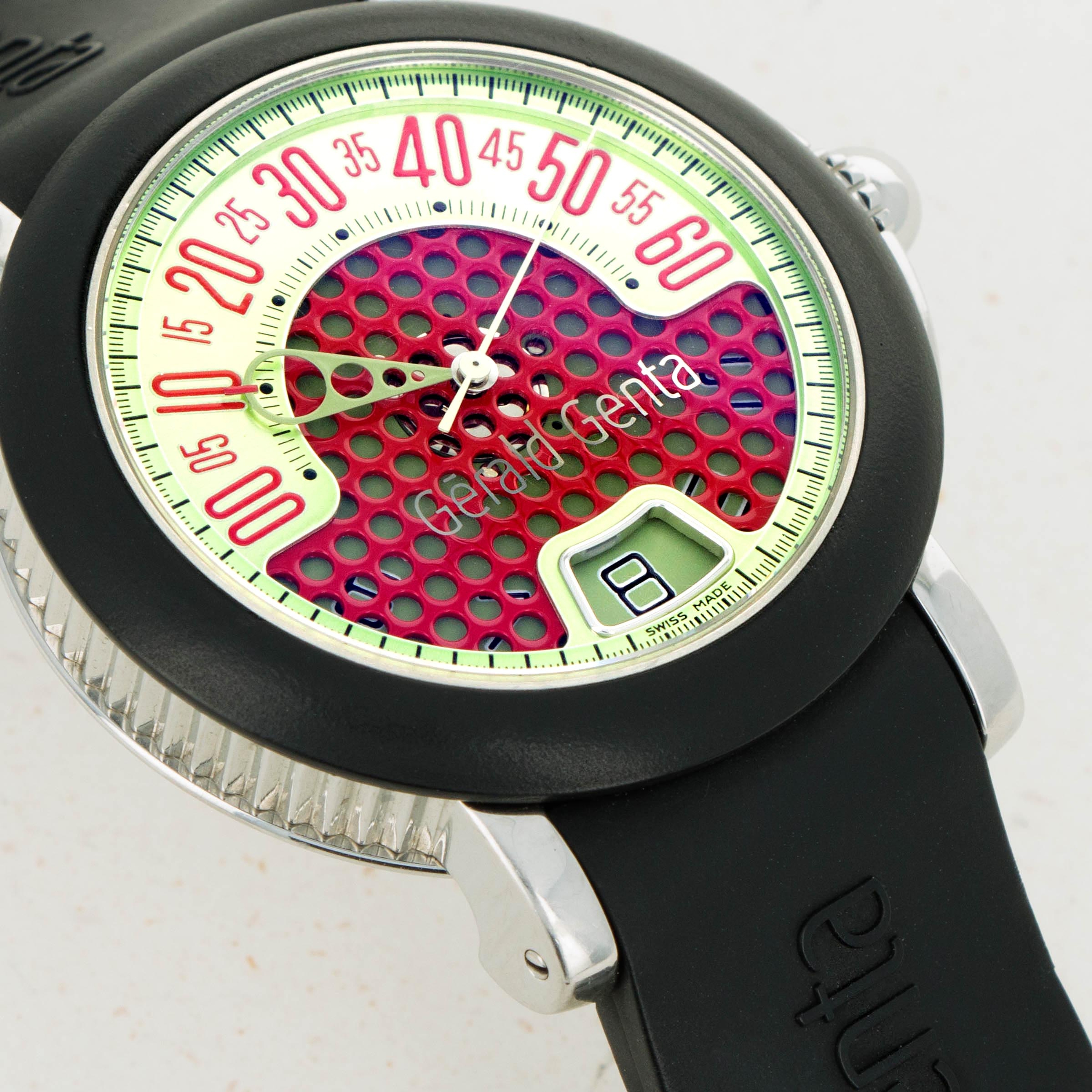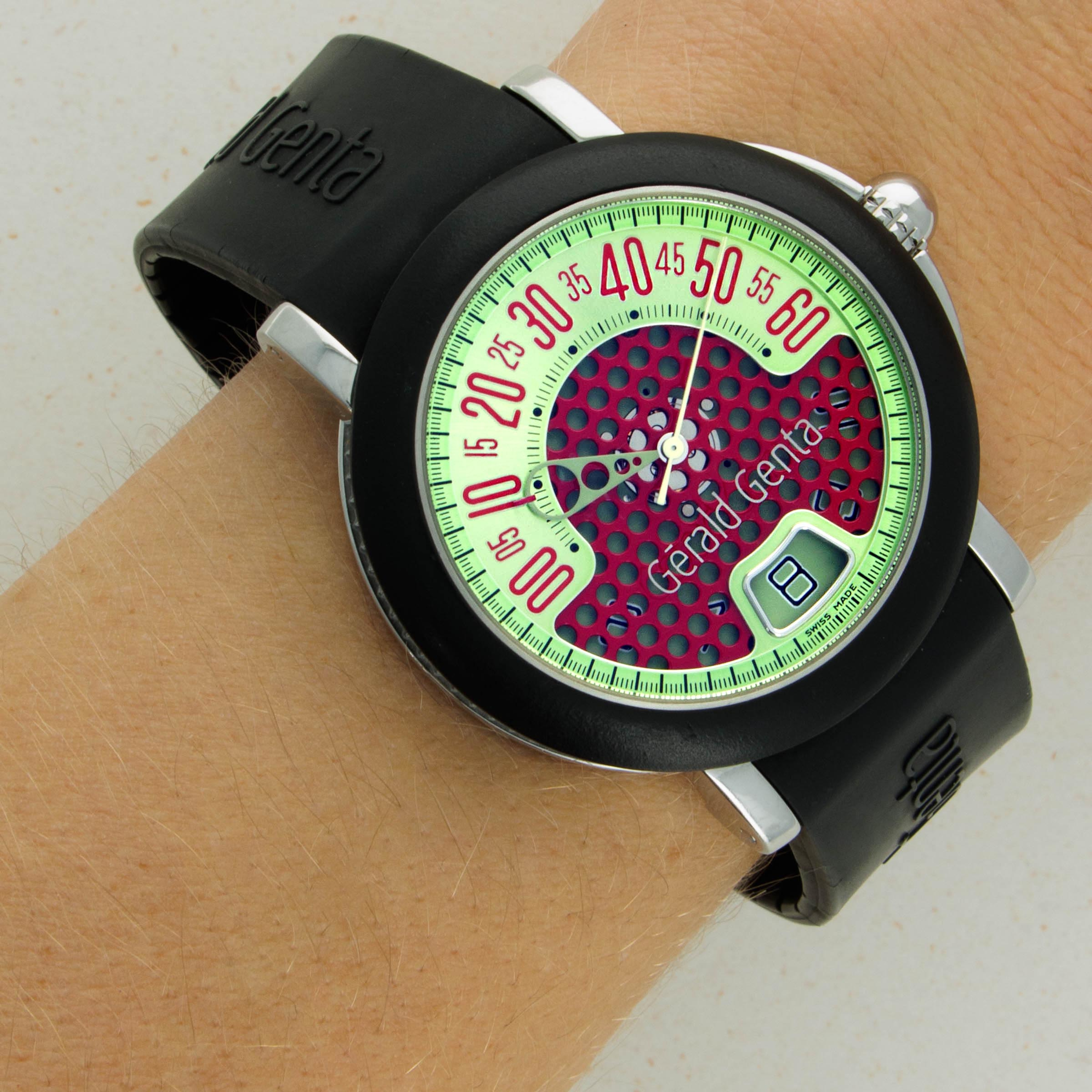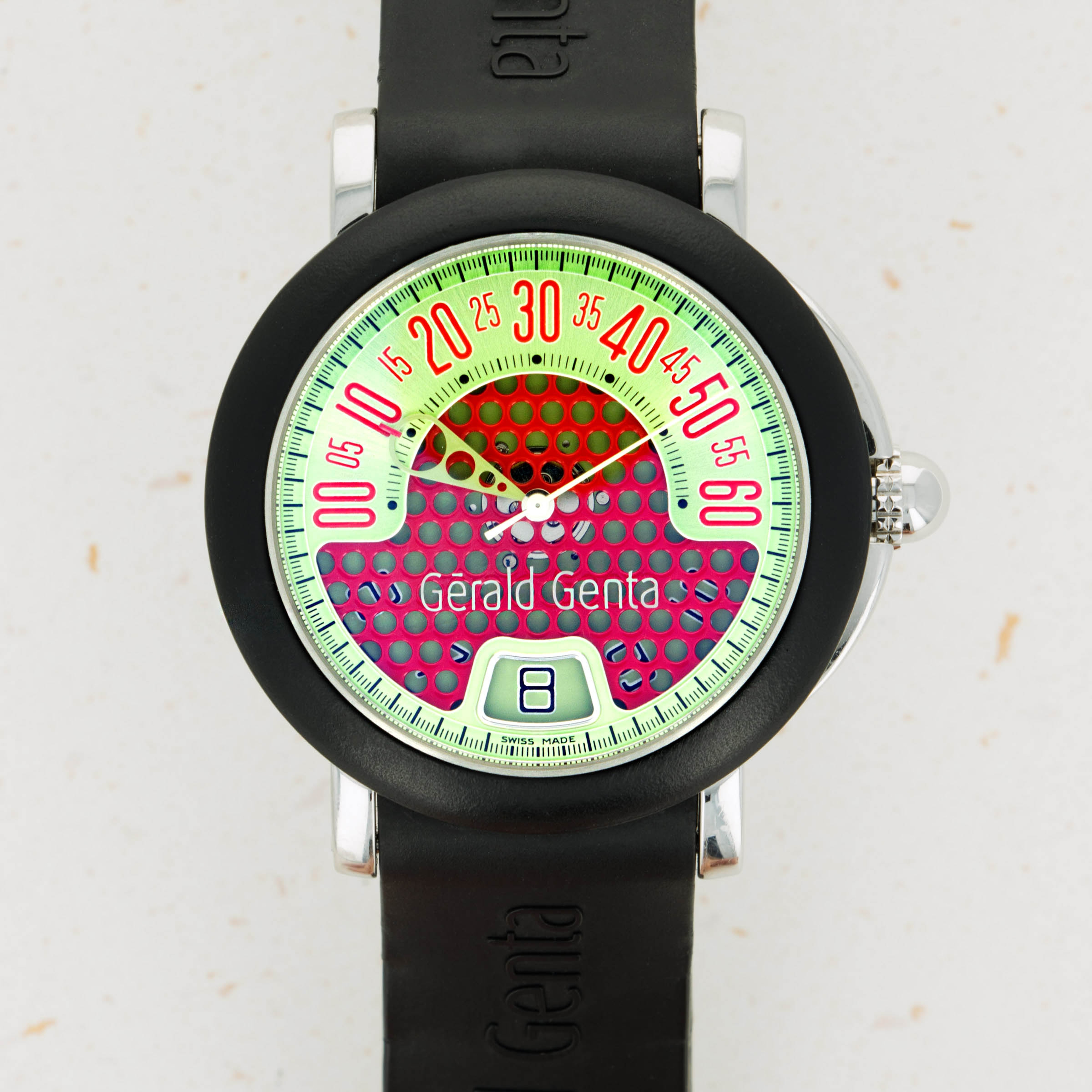Unapologetically "Genta" in its design, the Retro Sport's circular stainless steel and PVD case and retrograde display leave no uncertainty as to the designer of this incredibly unique timepiece.