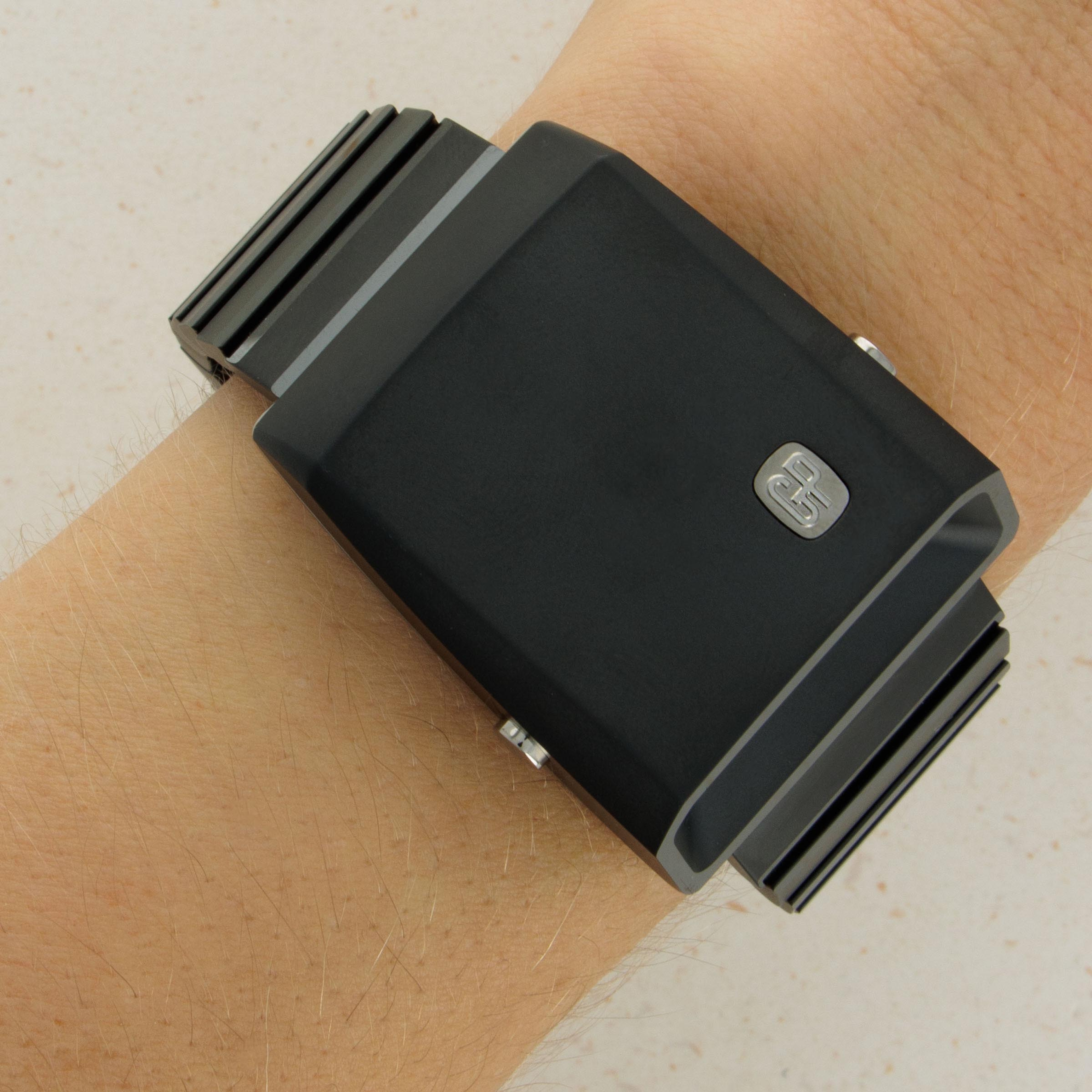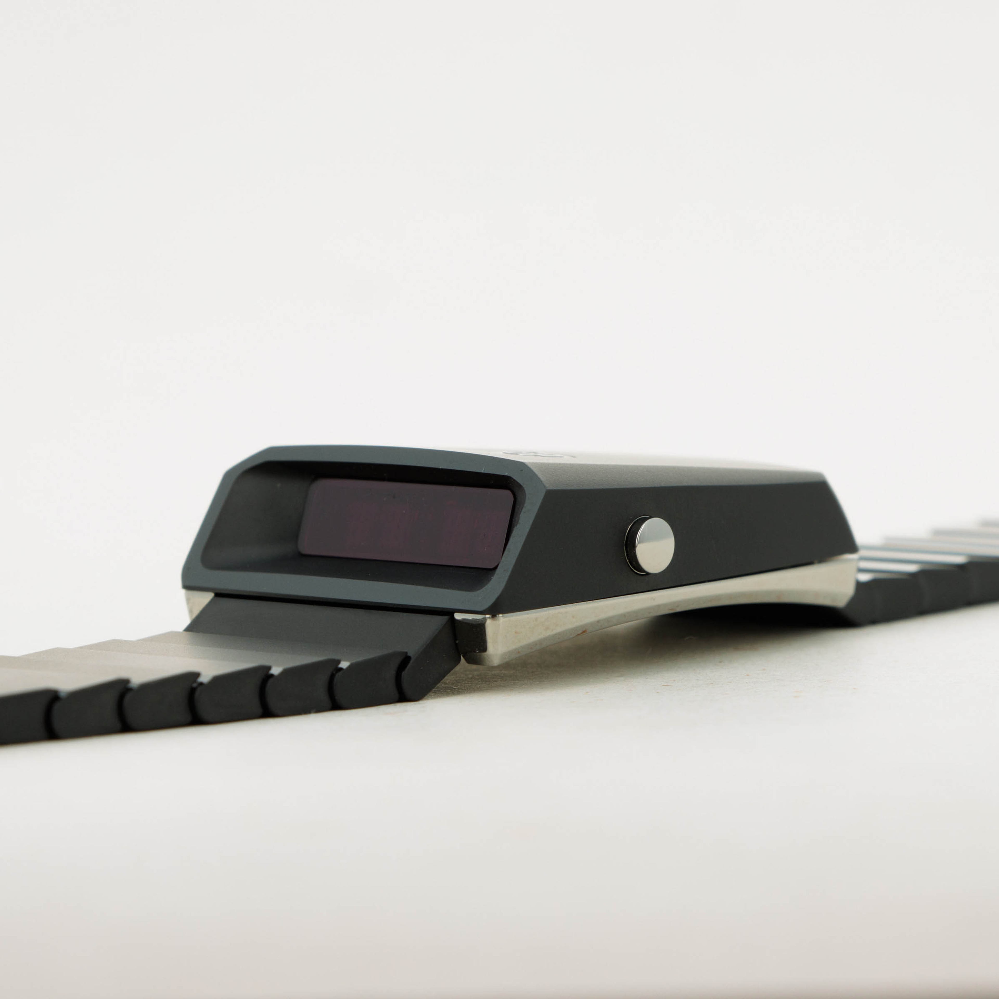 Inspired by the original Casquette with its LED digital display, the Casquette 2.0's digital display is found just above where its bracelet attaches to its uniquely shaped case.