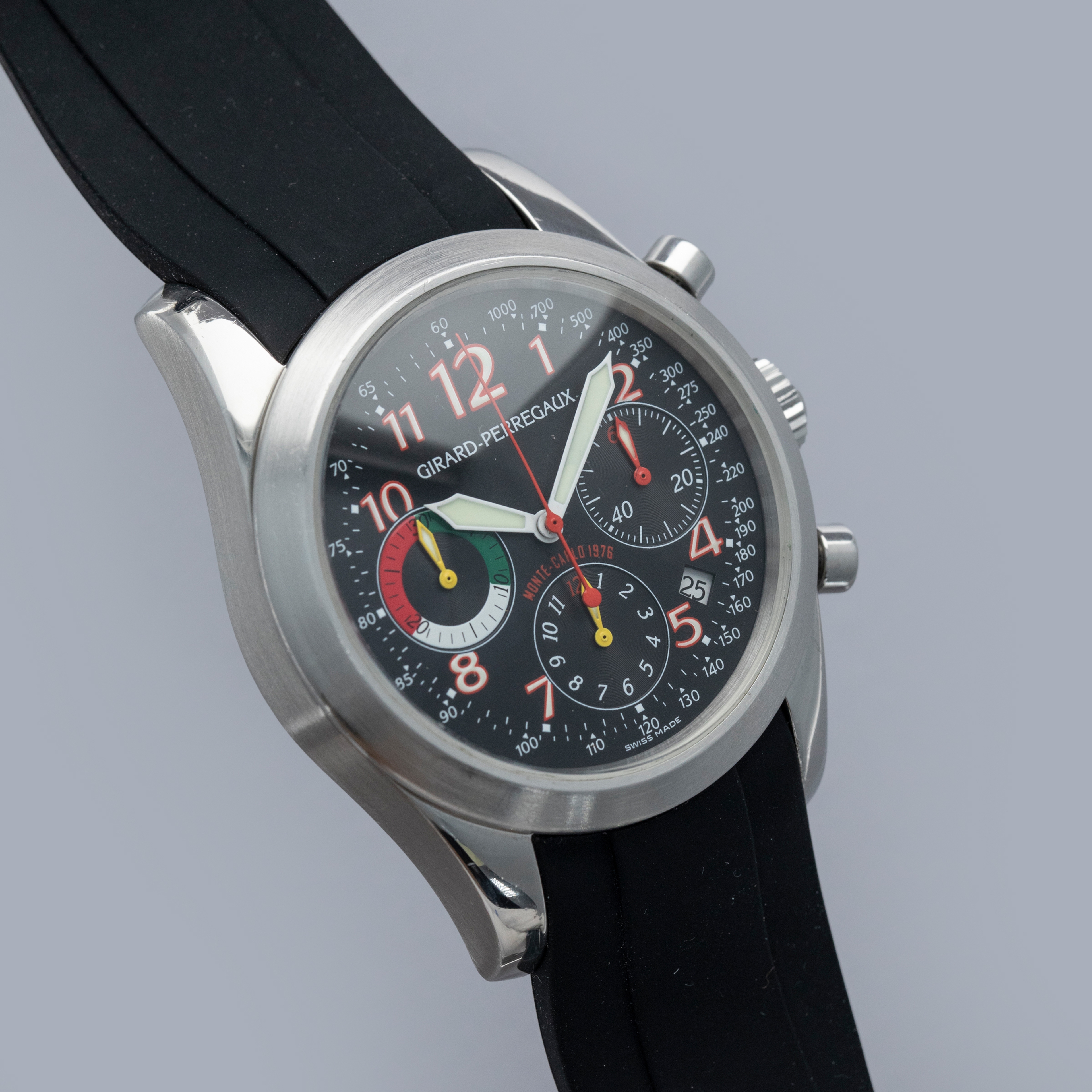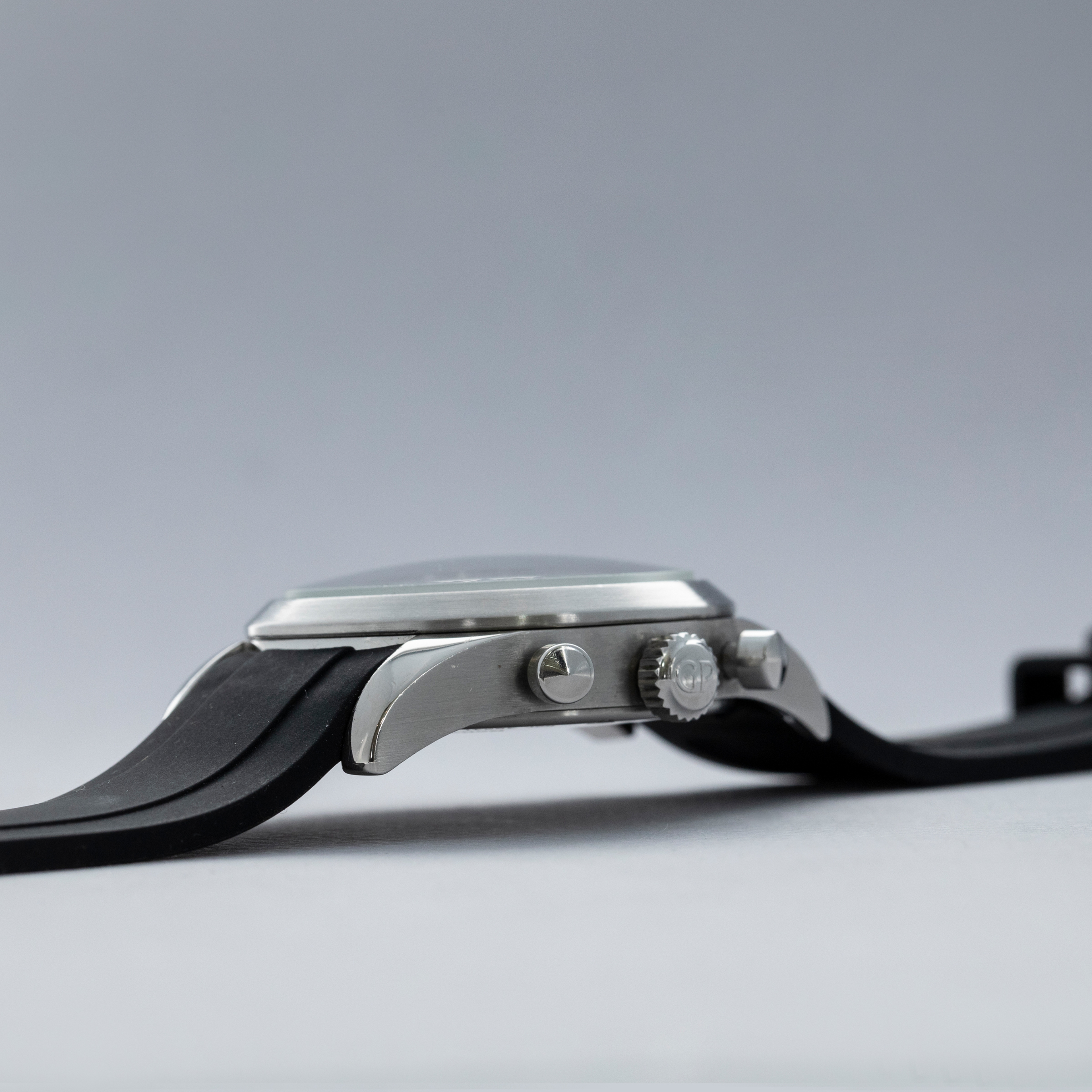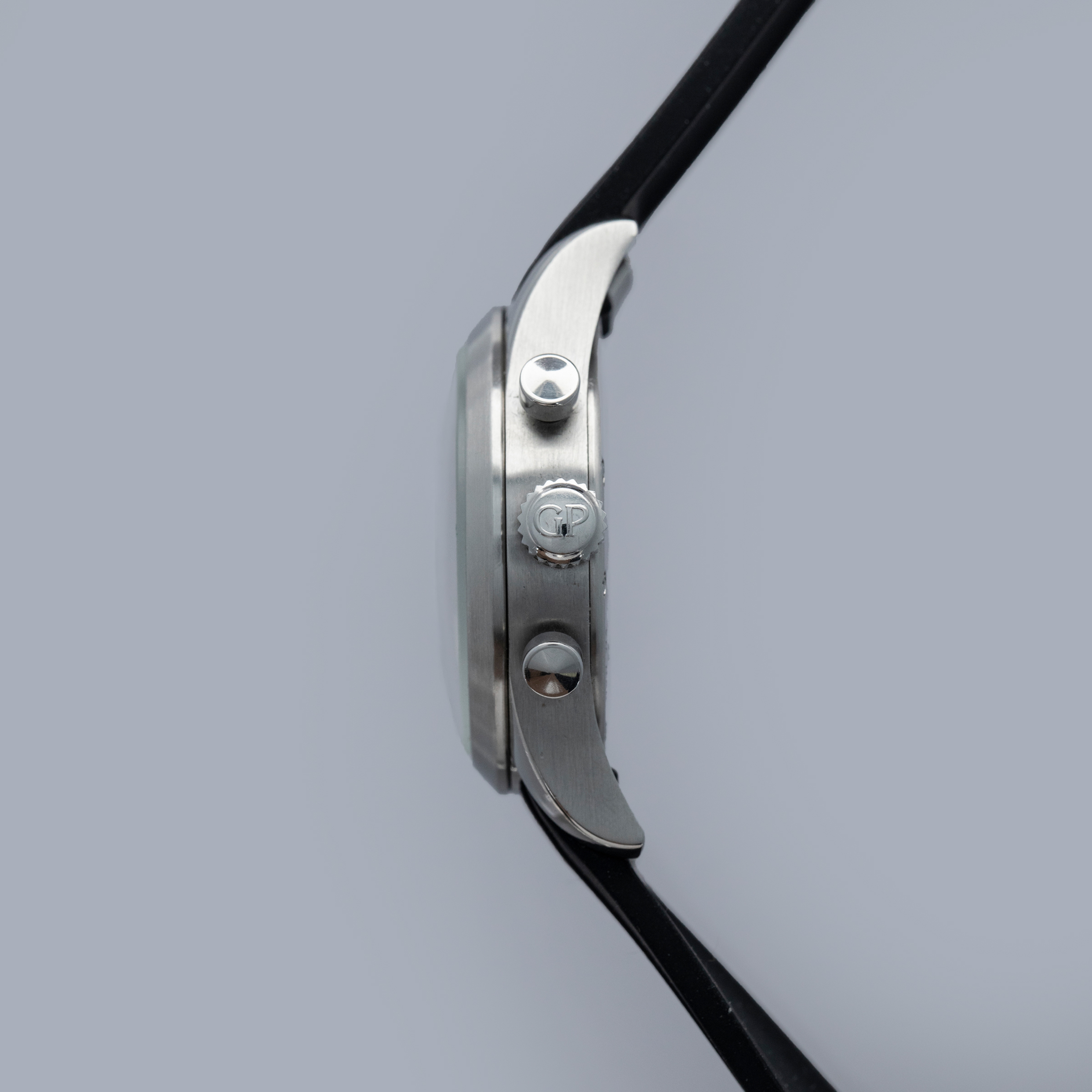 Watch is in overall excellent condition. The steel case has some light scratches on the polished sections and a couple of scuffs on the brushed bezel. The case back has some light scratches and some wear to the screw heads, but the engravings remain well defined. The dial and hands are in excellent condition. Fitted with a black rubber strap with a GP steel deployant clasp in excellent condition. Comes with a full box set and papers.