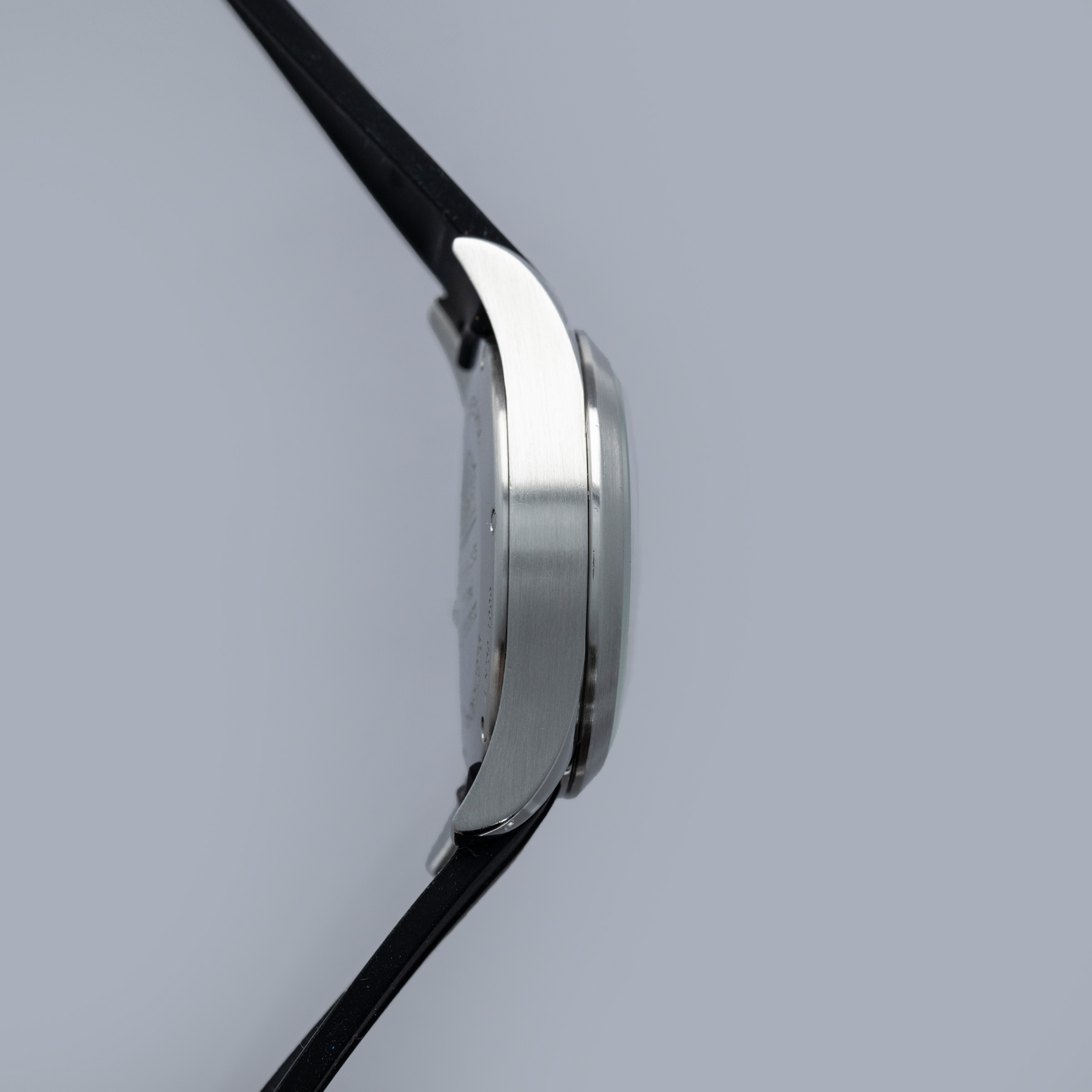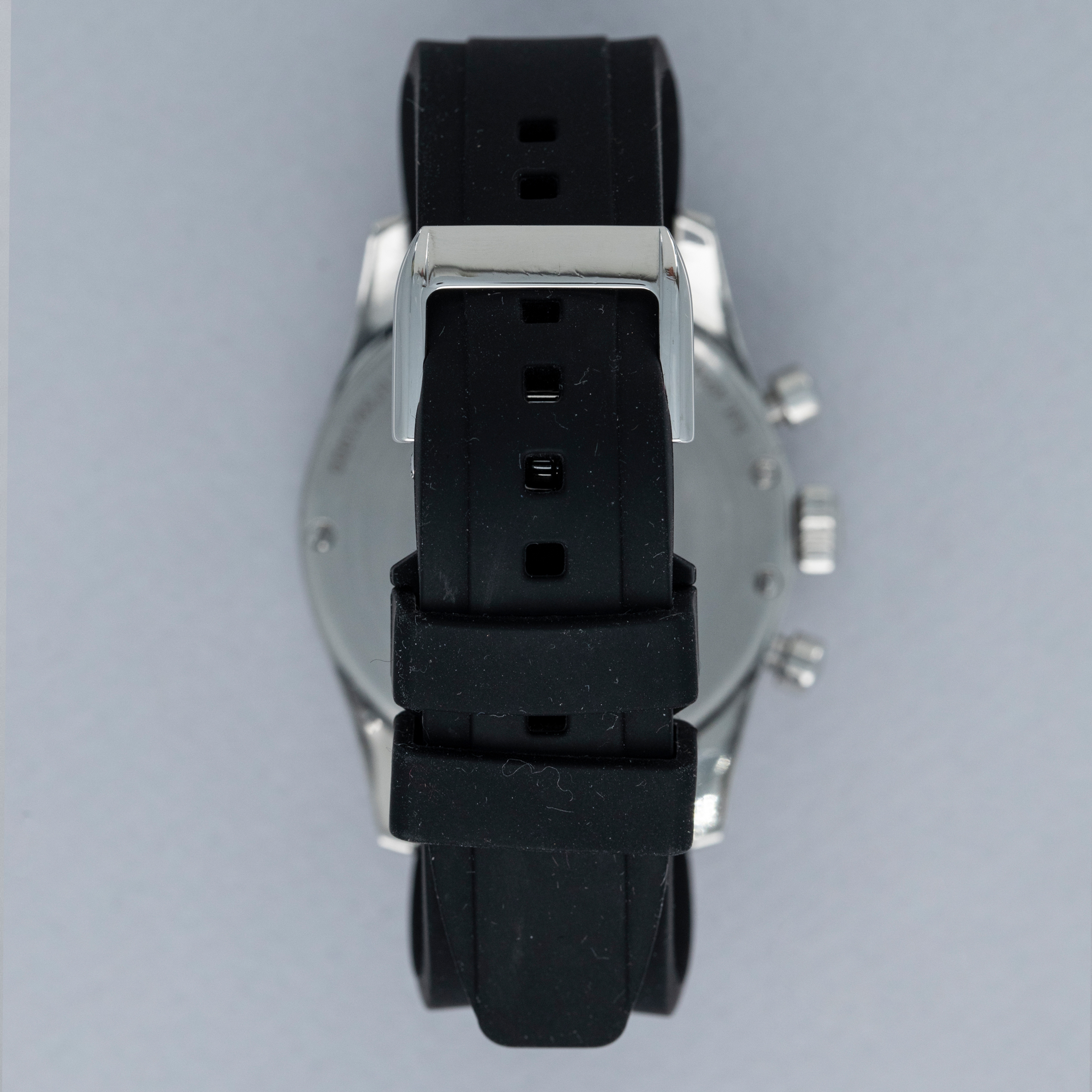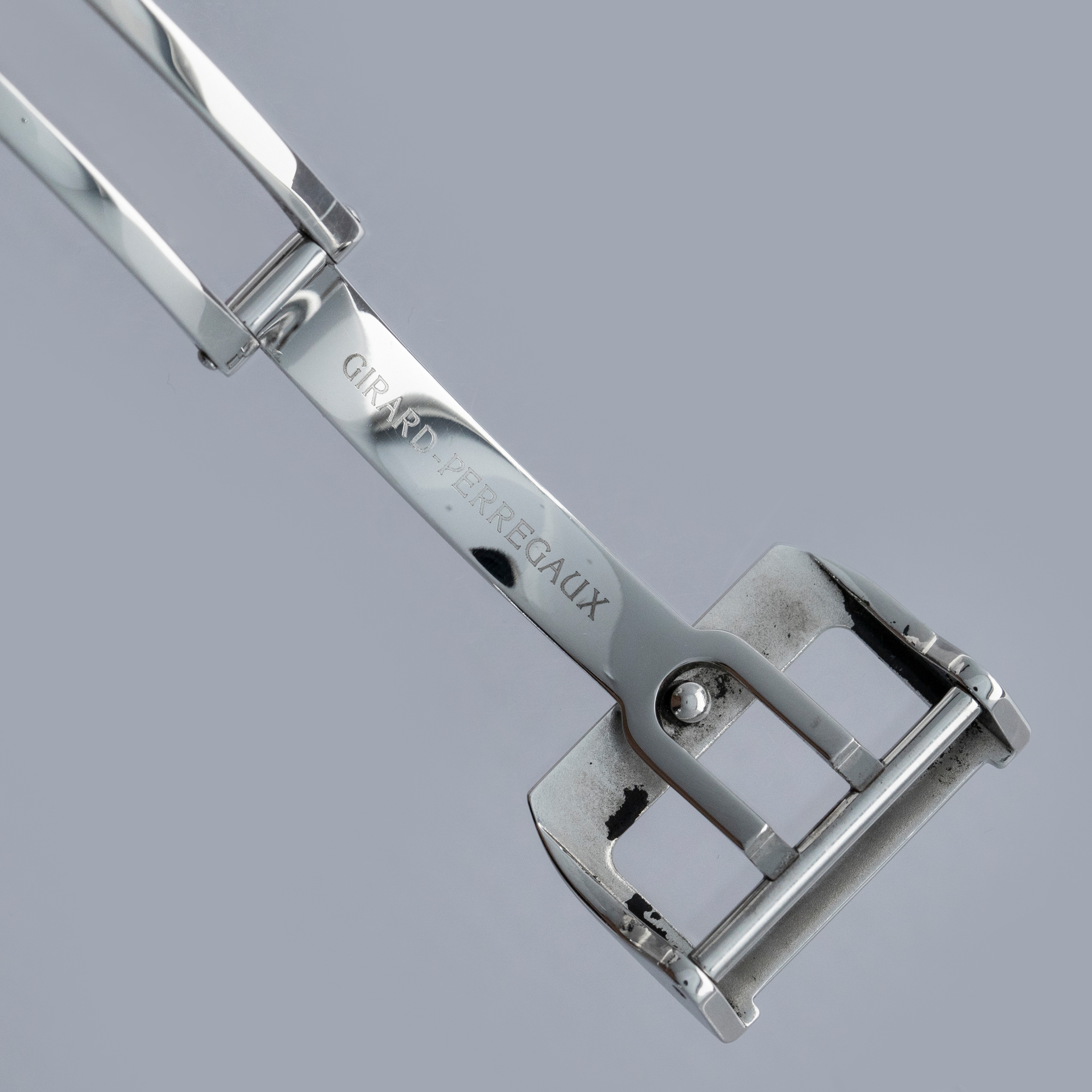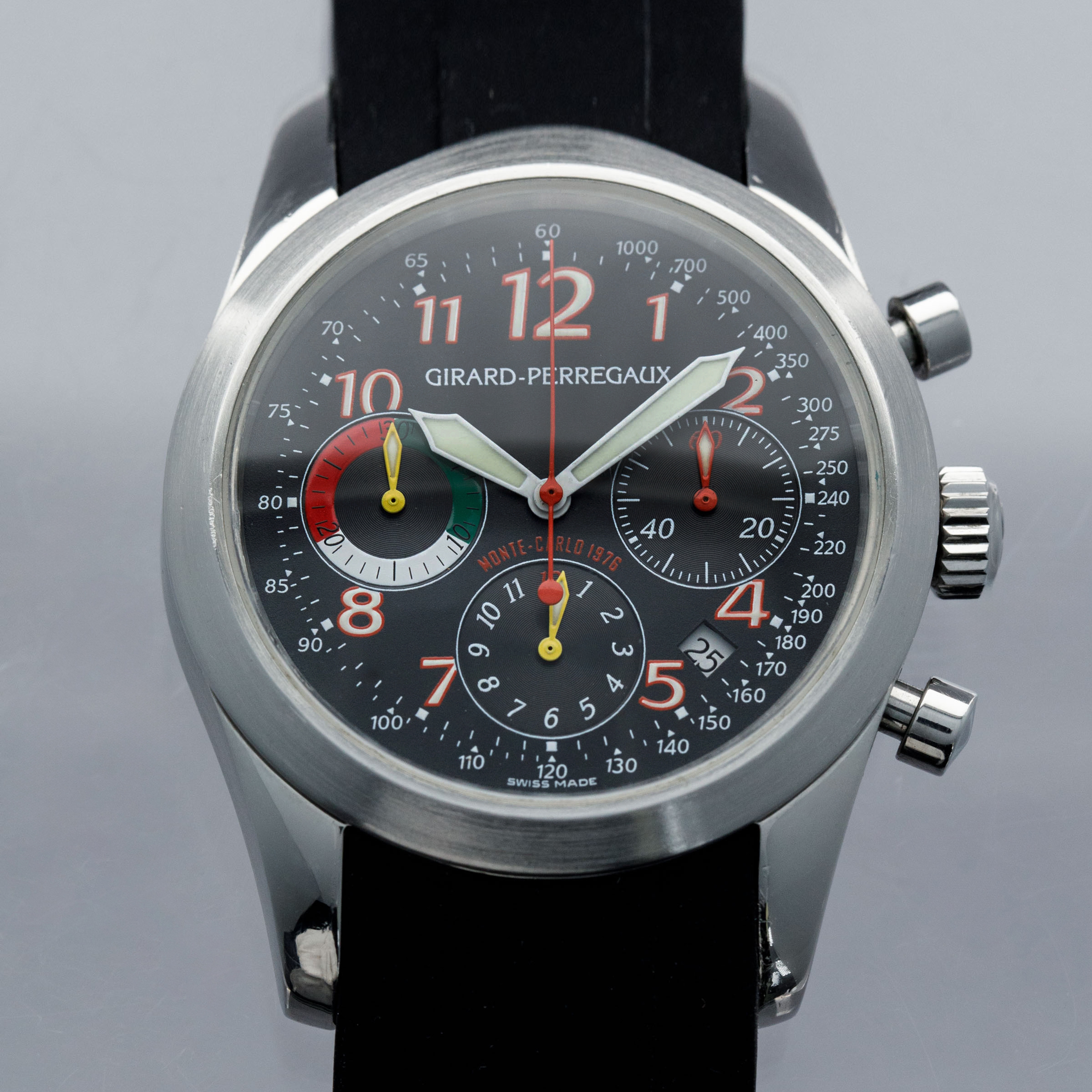 Watch is in overall excellent condition. The steel case has some light scratches on the polished sections and a couple of scuffs on the brushed bezel. The case back has some light scratches and some wear to the screw heads, but the engravings remain well defined. The dial and hands are in excellent condition. Fitted with a black rubber strap with a GP steel deployant clasp in excellent condition. Comes with a full box set and papers.