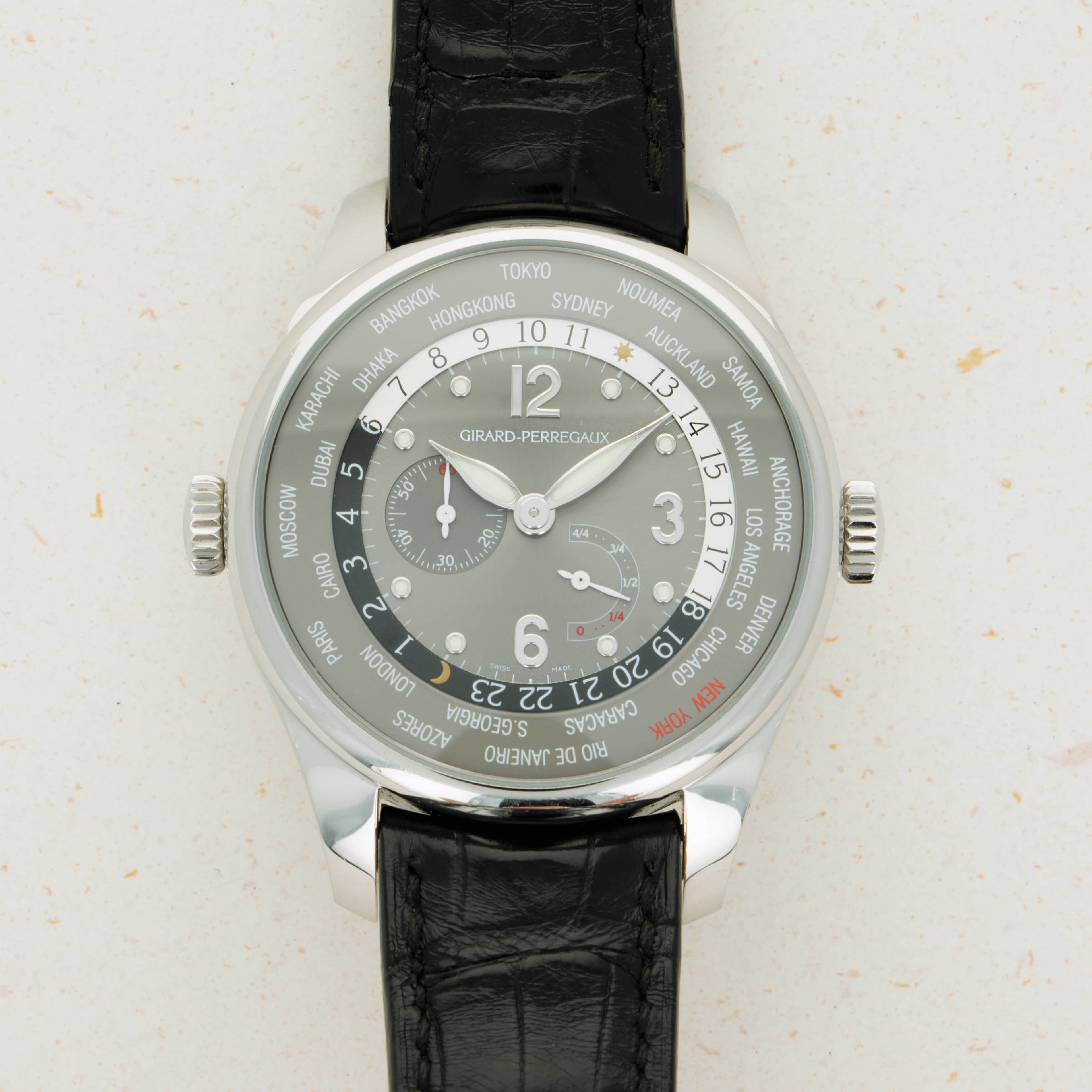 Featuring a stunning grey dial, the New York edition of the ref. 49851 uses a red inscription to distinguish its eponymous city from the rest of the 23 cities that span across its chapter ring.