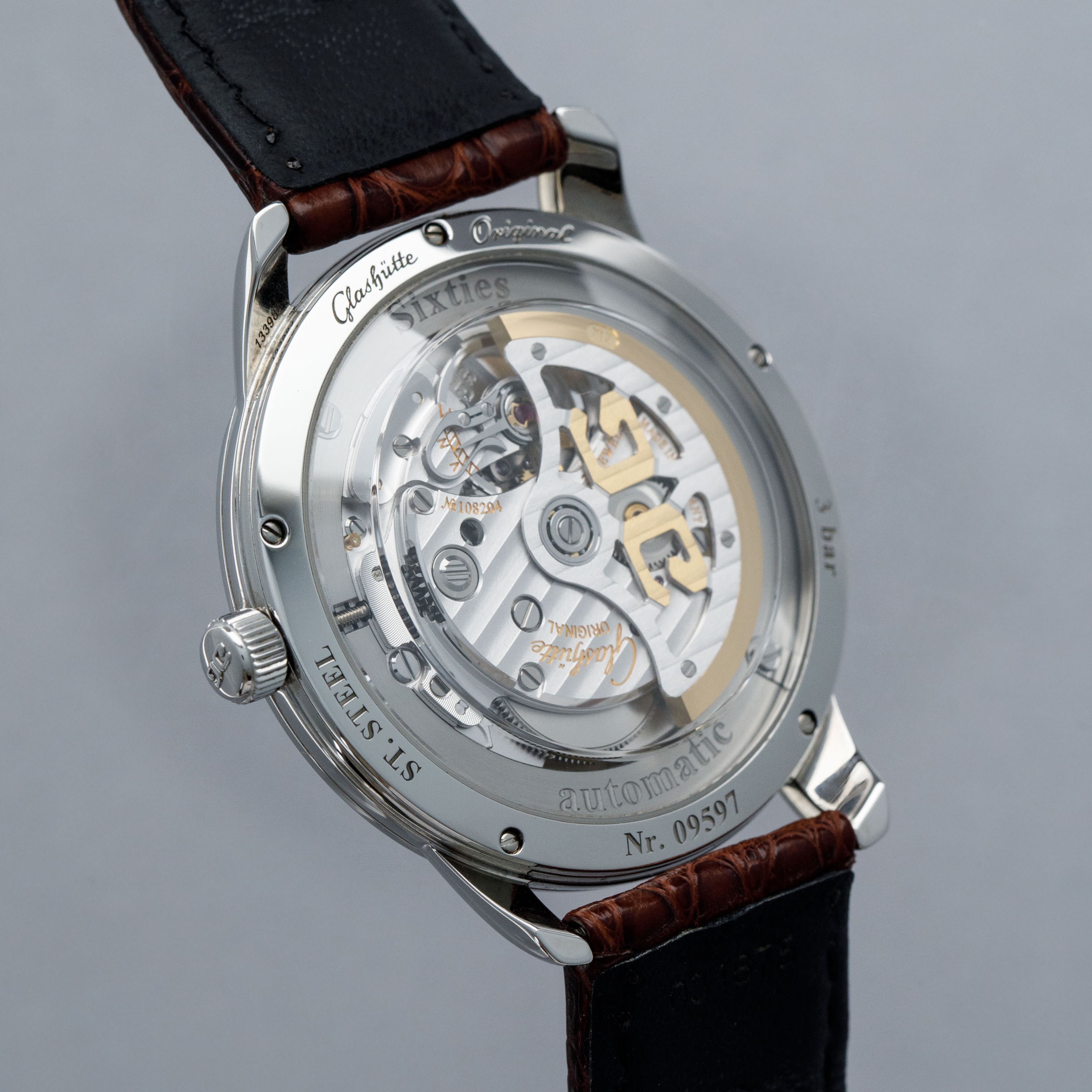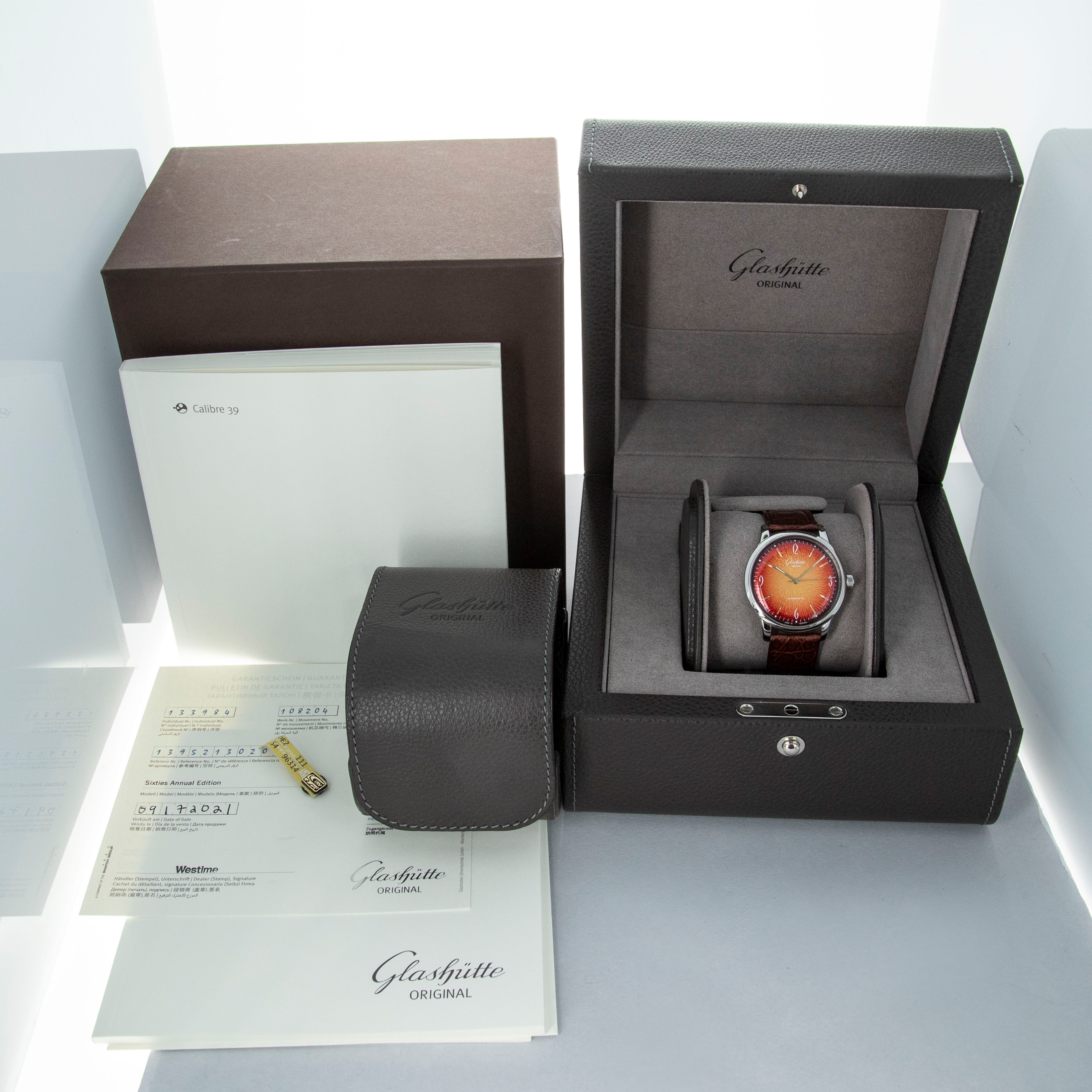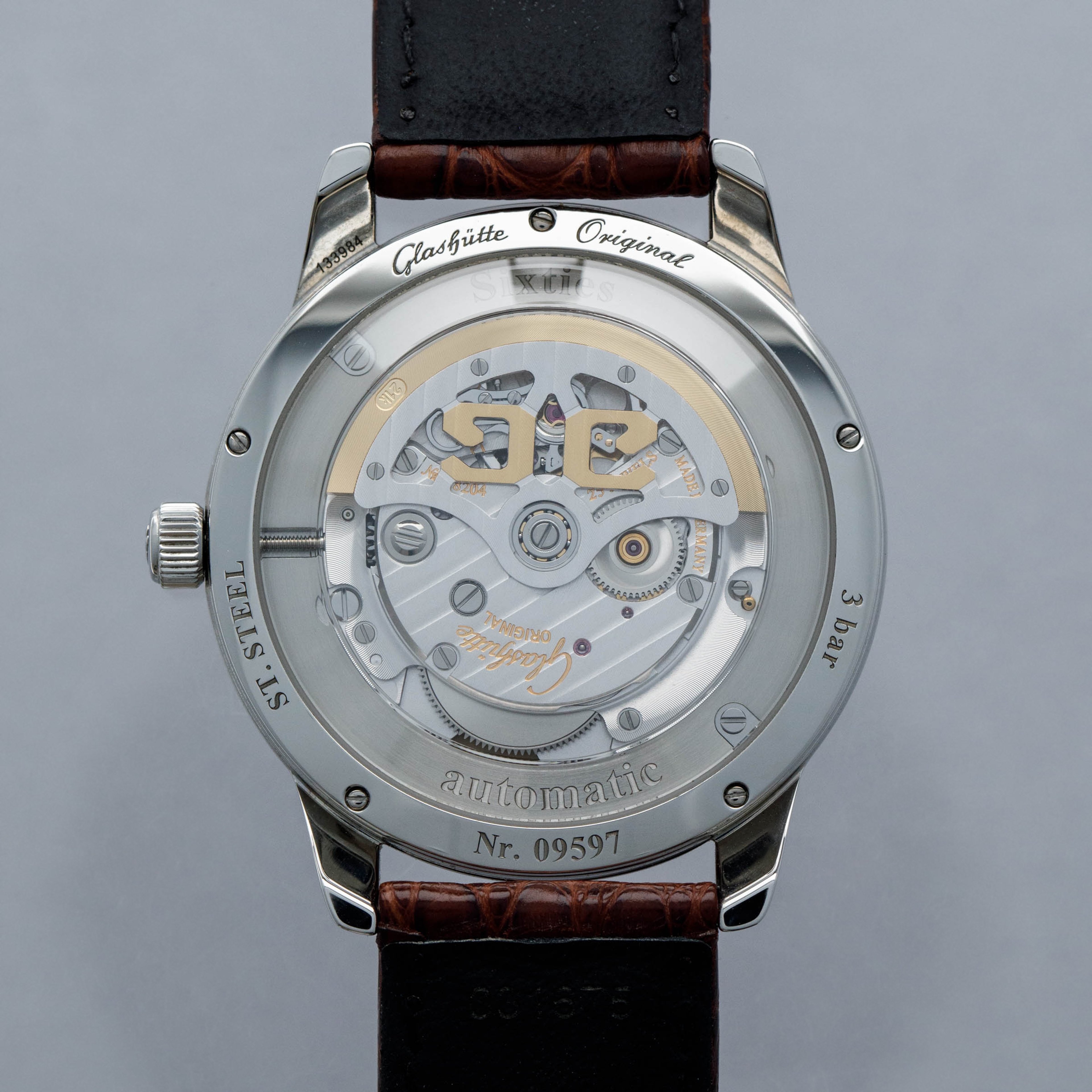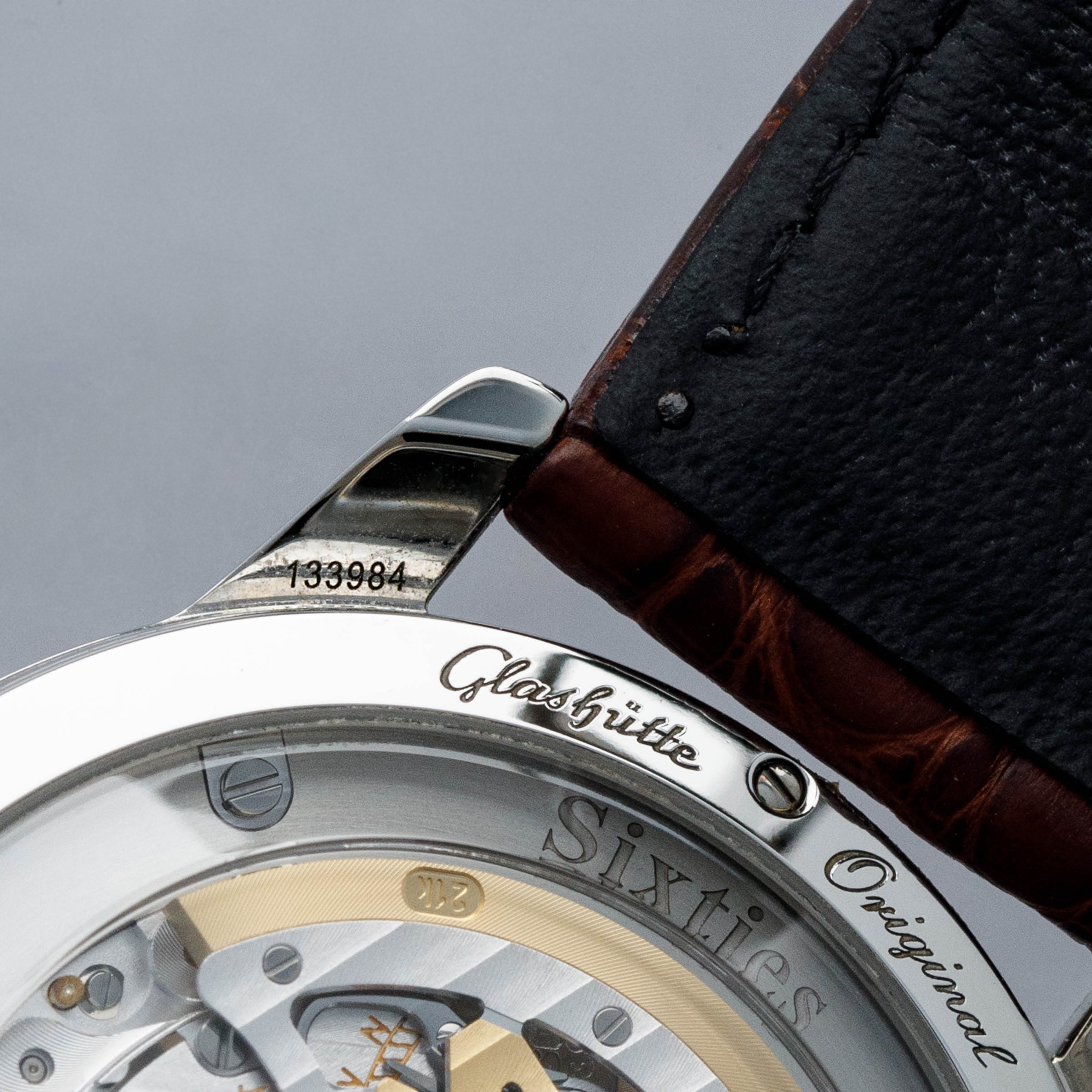 Watch is in overall near-mint condition. The steel case shows light signs of wear, with minor marks on the case and bezel. The case back has some light wear but retains very crisp engravings. The dial and hands are like new. Fitted with a brown crocodile strap and steel Glashütte Original buckle, both in near-mint condition. Comes complete with box and guarantee card.