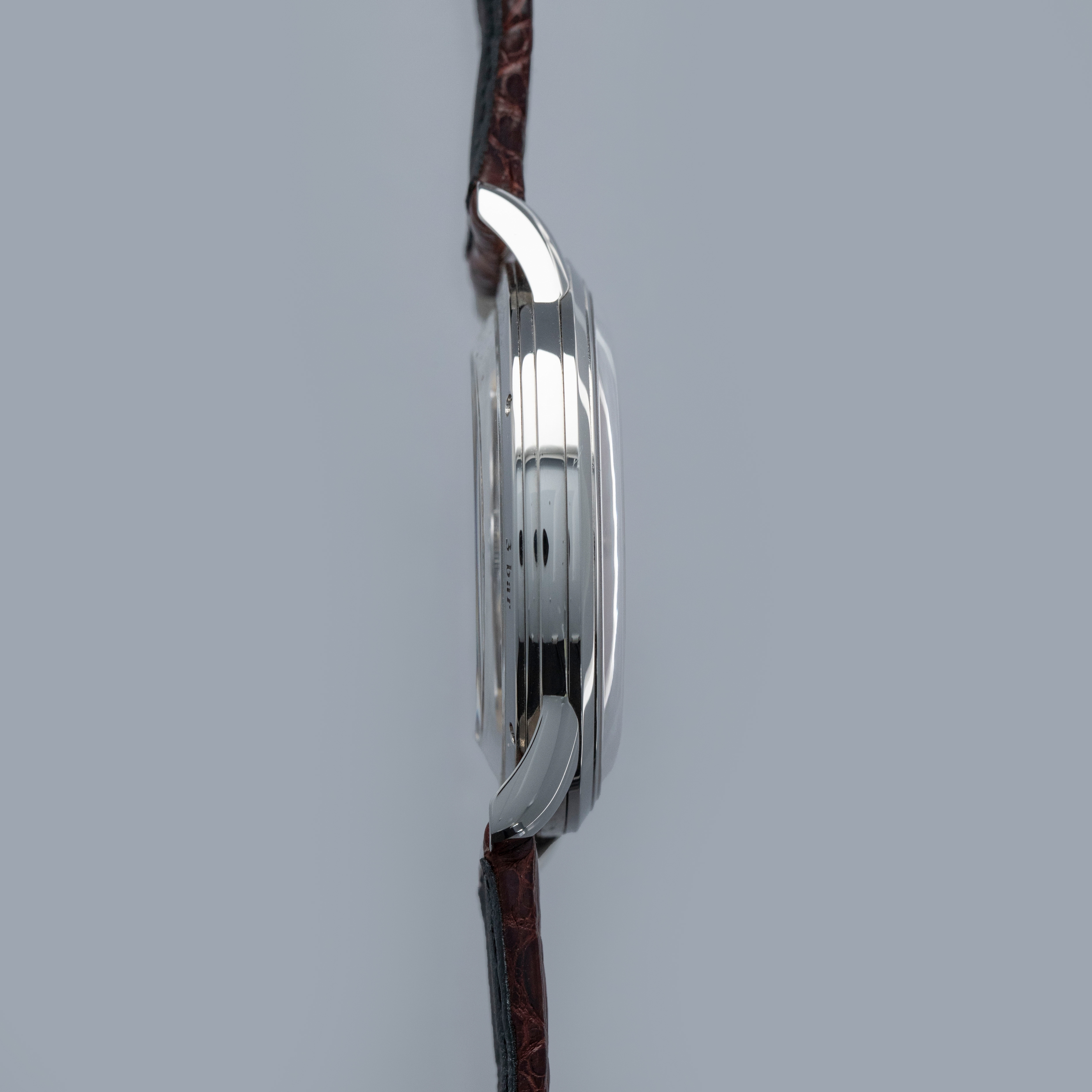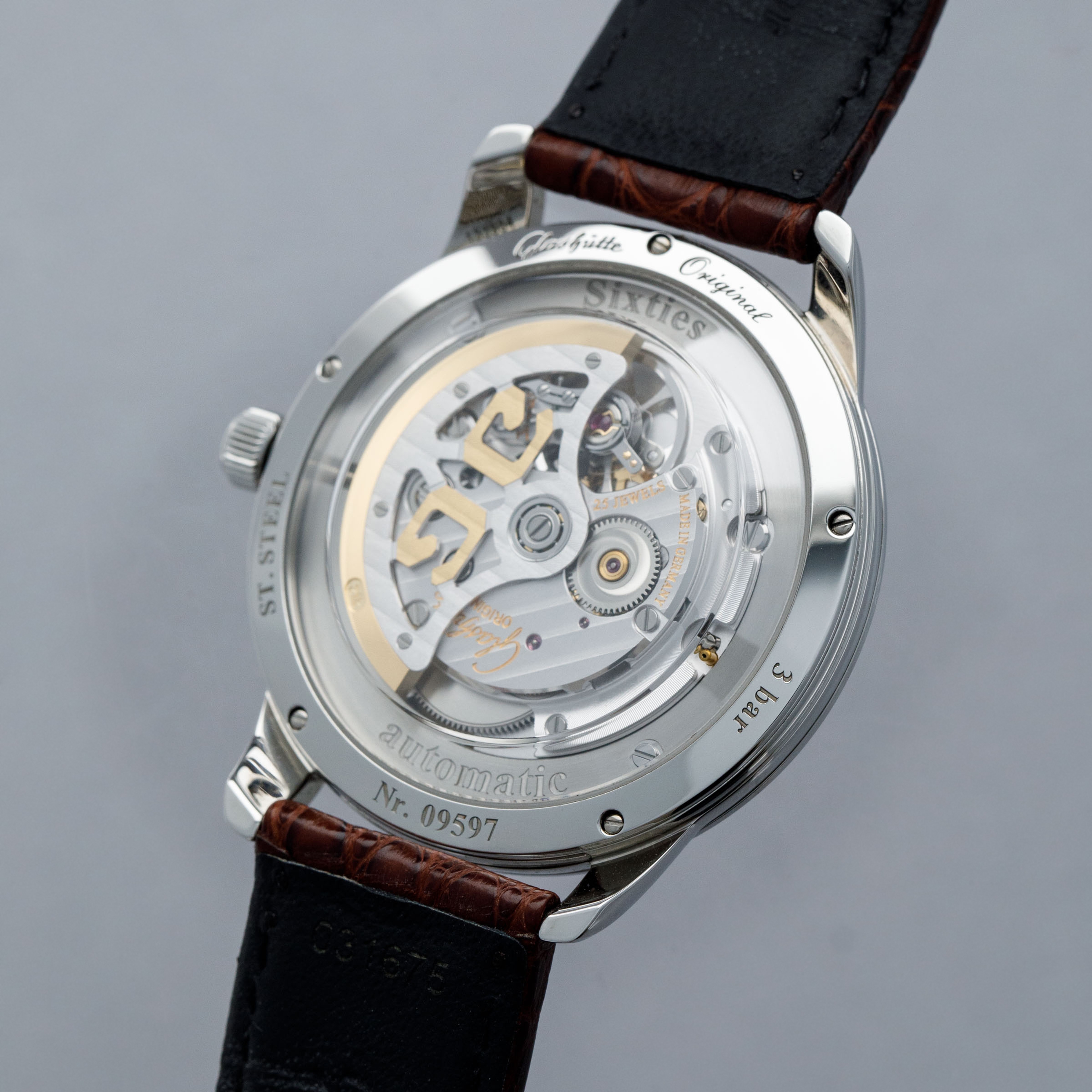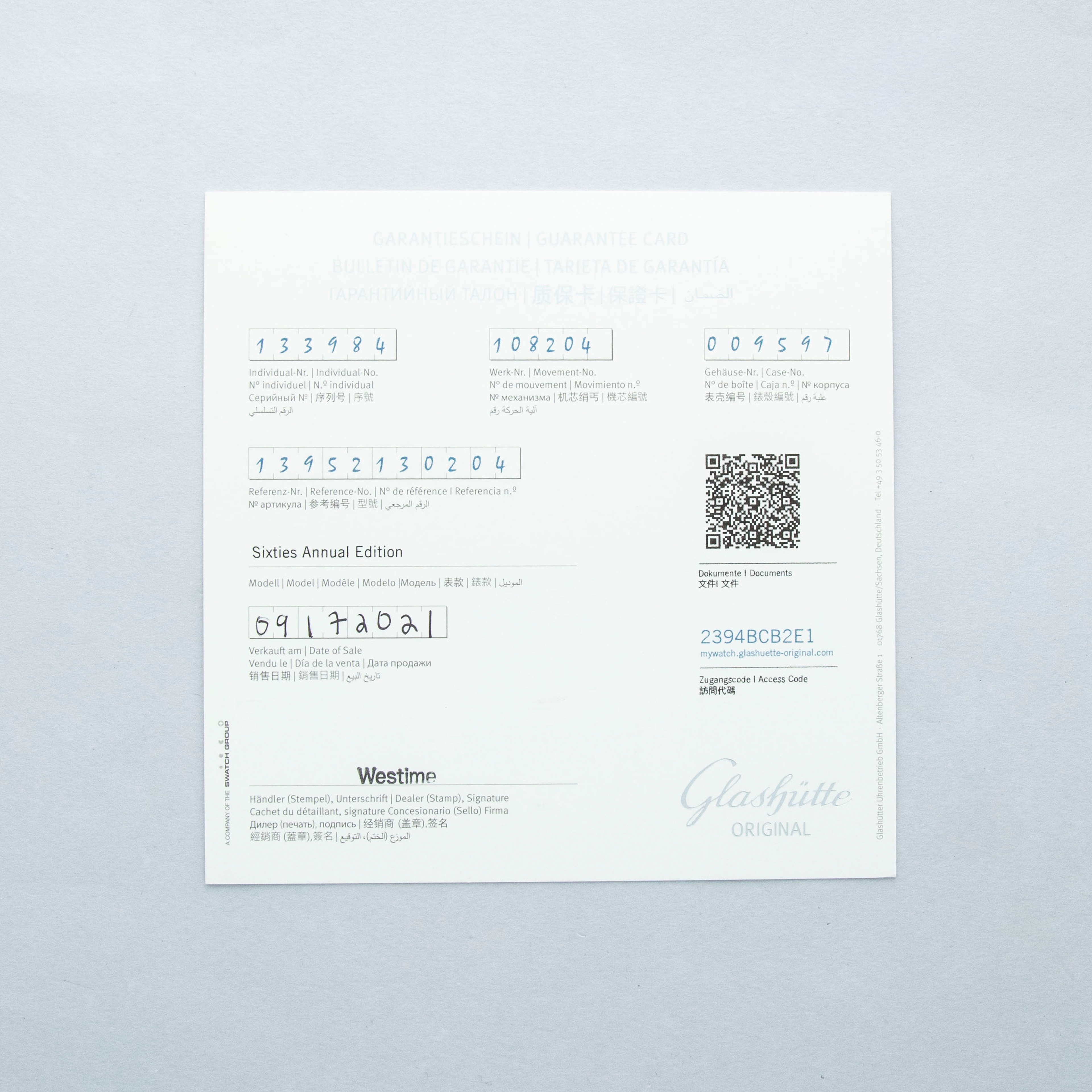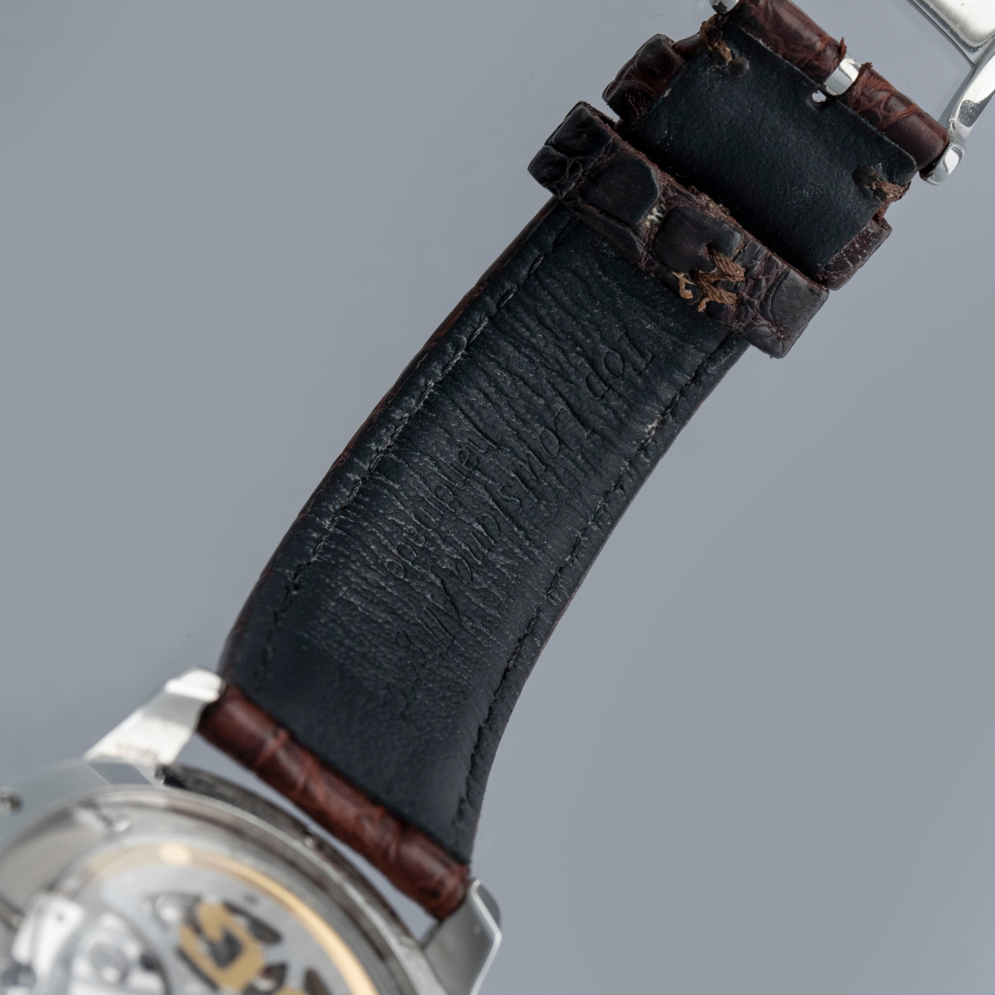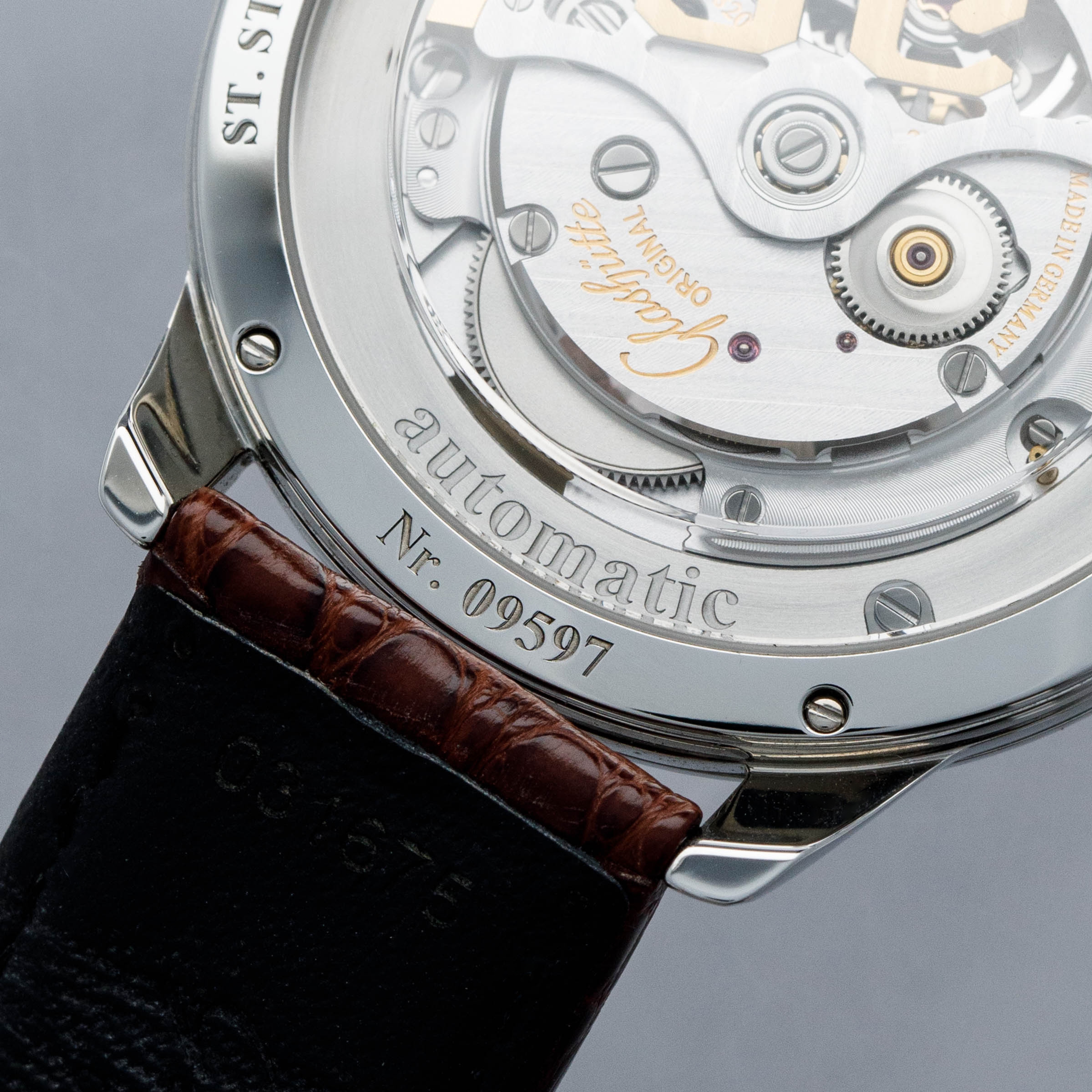 Watch is in overall near-mint condition. The steel case shows light signs of wear, with minor marks on the case and bezel. The case back has some light wear but retains very crisp engravings. The dial and hands are like new. Fitted with a brown crocodile strap and steel Glashütte Original buckle, both in near-mint condition. Comes complete with box and guarantee card.