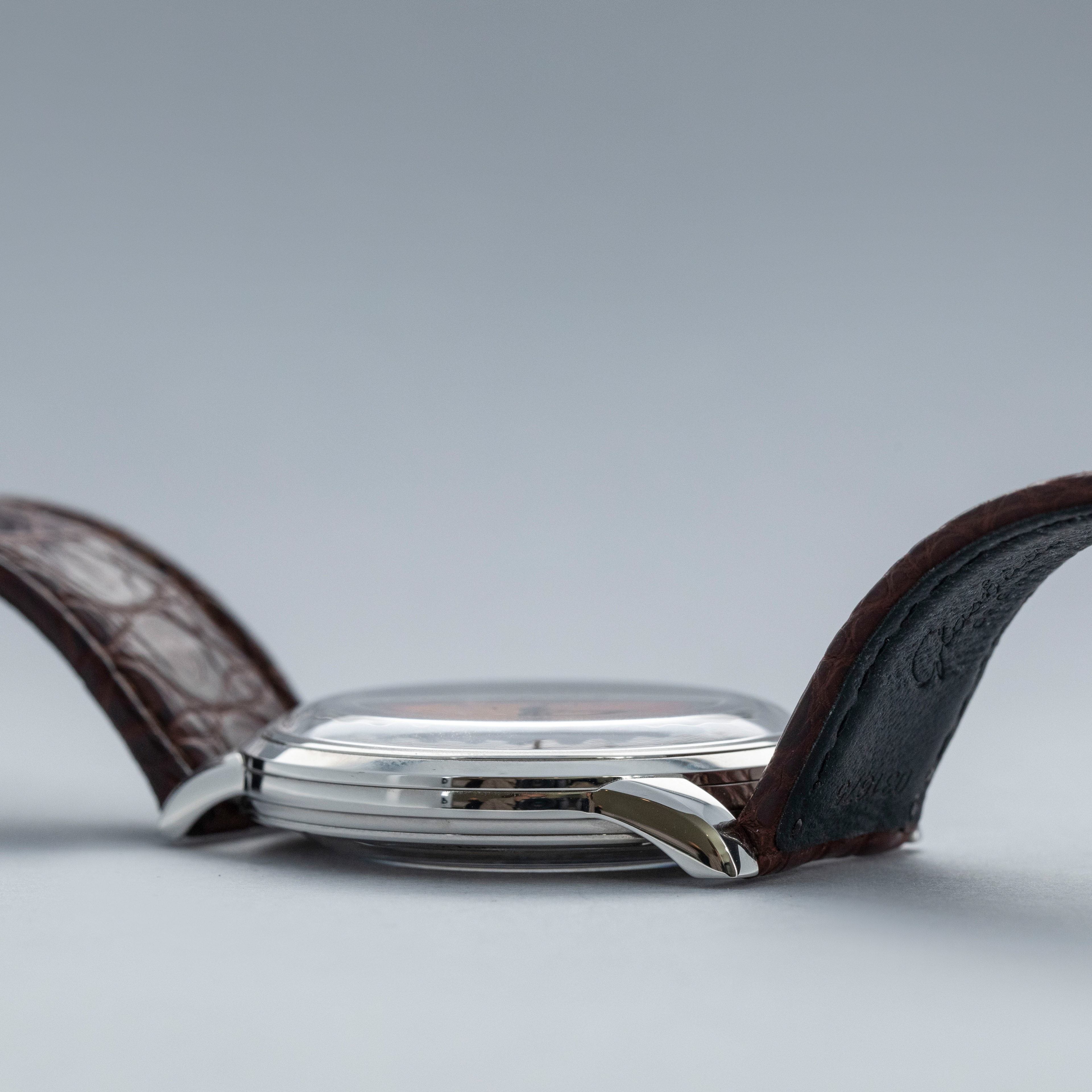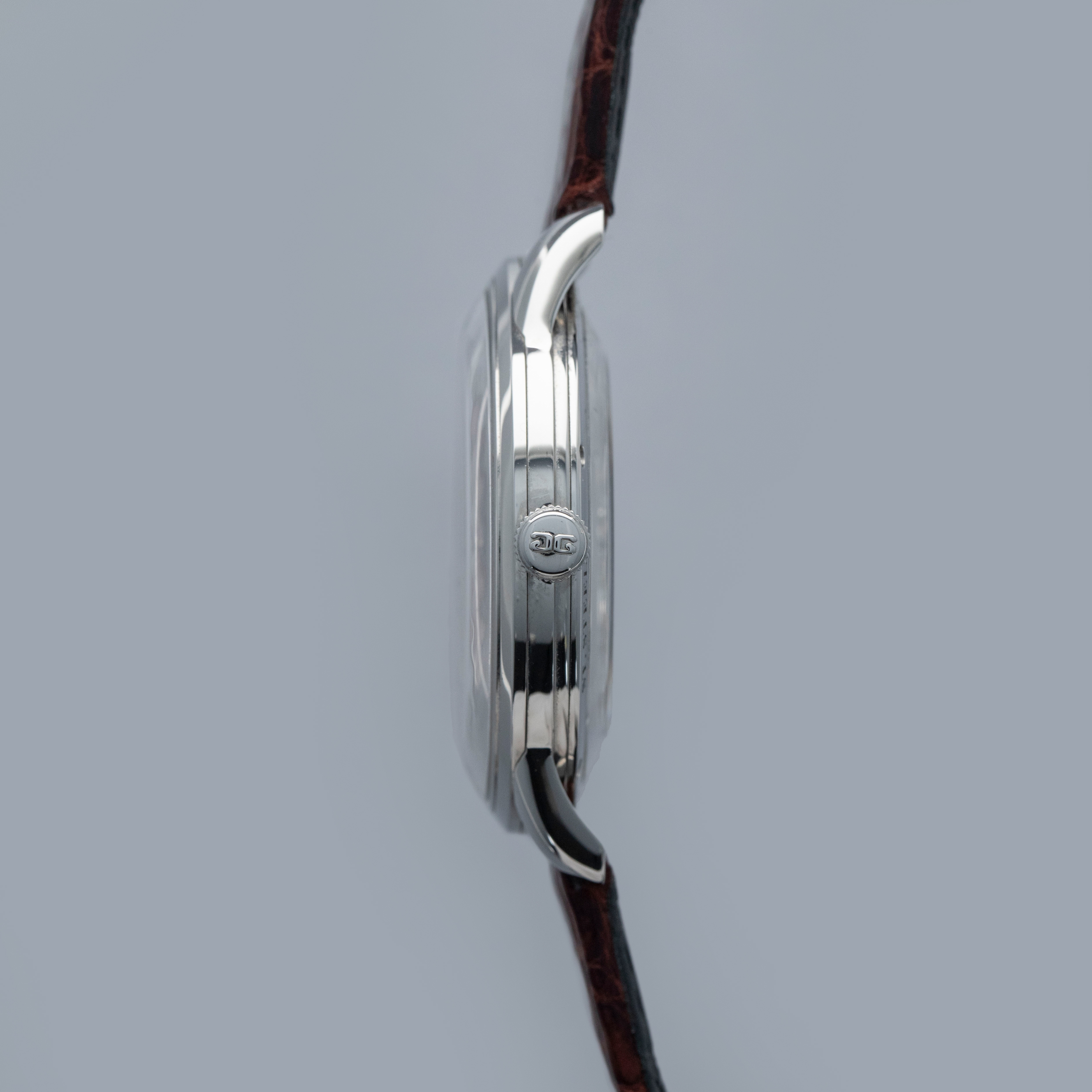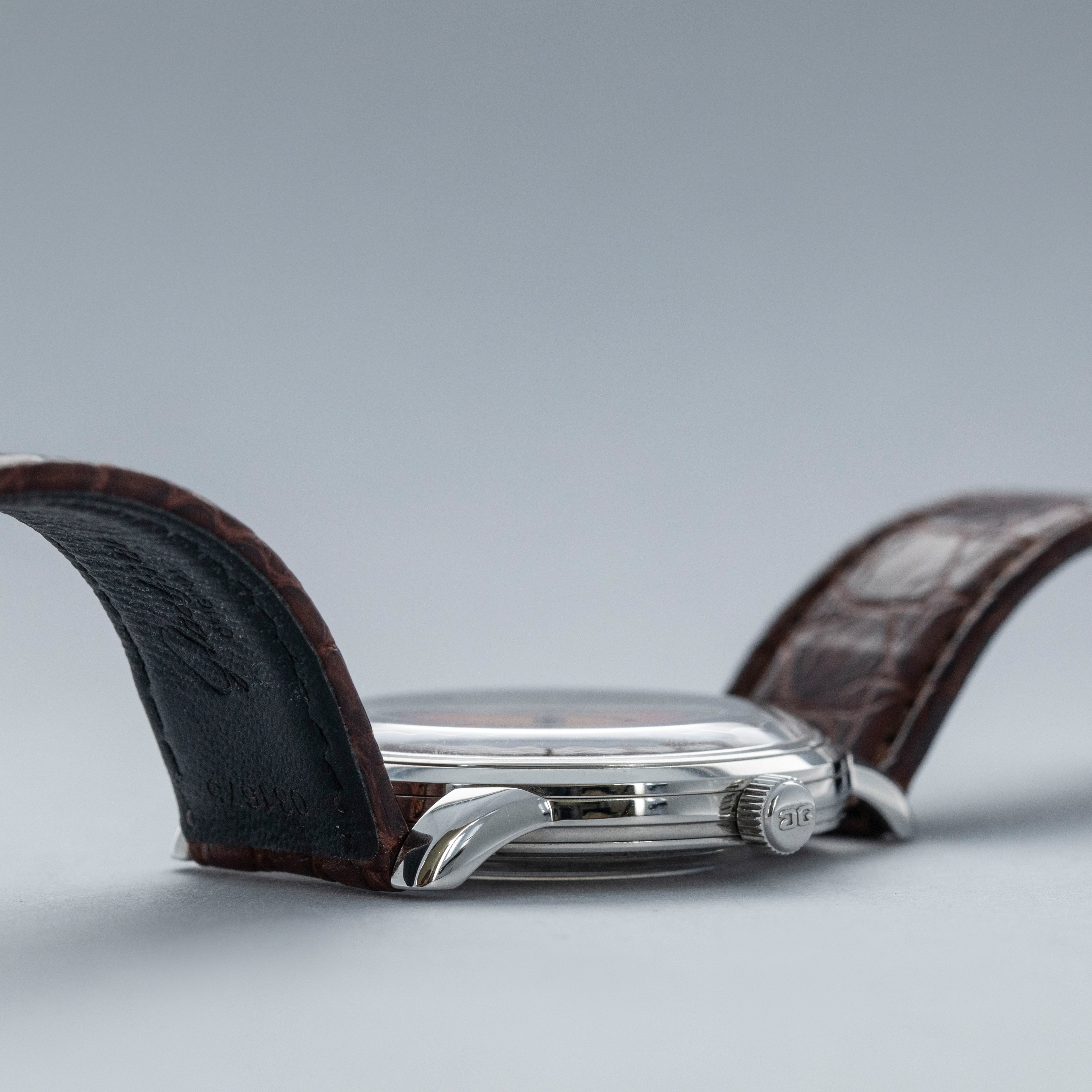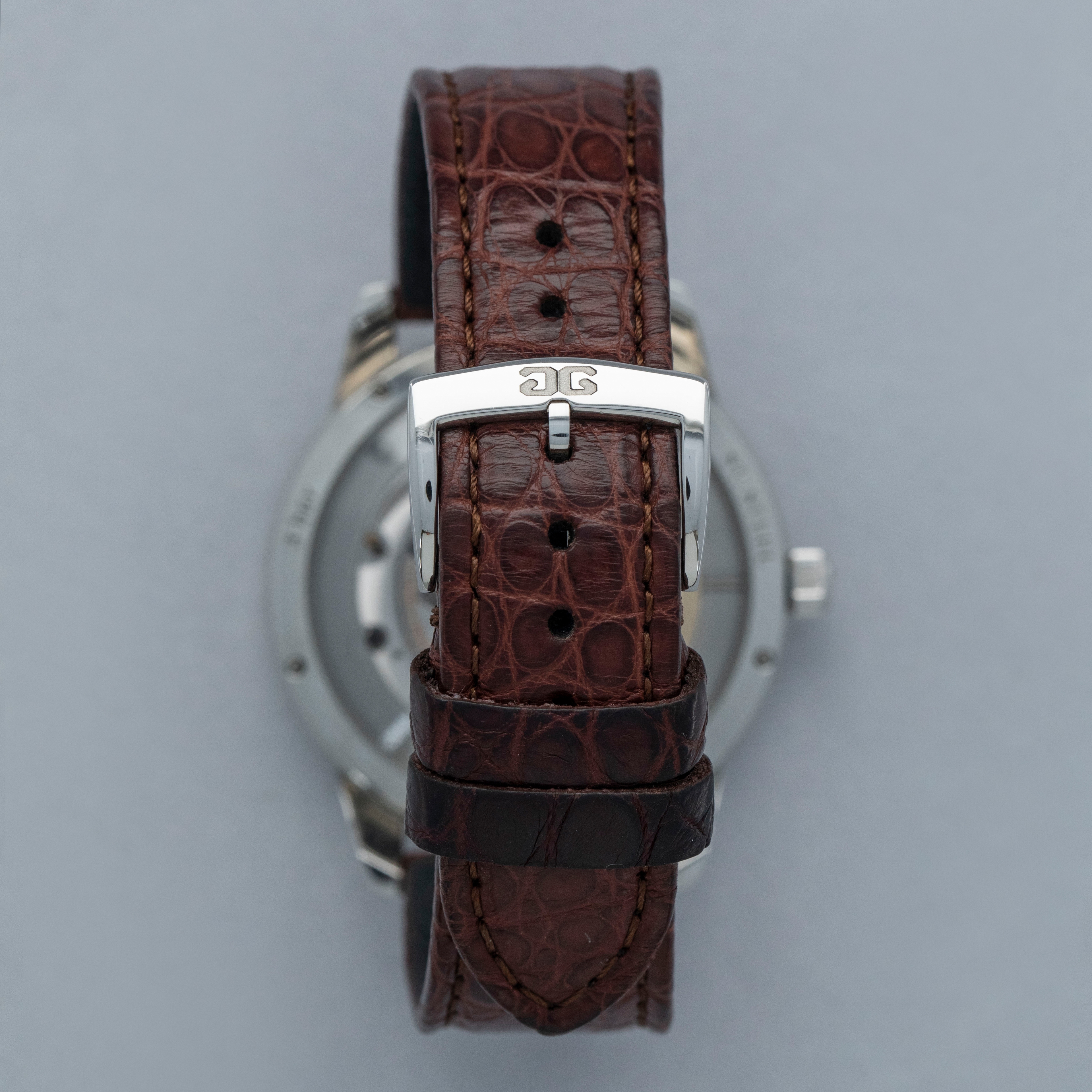 Watch is in overall near-mint condition. The steel case shows light signs of wear, with minor marks on the case and bezel. The case back has some light wear but retains very crisp engravings. The dial and hands are like new. Fitted with a brown crocodile strap and steel Glashütte Original buckle, both in near-mint condition. Comes complete with box and guarantee card.