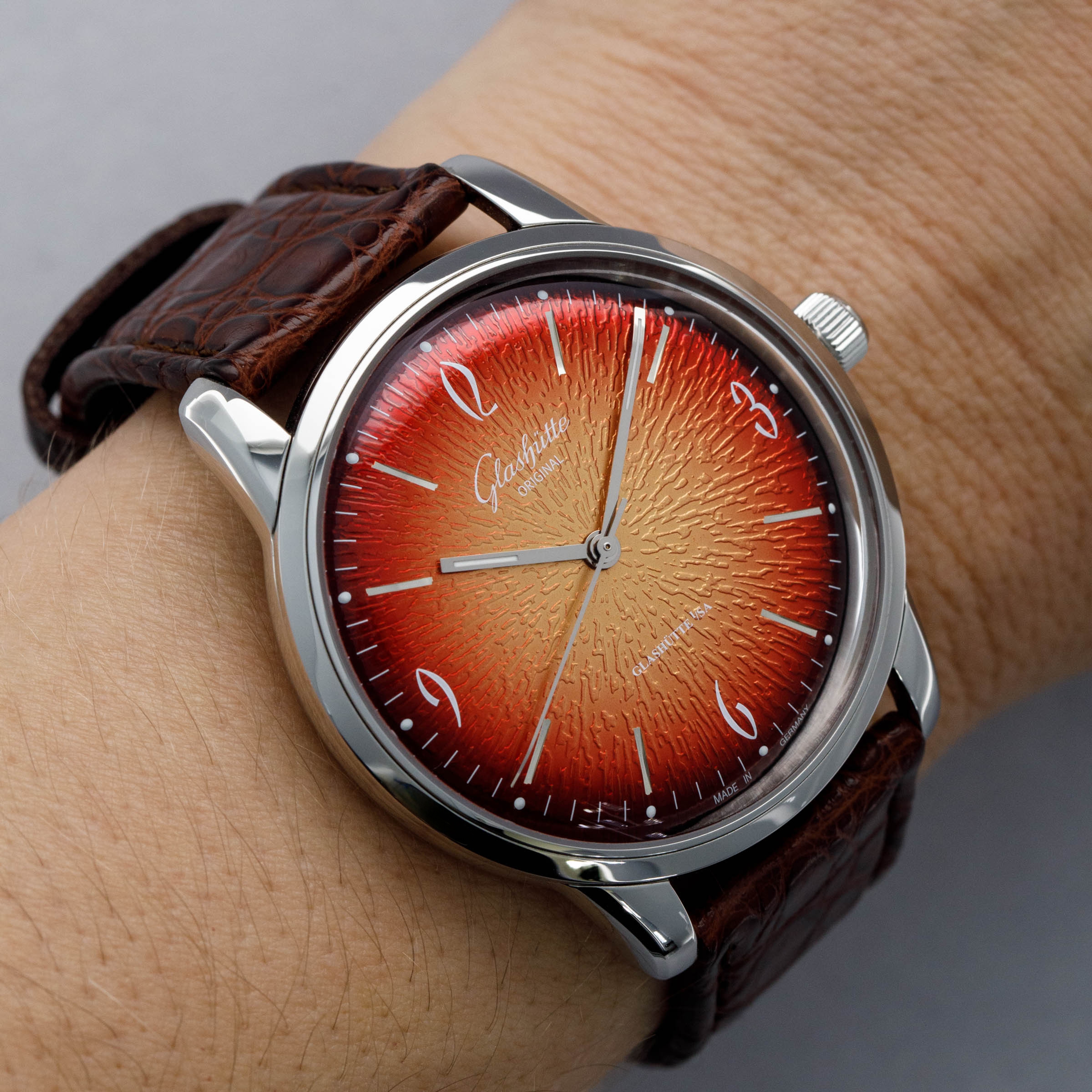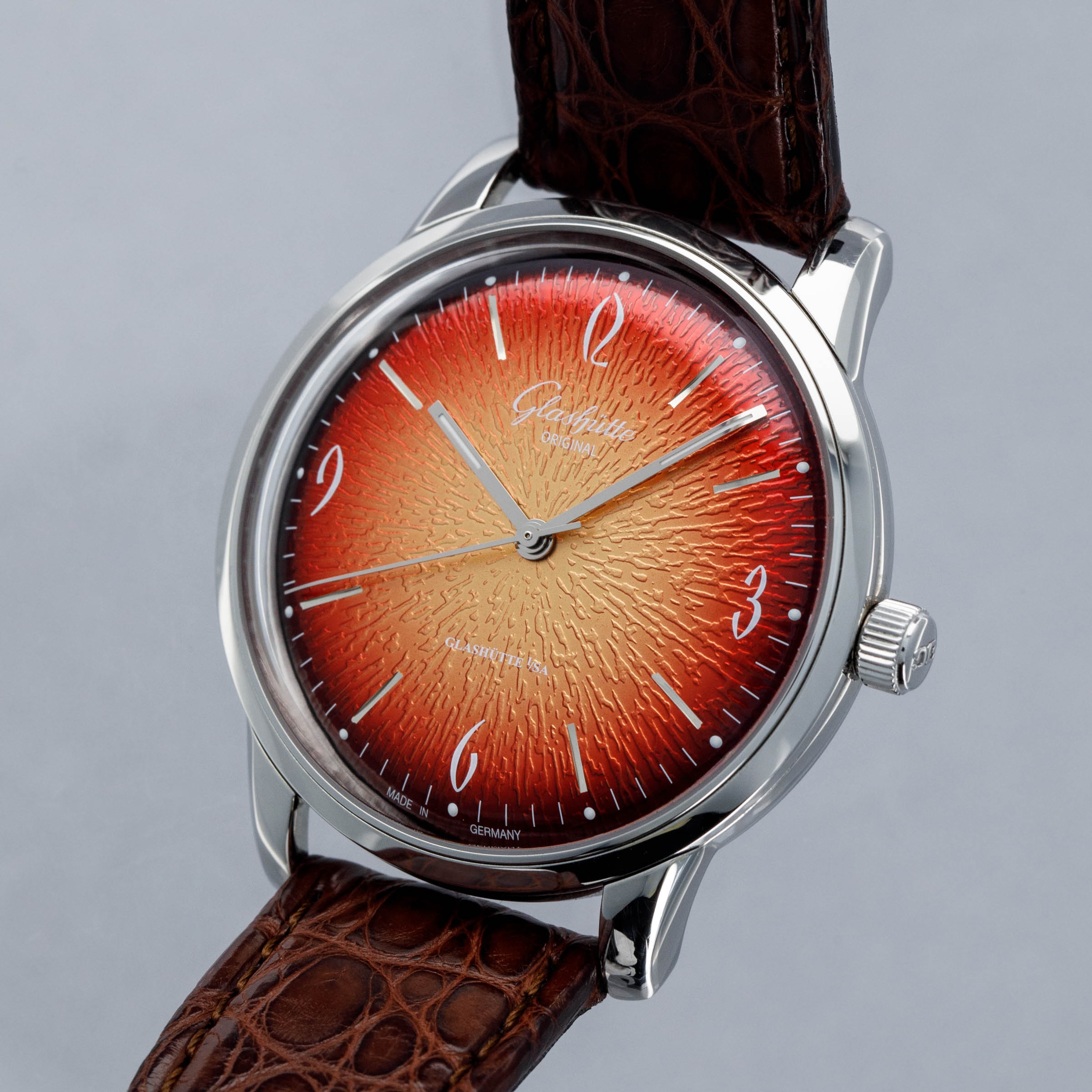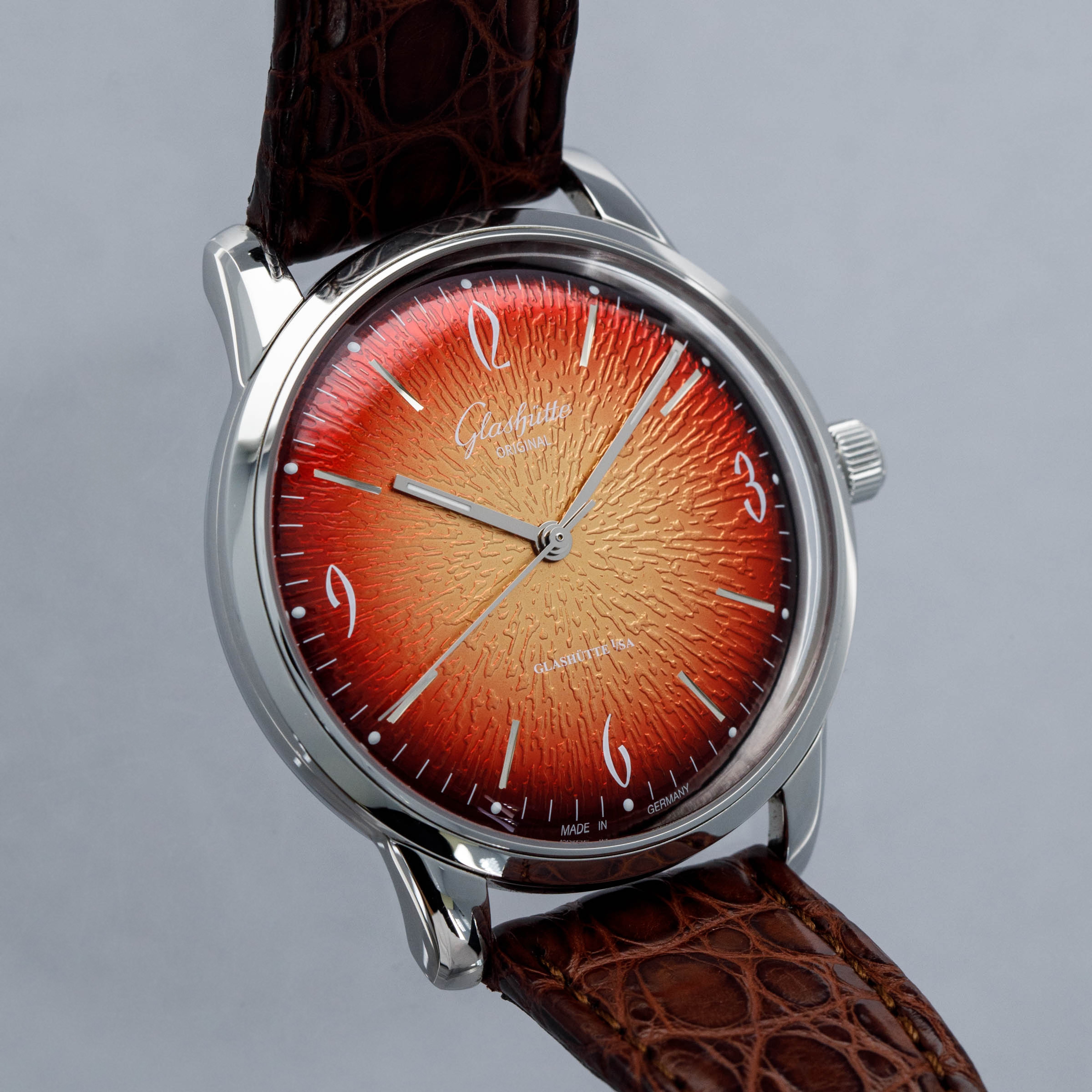 Showcasing Glashutte Original's impressive ability to create unique dials, this Senator Sixties features a fiery orange dial with a unique texture that brings its colors to life as it moves from a bright orange to a near-black along its dial periphery.