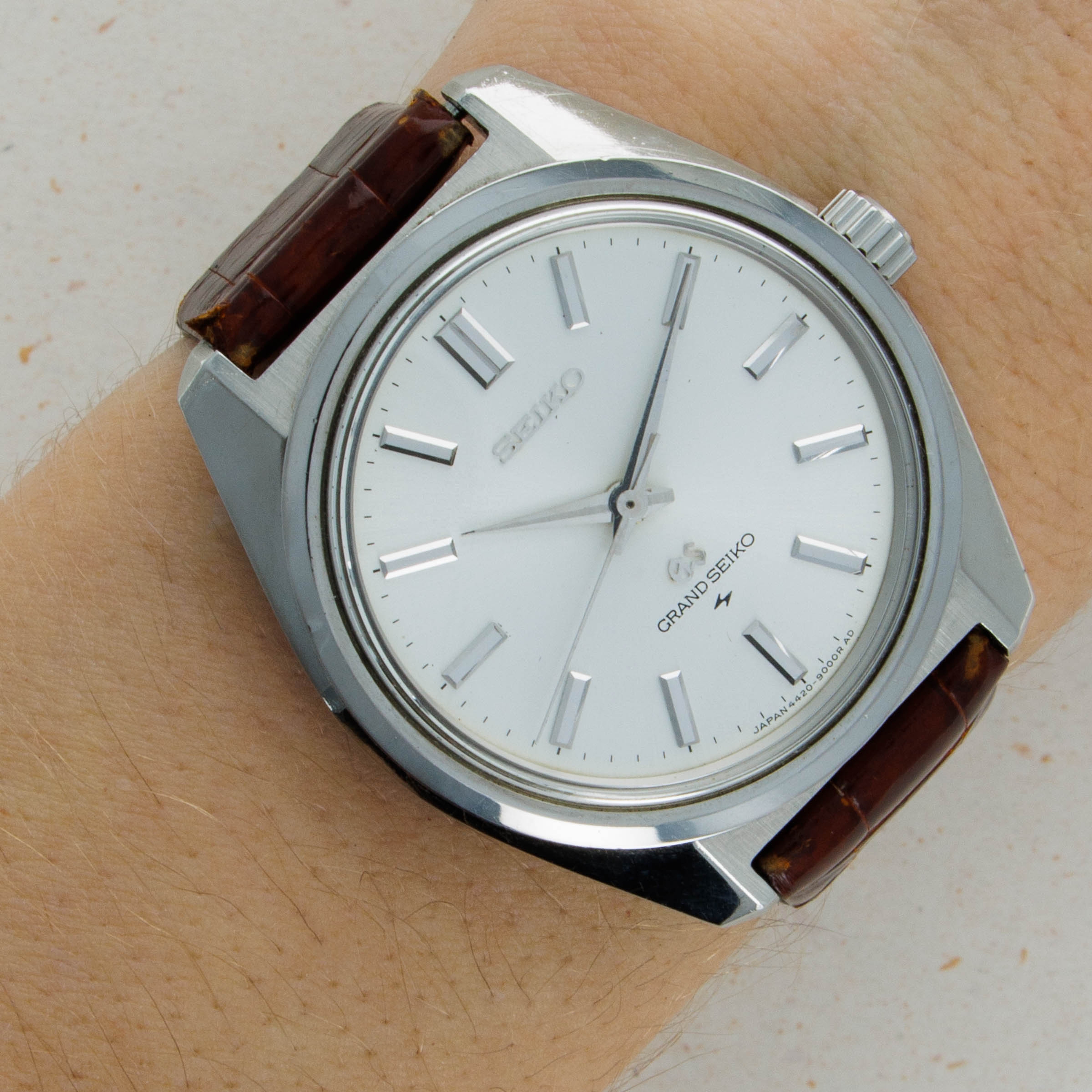 Offered here we have an exquisite second series Grand Seiko 4420-9000, a vintage timepiece that stands as a testament to the esteemed heritage of the 44GS series. Originally launched in late 1967 and produced until 1969, this model is an evolution of the renowned King Seiko, showcasing the exceptional craftsmanship of the Daini Seikosha factory. While its availability spanned a mere two years, the 44GS left an indelible mark by introducing the Grand Seiko "Grammar of Design," conceived by the visionary designer Taro Tanaka. With the recent global prominence of the Grand Seiko brand, the 44GS has gained recognition as the pioneering collection that established the iconic Grand Seiko style. Embodying nine enduring design elements, this timepiece captivates with its timeless appeal. Contrasting with the modern range, vintage pieces from this era exhibit daring and innovative designs, reflecting an era of true horological exploration. With only three distinct models produced, and even fewer when disregarding subtle dial variations, it presents an accessible path to ownership. This particular 4420-9000 example, featuring a stainless steel case, features a second series silver dial with the 'Daini' Logo at 6 o'clock underneath its Grand Seiko inscription which was the logo of the Daini Seikosha company, which was a separate Seiko factory. A wonderfully elegant timepiece with wearable proportions and a gorgeous construction, it is no surprise the 44GS case has grown to become so popular.