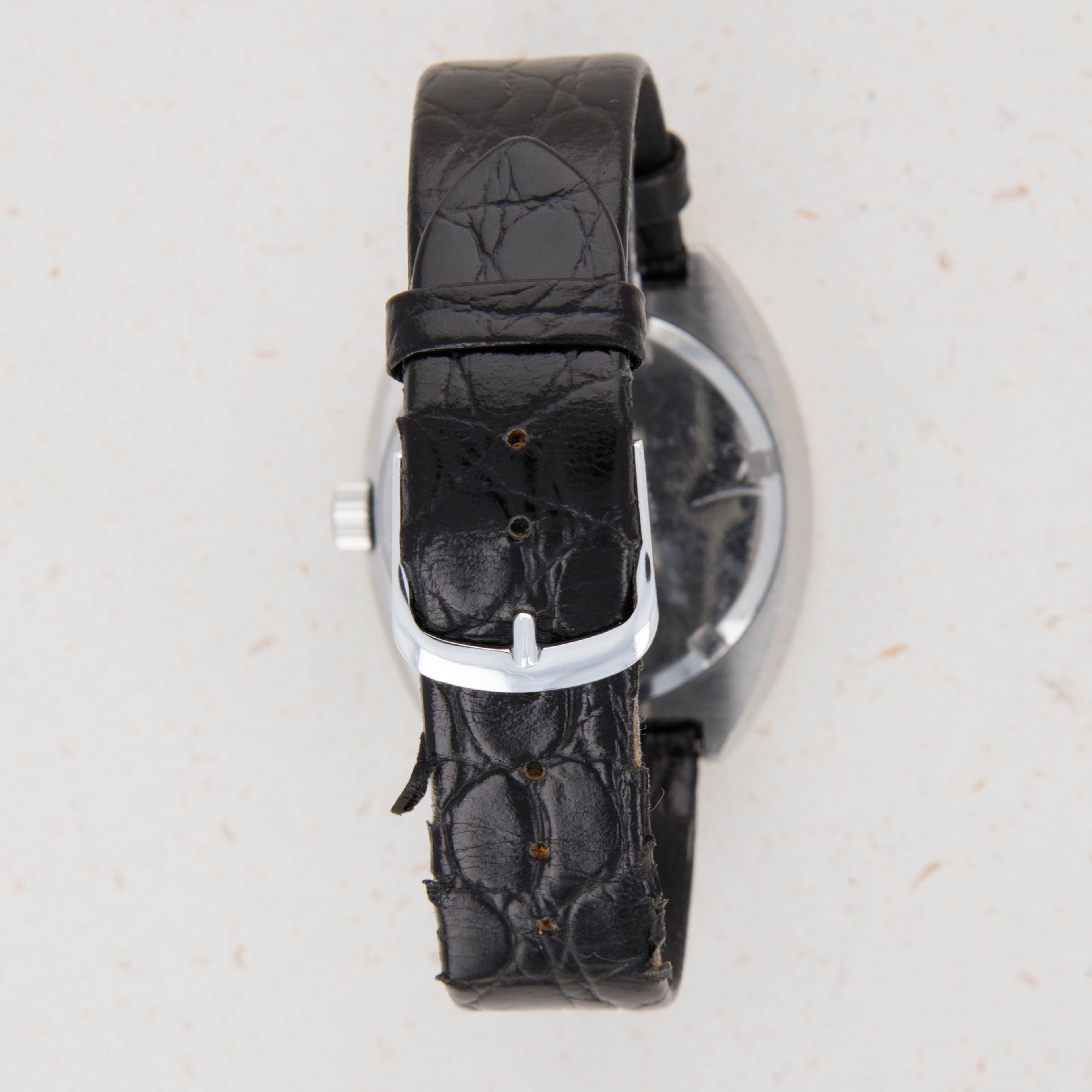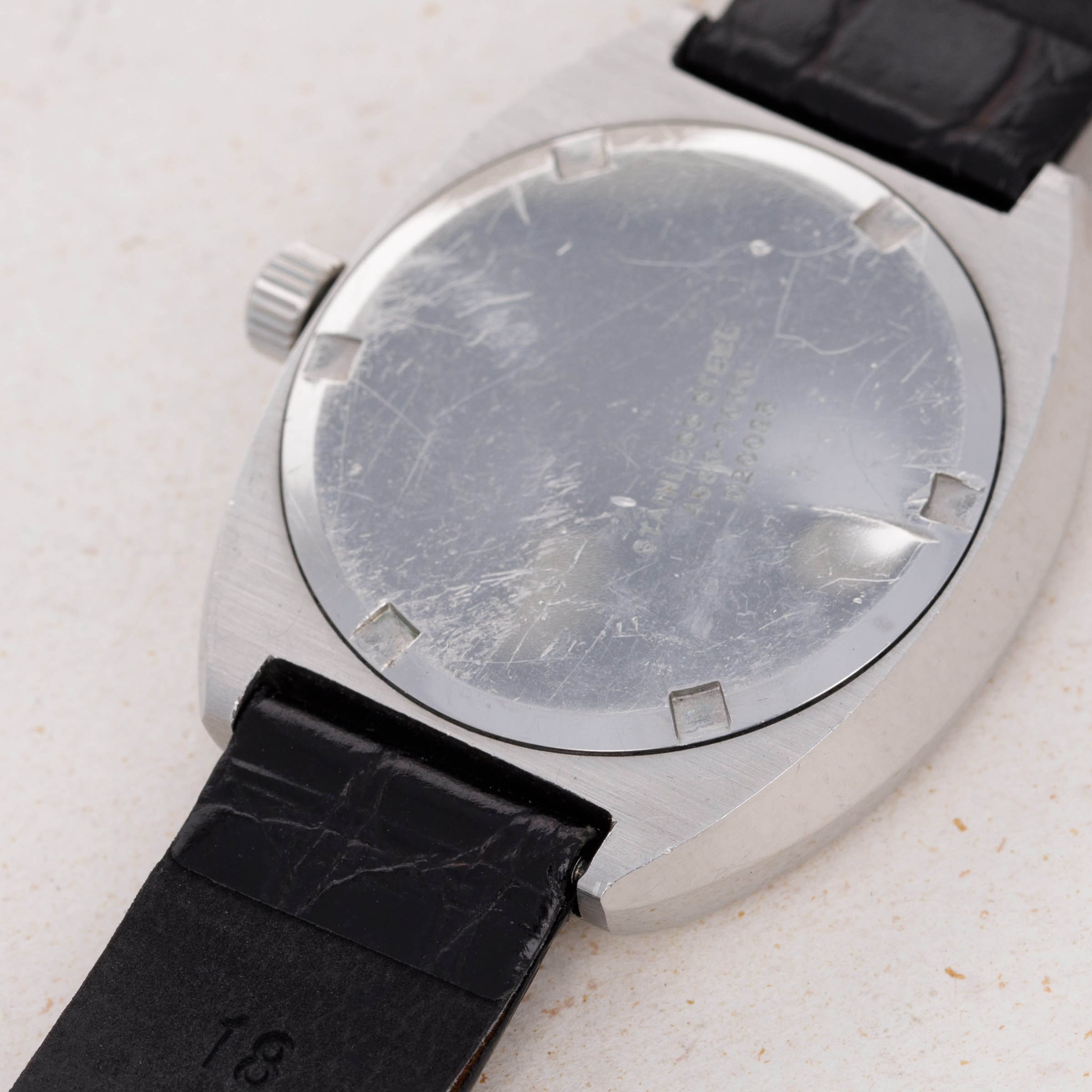 Watch is in very good original vintage condition. There are some scratches and dings on the surface of the case, including one visible around 10 o'clock on the bezel surface. Mid case retains original horizontally brushed surface with some wear visible. The crystal has some chips and scratches visible on the surface. Dial in excellent condition with minimal signs of aging. Caseback has scratches visible along the surface, including a deeper scratch vertically underneath the engraved text, going to the edge near one of the case teeth. Watch comes on a generic strap and buckle that are in heavily worn condition.