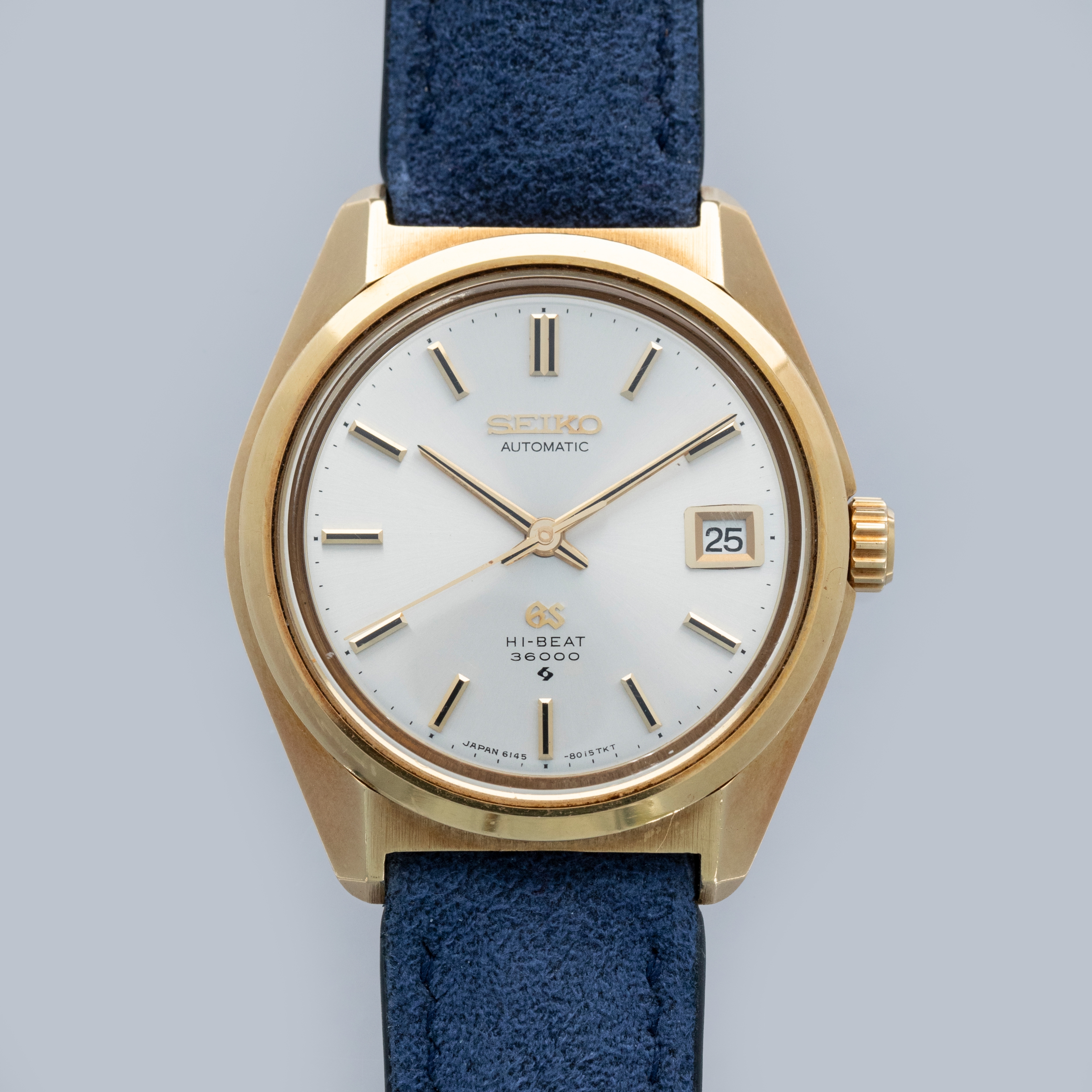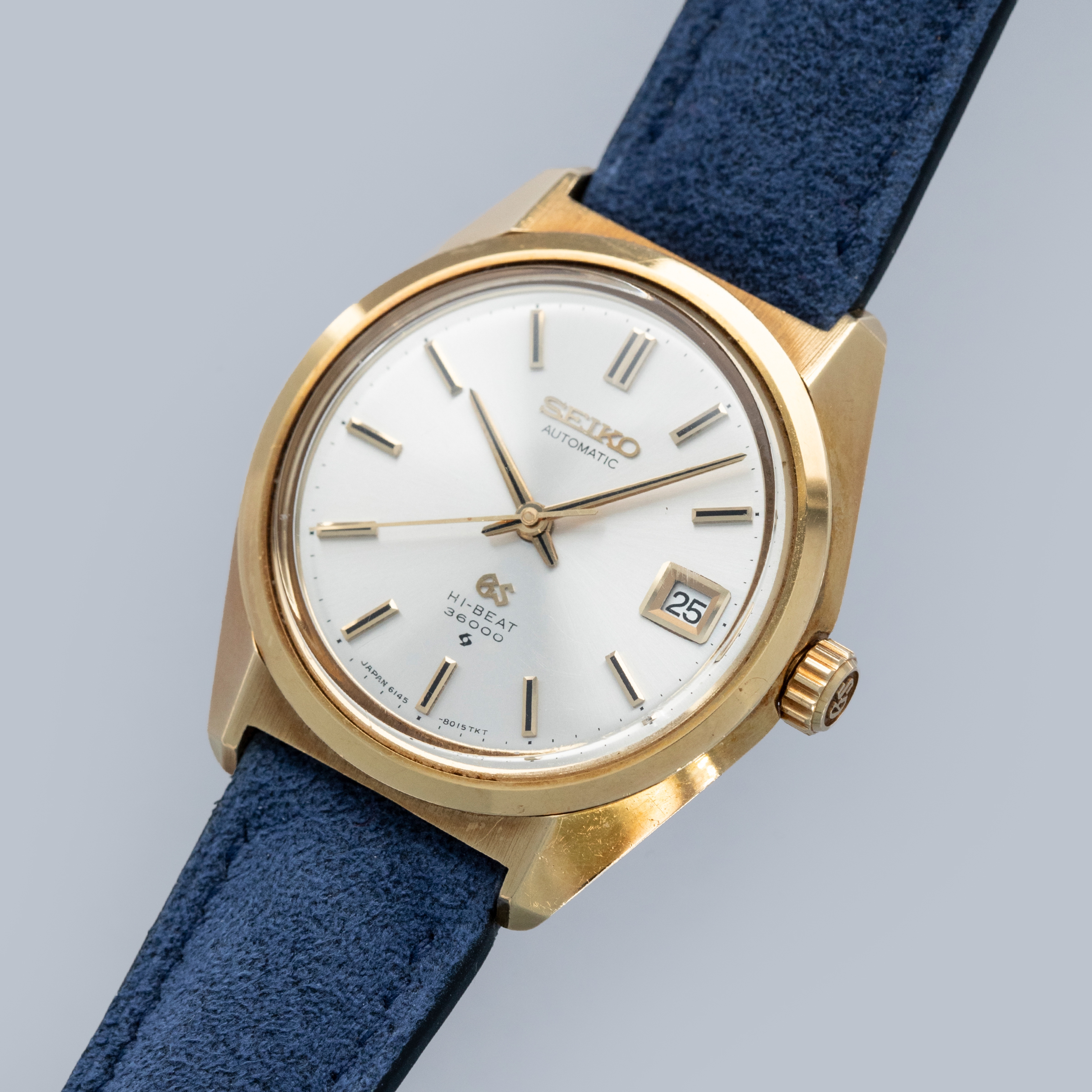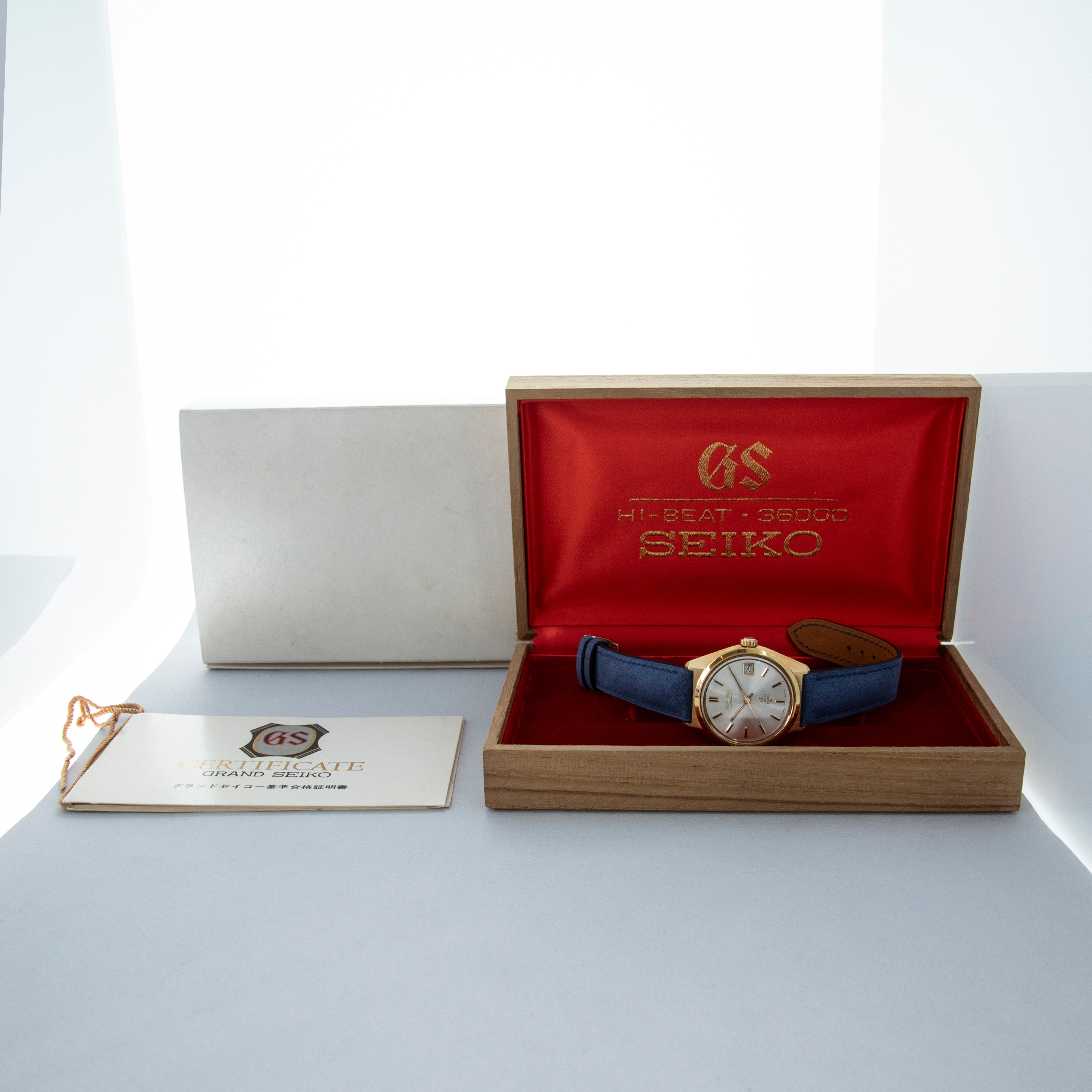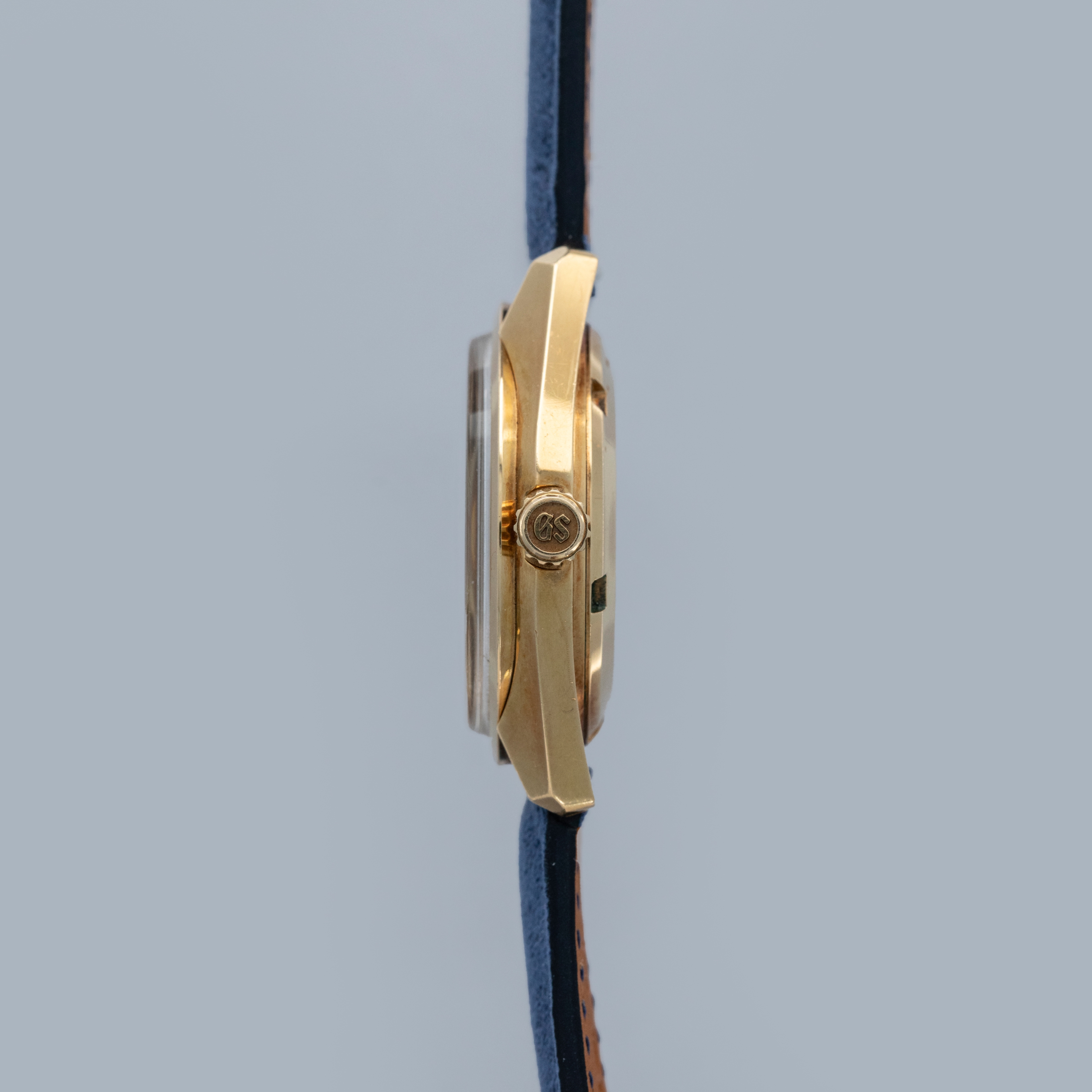 The watch is in overall excellent condition. The yellow gold case has well-defined lines, with some light scratches and marks as expected of a watch of this vintage. The case back has well-defined engravings. The no-lume dial is in excellent condition, with only a couple of very minor marks. The hands are clean, with just a small spot on the seconds hand. There are a couple of scuffs and a mark on the crystal. The watch is fitted with a blue leather strap with a vintage Grand Seiko pin buckle in excellent condition. Comes with inner and outer boxes and guarantee booklet.