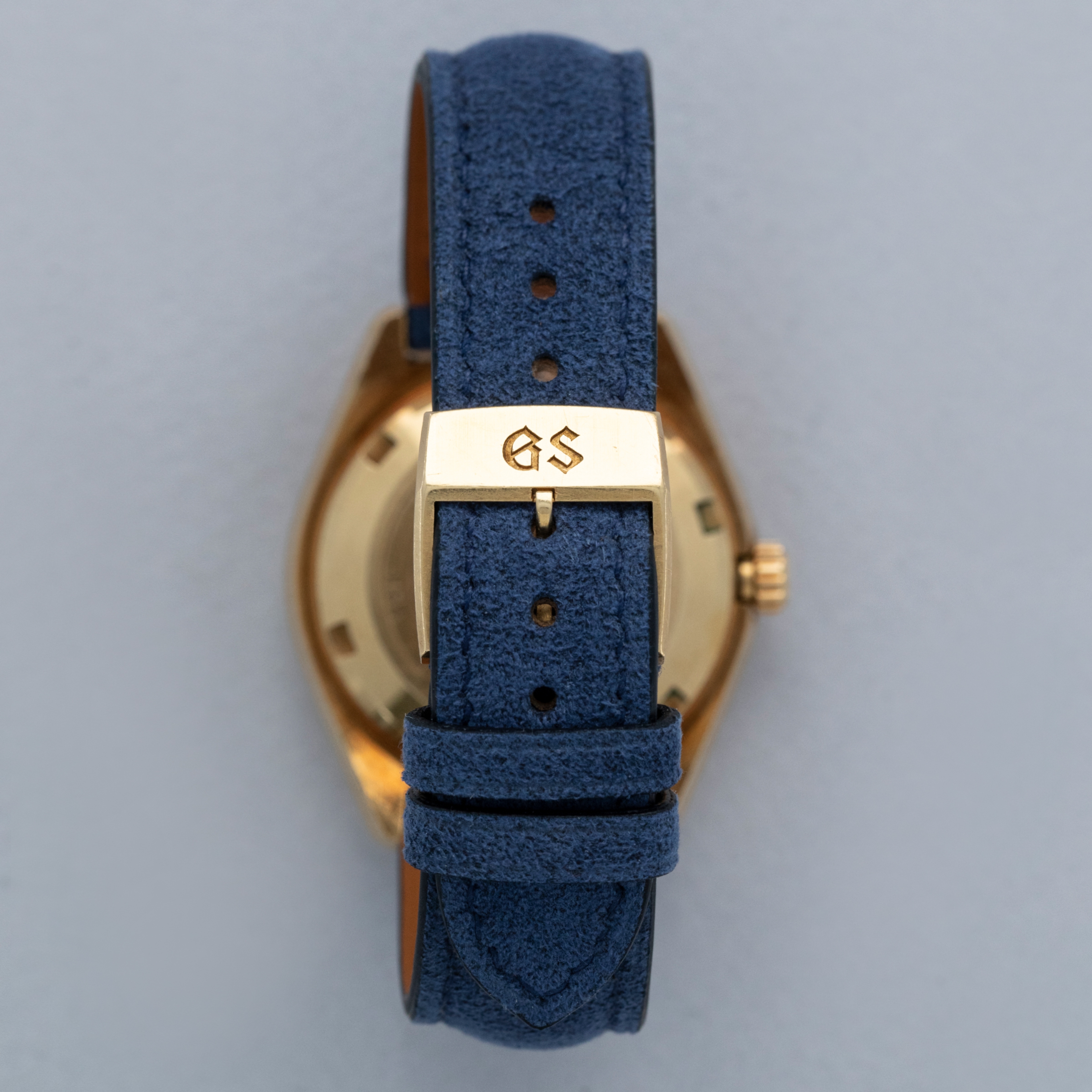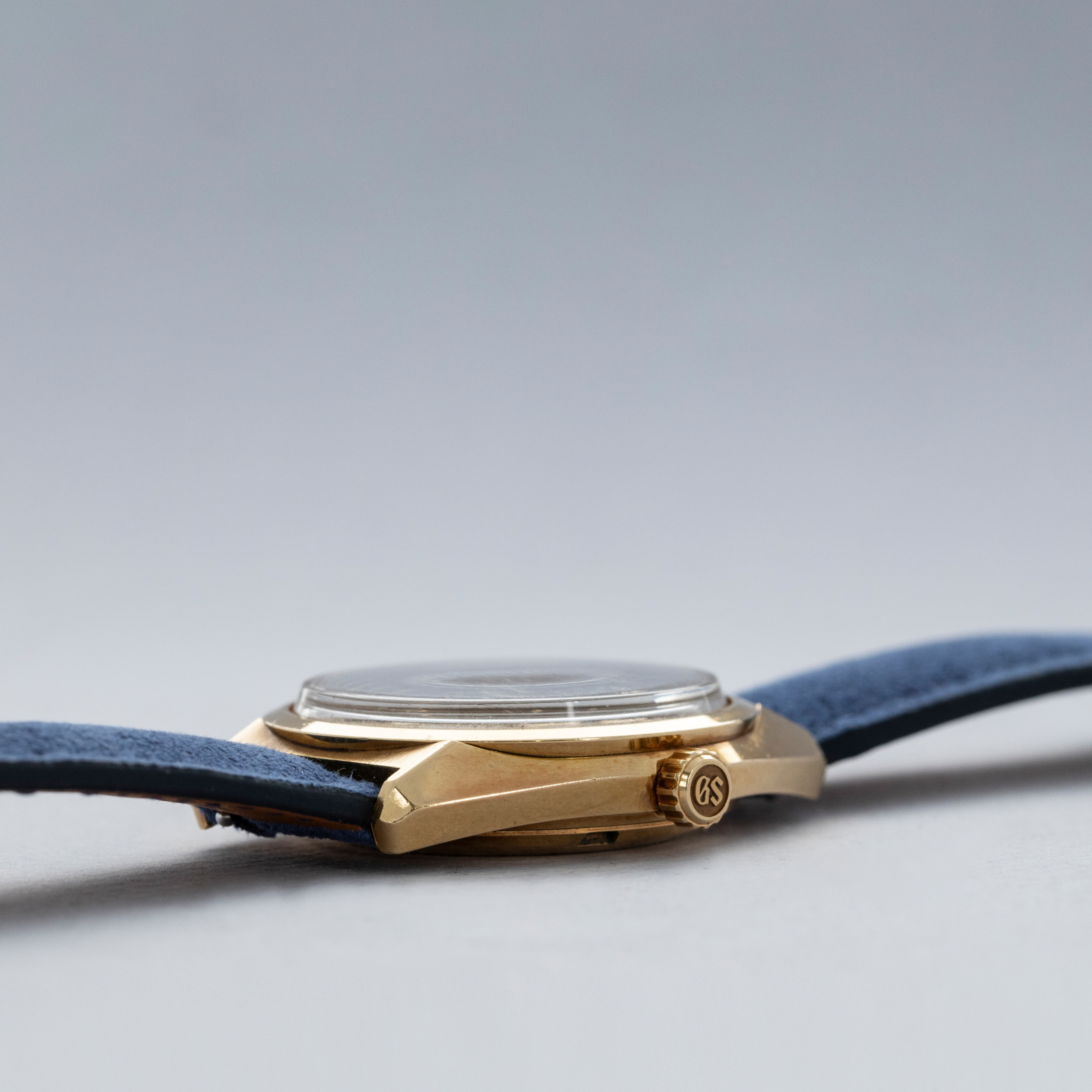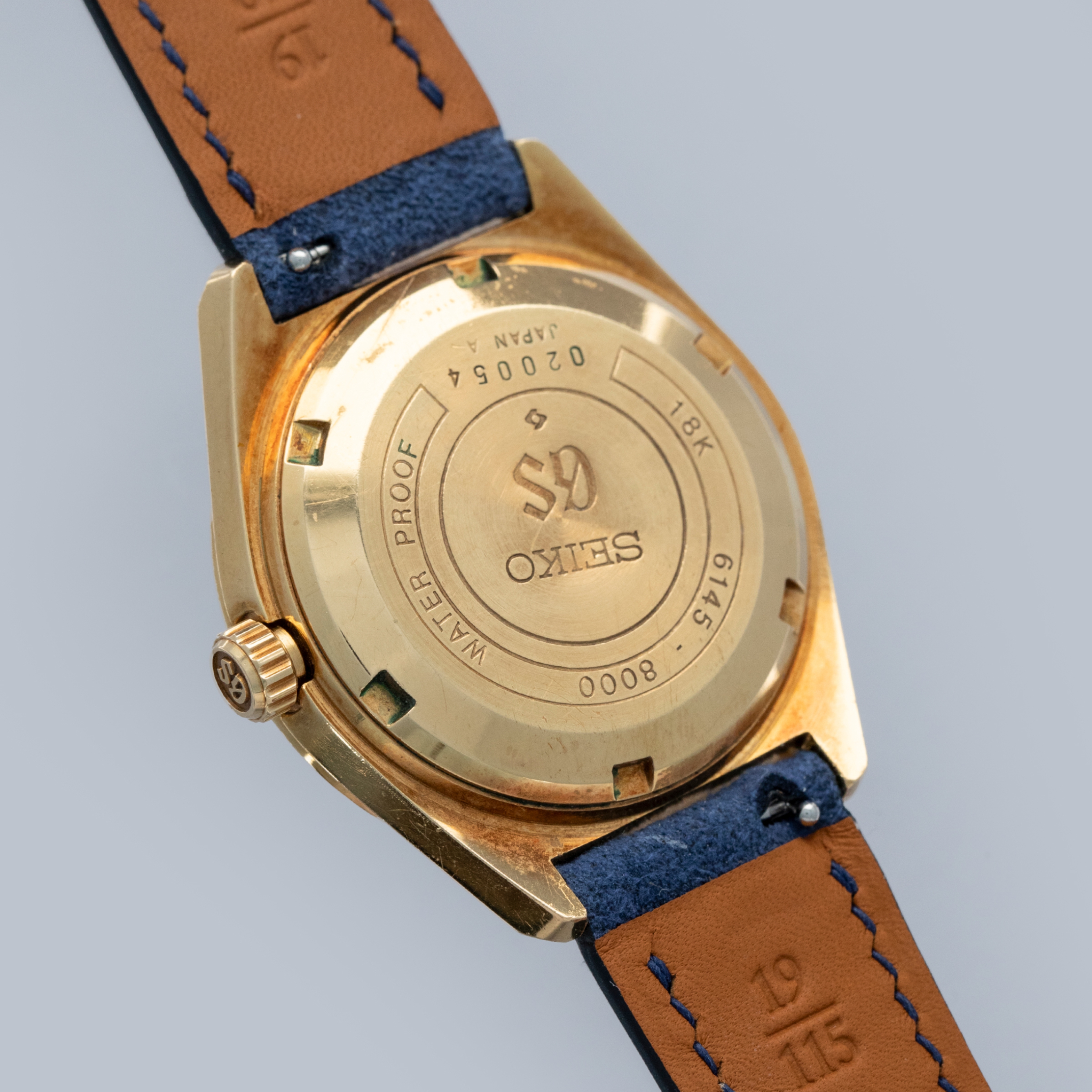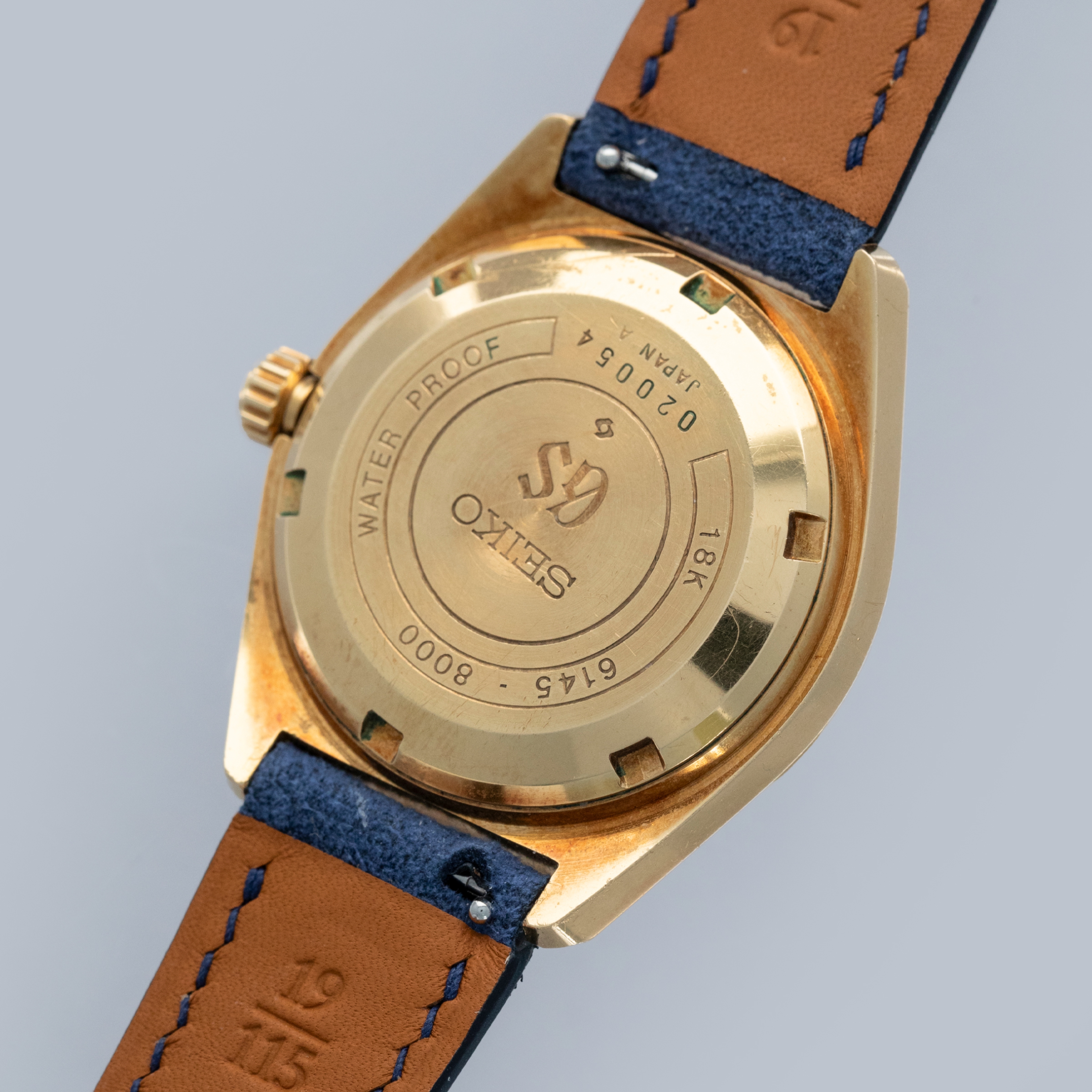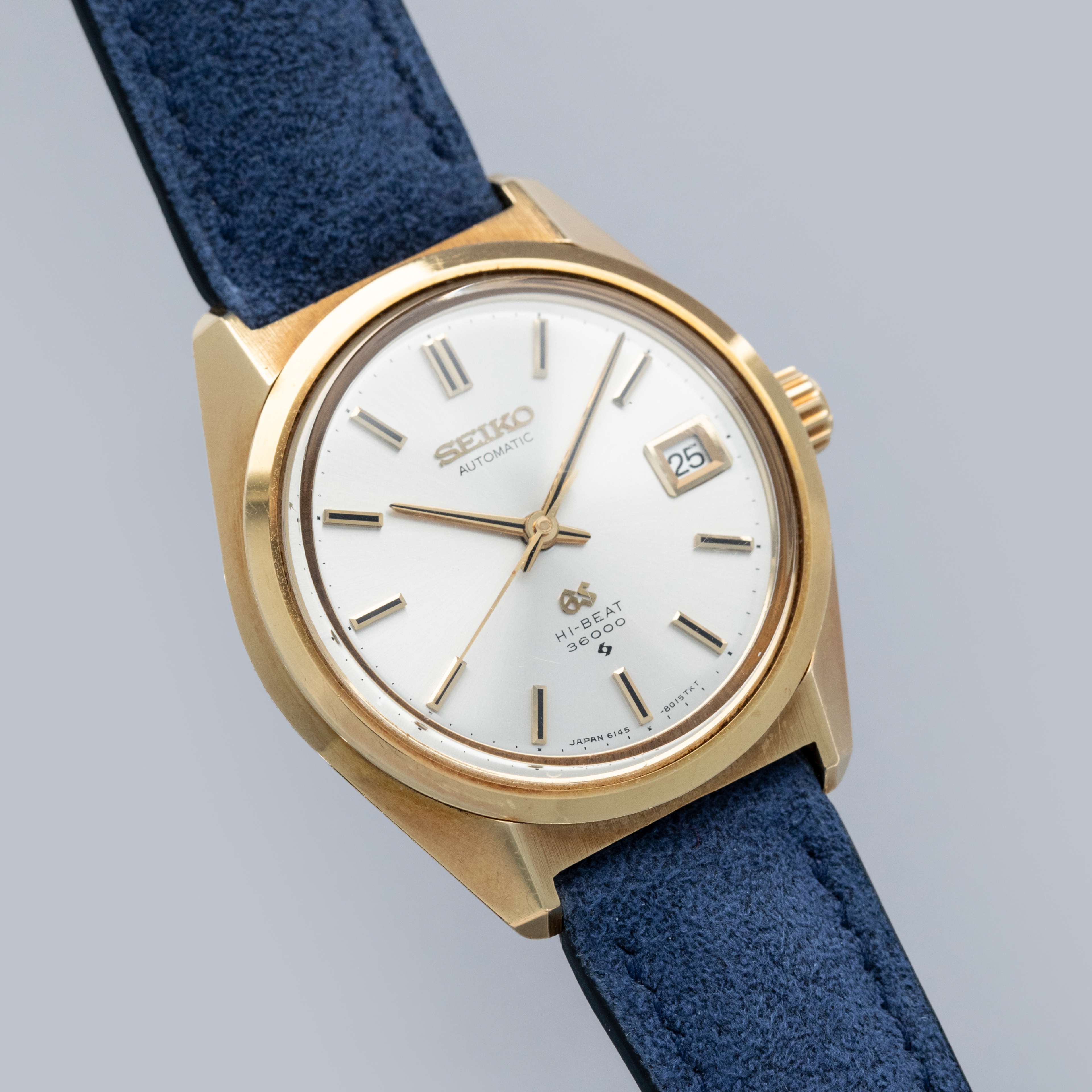 The watch is in overall excellent condition. The yellow gold case has well-defined lines, with some light scratches and marks as expected of a watch of this vintage. The case back has well-defined engravings. The no-lume dial is in excellent condition, with only a couple of very minor marks. The hands are clean, with just a small spot on the seconds hand. There are a couple of scuffs and a mark on the crystal. The watch is fitted with a blue leather strap with a vintage Grand Seiko pin buckle in excellent condition. Comes with inner and outer boxes and guarantee booklet.