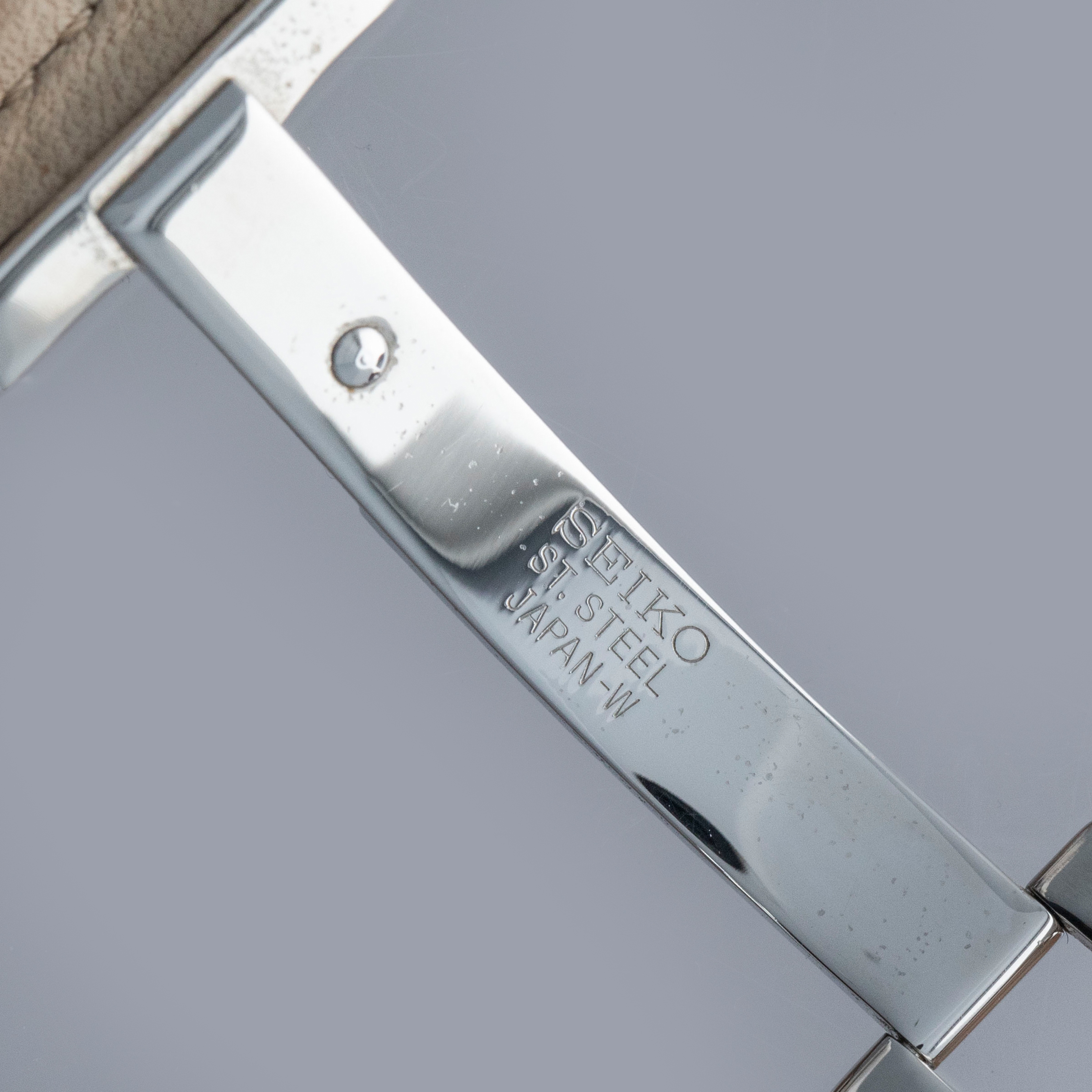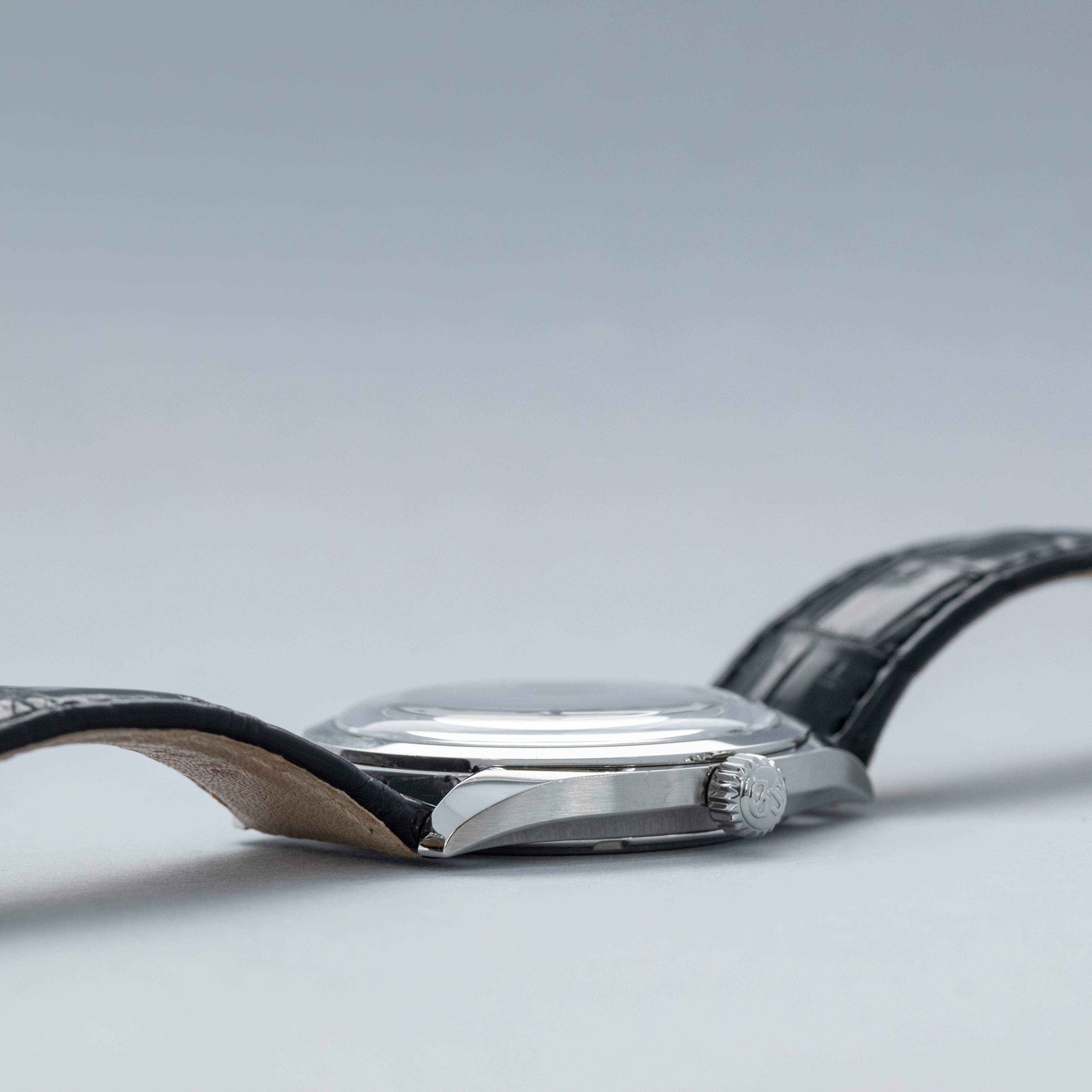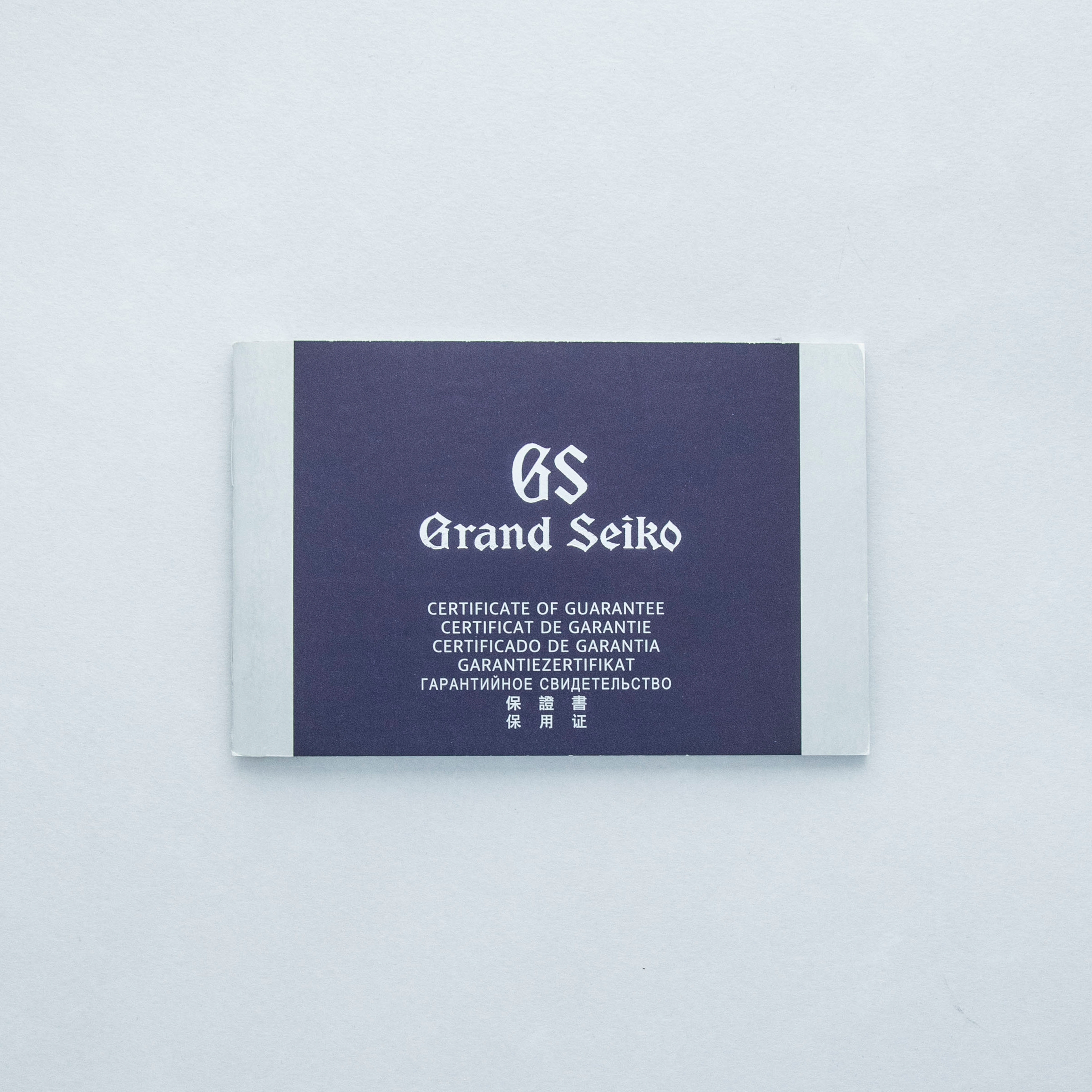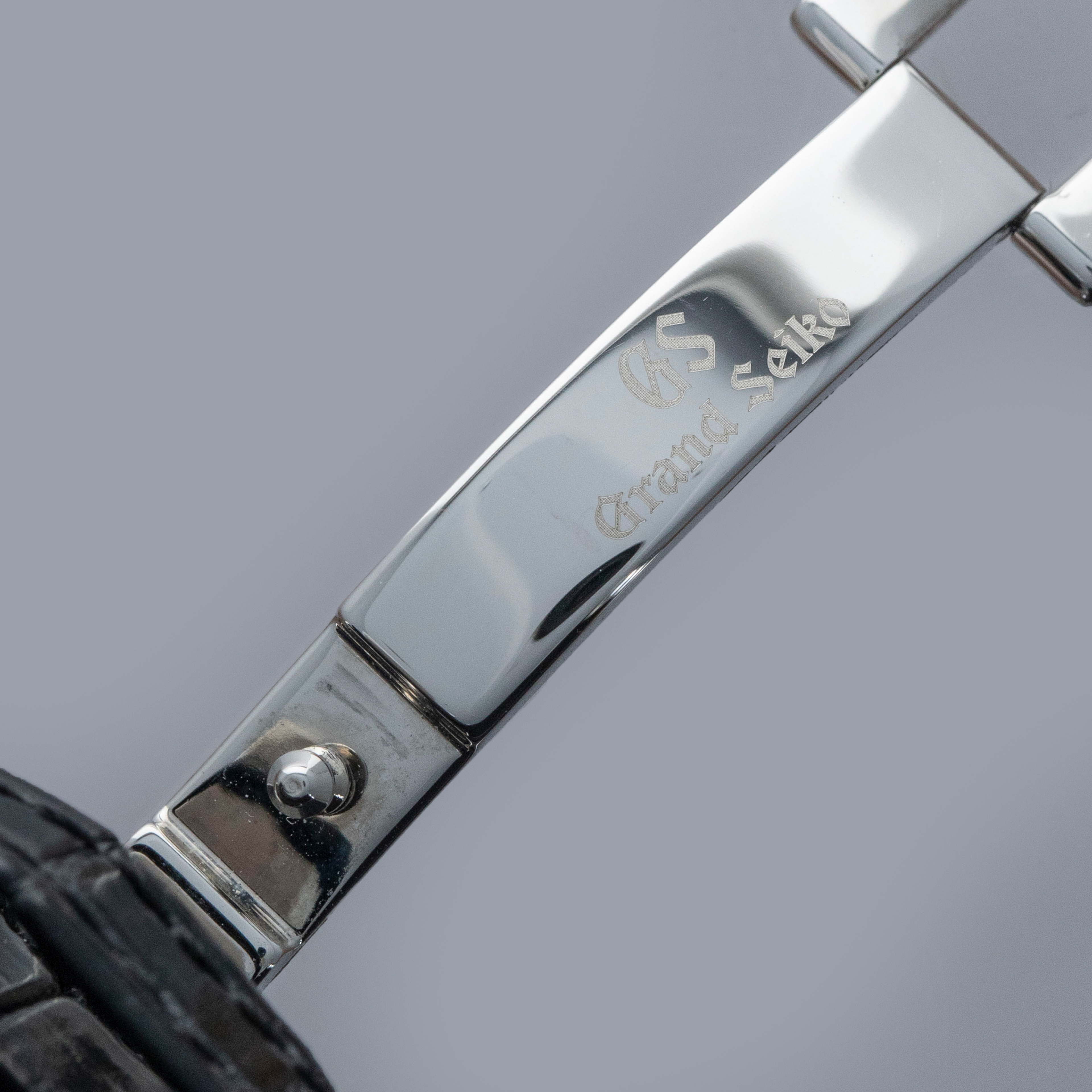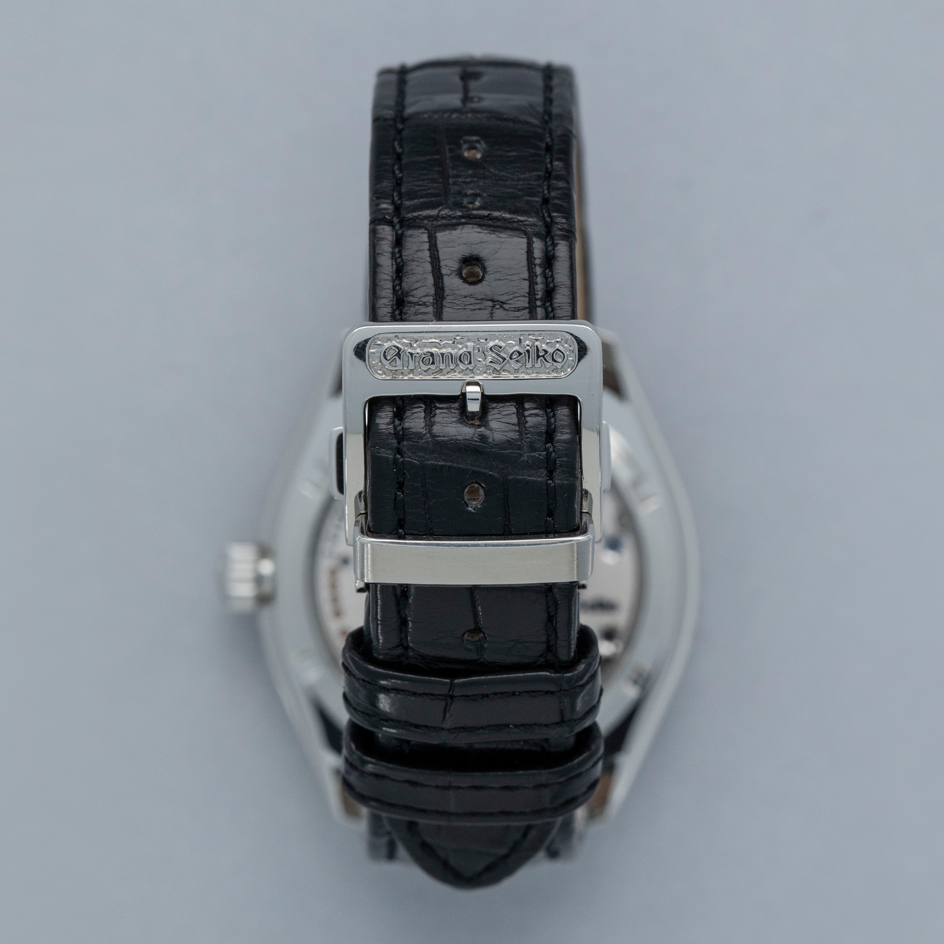 The watch is in near-mint condition. It shows a few signs of very careful wear, including a couple of light marks from strap changes and a small mark on the bezel edge at two o’clock. The dial and hands are like new. It is fitted with a Grand Seiko black alligator strap and a stainless steel deployant clasp with light marks. The watch is accompanied by its inner and outer boxes, guarantee, booklet, hangtag, and cloth pouch.