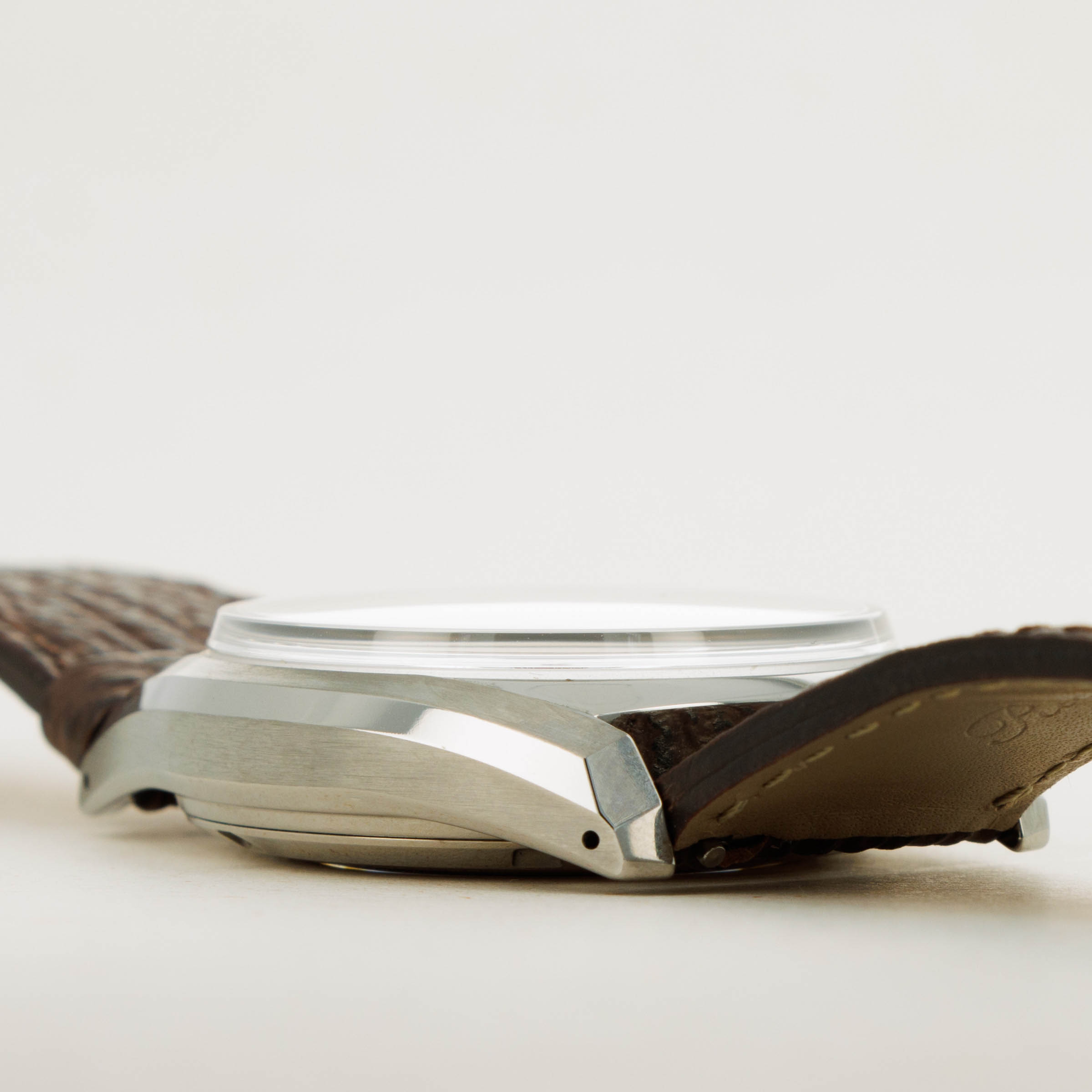 Leather strap. Steel bracelet with 14 links, 4 removable. Also, 2 full links and 2 half links on the side.